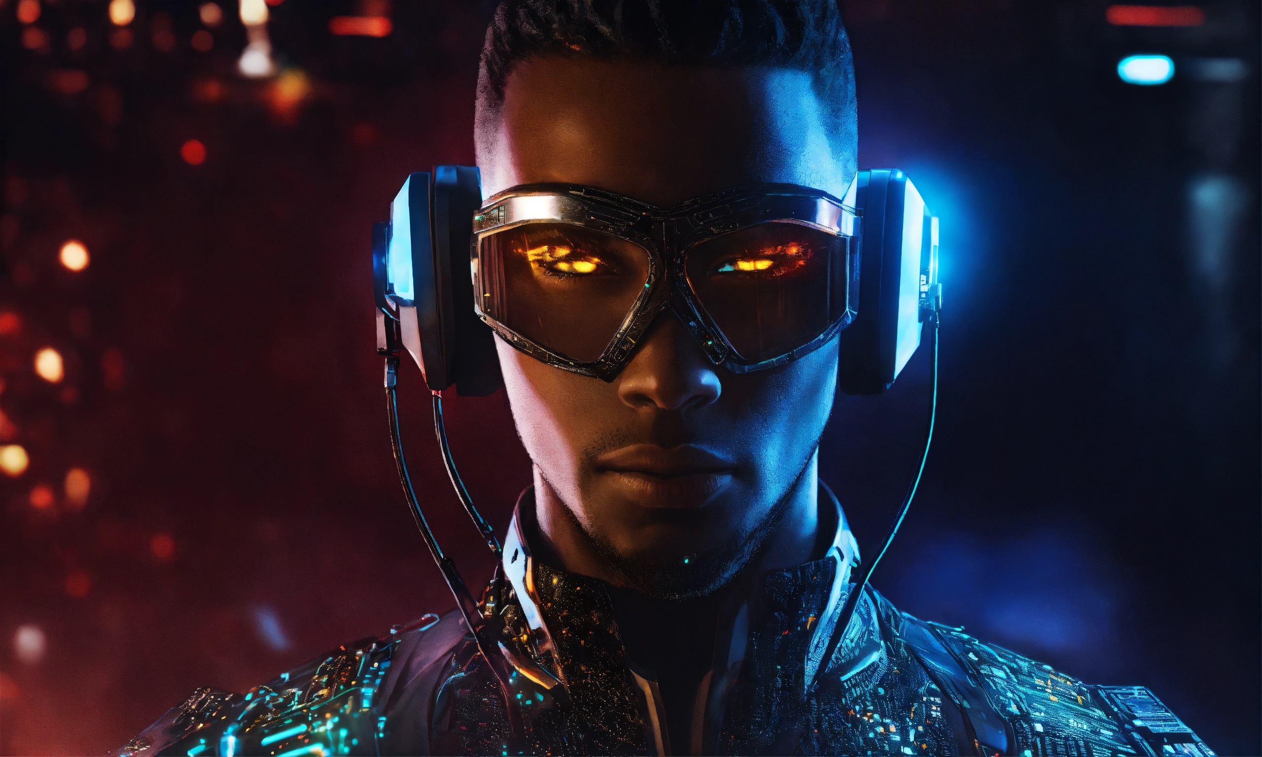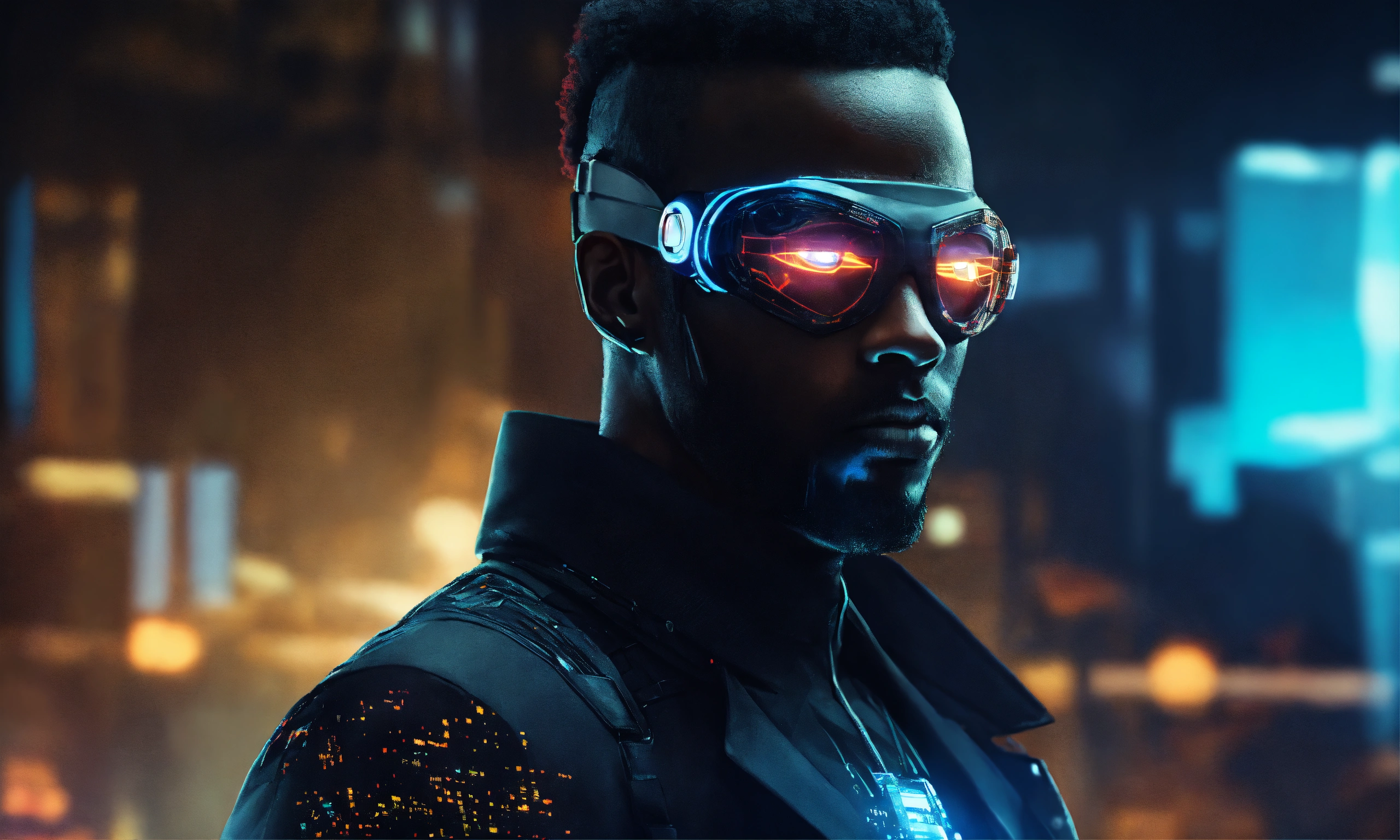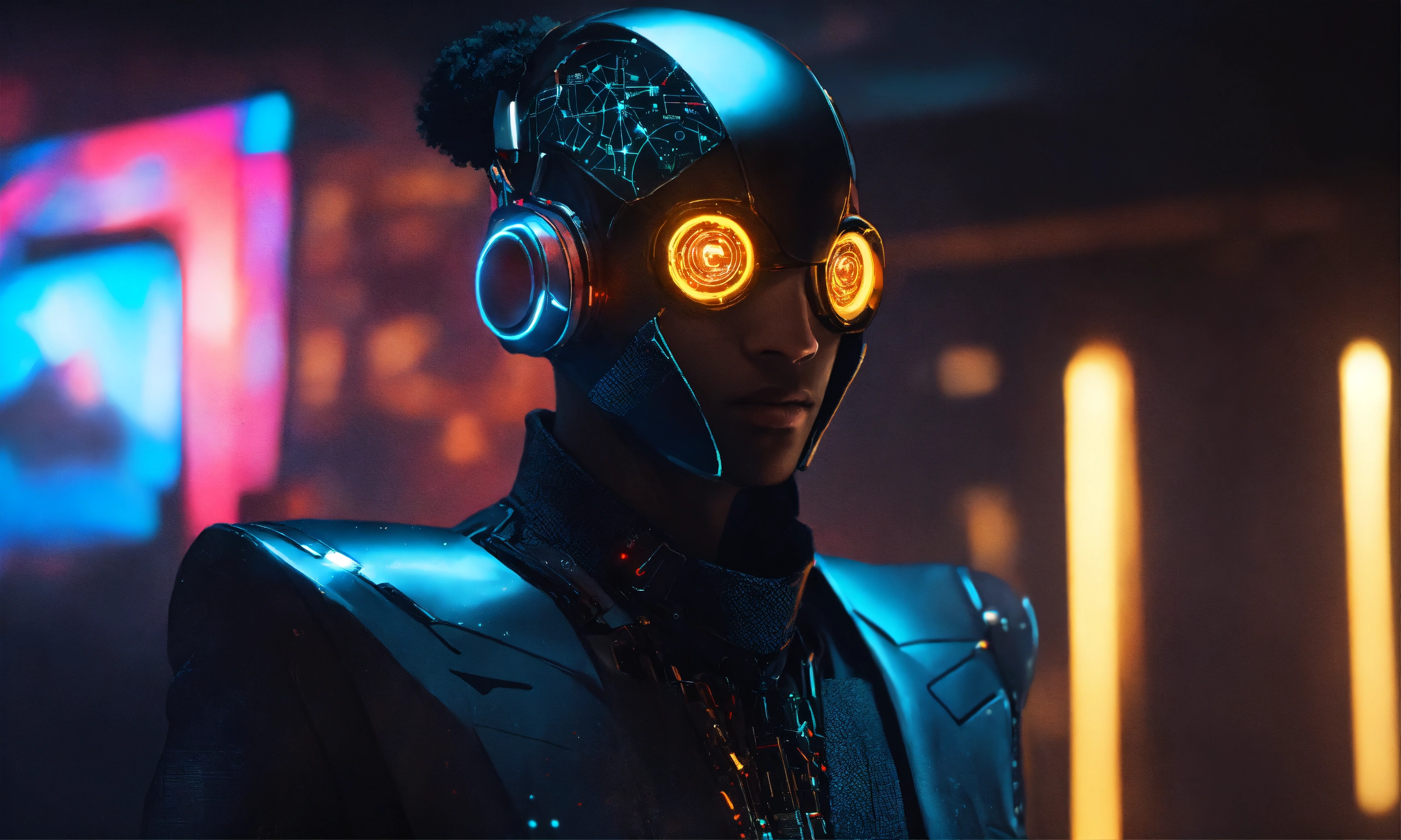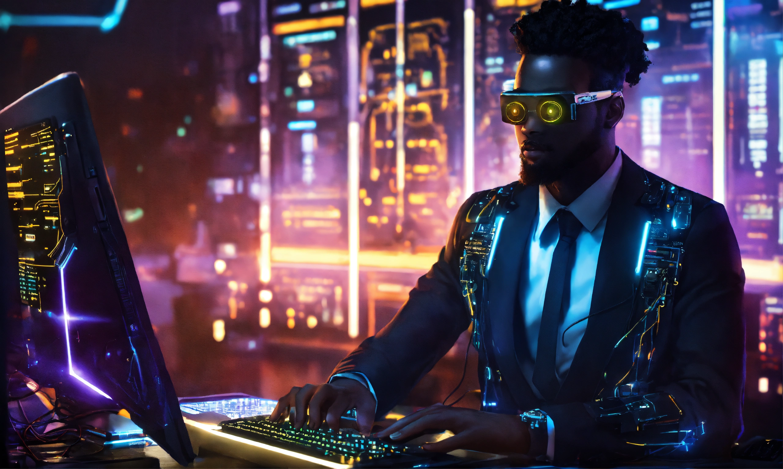 A black hacker in a stylish suit with cybernetics and glowing eyes