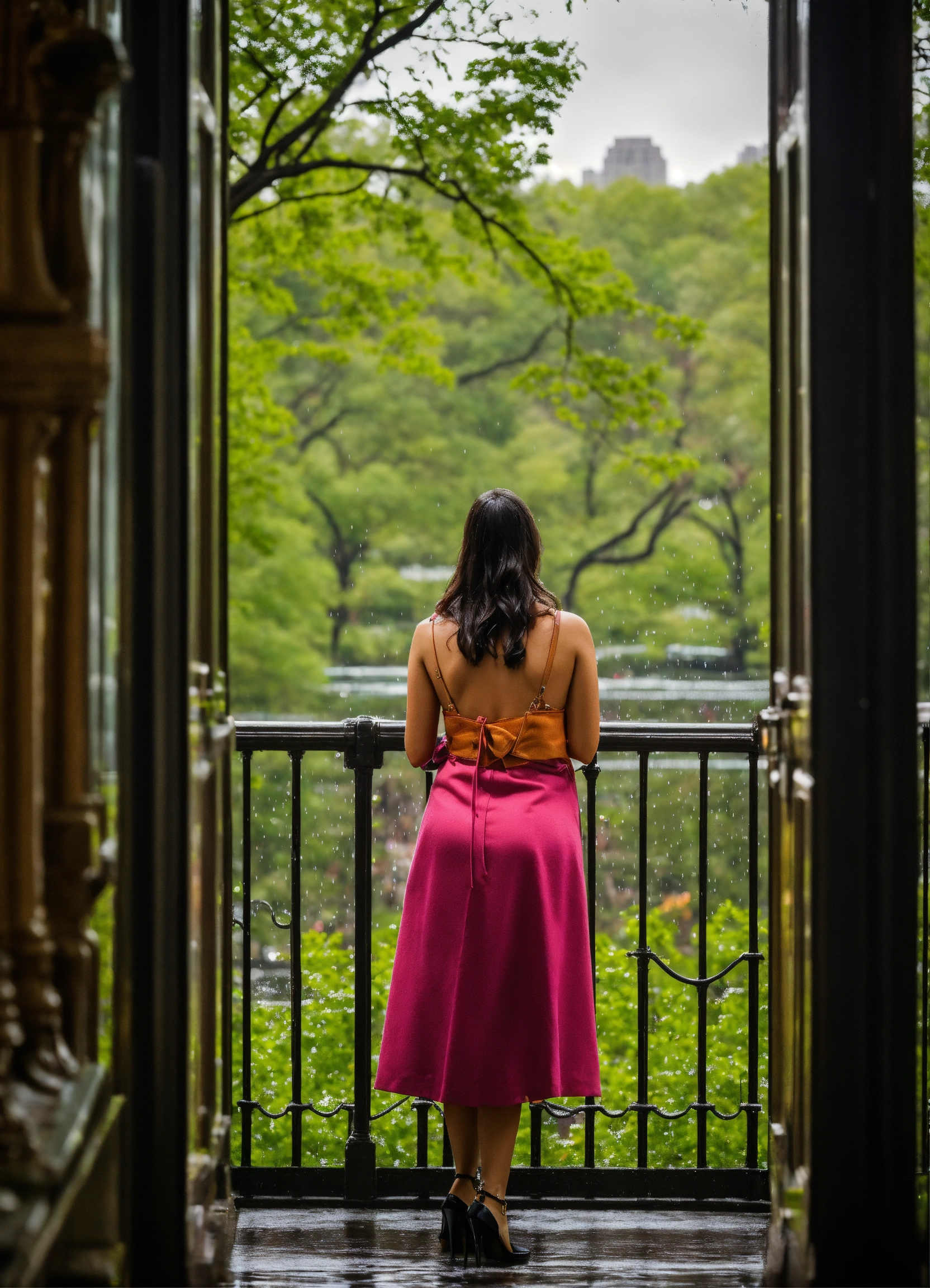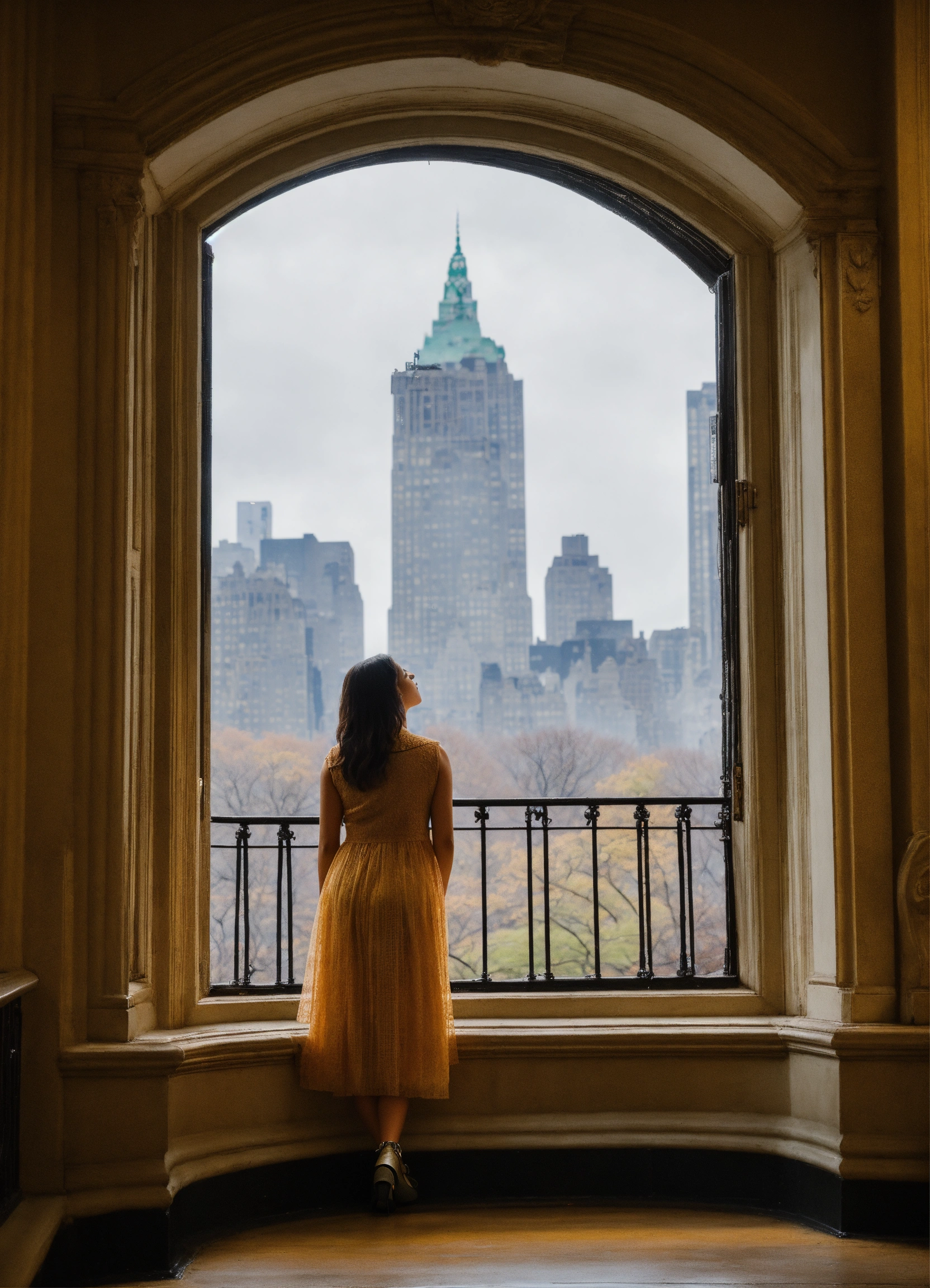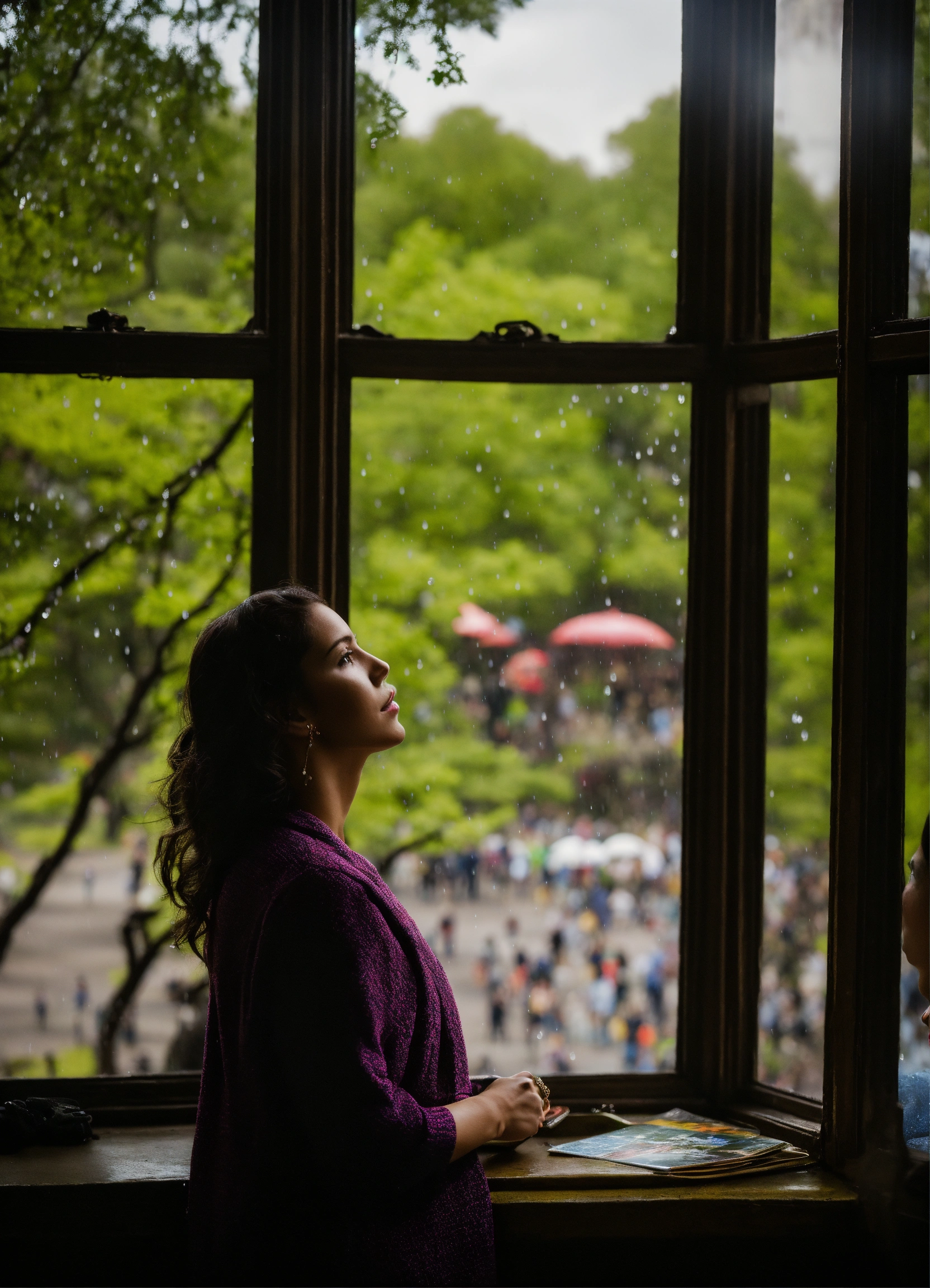 Una mujer mirando por su ventana pensando en la vida en un día lluvioso en new york central park
