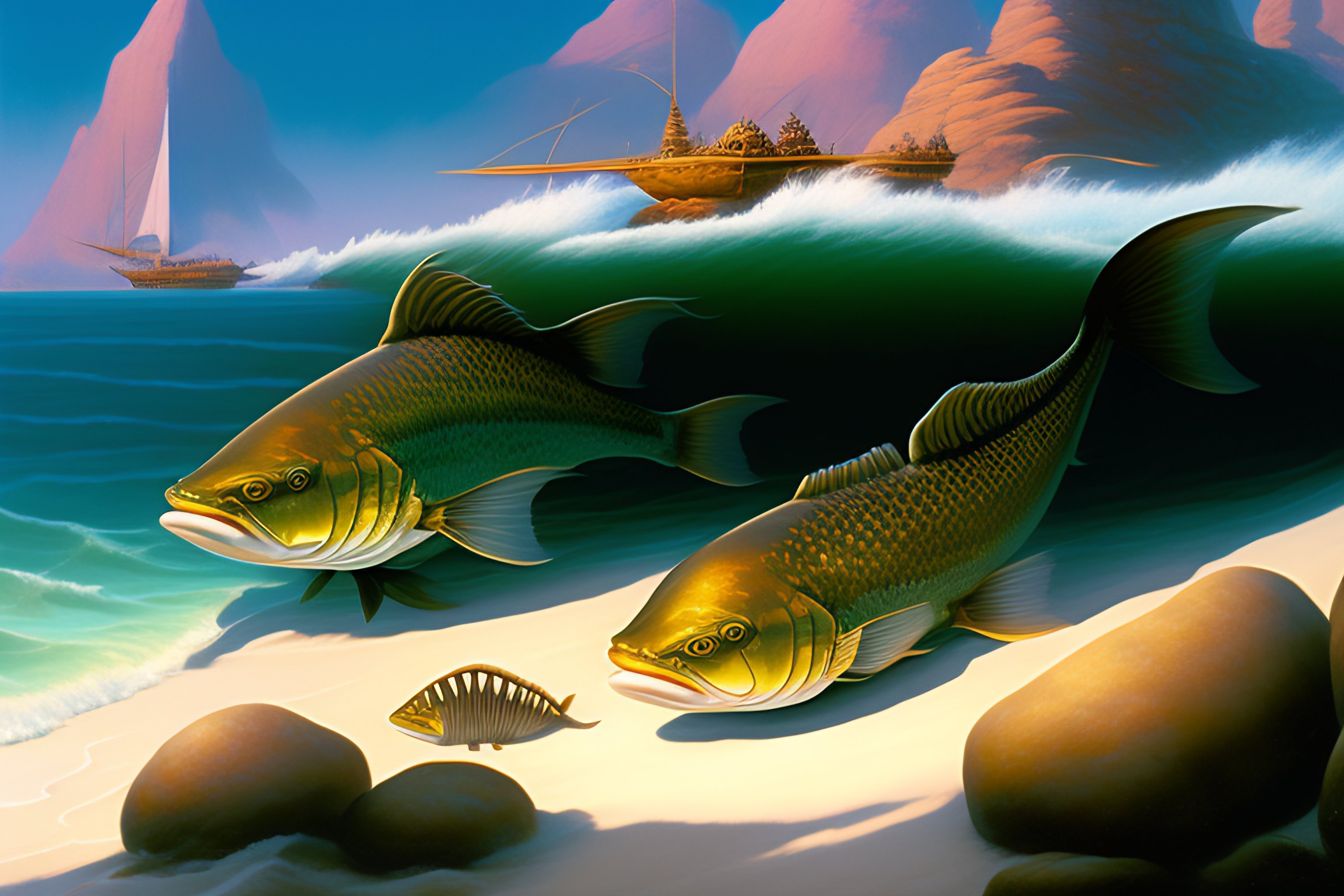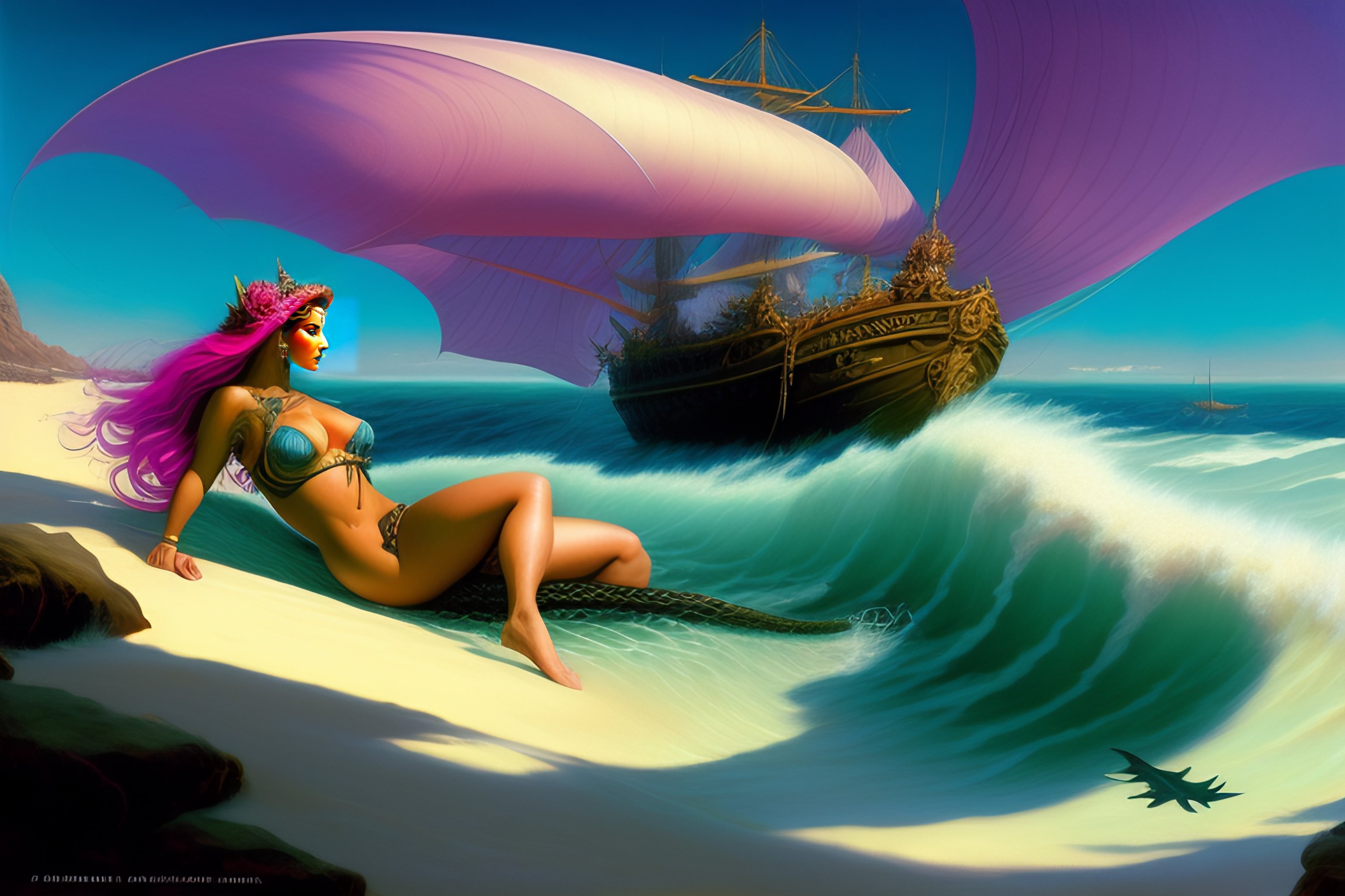 Fishtailed mermaids lounging on the island sandbars, closeup, style of frank frazetta, brom, icewind dale, eldritch horror, scales, greg rutkowski, bernie wrightson; gold ornamentation and jewelry, aztec tattoos, shock of pink, spellcasting, dwarfism, ivory, iron chains and crashed galleons in the background