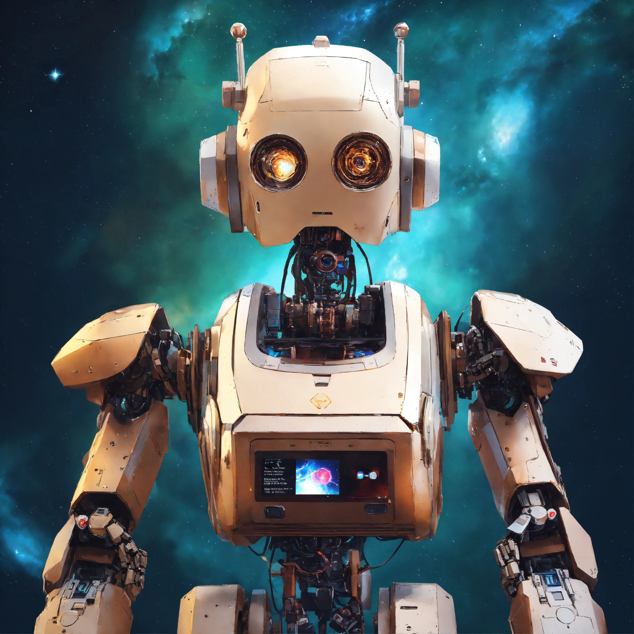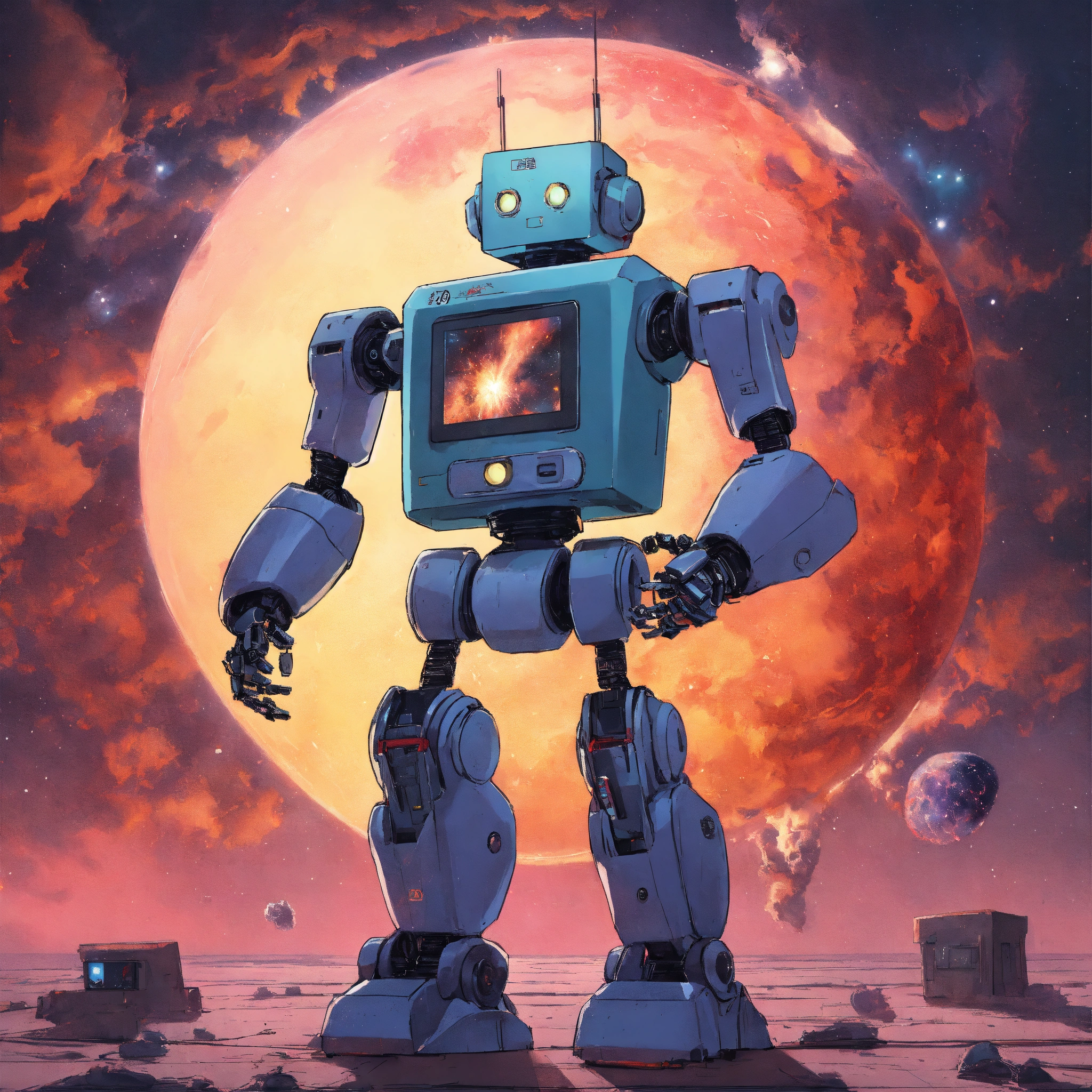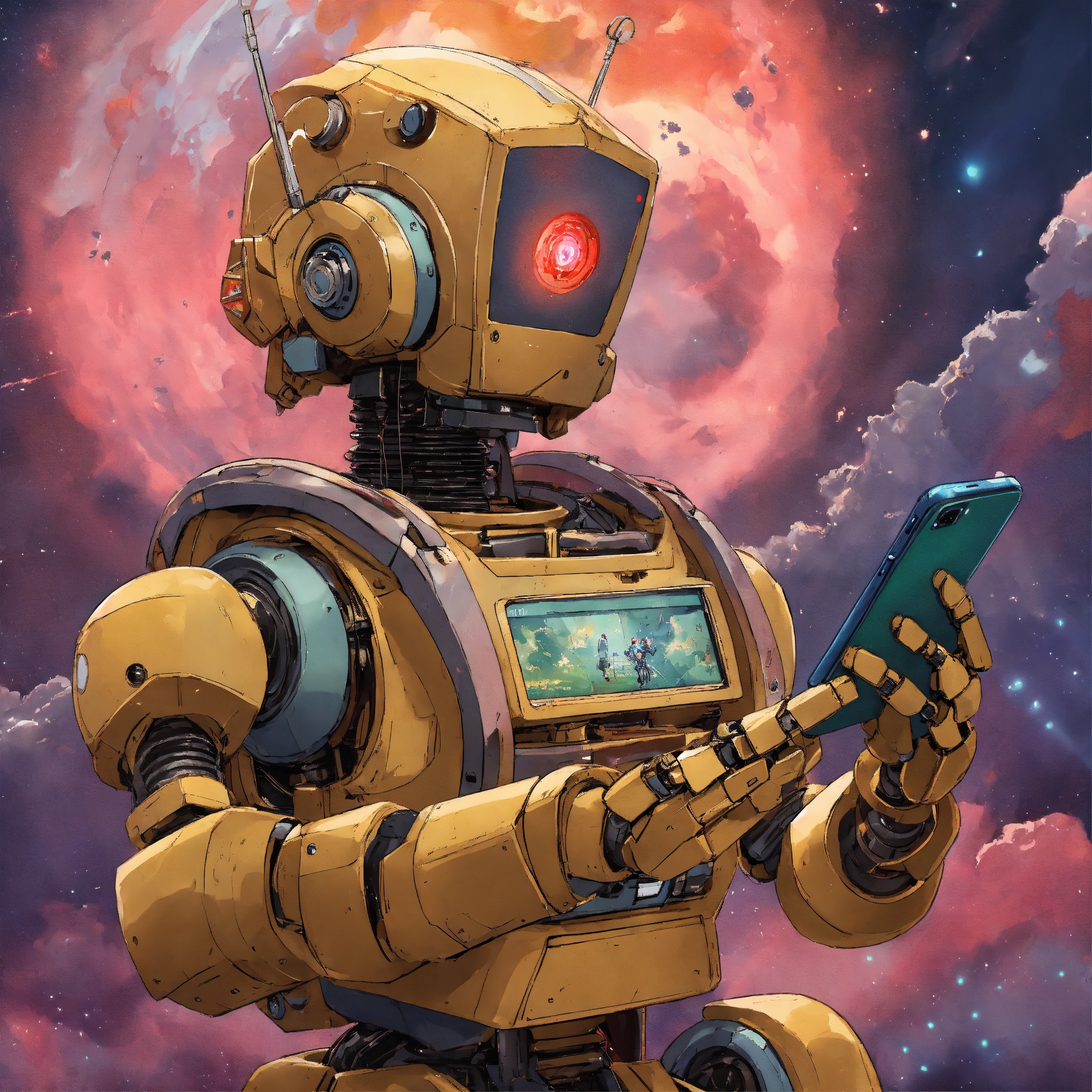 ((robot holding smartphone with both hands)), style of 90's vintage anime, 3/4 pose, standing, (full body), looking at smartphone, human like face, surrealism, akira style, studio ghibli, fine details, devinart, trending on artstation, professional, masterpiece, commissioned, best quality, inside an exploding nebula
