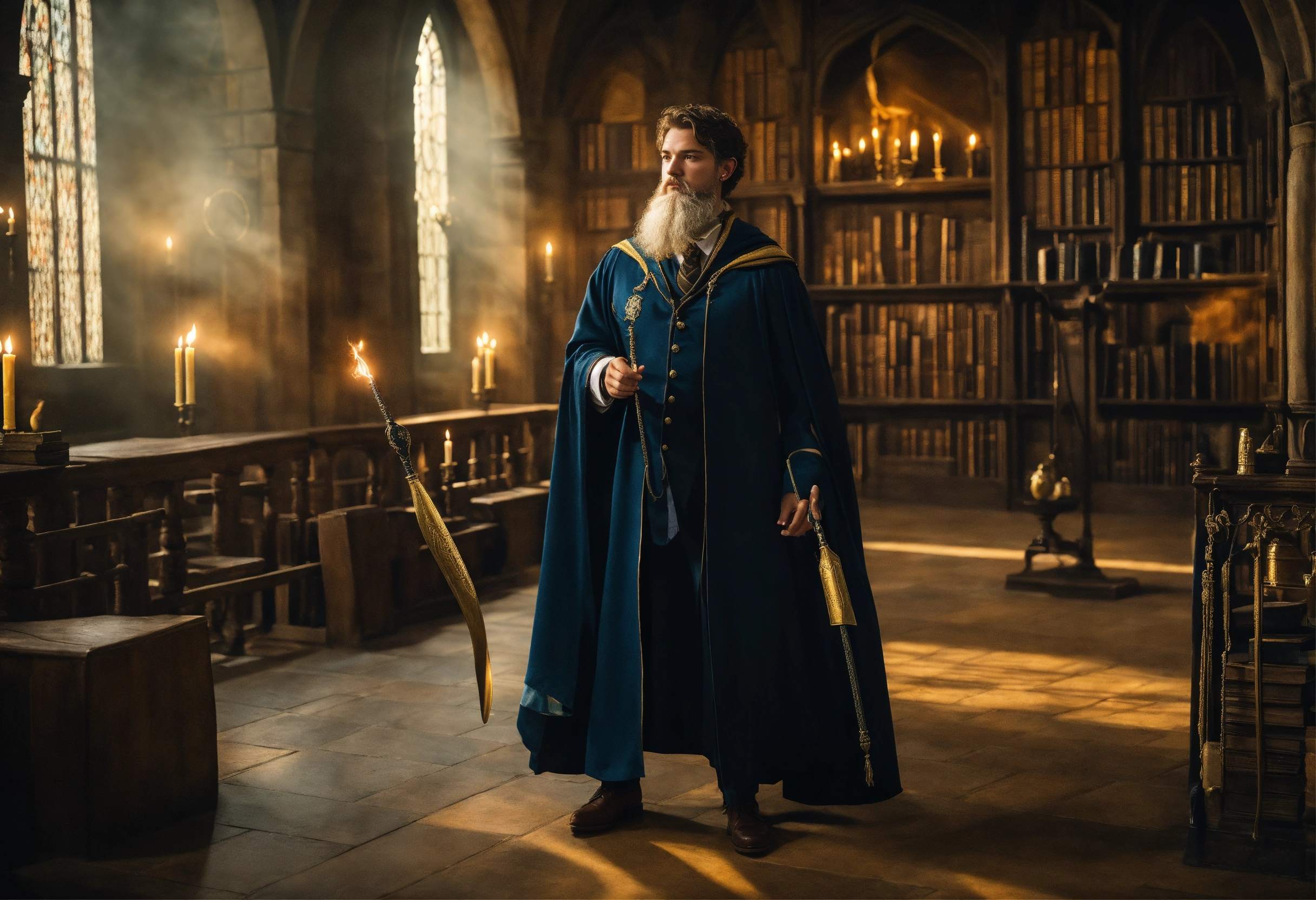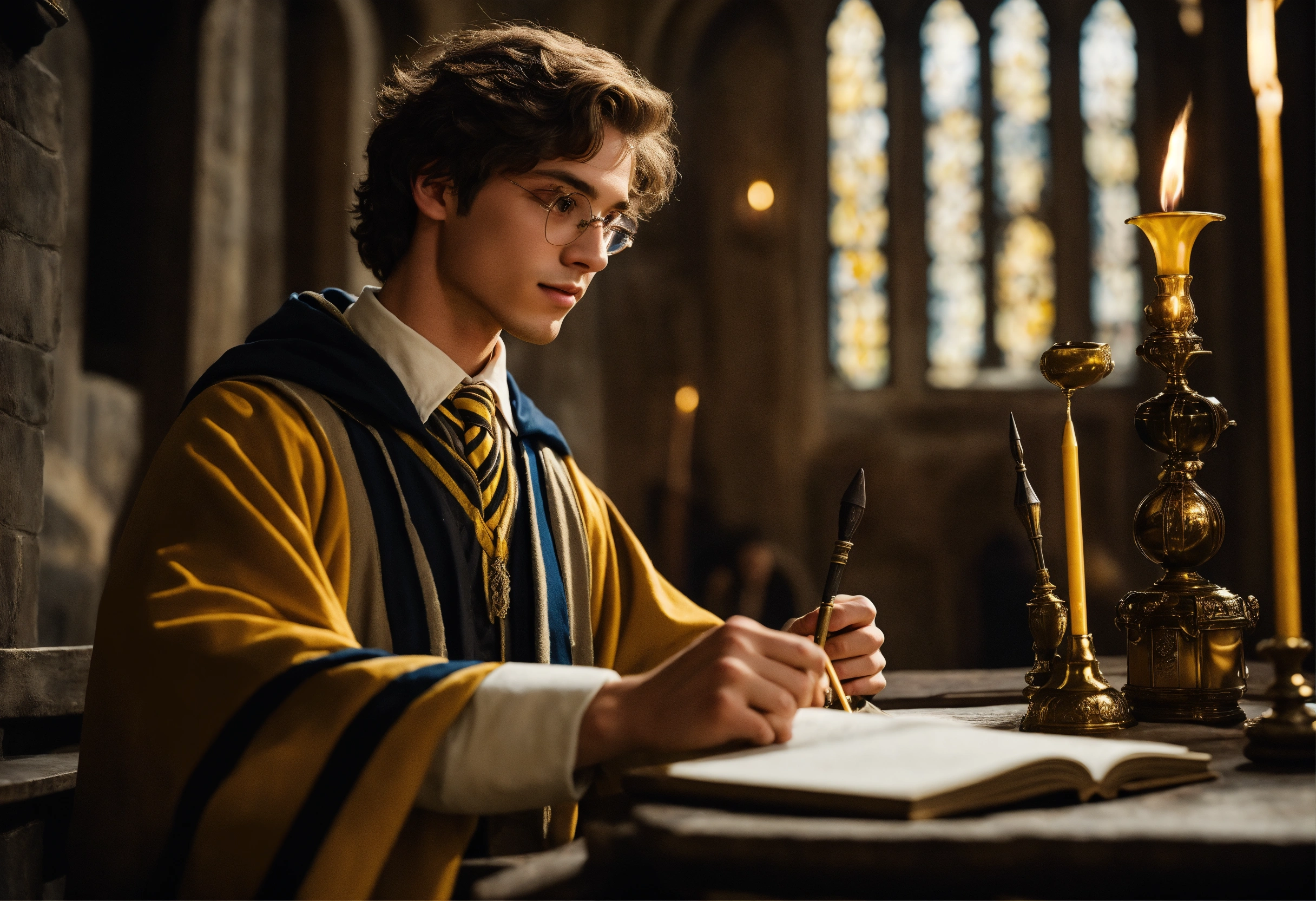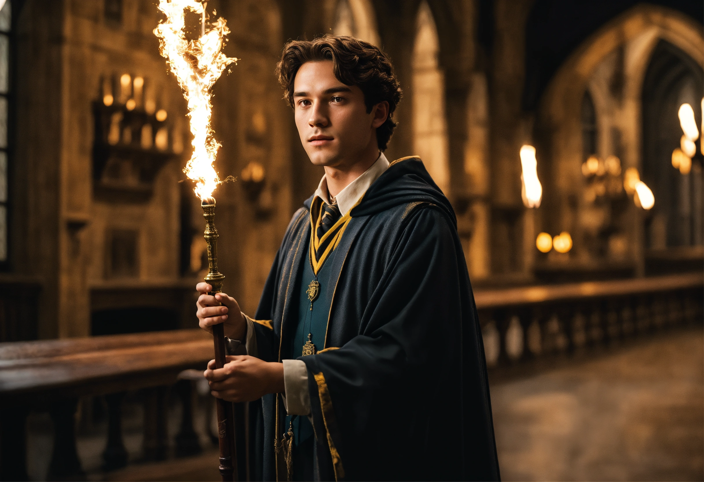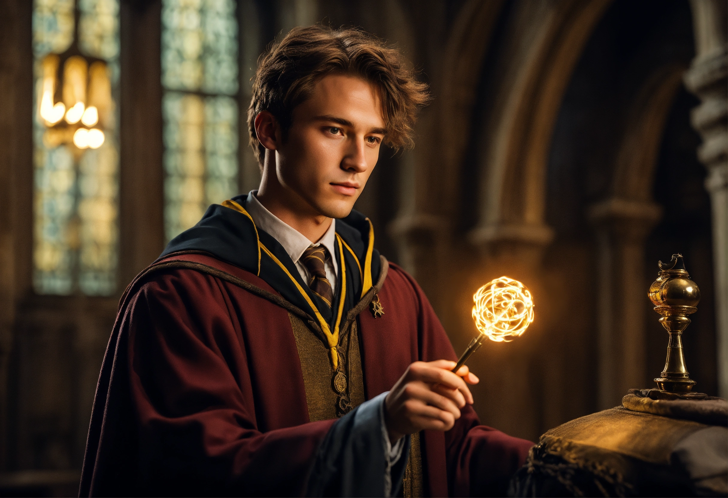 Very buatiful man young wizard, inside hogwarts with a magic wand, 2023 year, hufflepuff, magic wand, quidditch