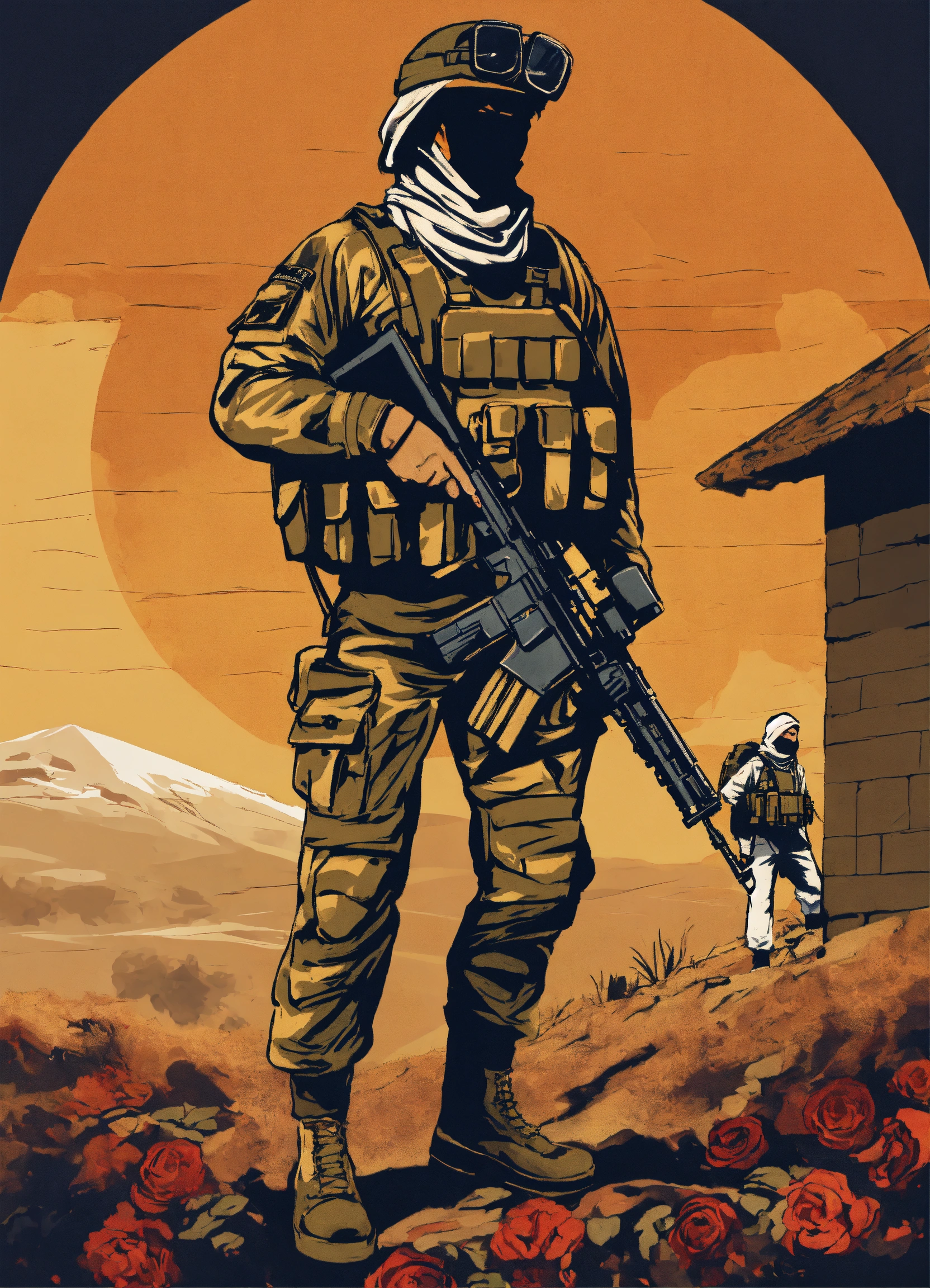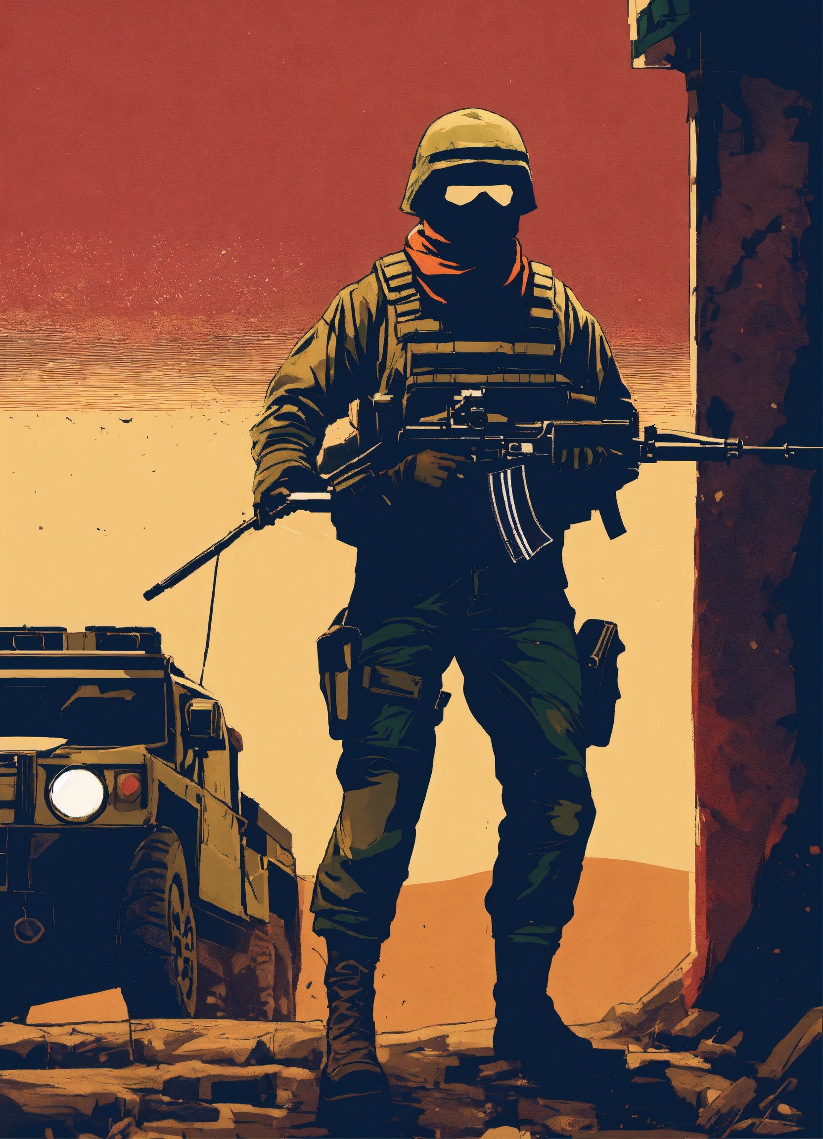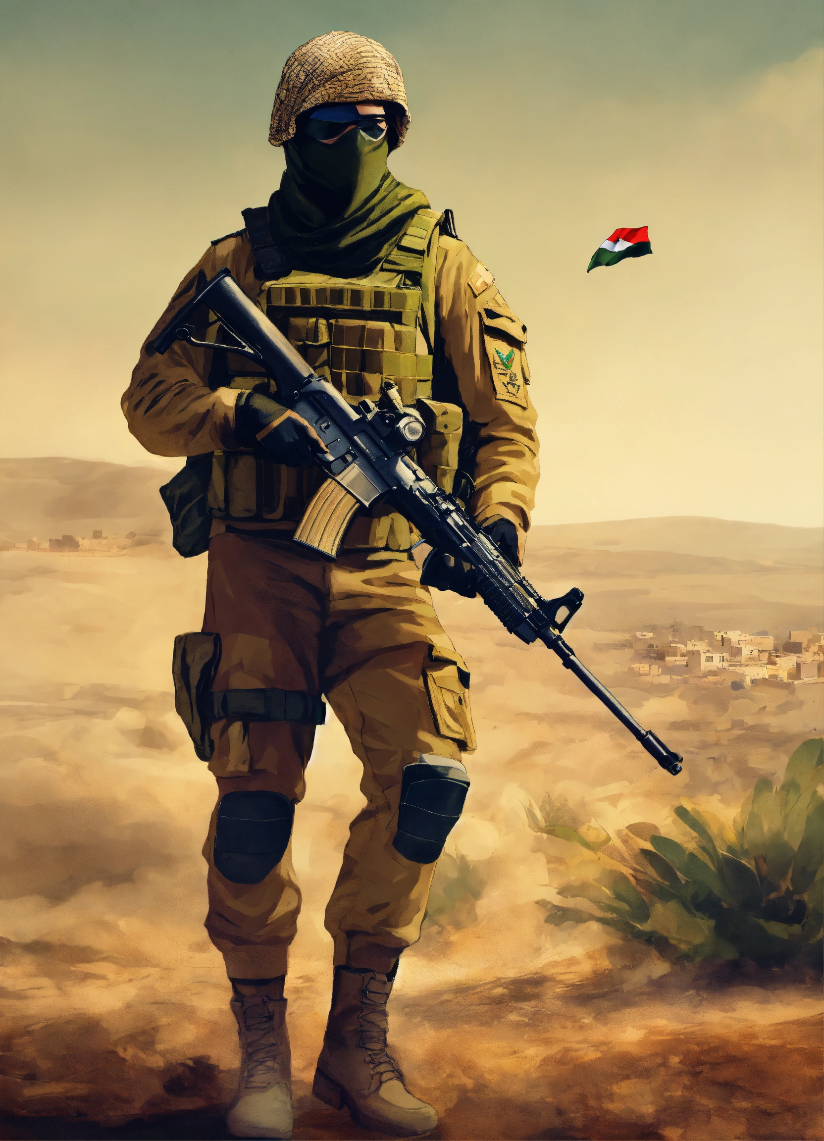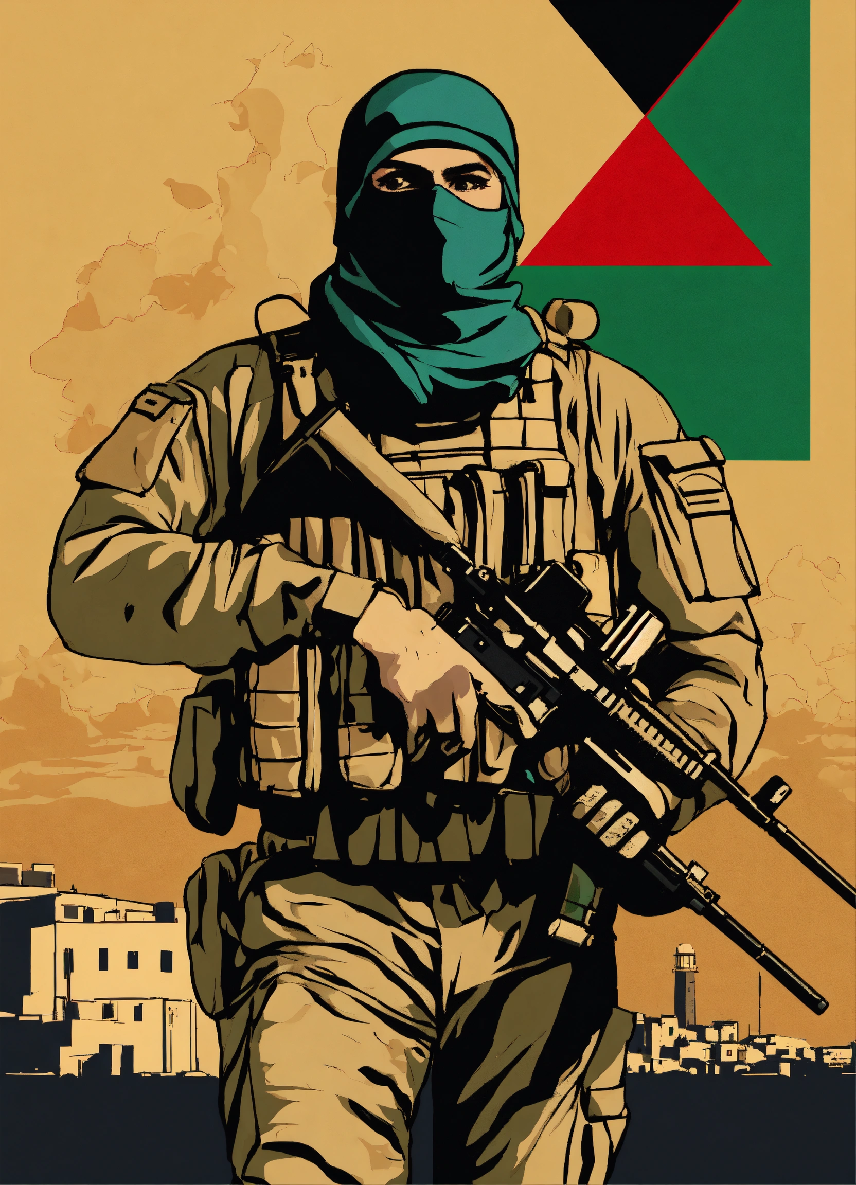 "a design depicting an israeli soldier equipped with the latest weapons, standing defiantly facing a palestinian fighter masked with a palestinian balaclava and carrying a rifle."
