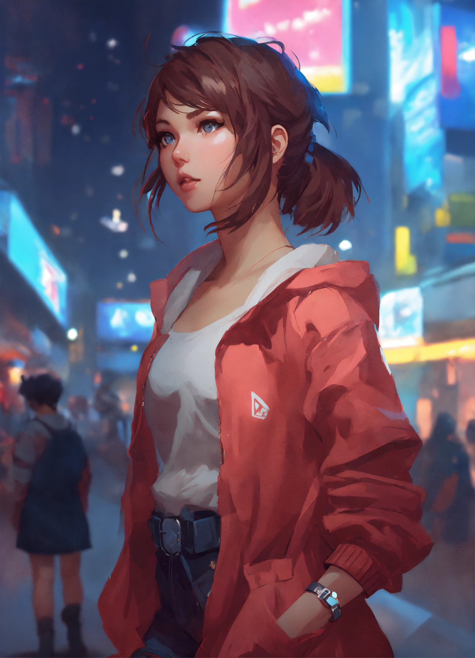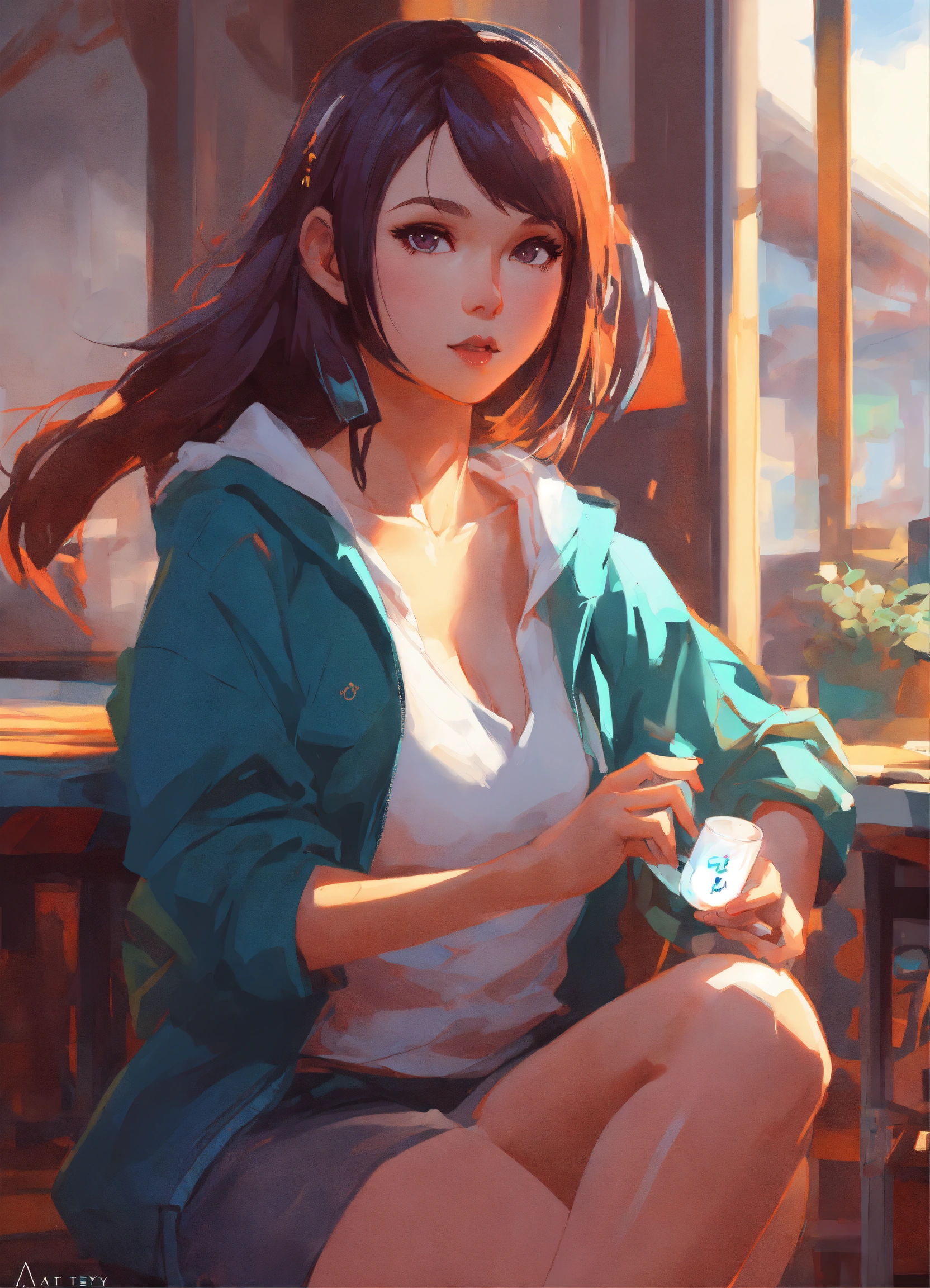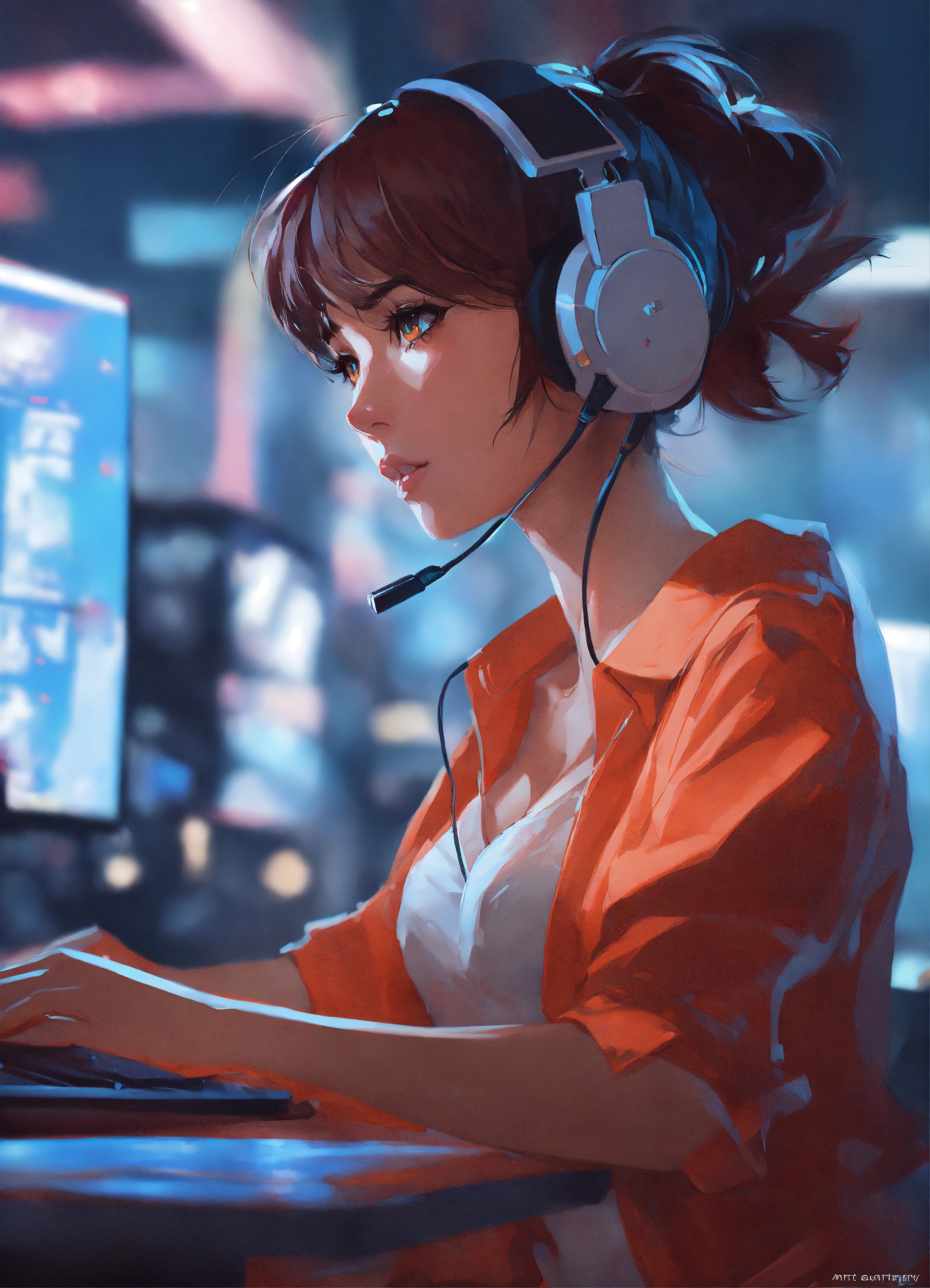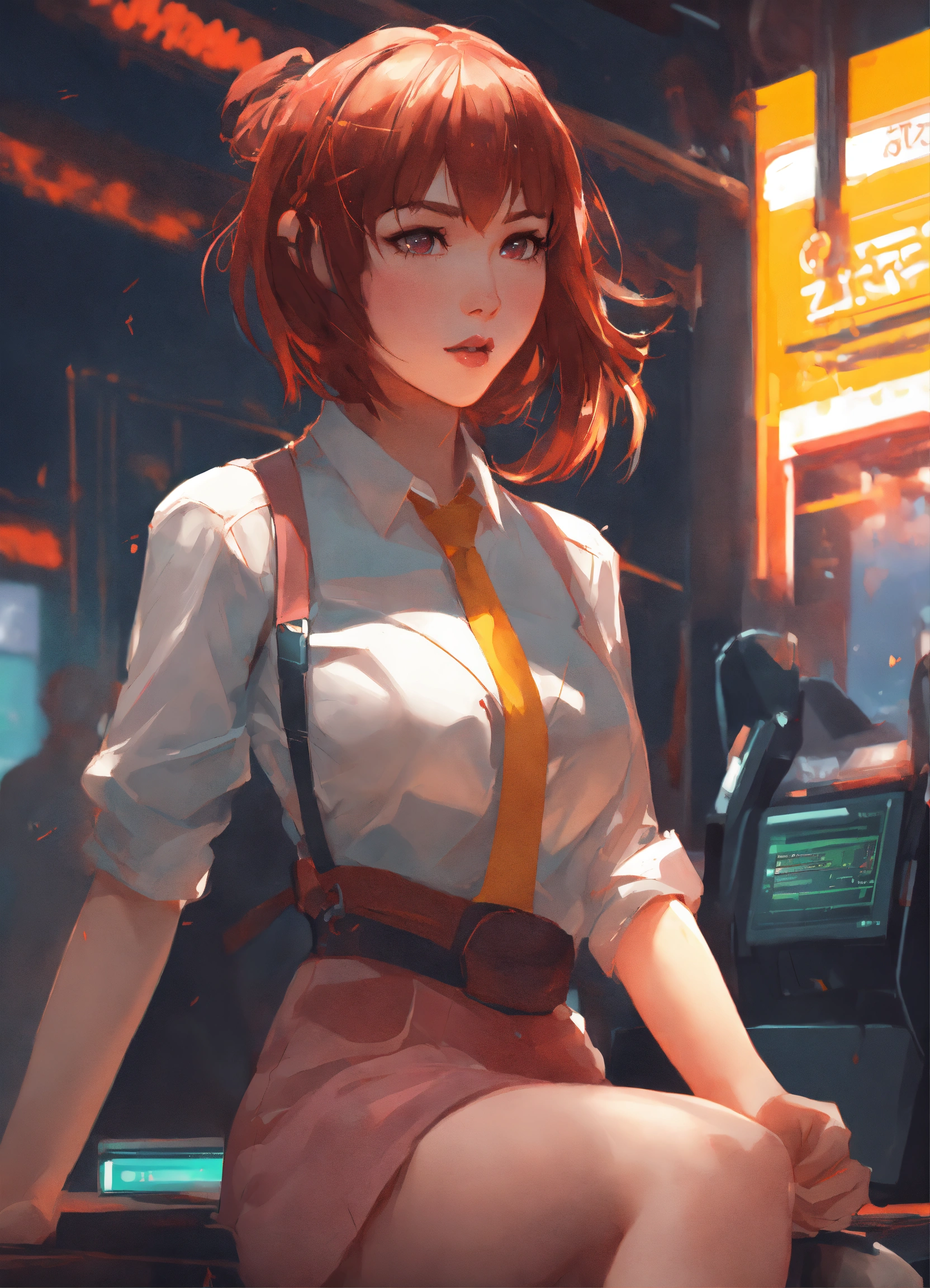 Cute anime woman, game developer, dynamic pose, dynamic composition, by artgerm, atey ghailan, greg rutkowski