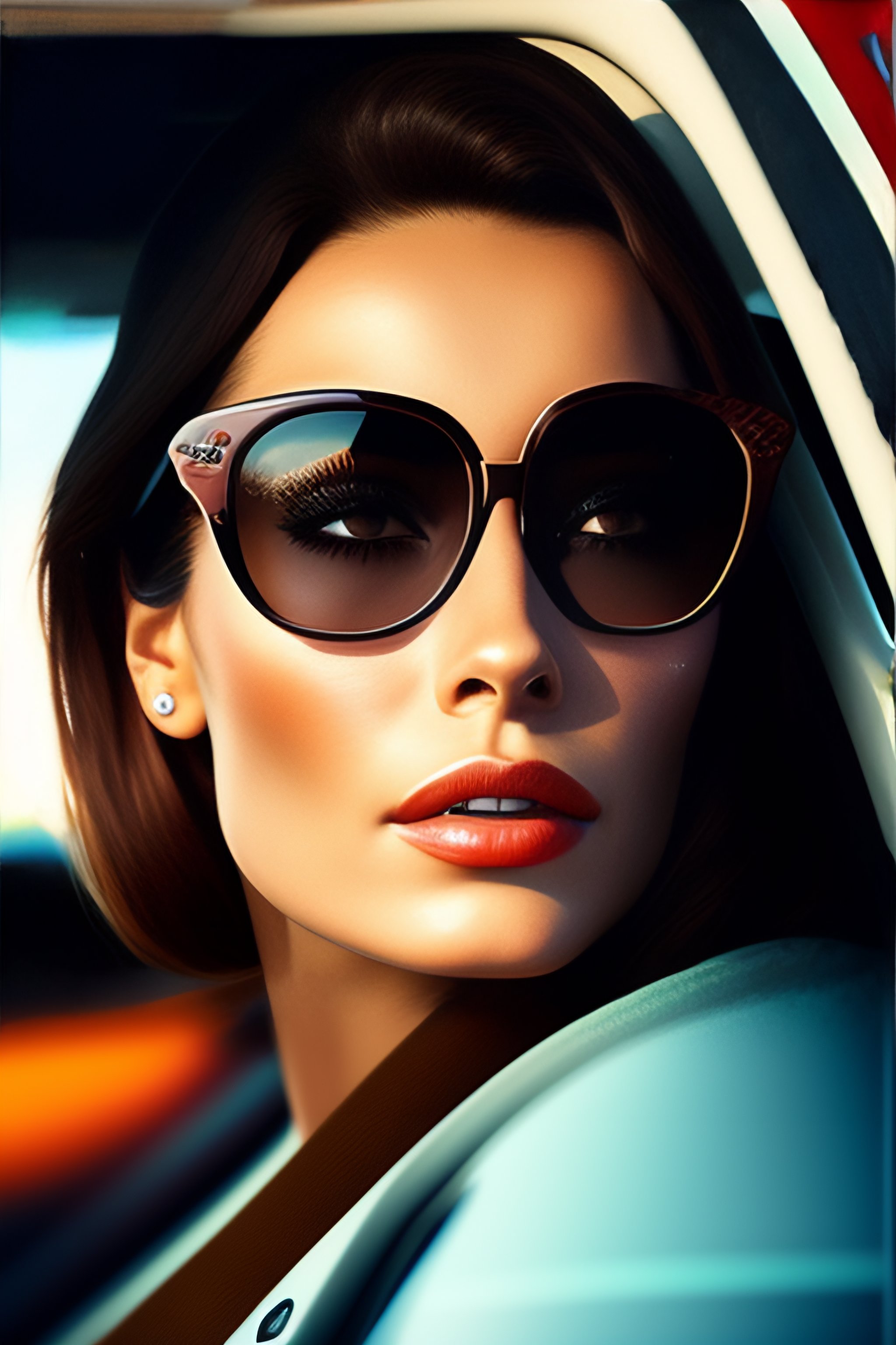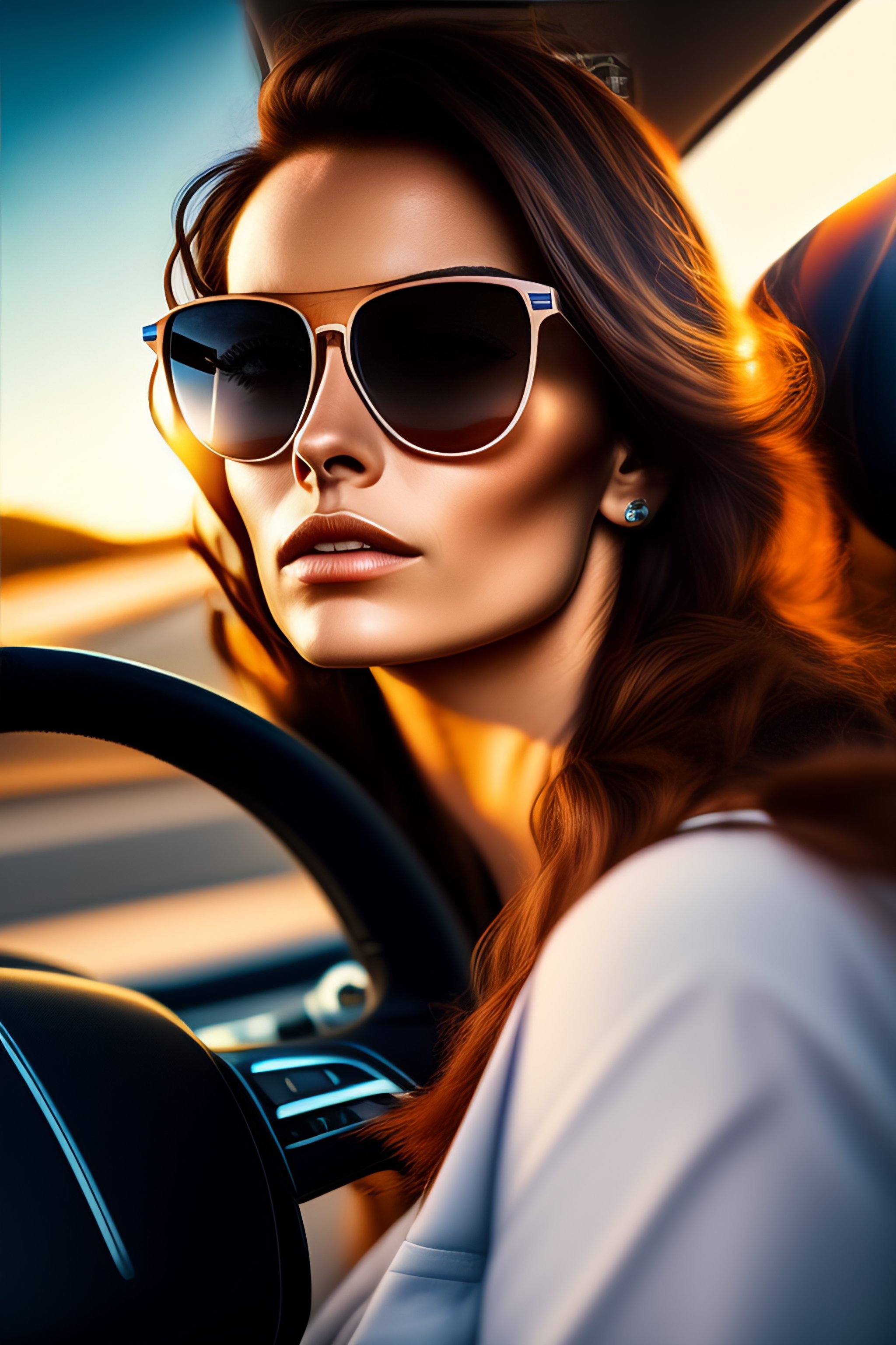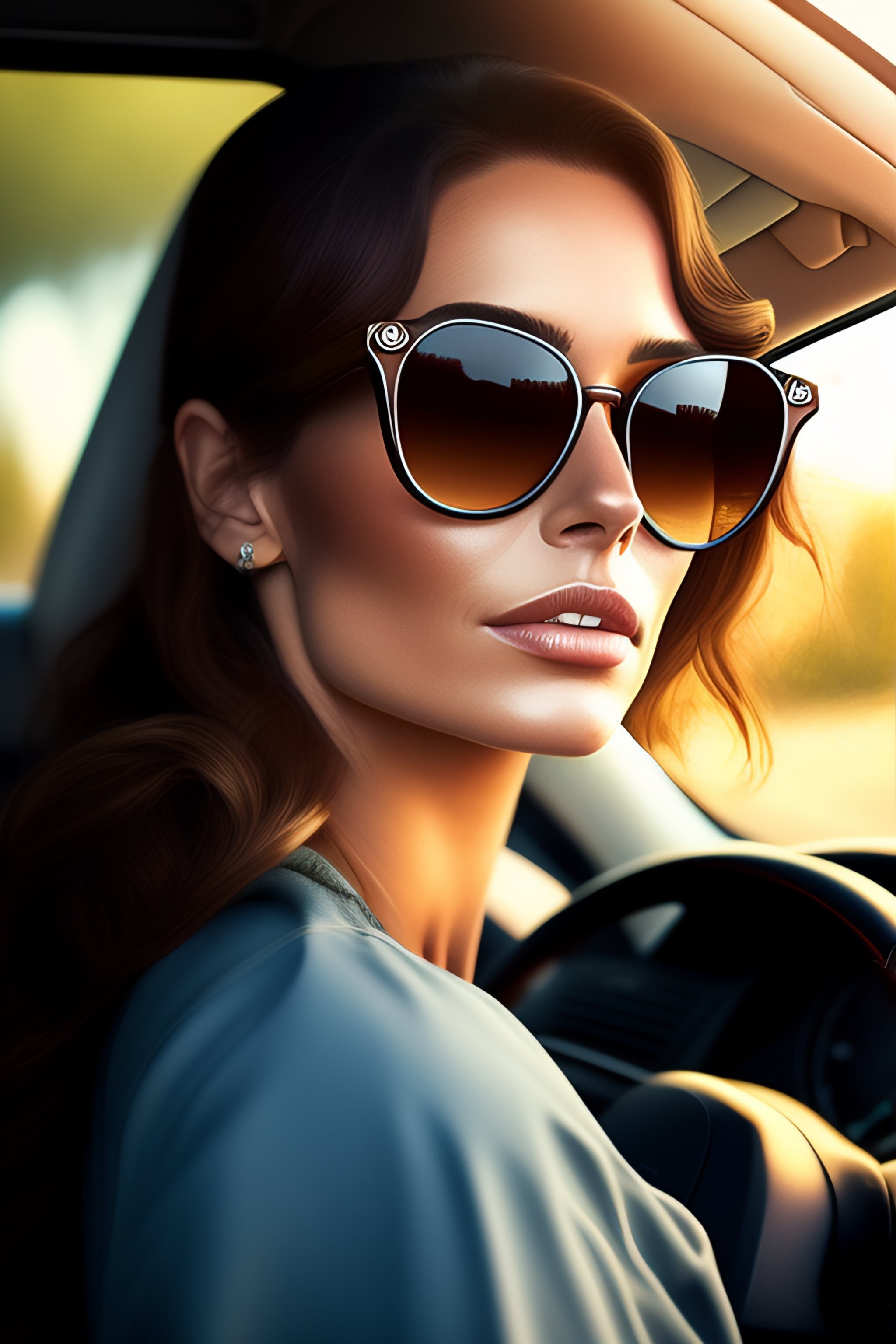 Misterious and young sexy brown hair mom with a little worried face, puts down her sun glasses while driving an honda van
