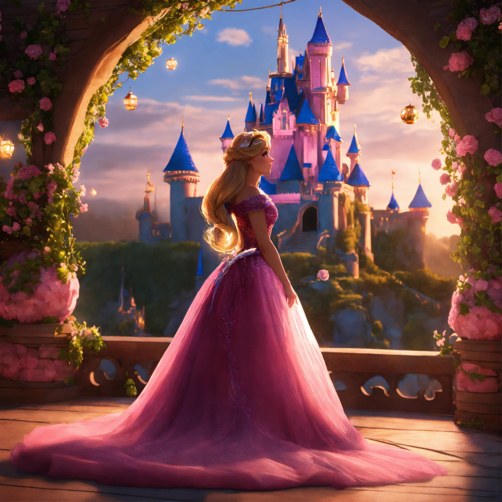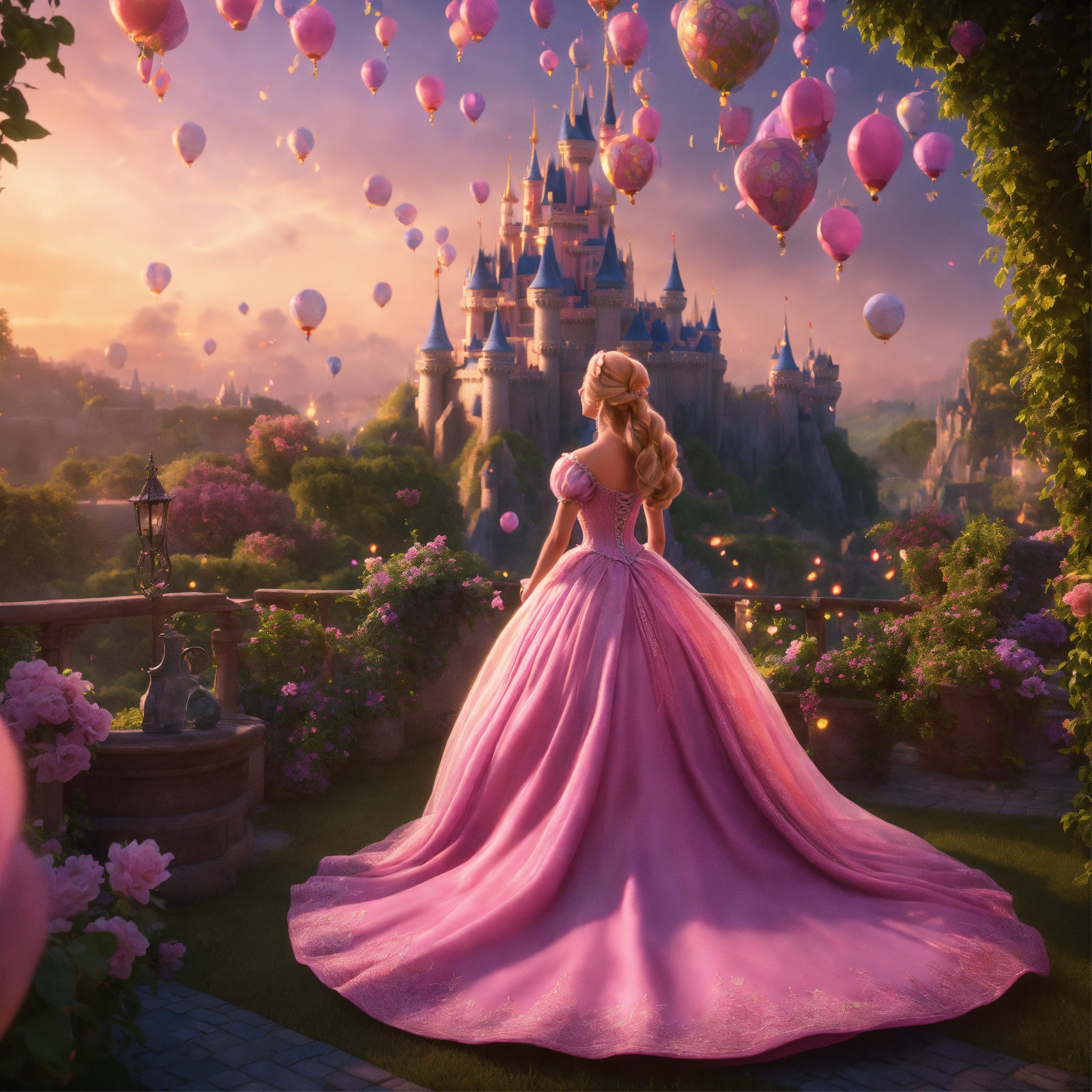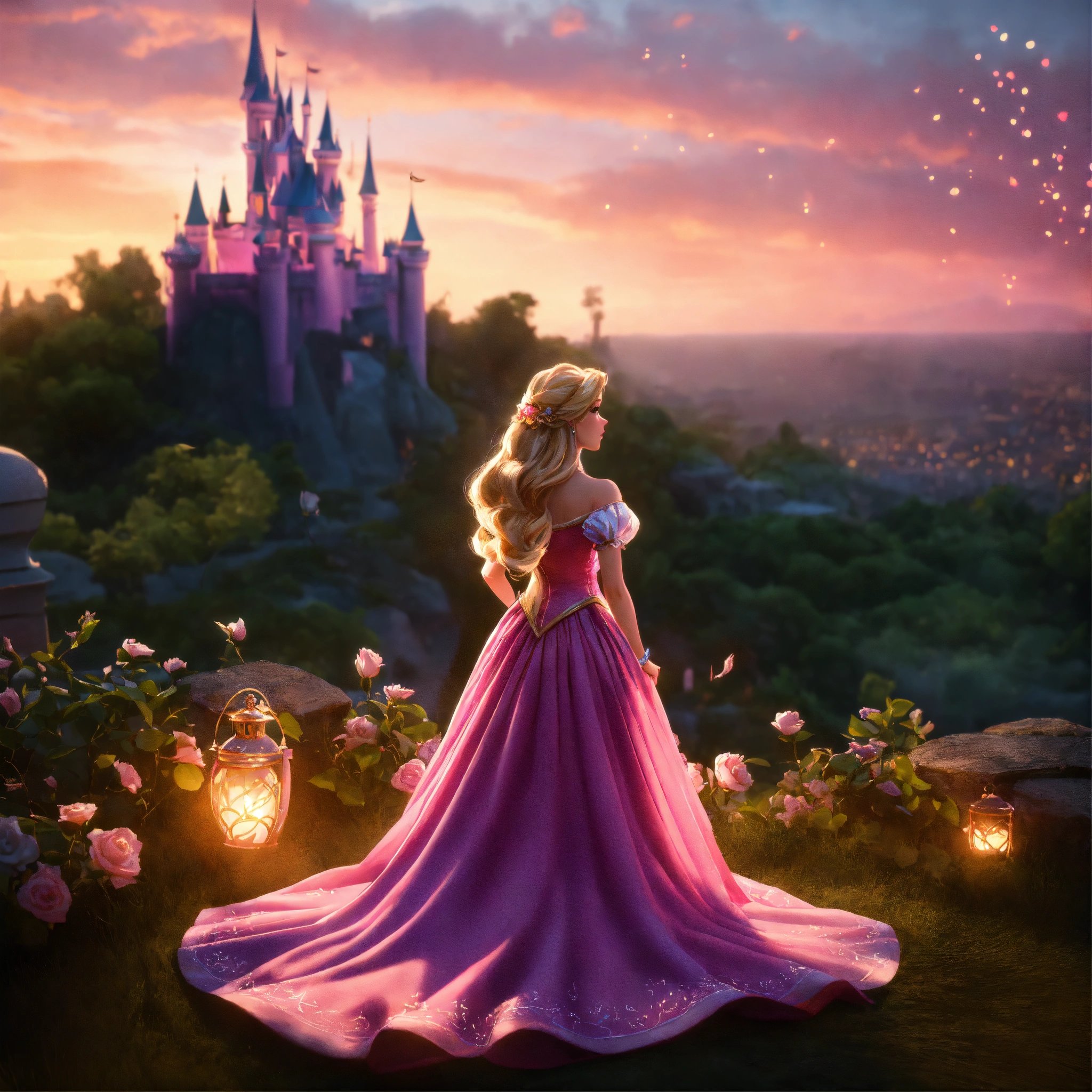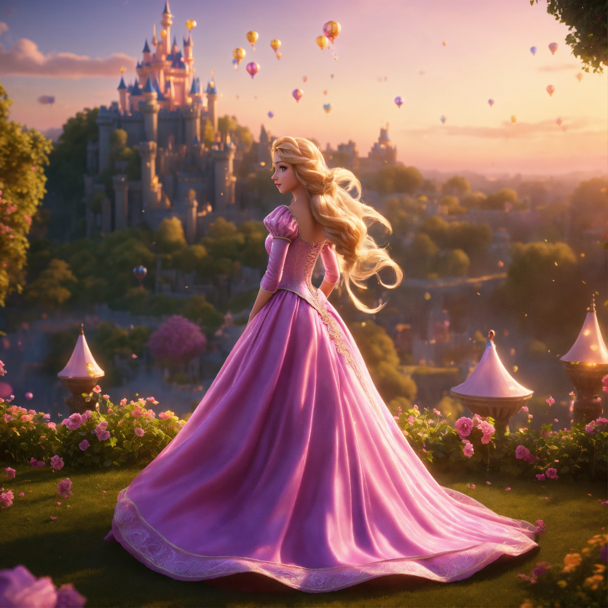 Unreal engine 8k full body portrait of a realistic human disney princess rapunzel from tangled disney movie in a pink disney princess ball gown staring at her disney castle from far away and watching the paper laterns flying up in the sky