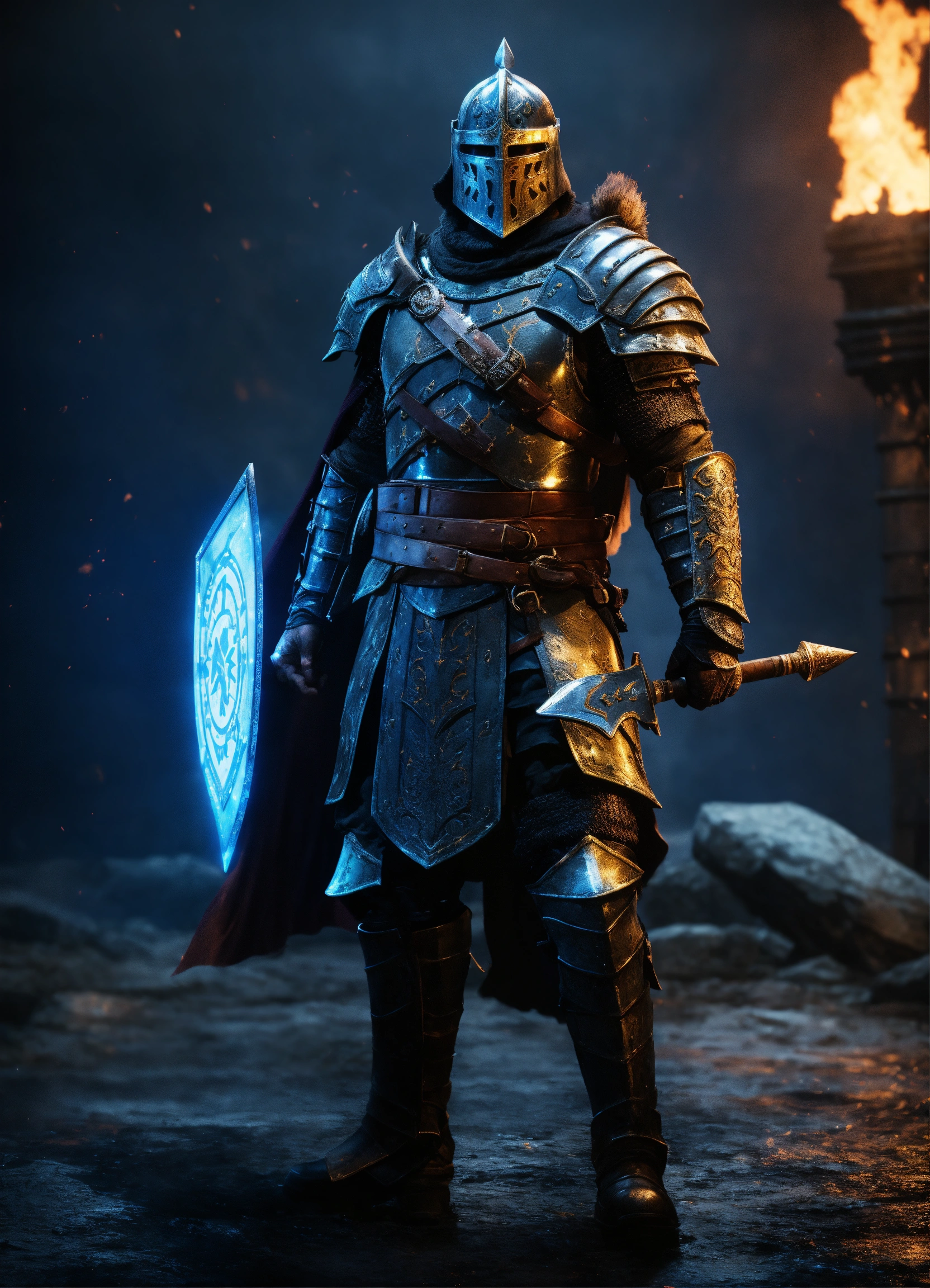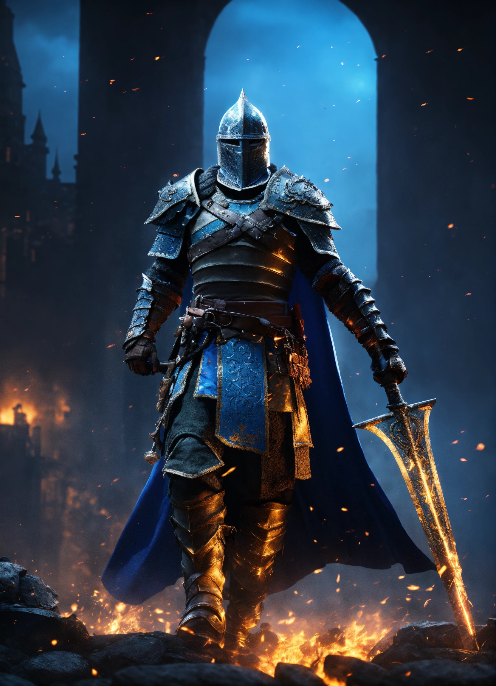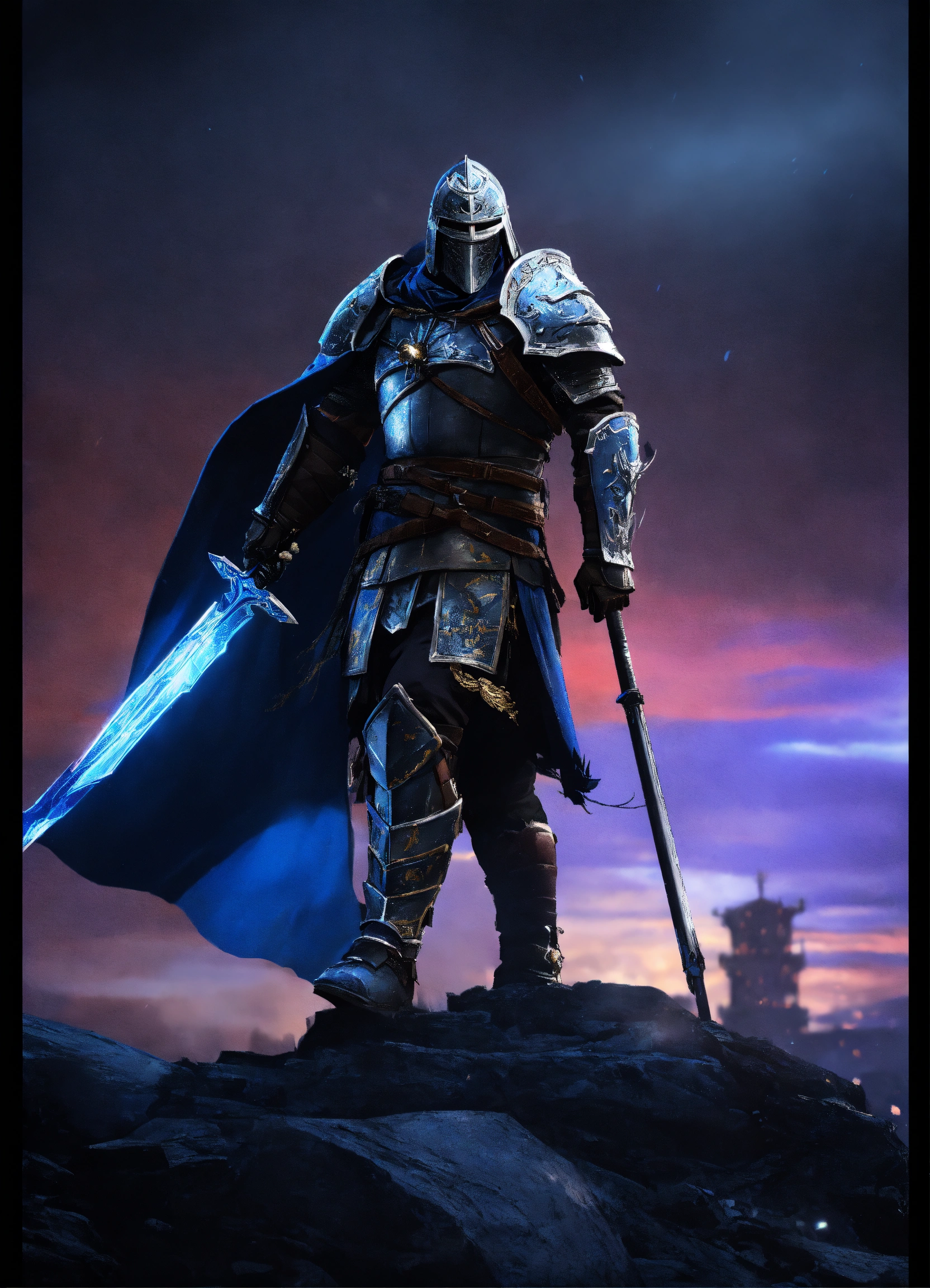 For honor warden with black armor and blue cape, shiny, apocalyptic, dark background towers, 8k, volumetric lighting, comic style