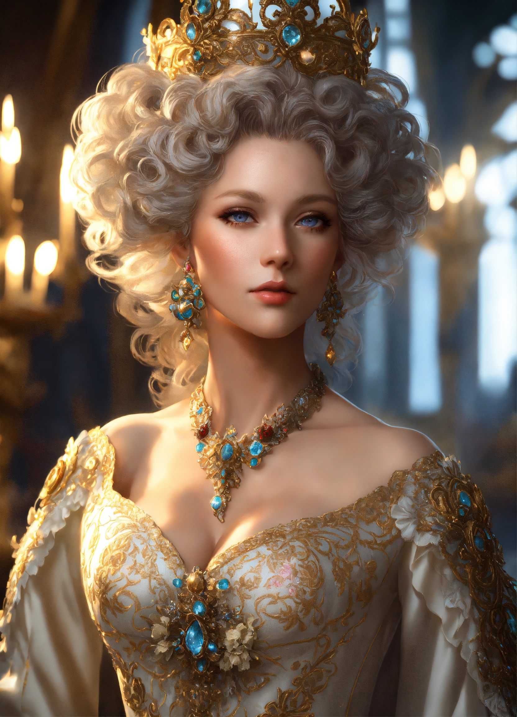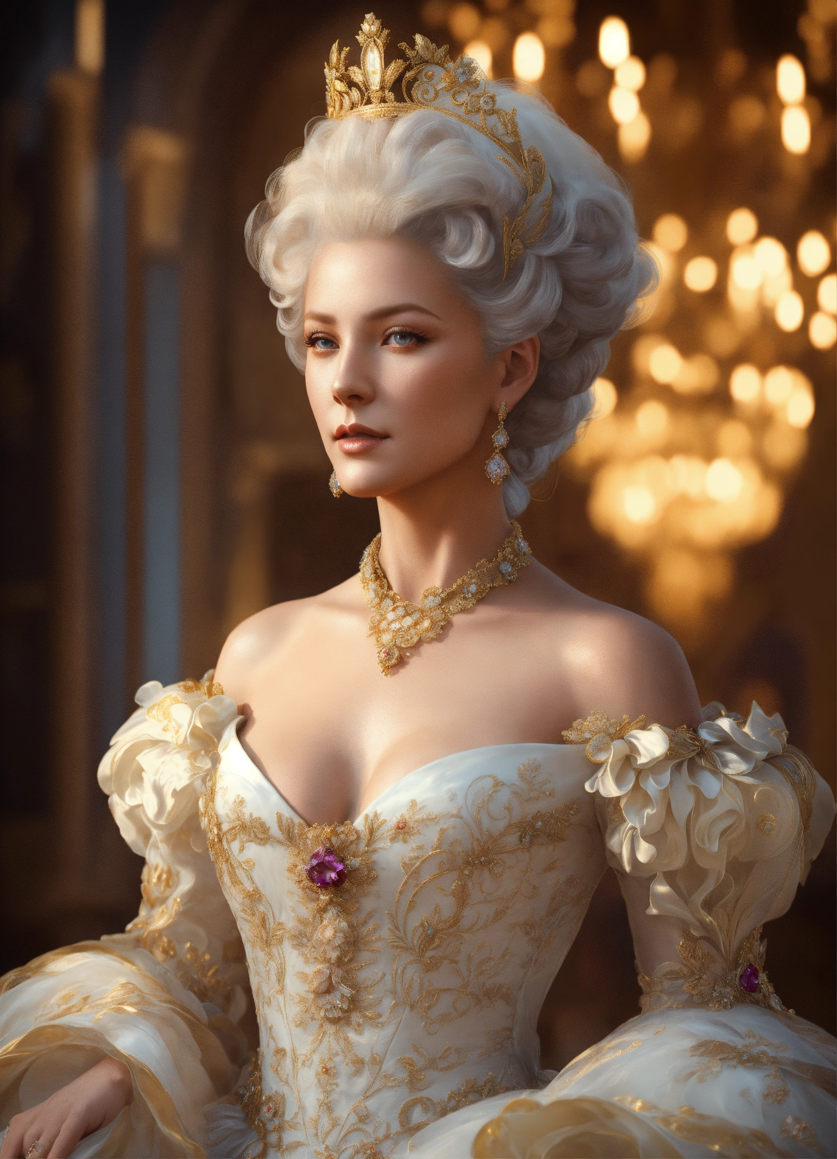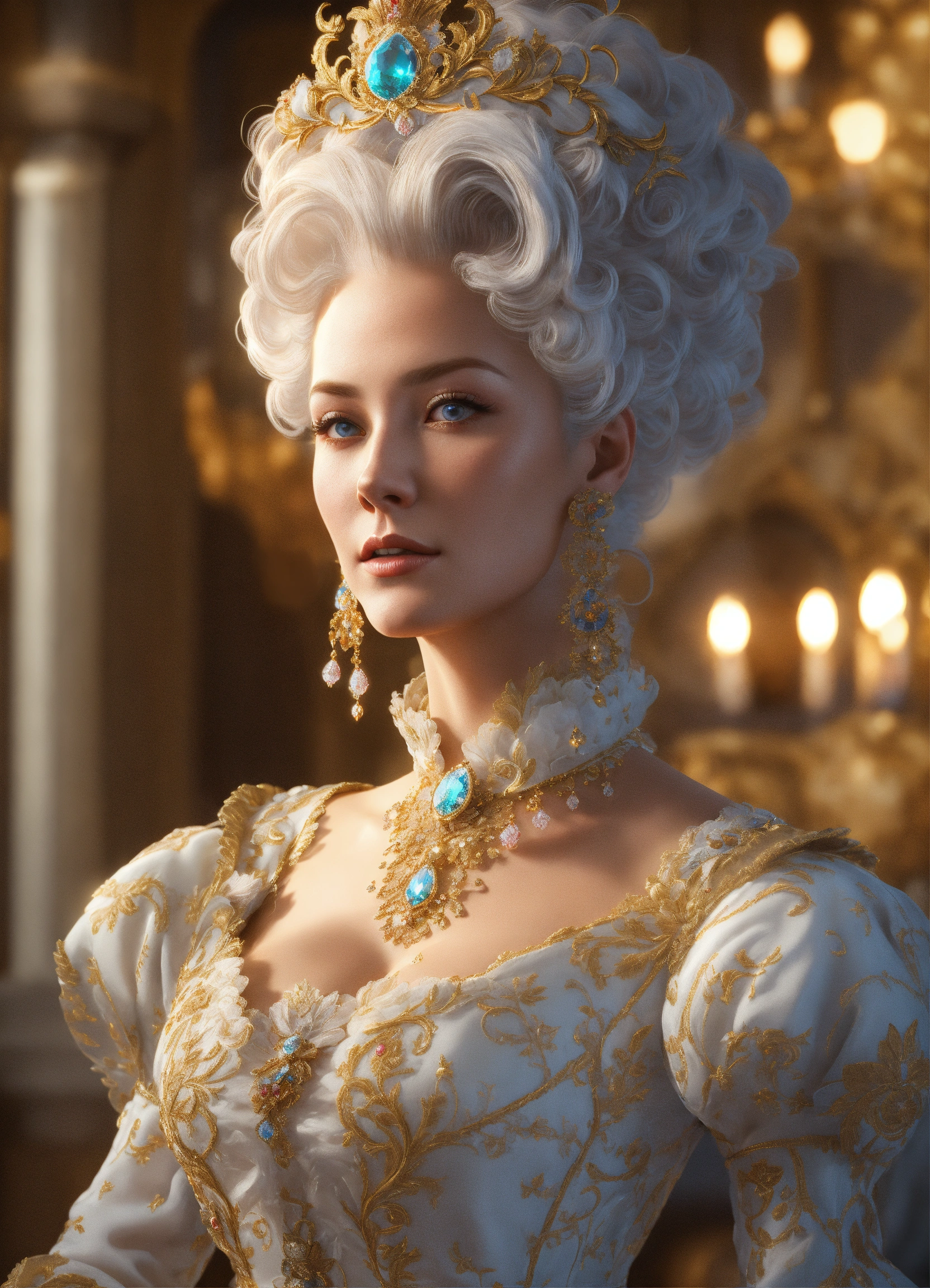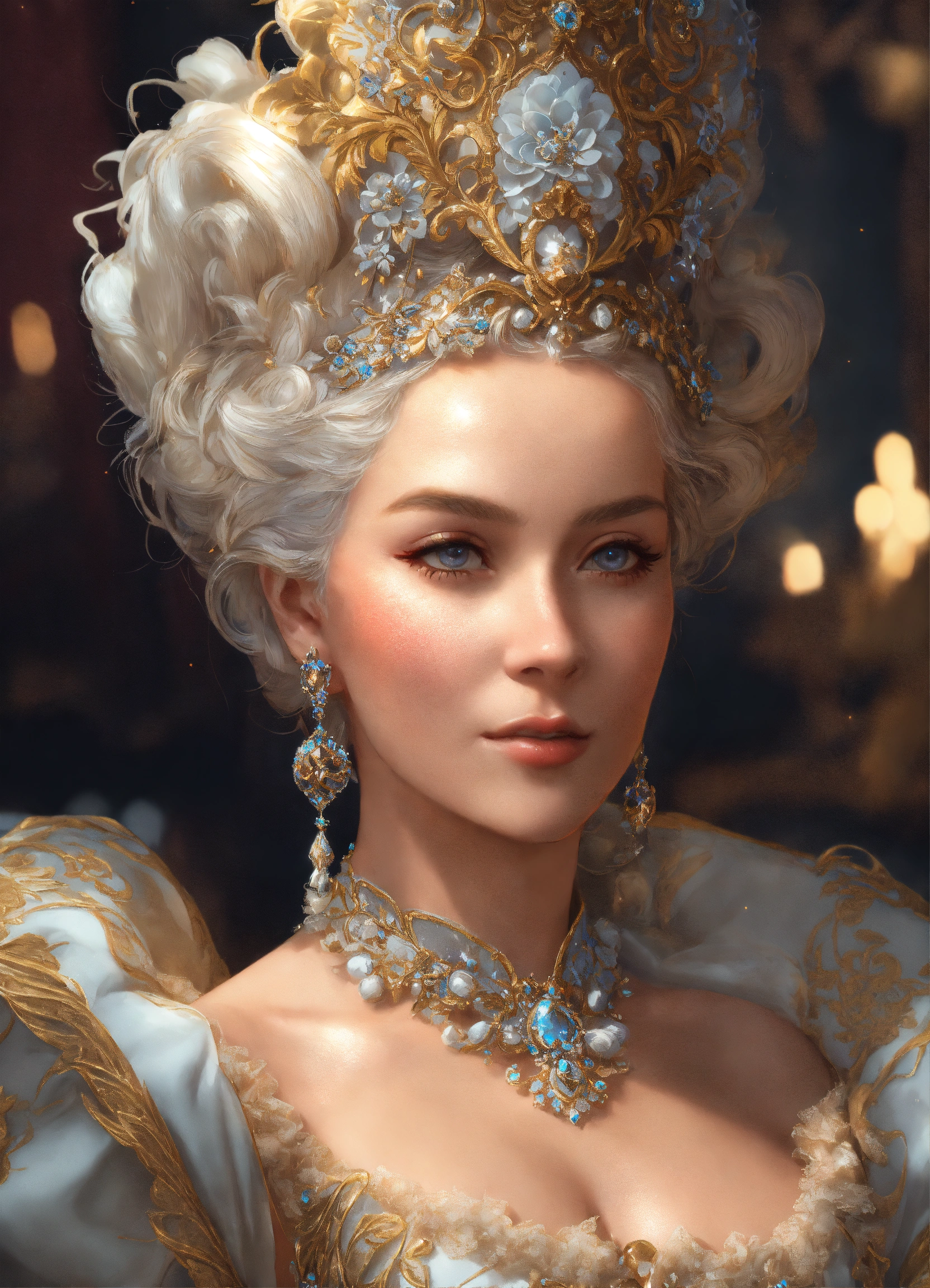 "beautiful rococo queen", 52 years old, ai, elaborate gown, massive white rococo hair, head and shoulders portrait, finely drawn eyes, 8k resolution concept art portrait dynamic lighting hyperdetailed intricately detailed splash art trending on artstation unreal engine 5 volumetric lighting