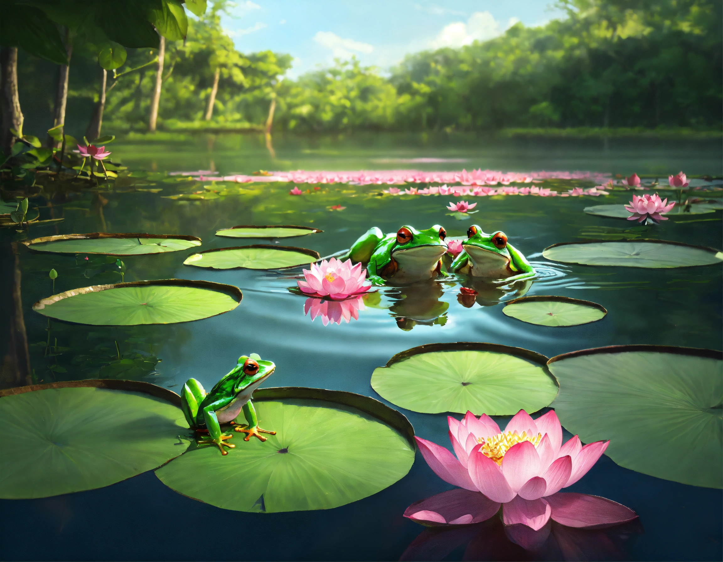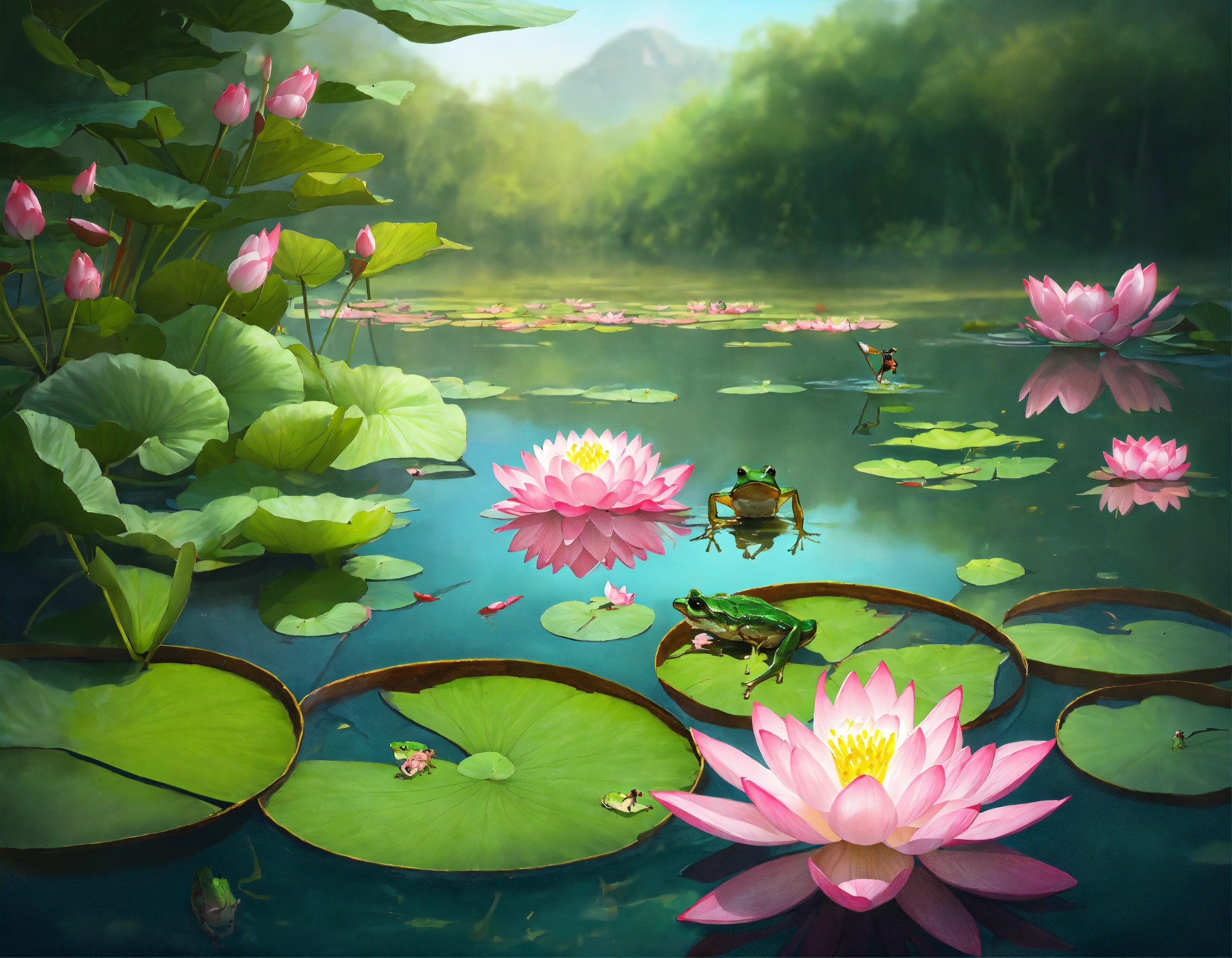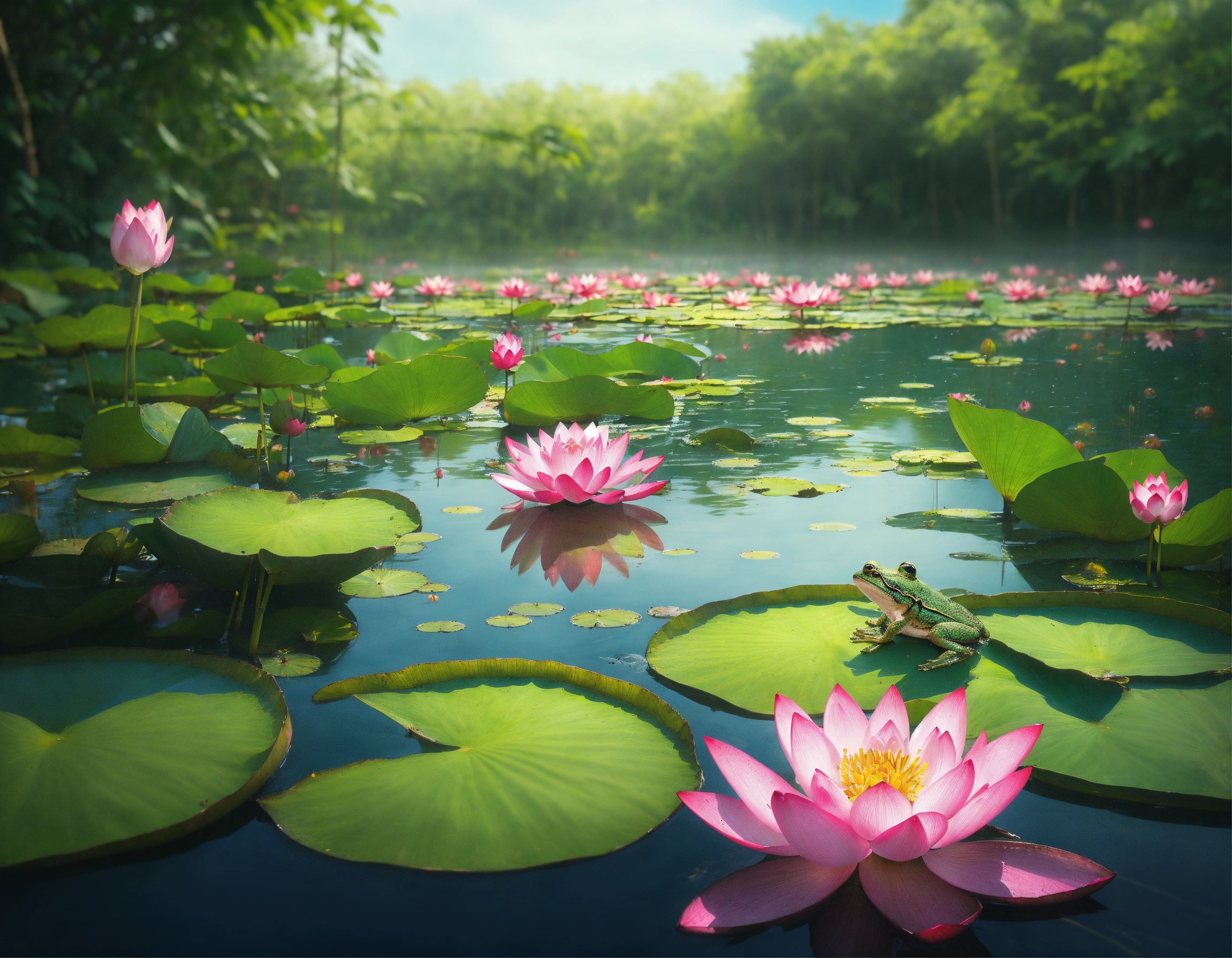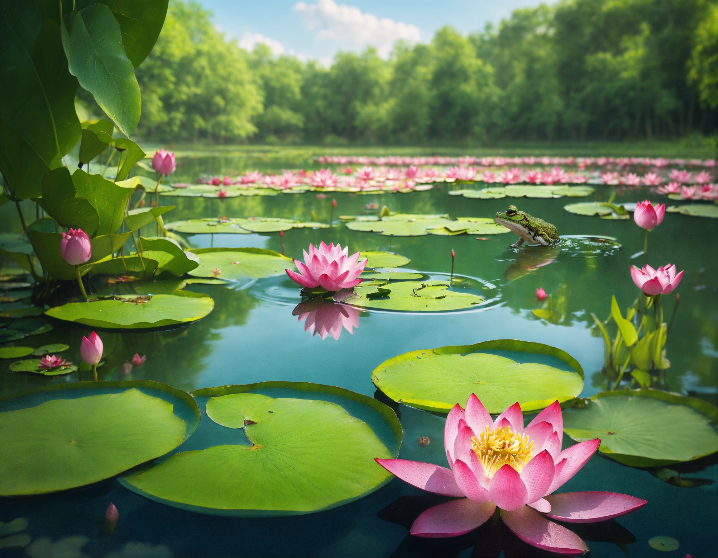 A realistic photo showing frogs and crickets singing in the pond, beautiful pink lotus flowers and green leaves of quietly flowing water, in the distance we see a large green forest