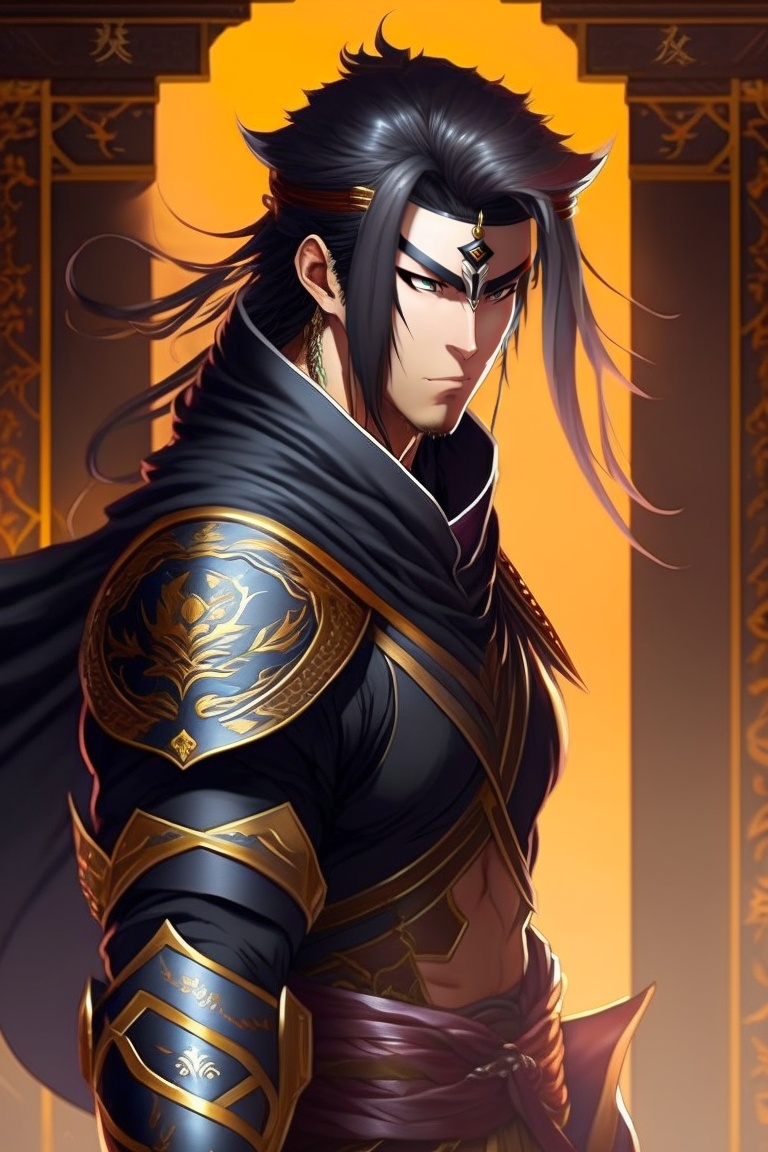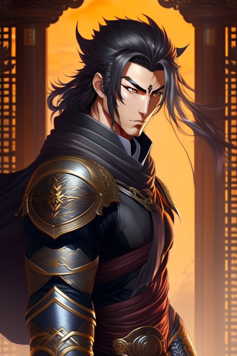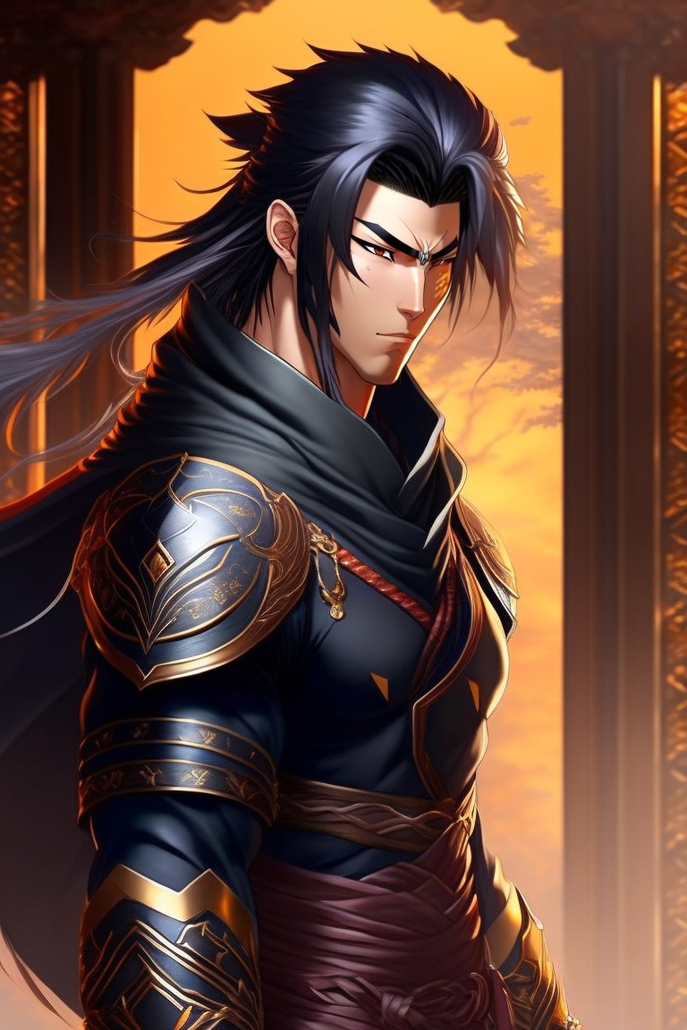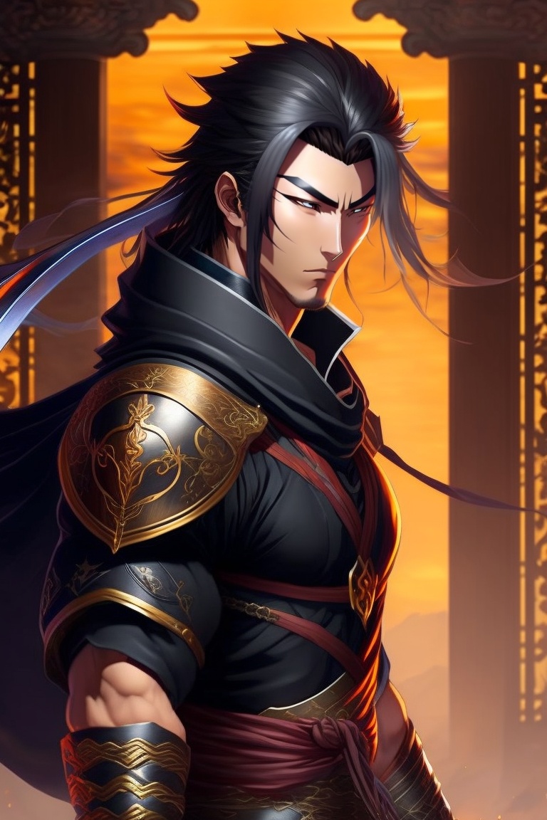Anime style ninja, an imposing figure standing at an impressive height, he possesses a muscular and well-built physique his features are sharp and chiseled, he has a strong jawline and piercing eyes his eyes, a deep shade of amber, he has a mane of thick, dark hair that cascades down to his broad shoulders. the hair is tied back, revealing a few strands that frame his face. he wears a combination of lightweight, flexible armor and flowing black robes adorned with intricate designs that evoke the image of a stalking tiger. in his hand a nodachi, the blade glimmers with an ethereal energy