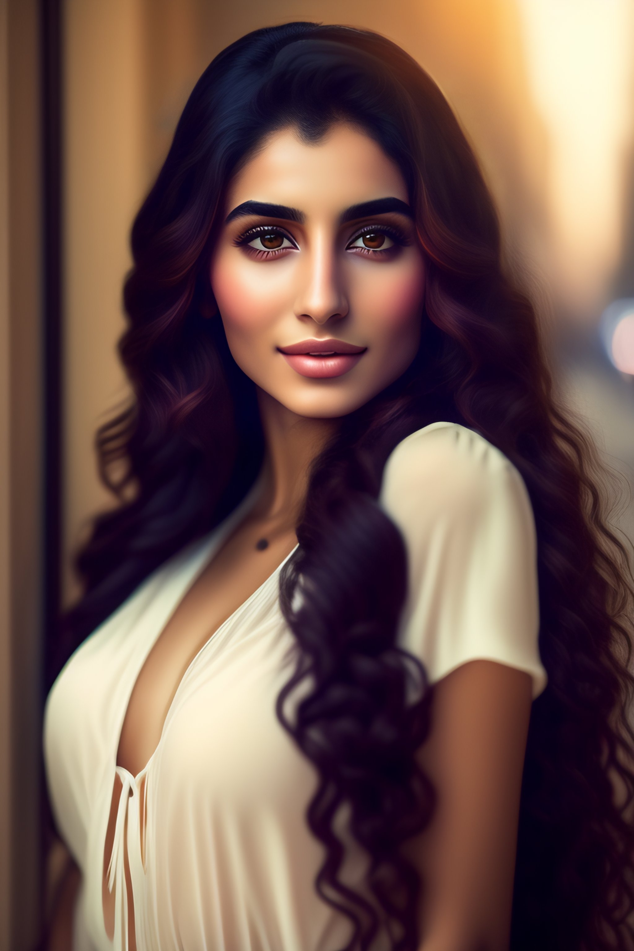 Young middle eastern woman, pretty nose, wavy hair, armenia, round eyes, round face, small thick lips, soft jawline
