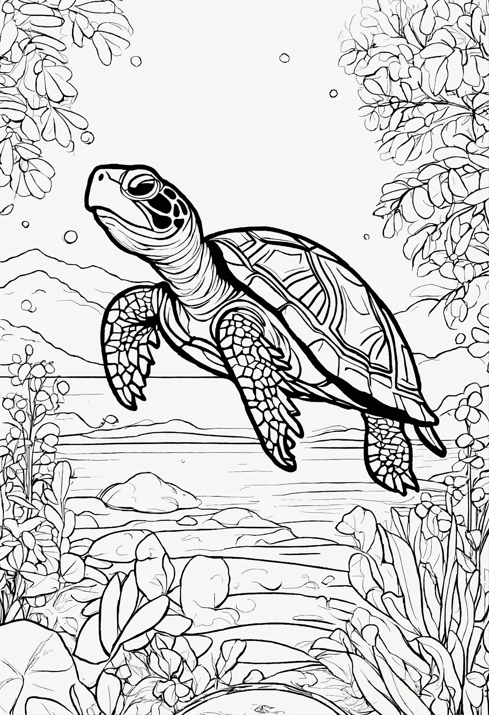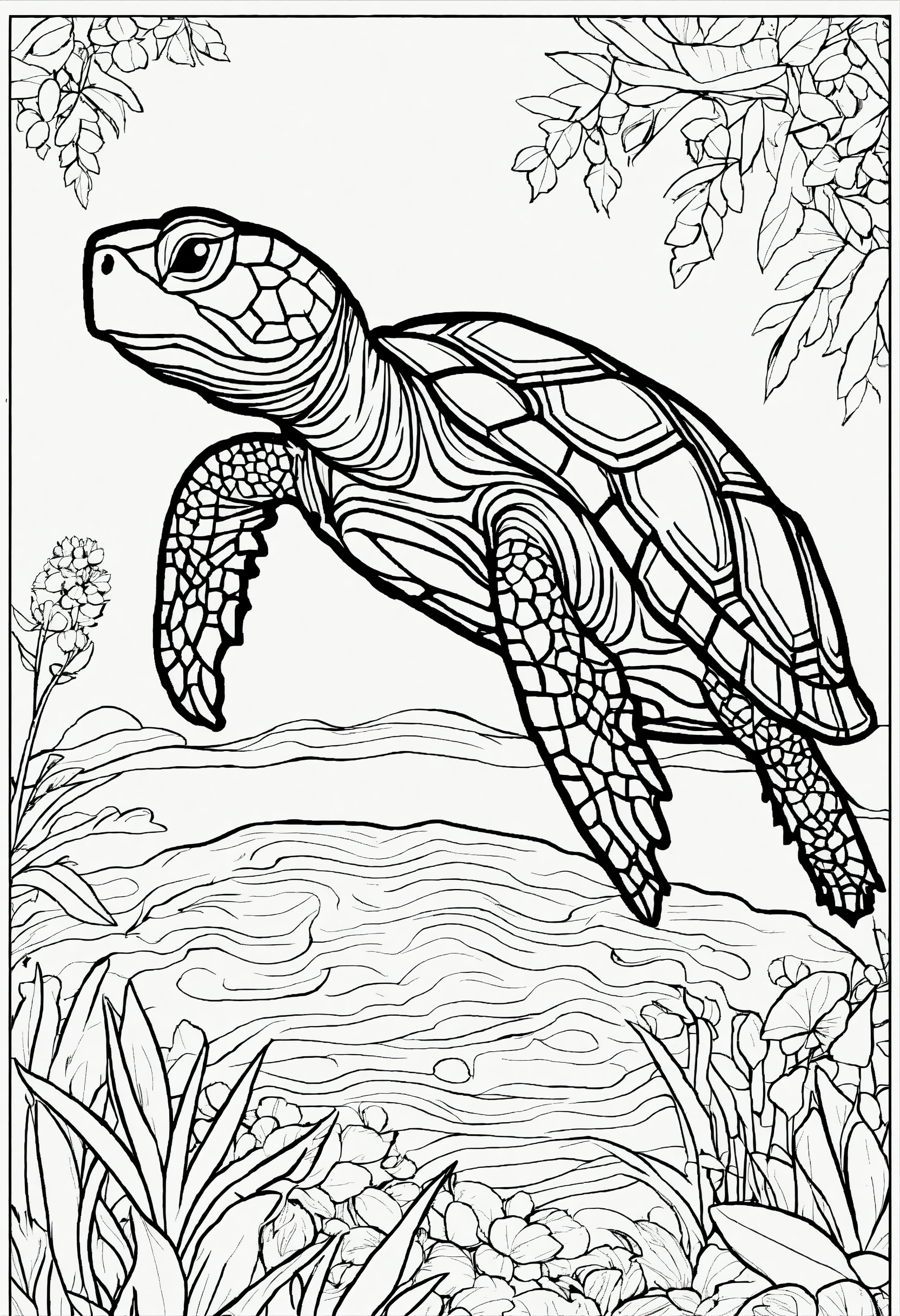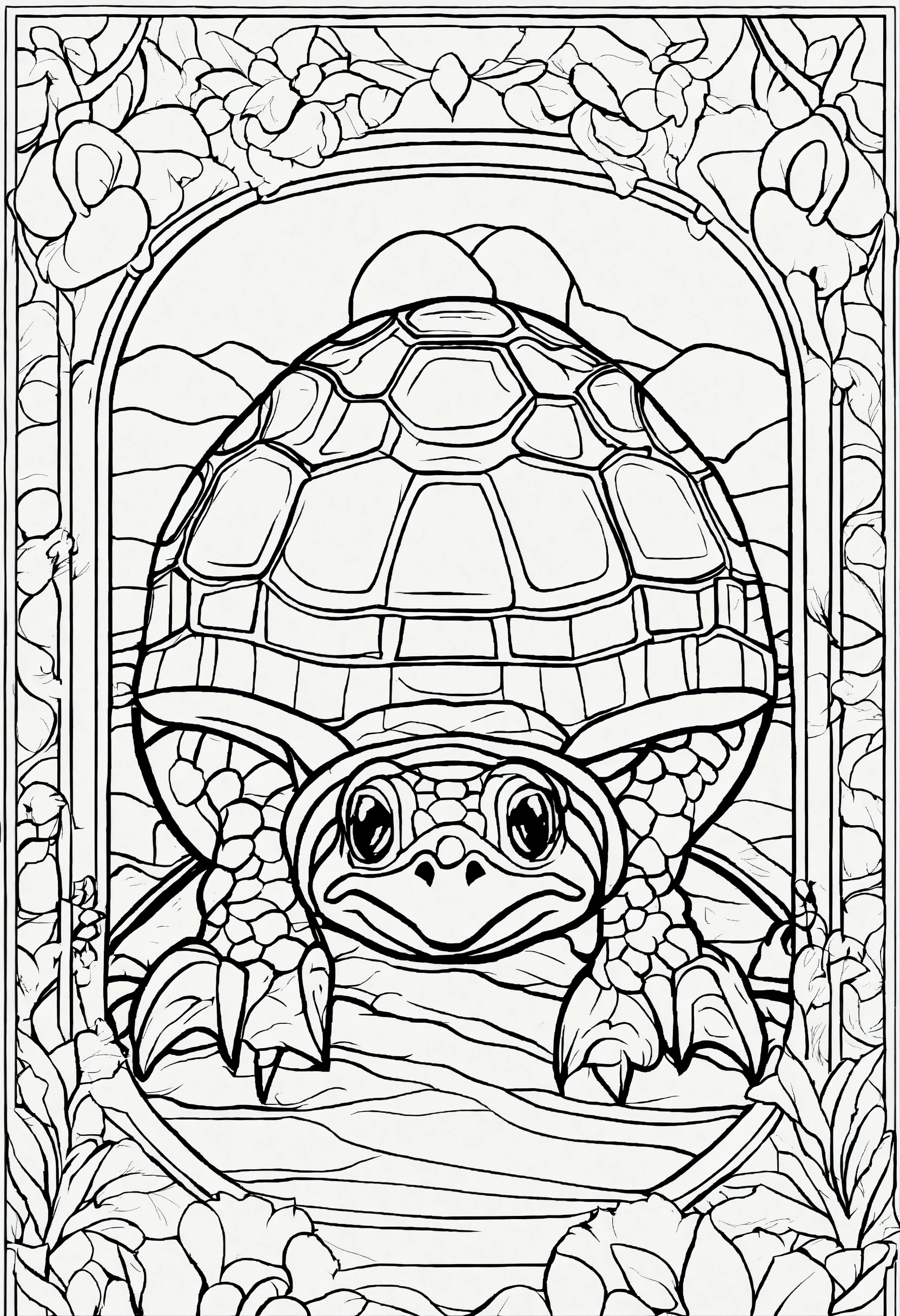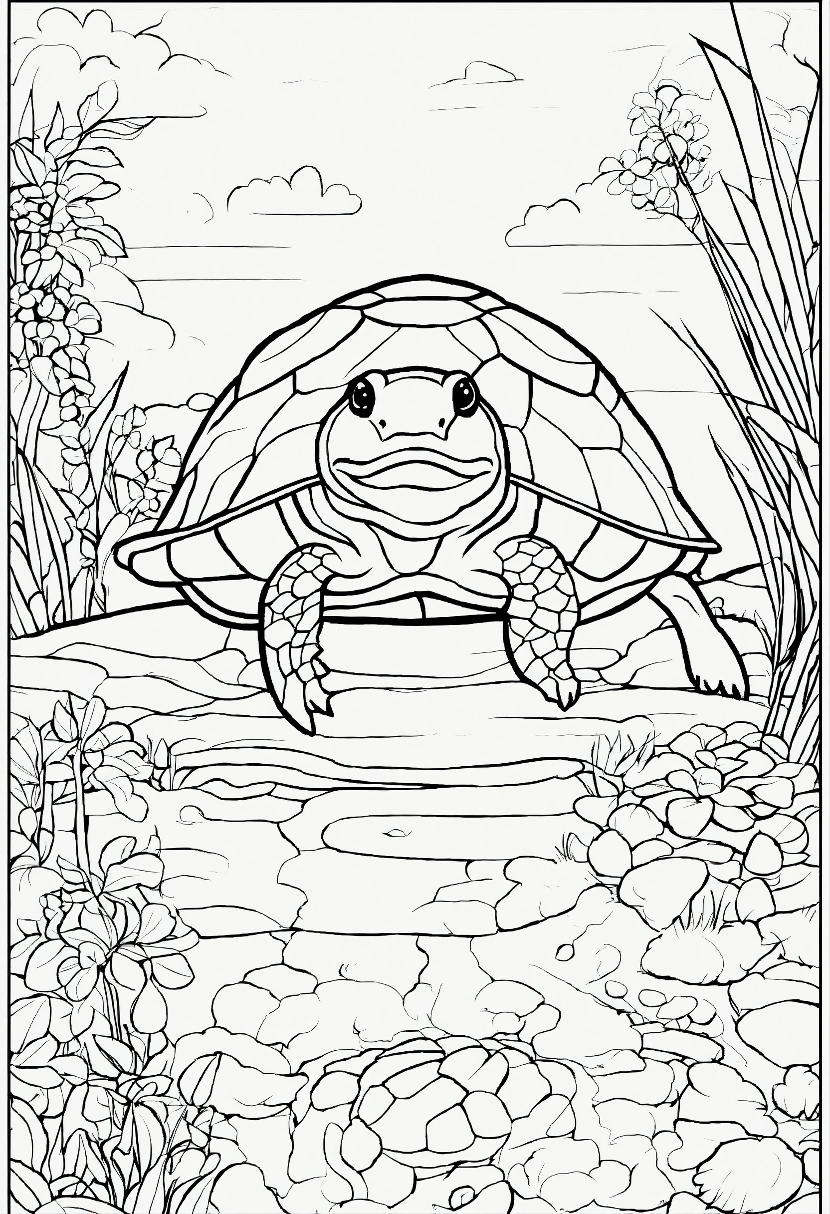 Coloring book for toddlers, simple lines drawings, no lines inside of the drawing, pet turtle, cartoon, full body, outline of the drawing in bold line, symmetrical, white background., no background image.