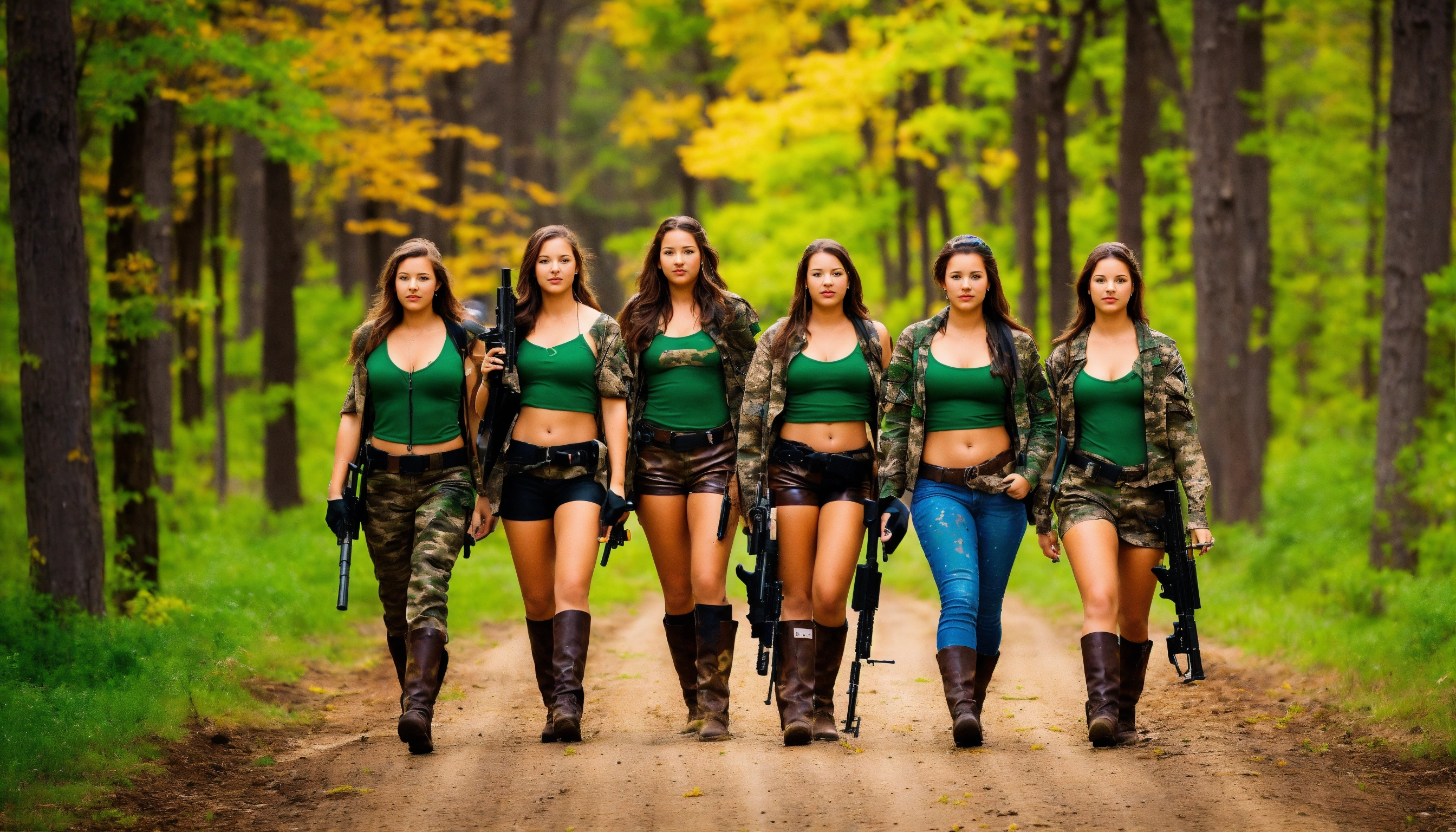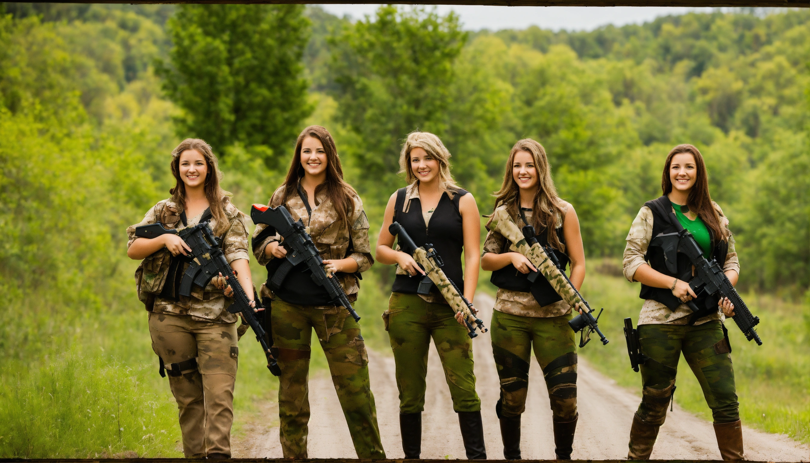 Group of college age women, wearing green and brown leather camouflage, paint ball guns, country dirt road