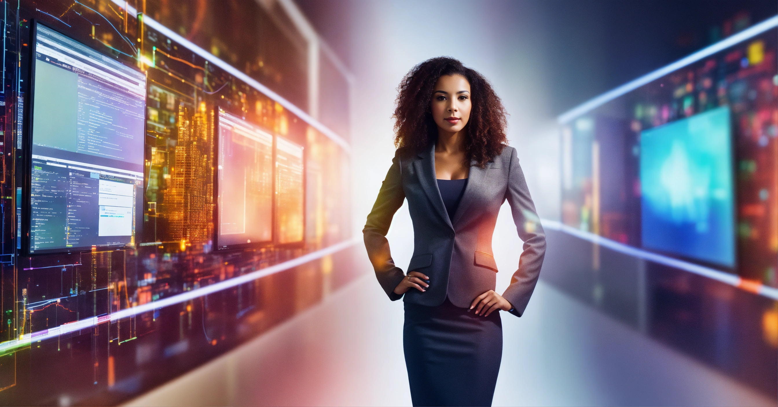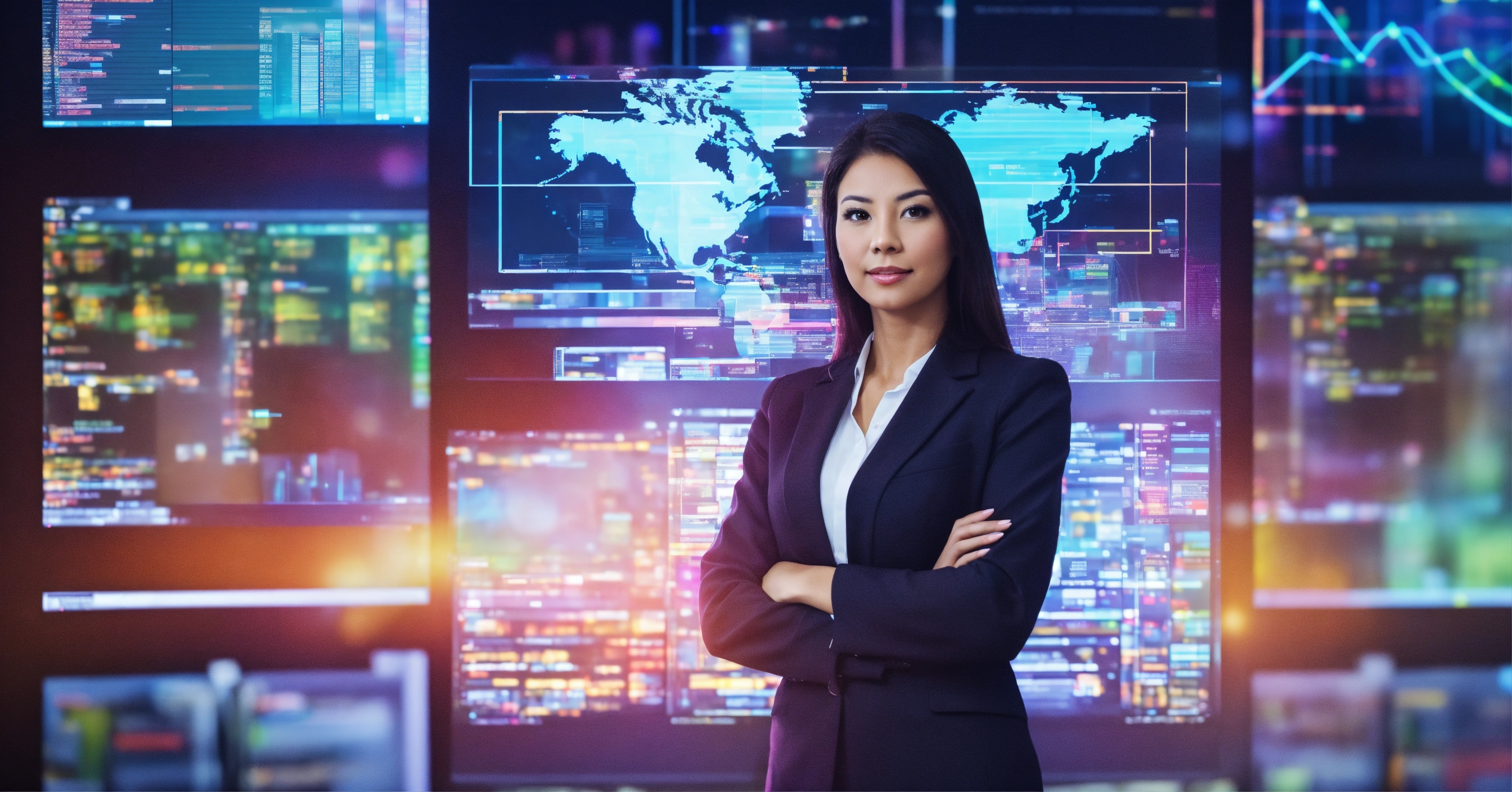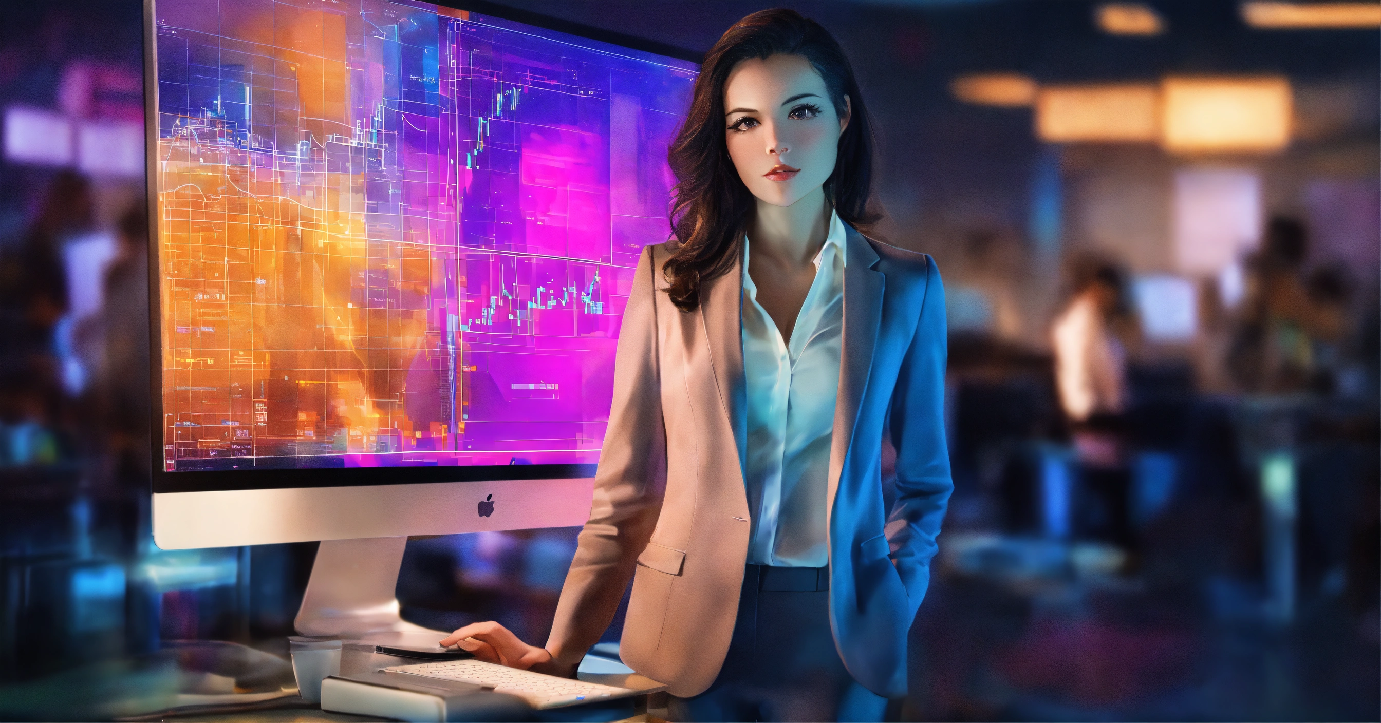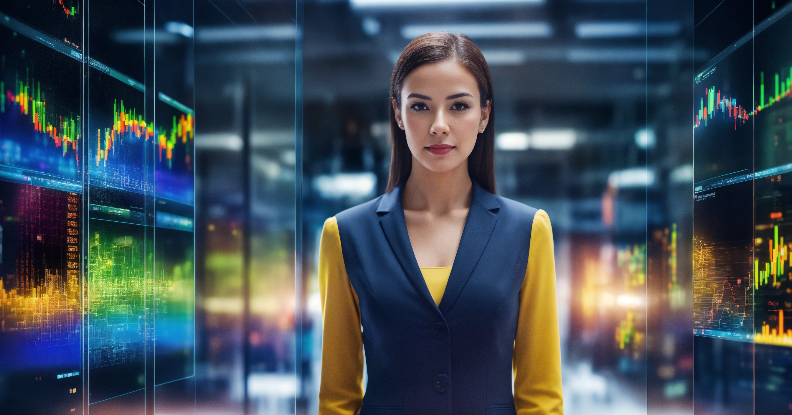 A vibrant image depicts a businesswomen with full body, defocus, standing behind a fully transparent computer screen and looking directly to the camera, rich with diverse business data.