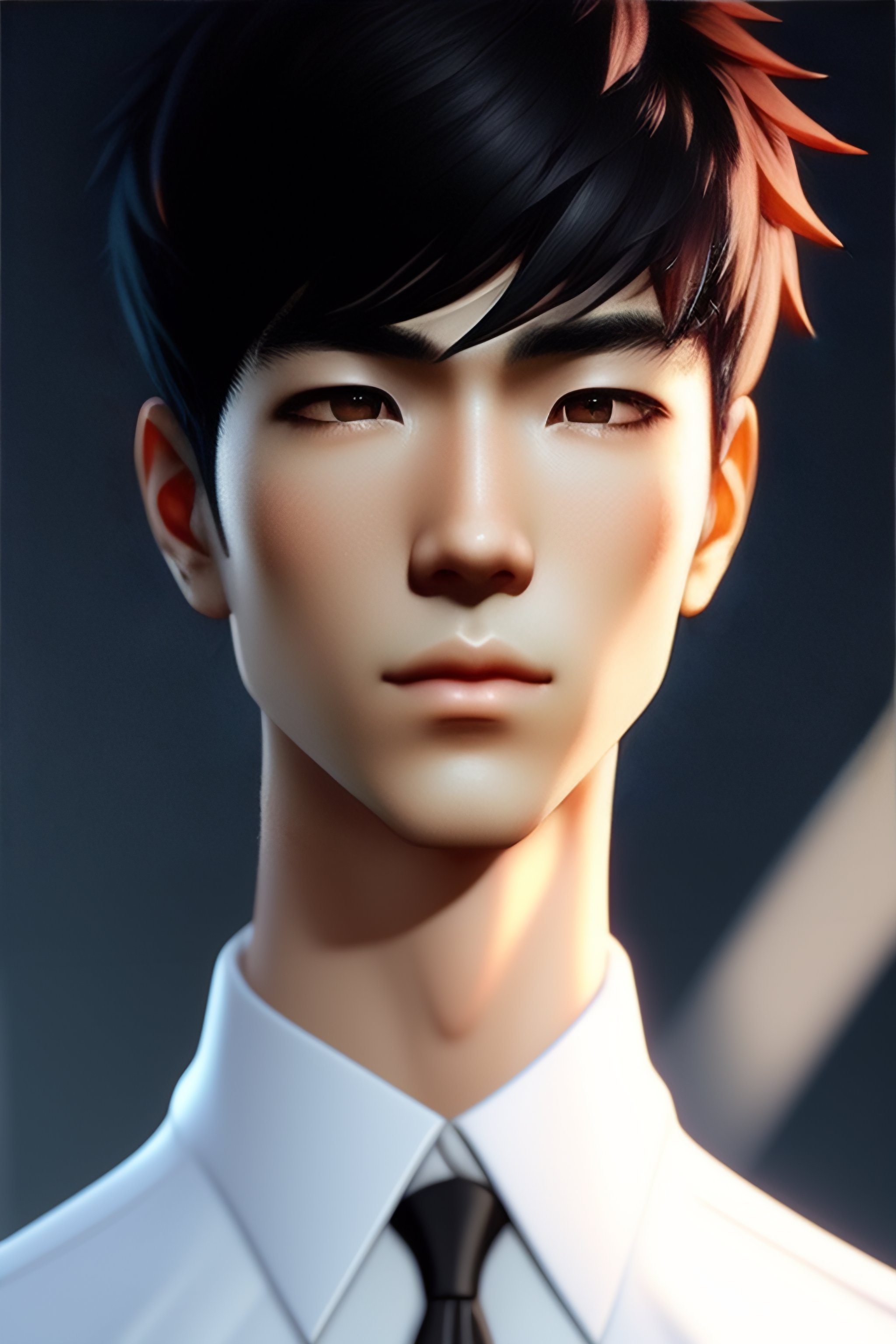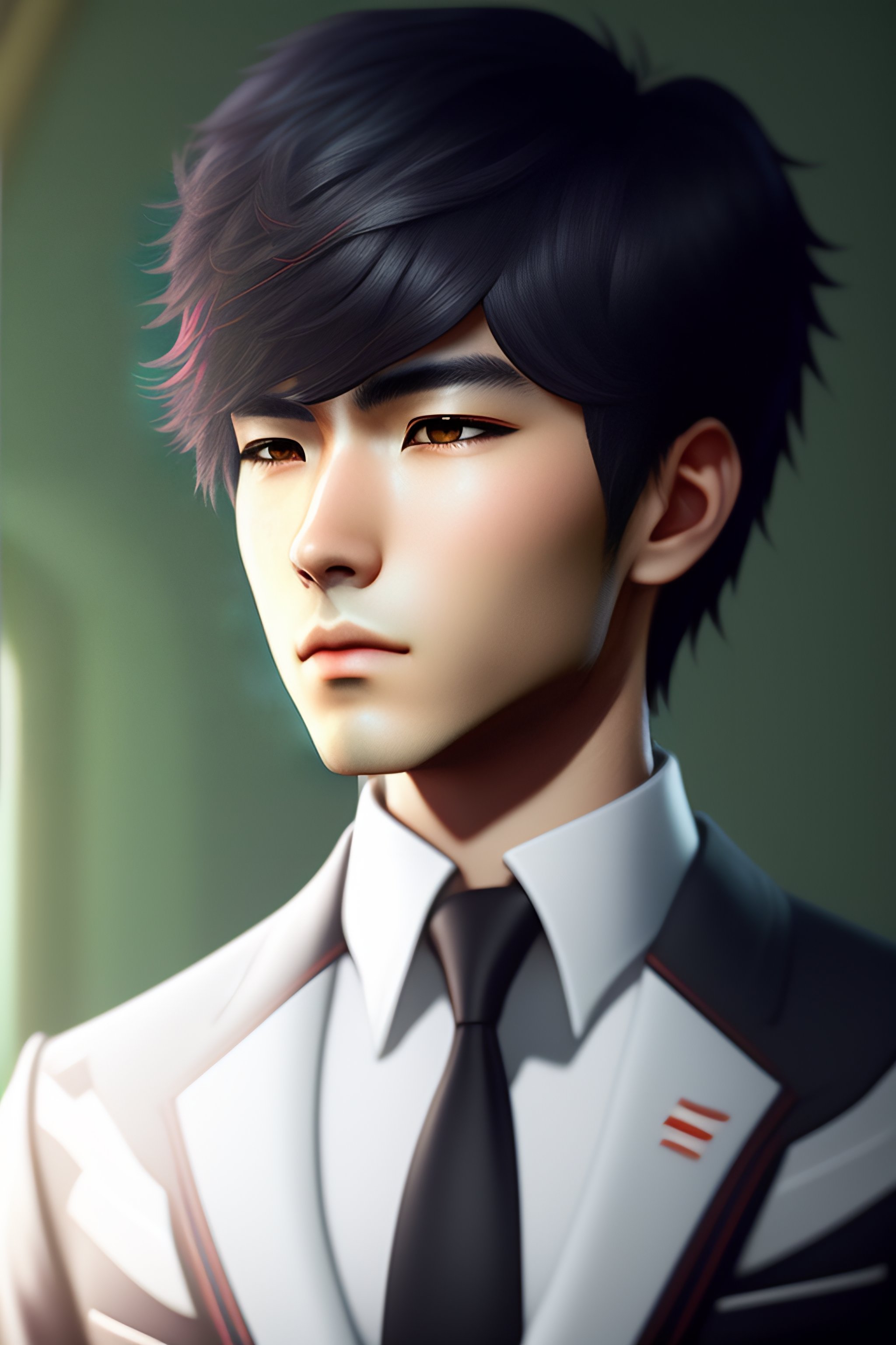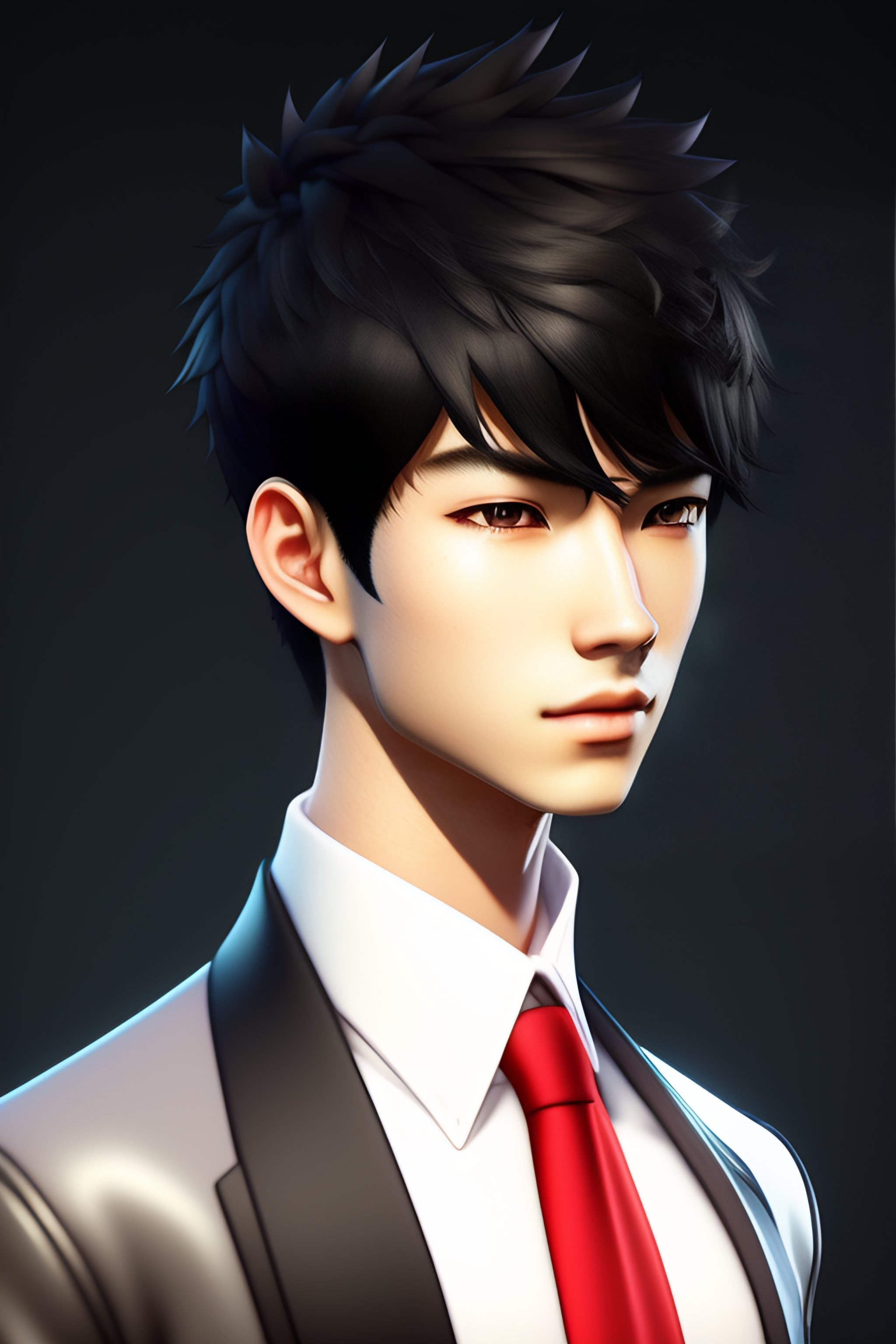 "create a realistic anime-style portrait of a young male character with ai. the character should have a serious expression, with short black hair styled in a spiky fashion. he should be wearing a school uniform, with a white dress shirt, a red necktie, and black pants. the background should be a simple white or light grey gradient".