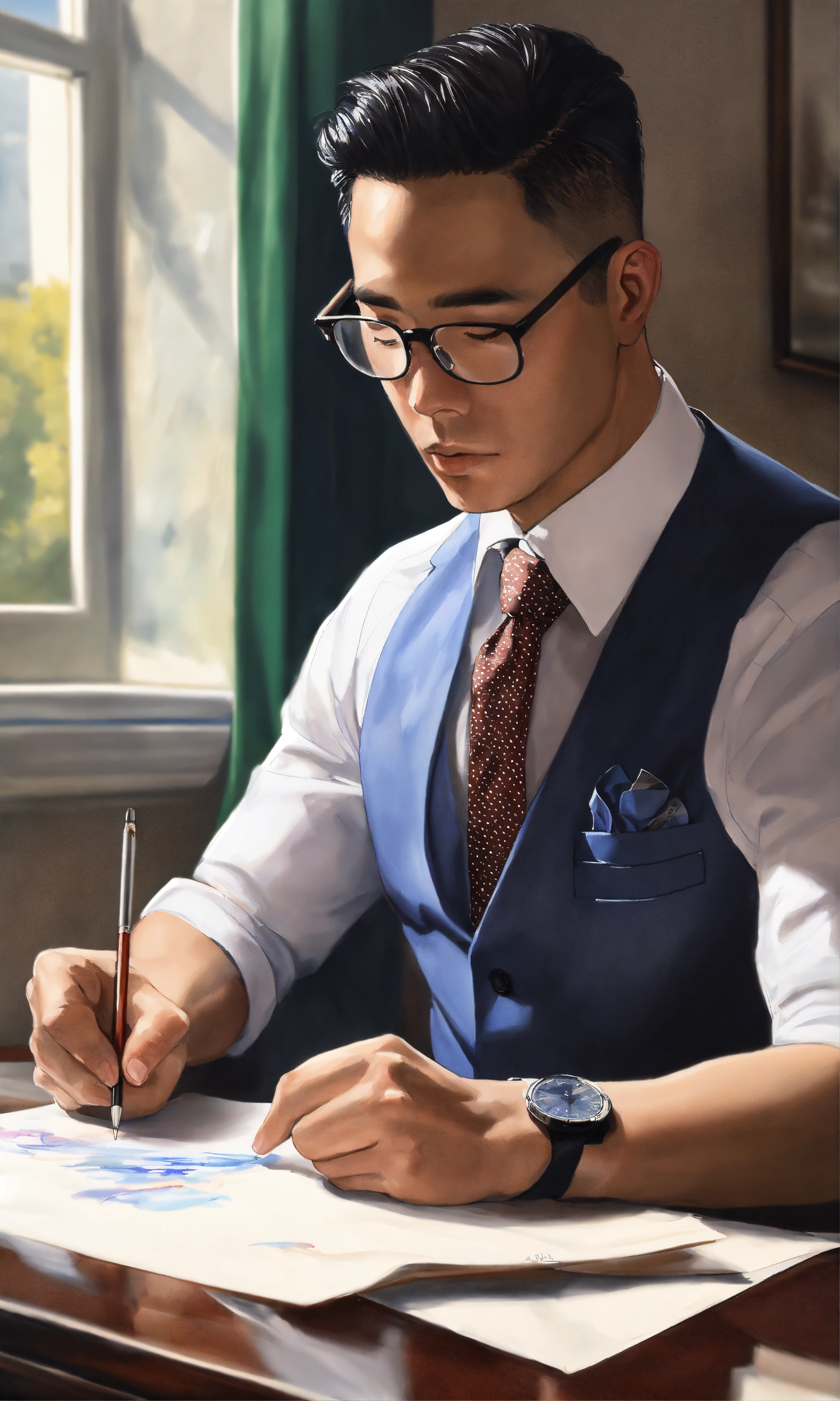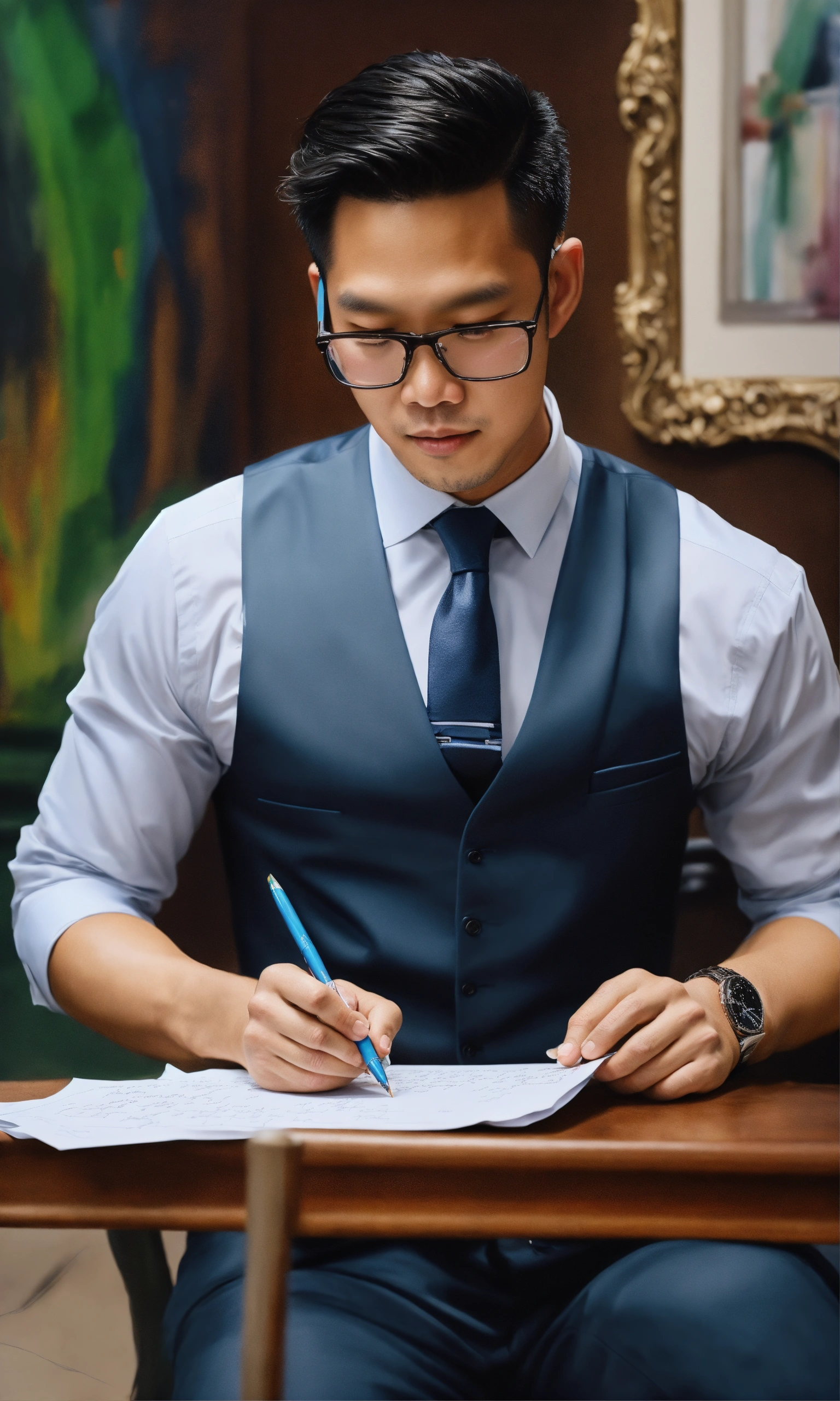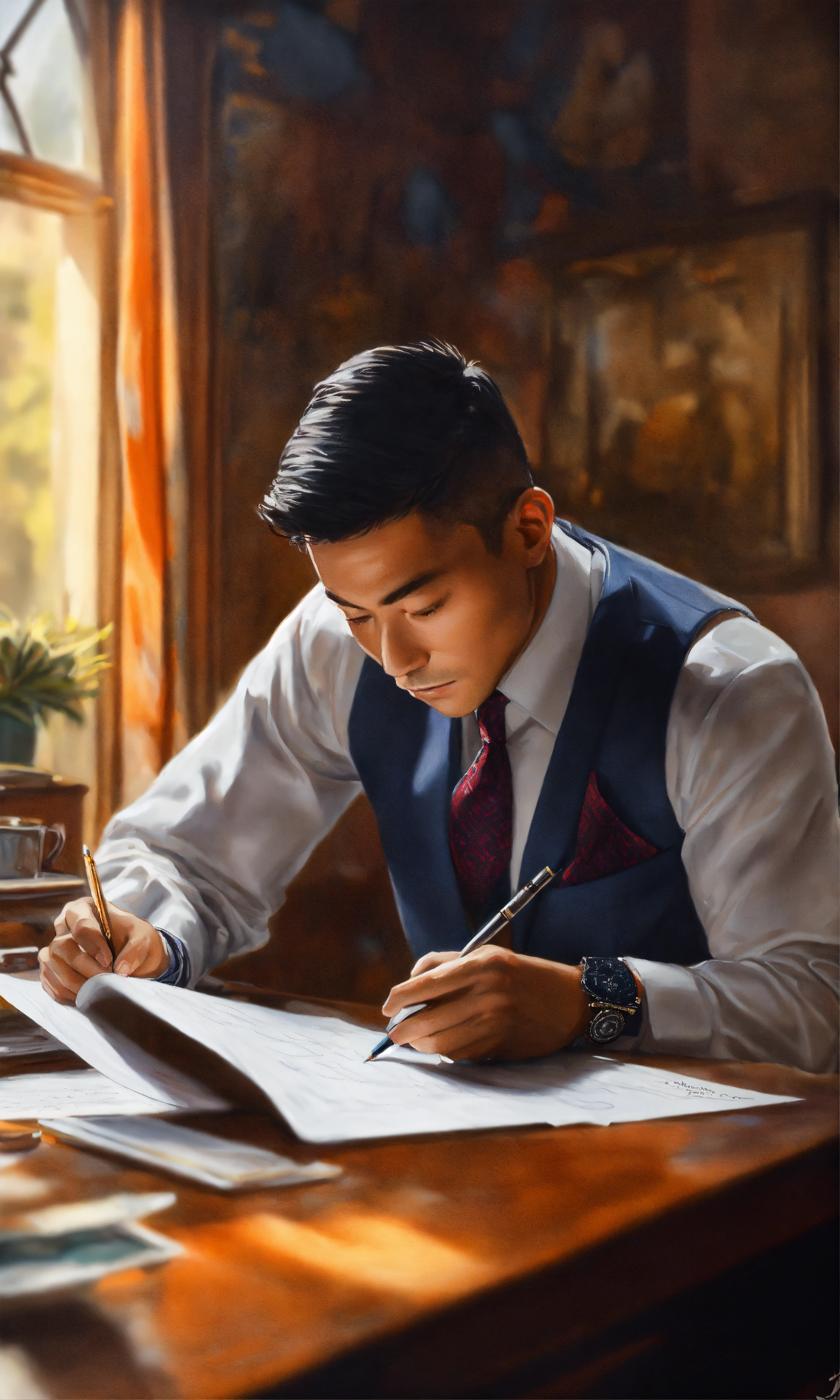 A man in a suit writing on a piece of paper, a hyperrealistic painting, inspired by rudy siswanto, instagram, realism, ifunny watermark, wearing a vest and a tie, super slowmotion, working out