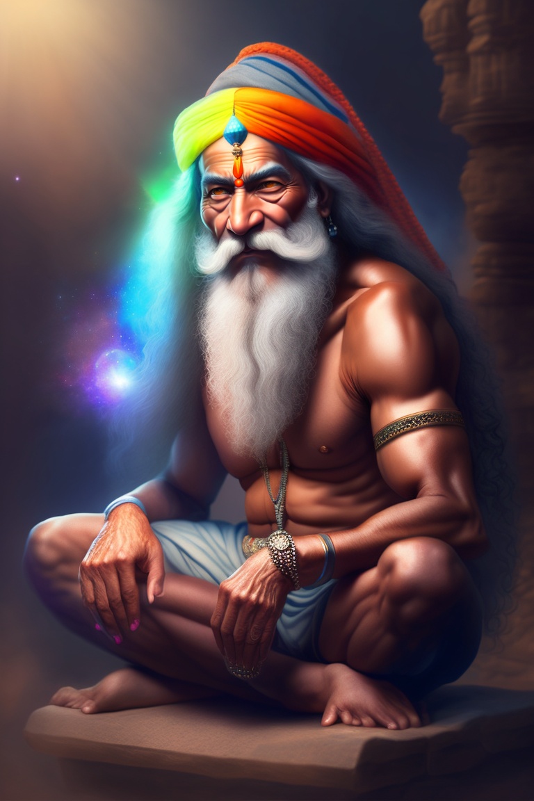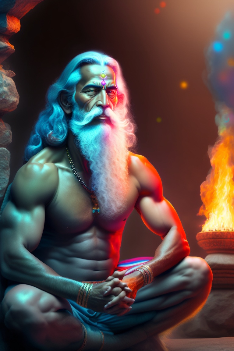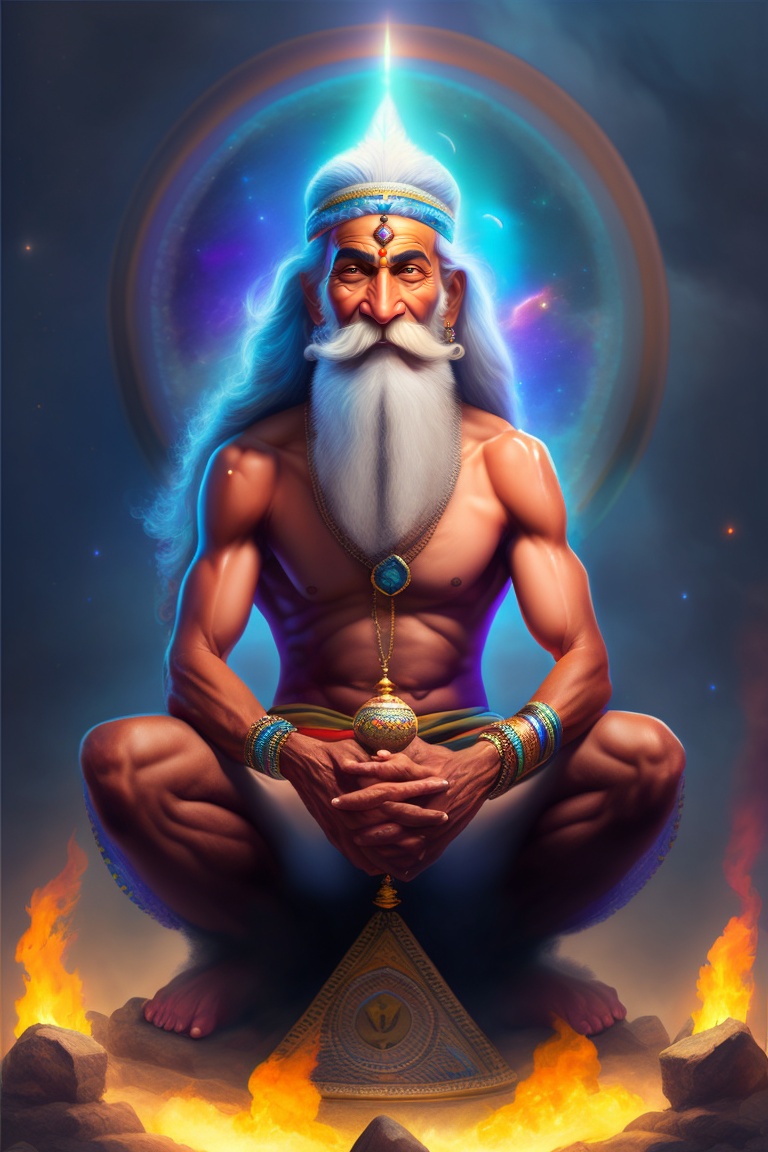 Mystical old himalayan yogi with hypnotising colourfull addictive eyes, having supernatural powers and alienated ornaments sitting in padmasana guiding the world towards destruction. he is aghori and seemed to be known the secrets of universe also showing index finger upwardsm having little smile on m