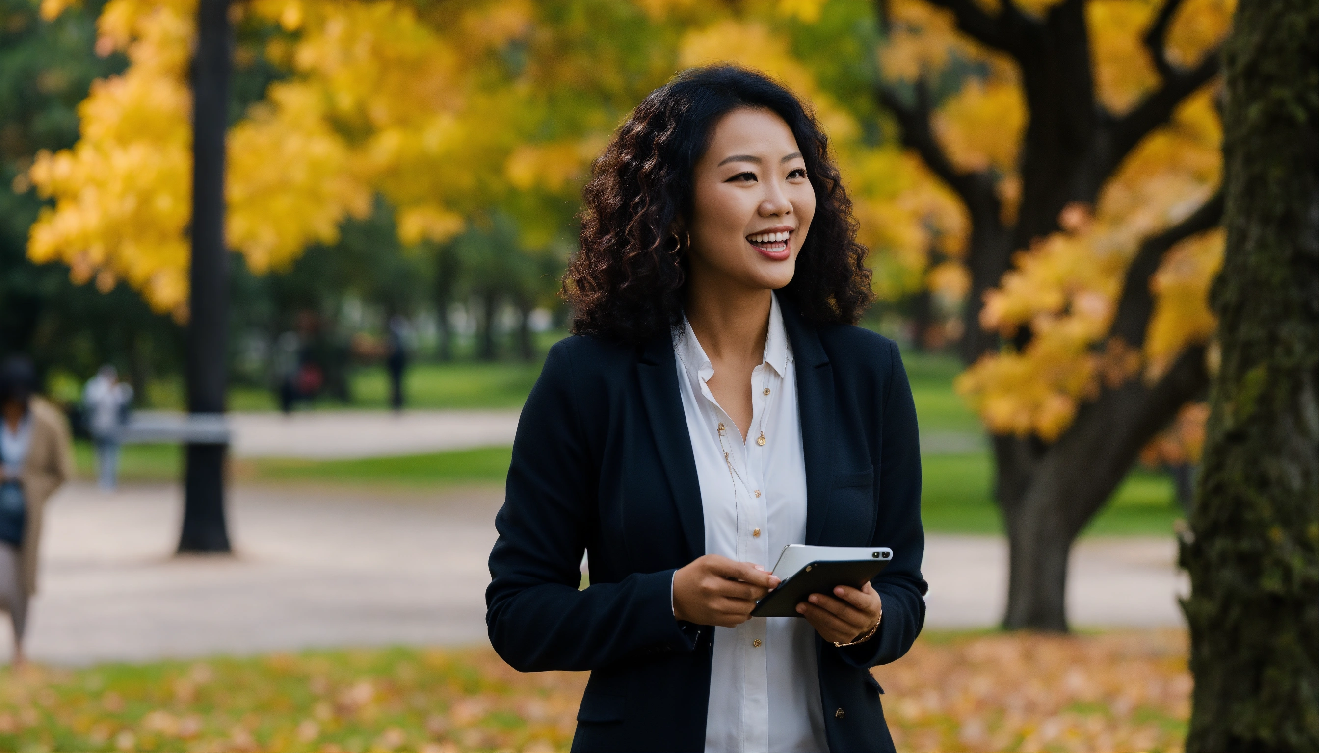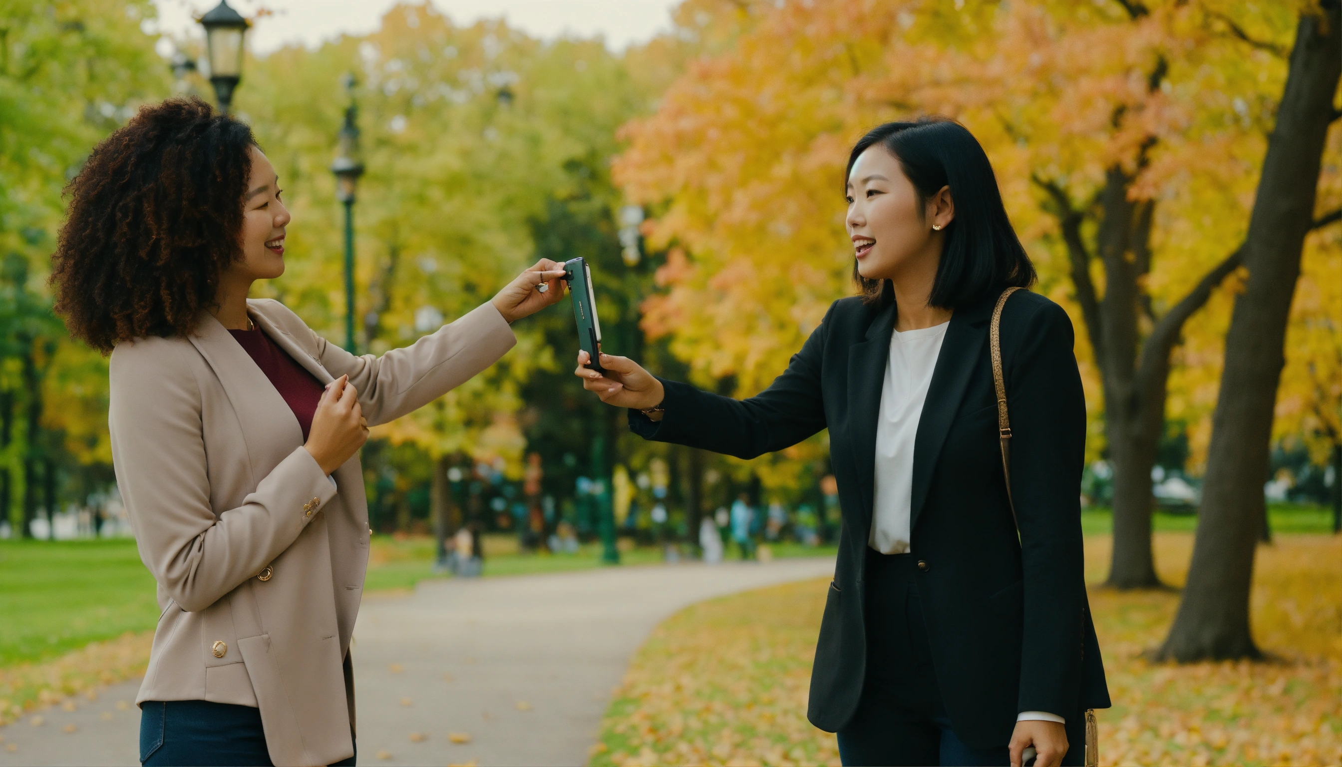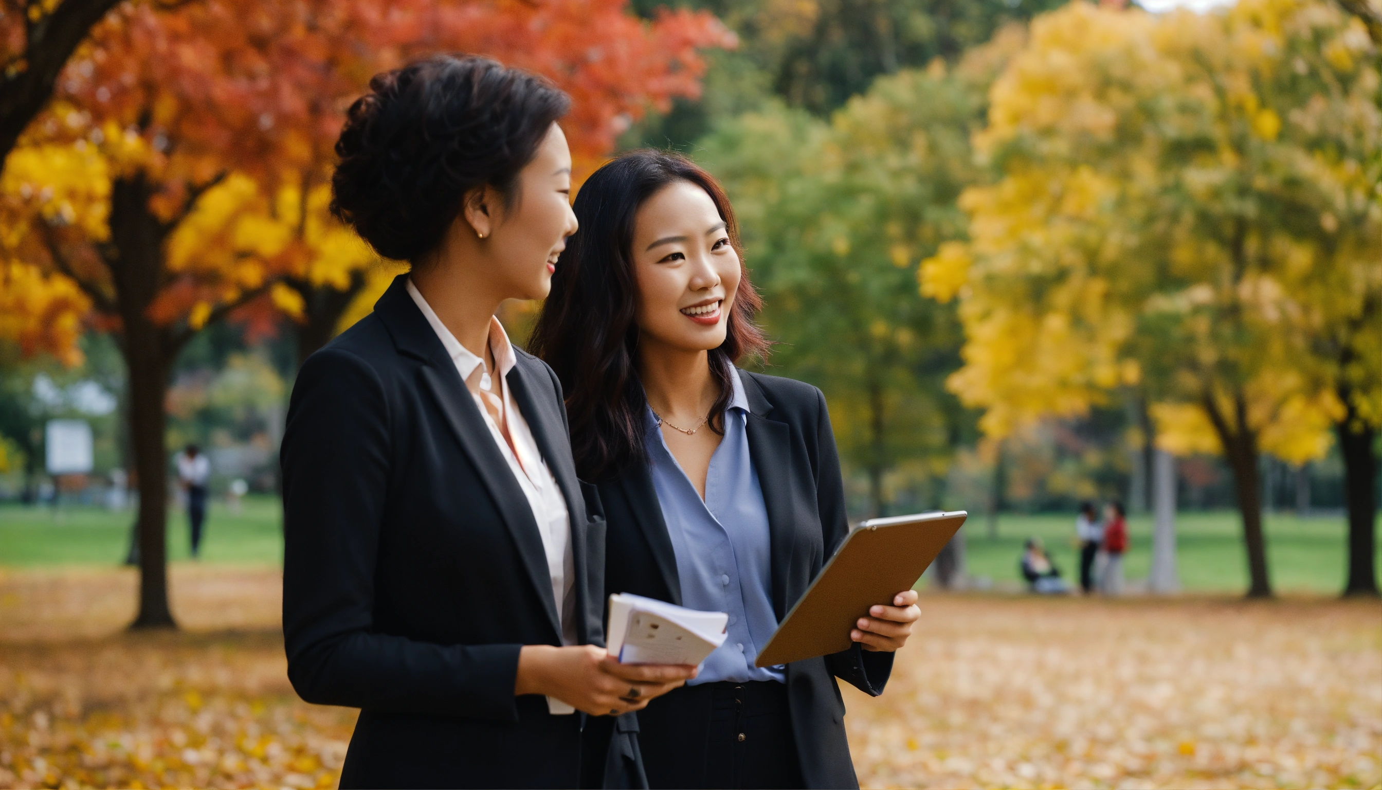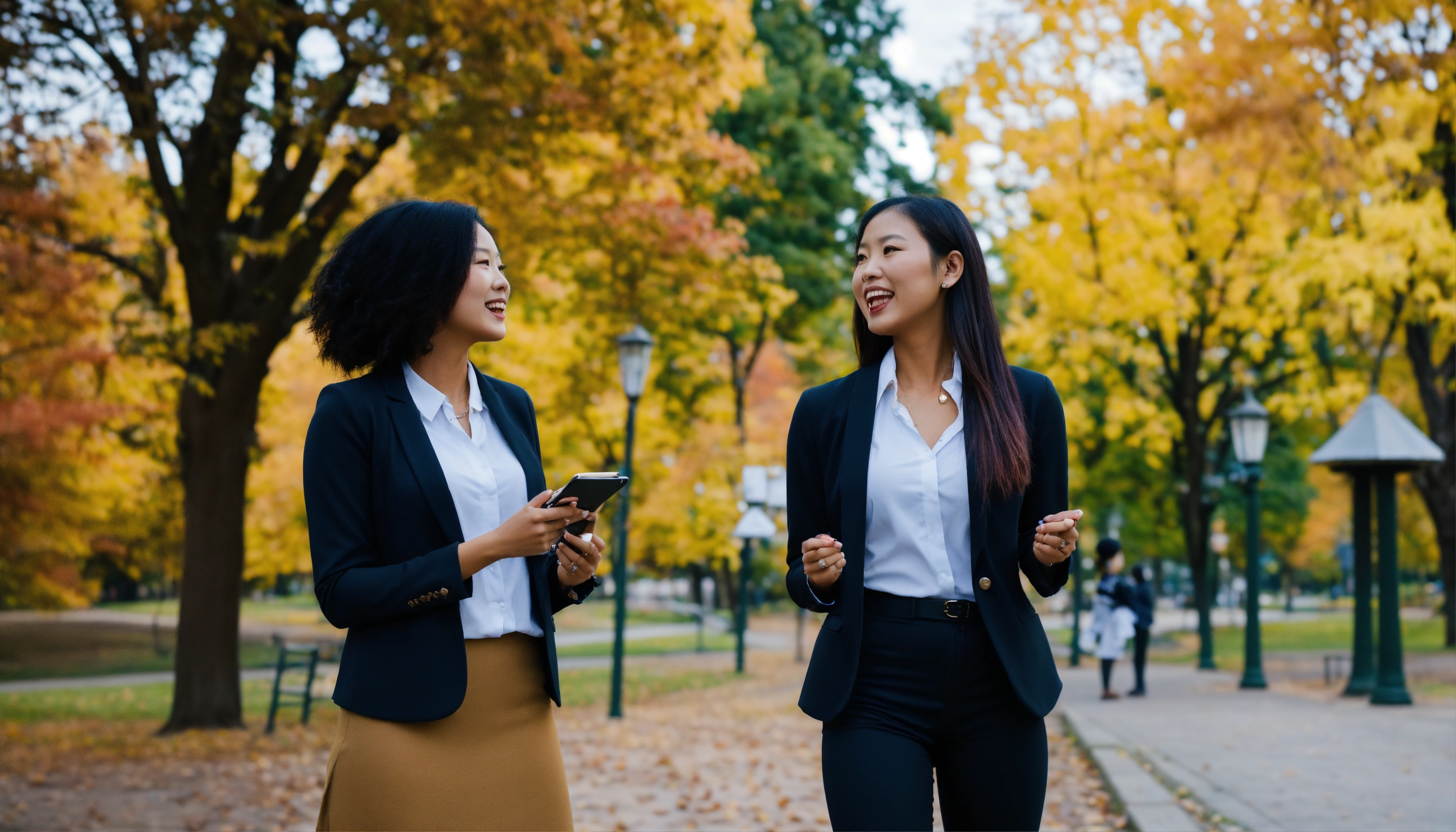 One asian woman in a black blazer telling exciting news to one african american woman in business casual clothes. they are outside is a park with the trees changing to the gorgeous autumn colors. they are diverse, connected, supportive, outdoors in autumn nature.