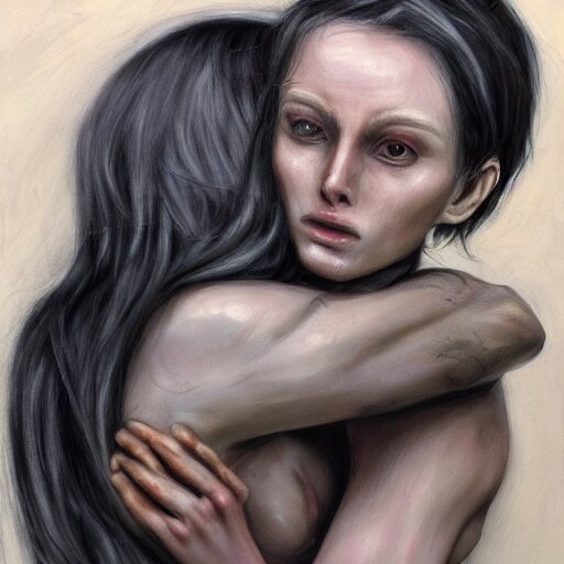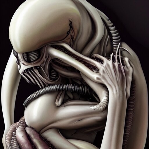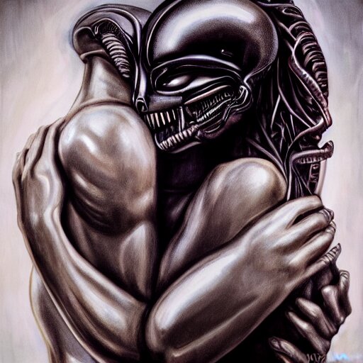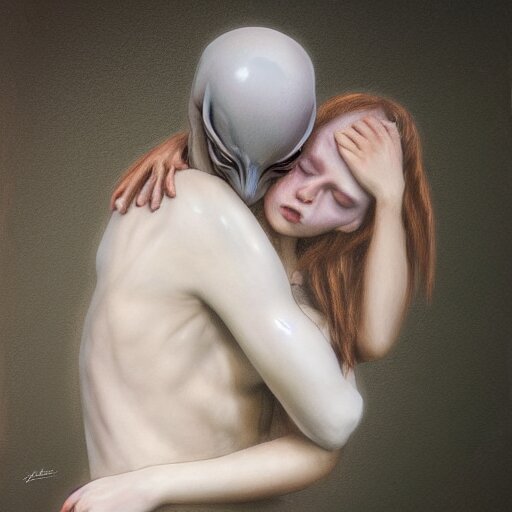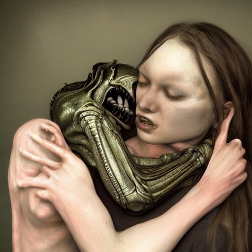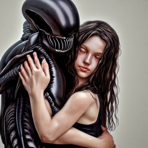 Xenomorph hugging sad pale beauty embracing, verisimilitude, realism, realistic detail, high megapixel picture, ultra definition, hyperrealism, award winning photo