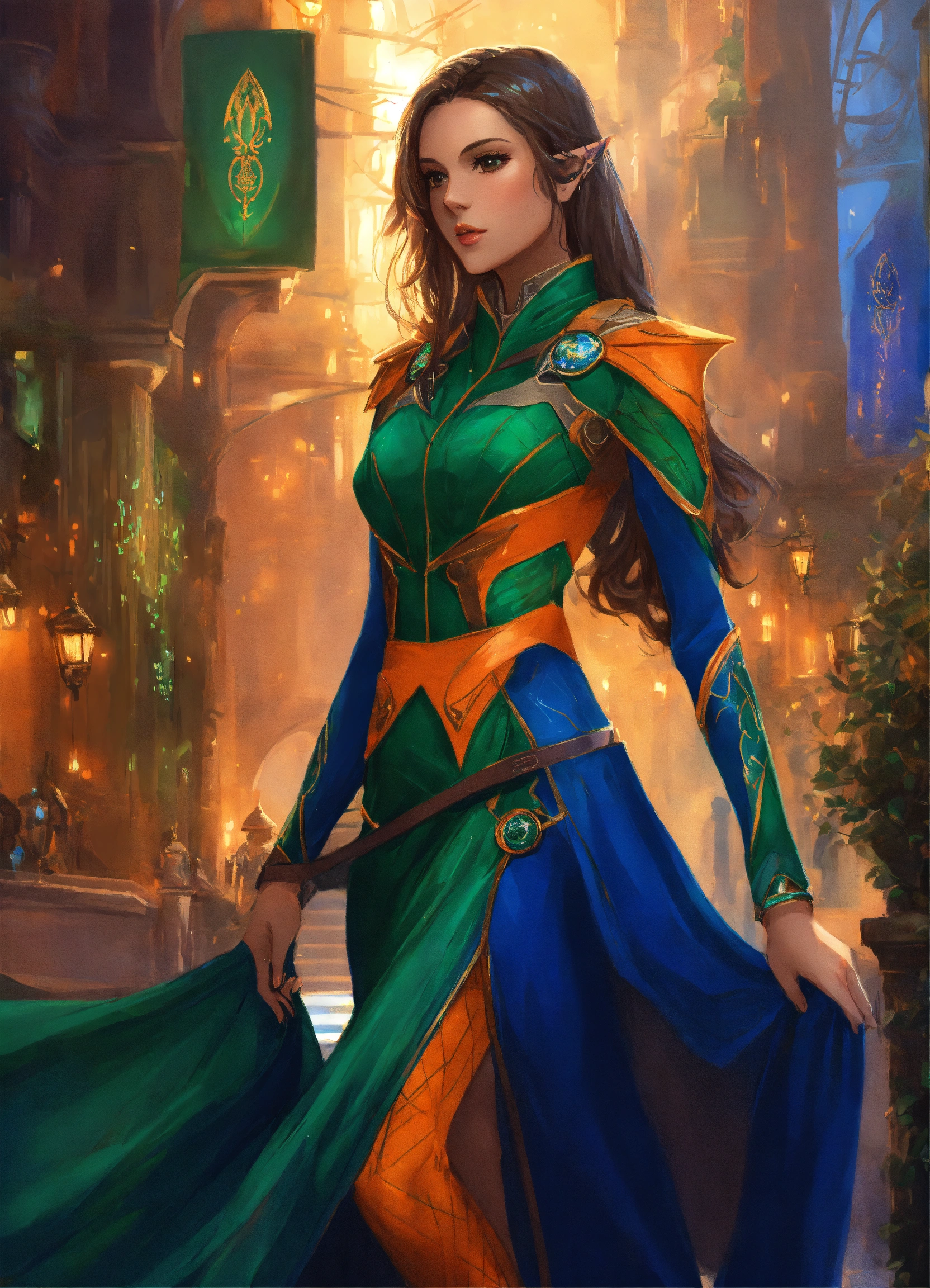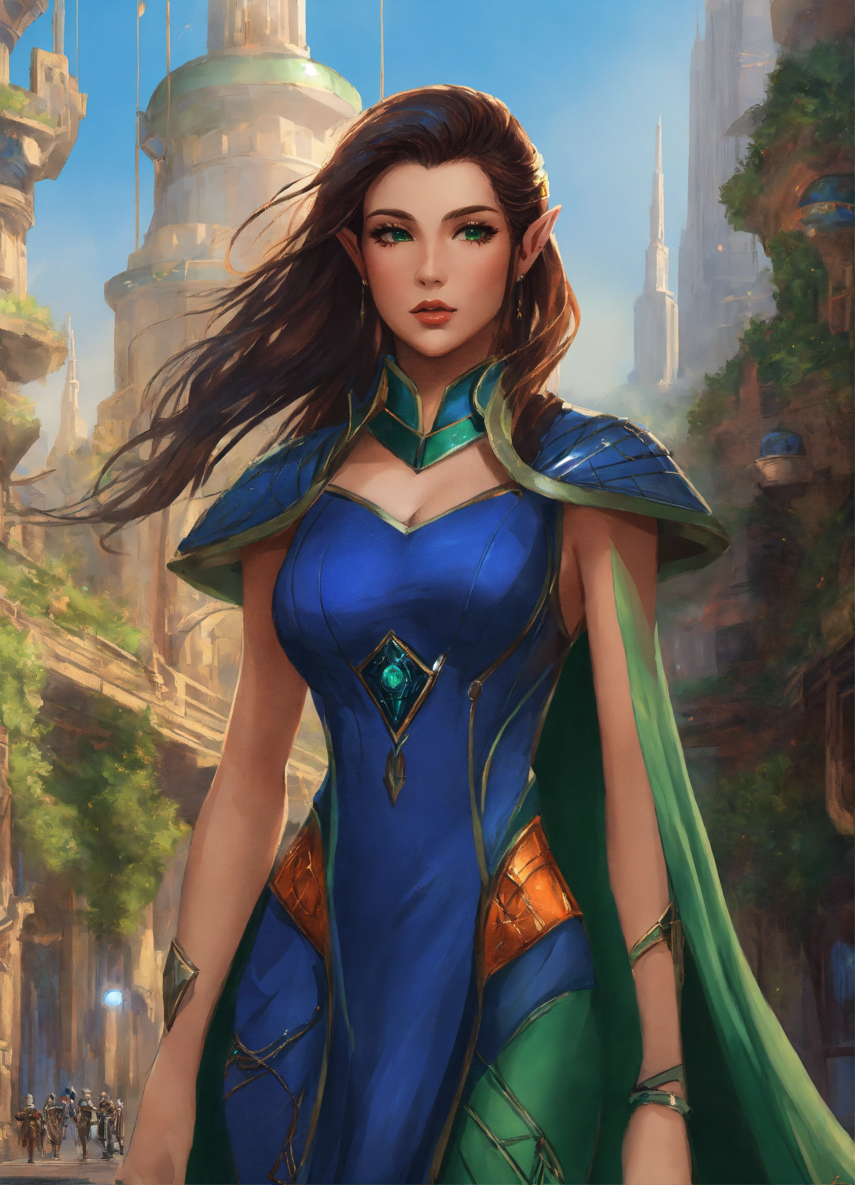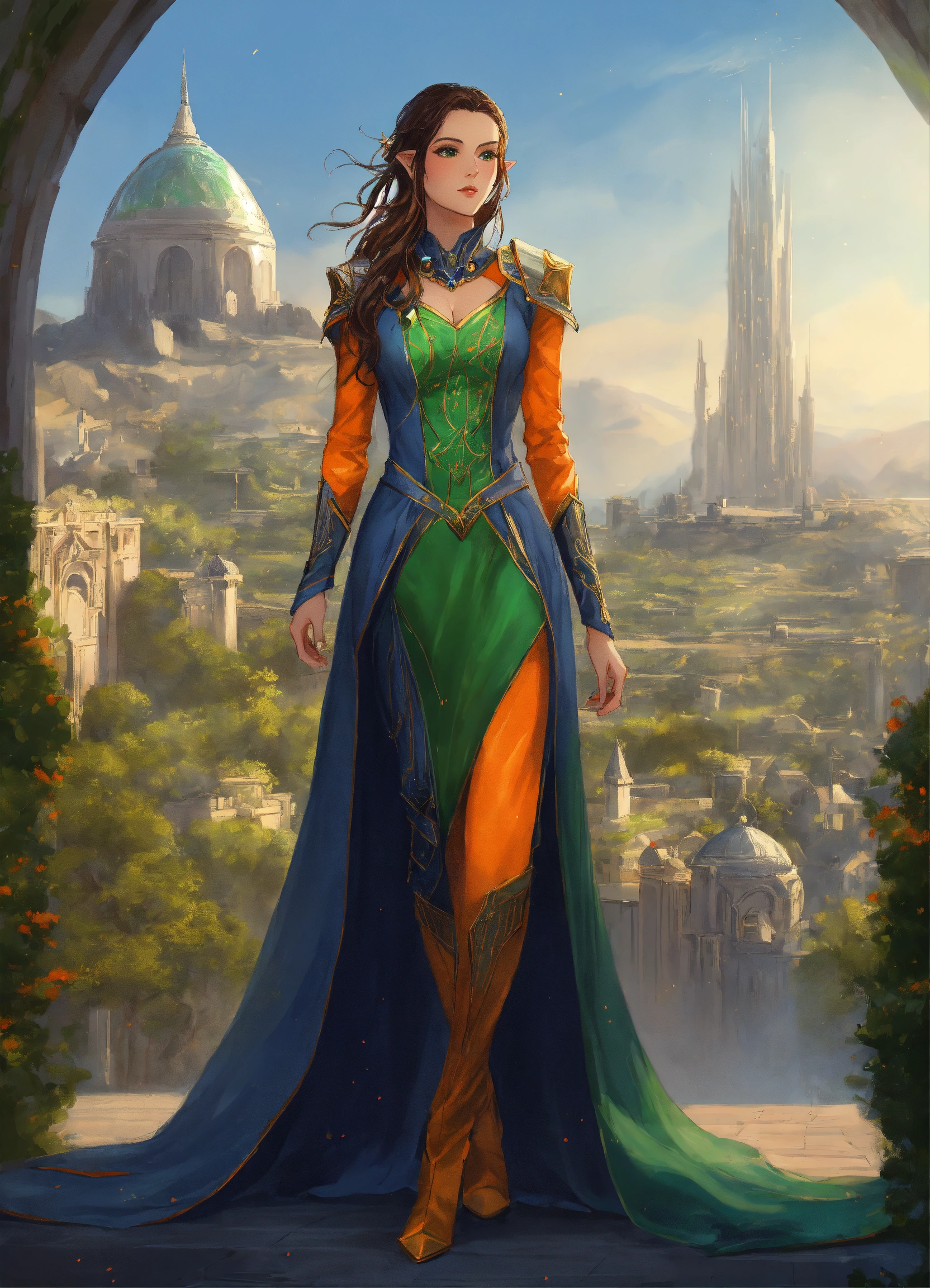 Drawing of an elf, royalty, sci fi, cybernetic, navy blue and green and orange sci fi dress, brunette hair, standing in an elegant elven city, beautiful, female high elf, 25 years old, full body