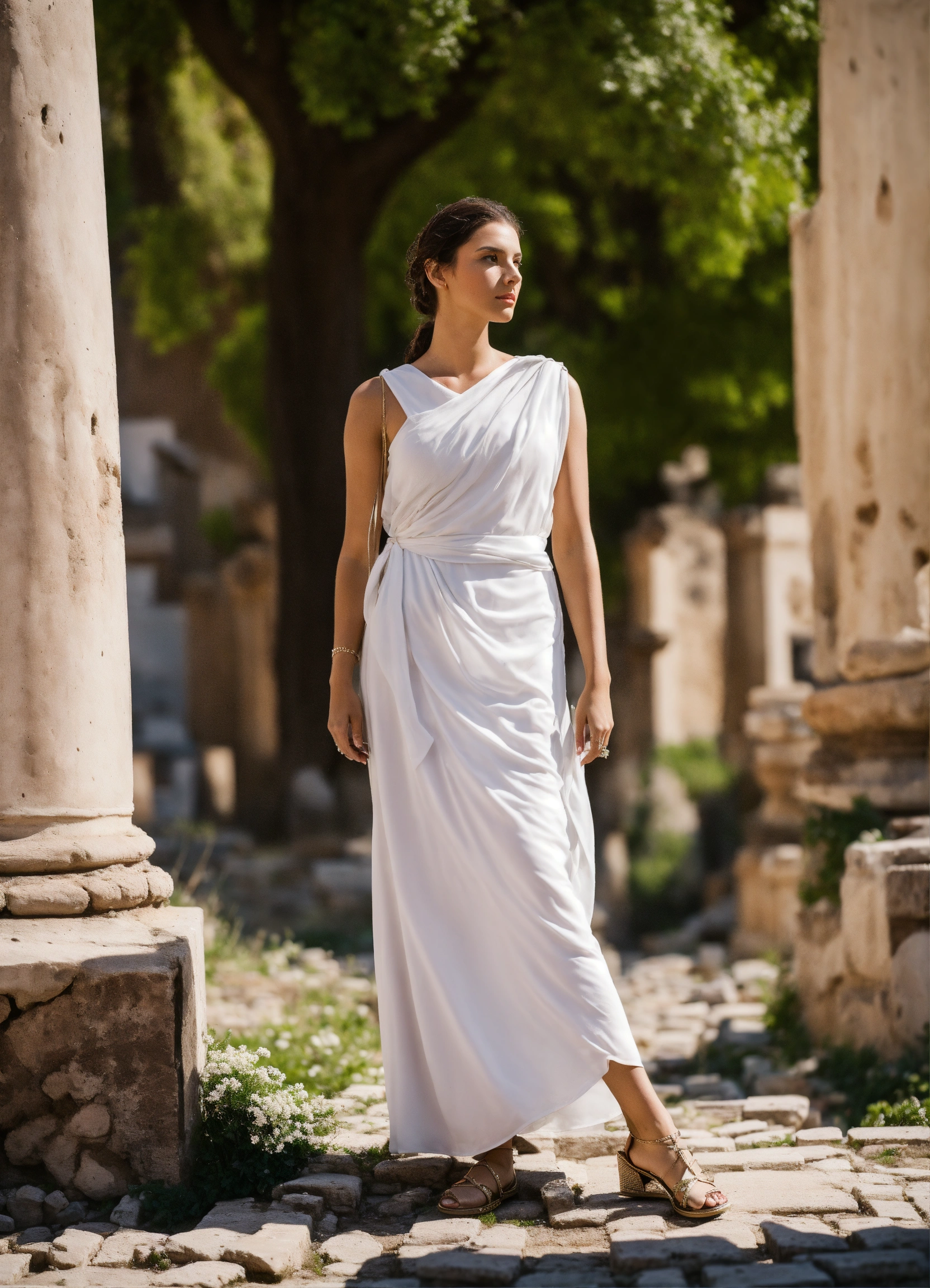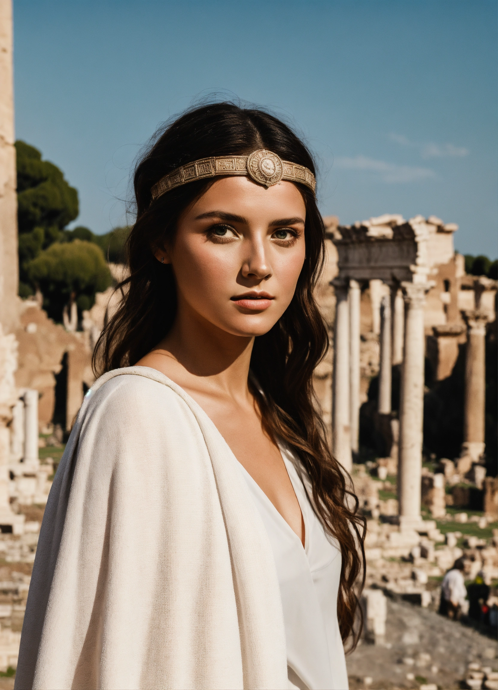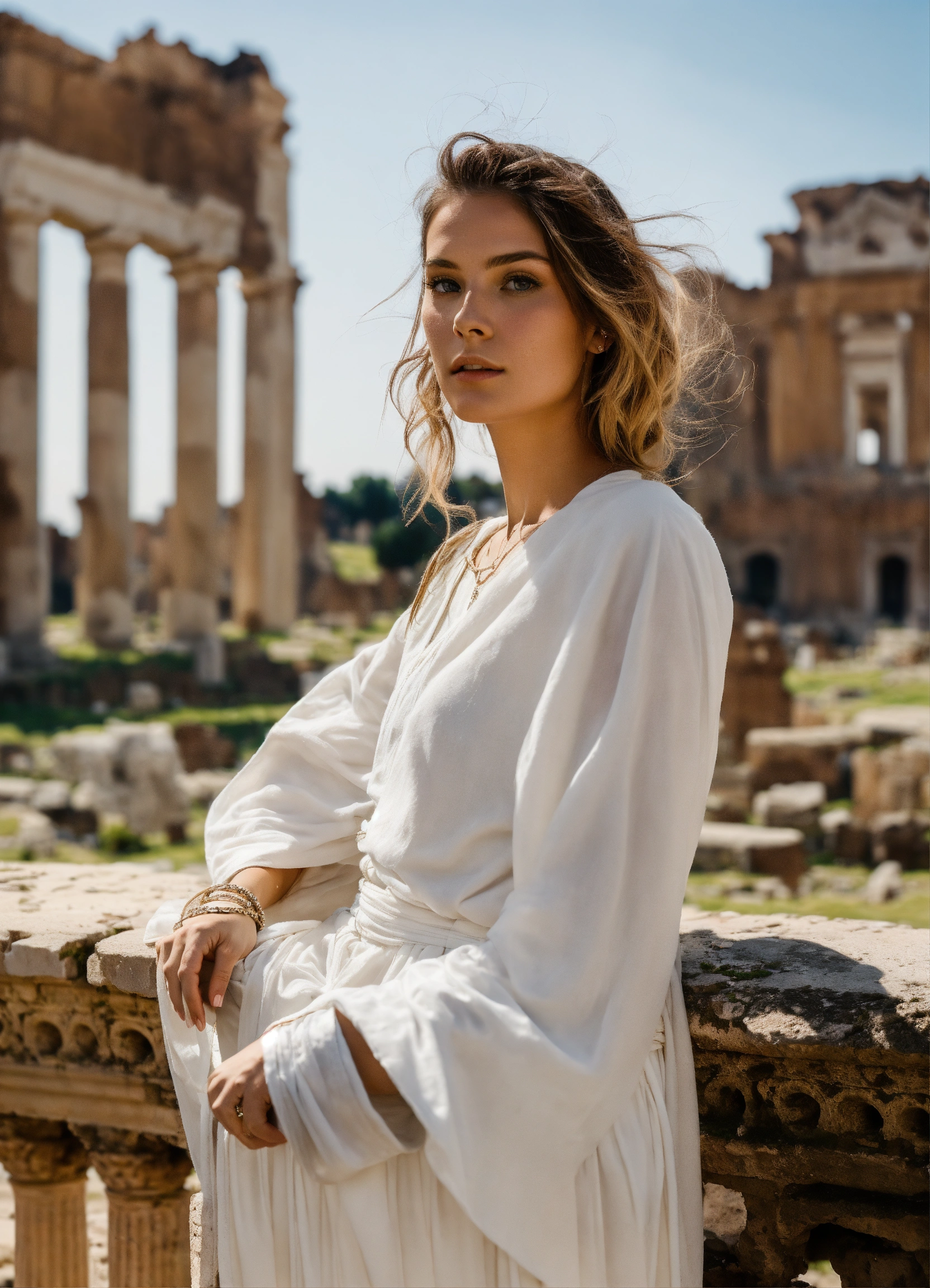 Photo of forum romanum of rome at day with a female model looking into the the camera; all in white color, white coloured