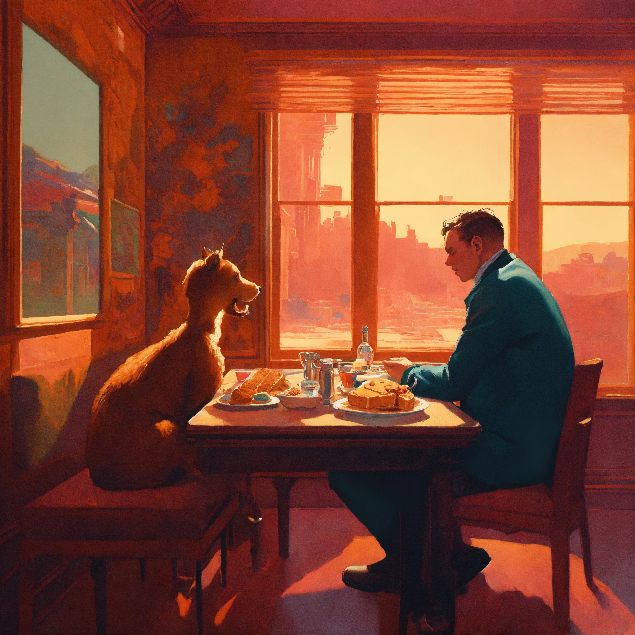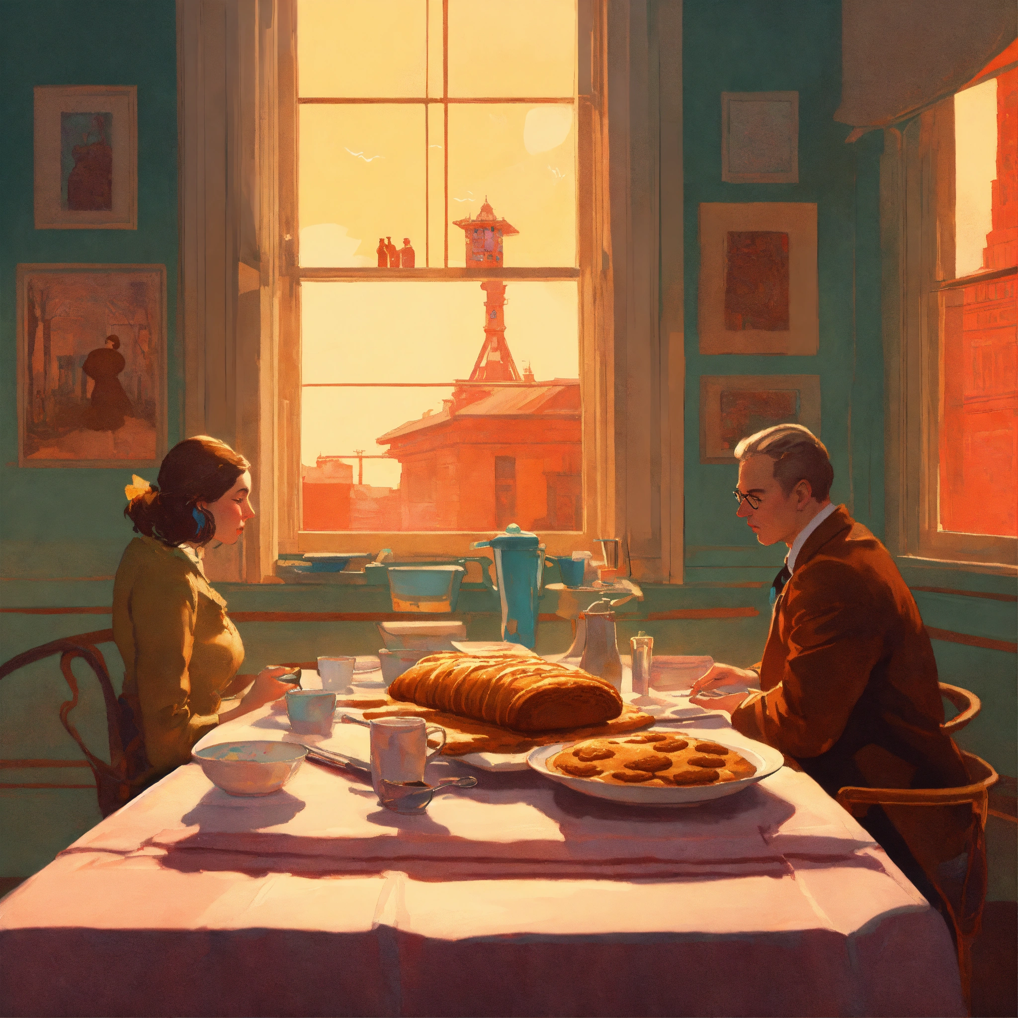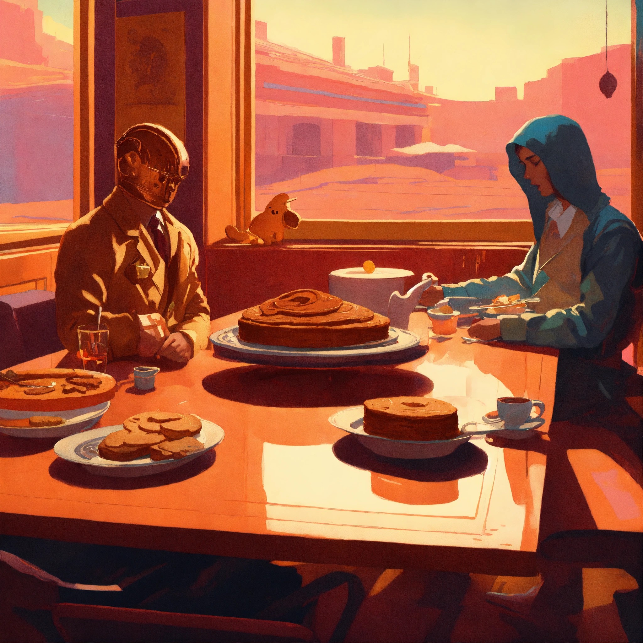 A wrap of whip and a gingerbread are on the table, in the style of francis bacon and syd mead and edward hopper and norman rockwell and beksinski, highly detailed, painted by james gilleard, surrealism, stanley artgerm, very coherent