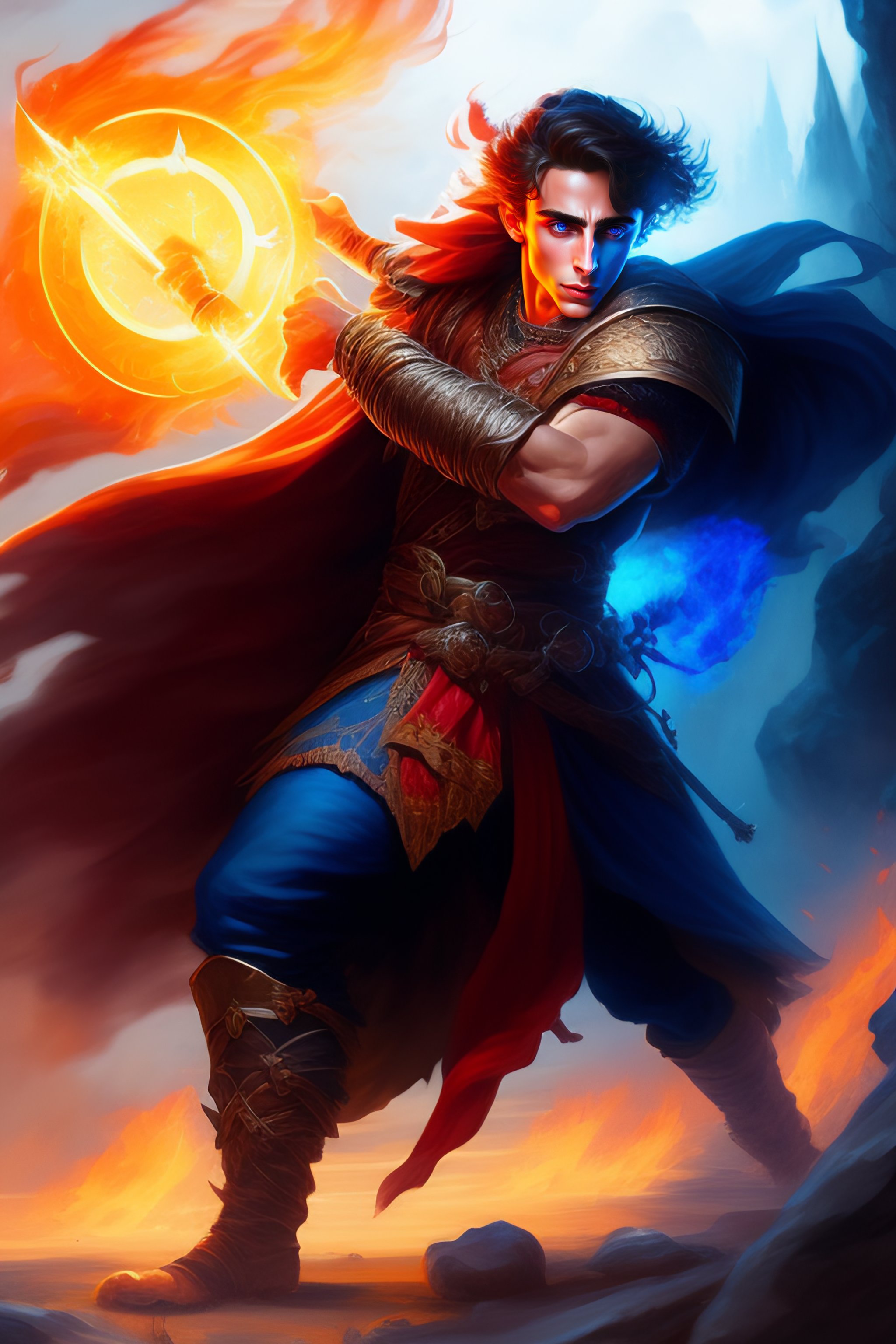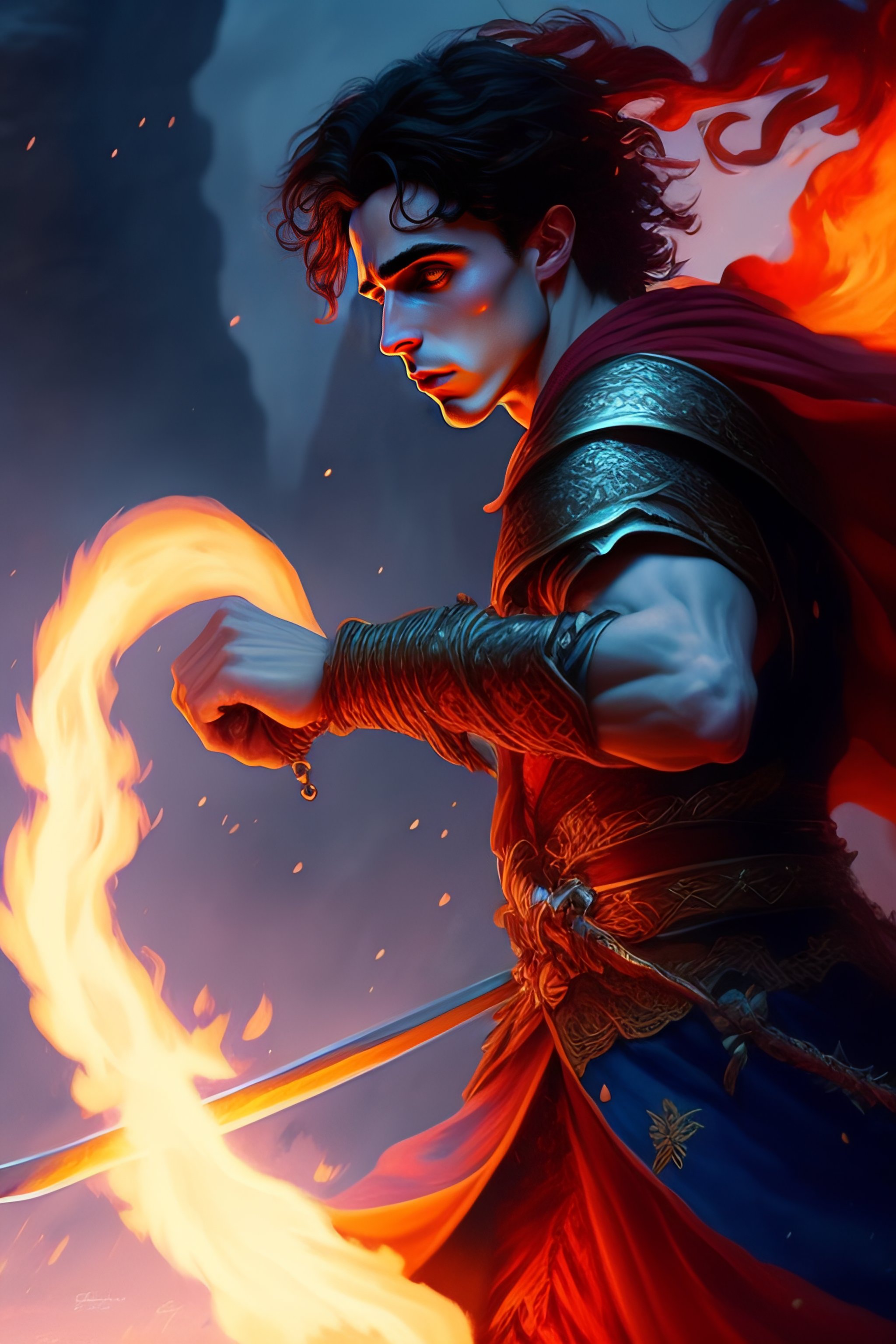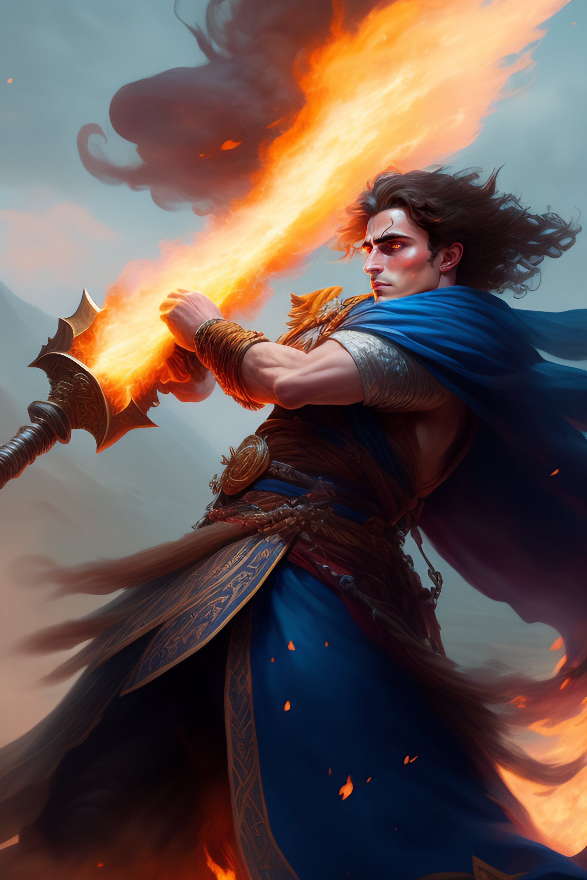 A pyromancer looking like timothy chalamet wearing peasant clothes is fighting a orc with blue thunderbolt, medium level shot, epic scene, mucha style, general fantasy, illustration, concept art