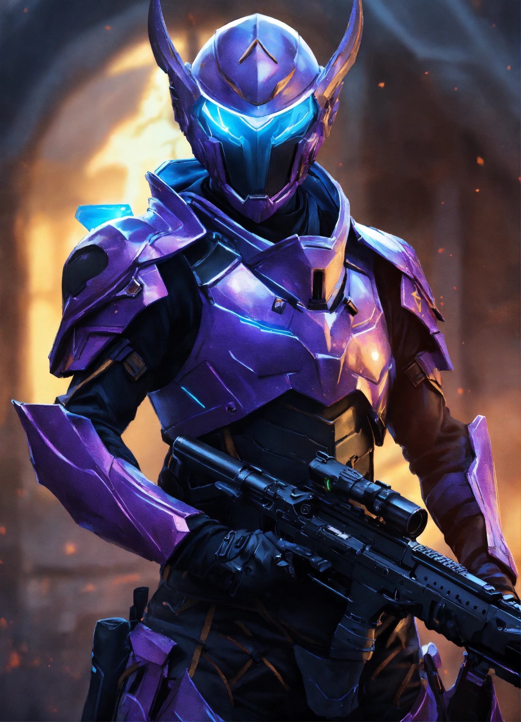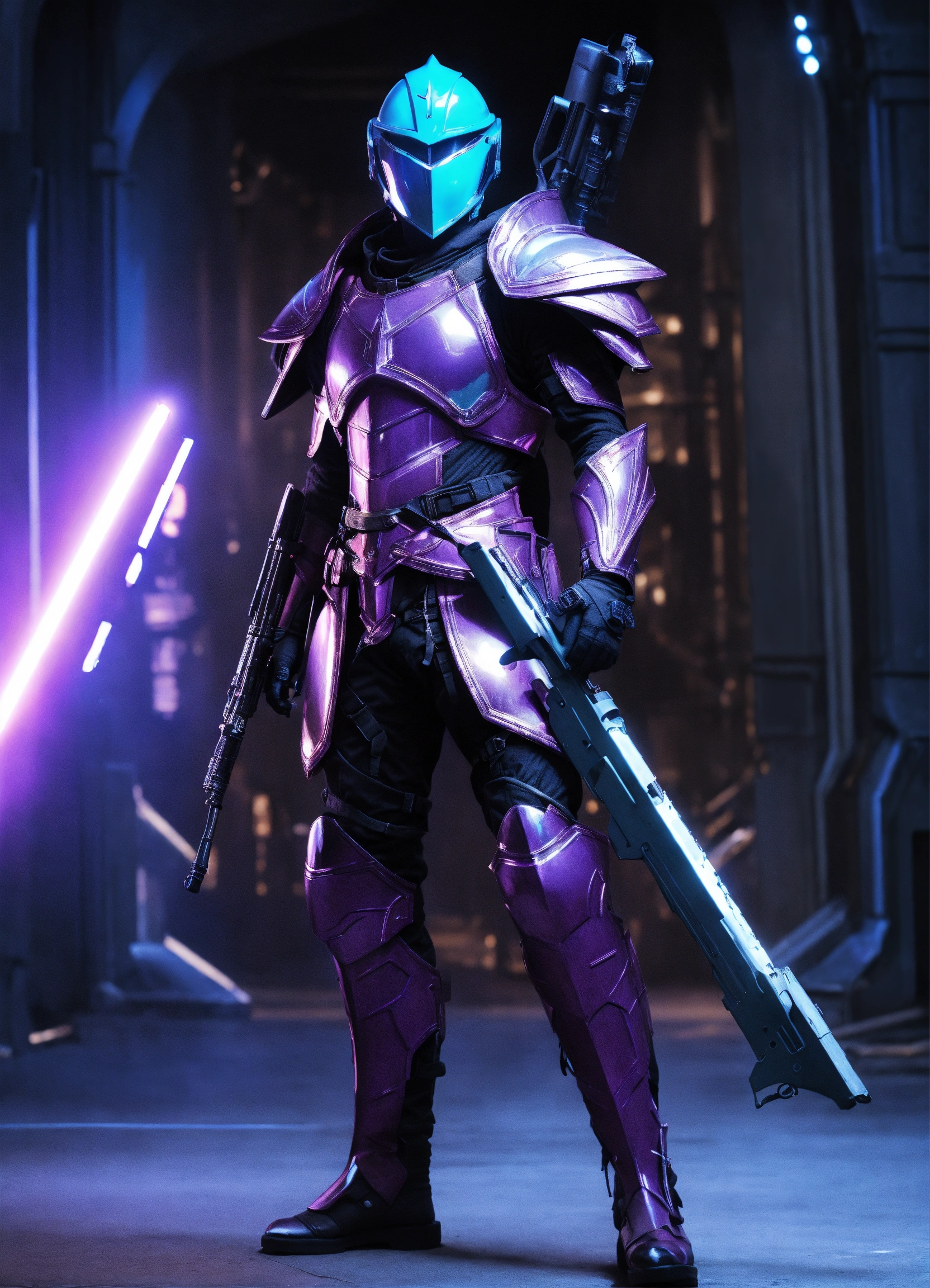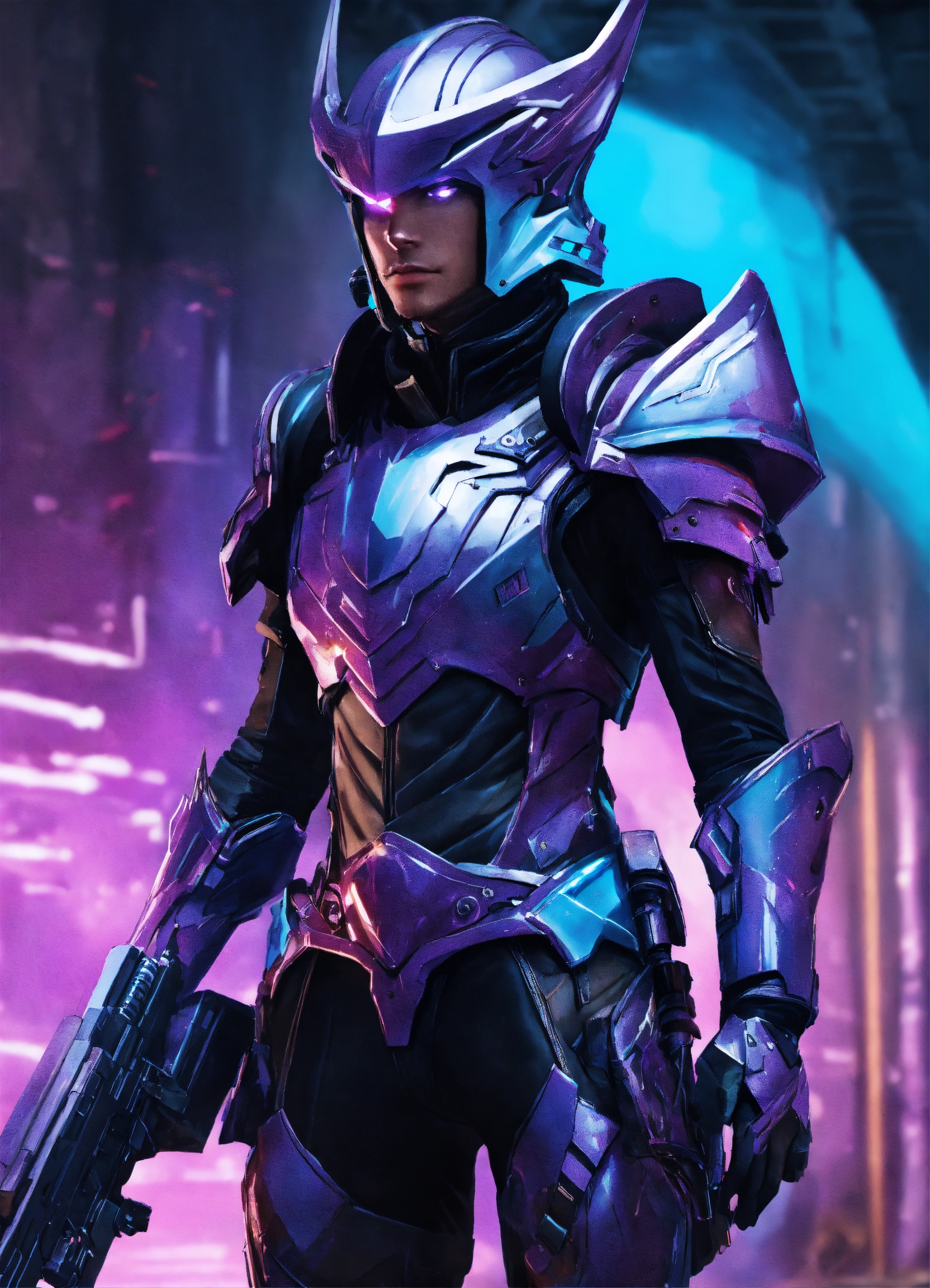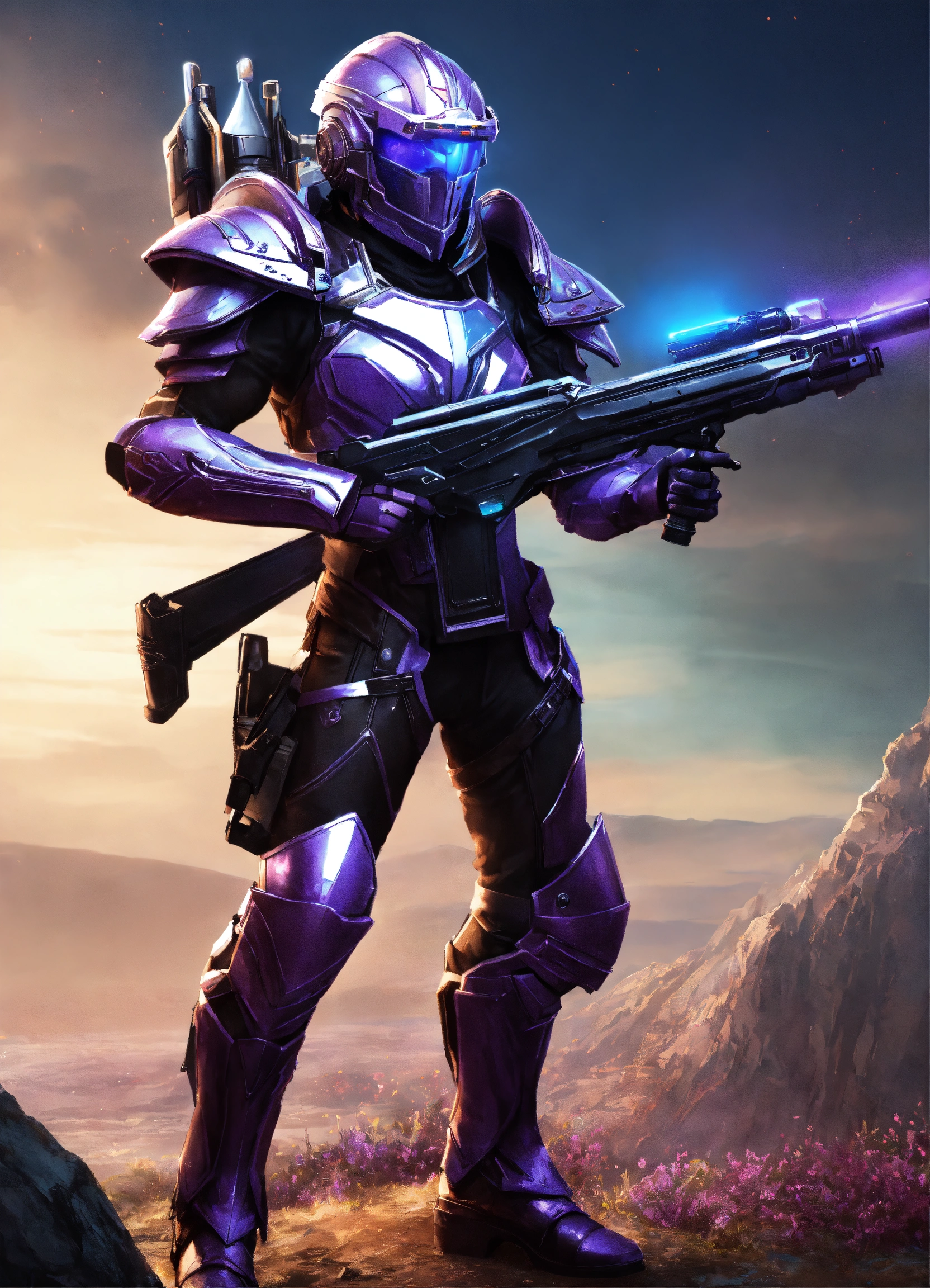High elf sci fi soldier wearing heavy sci fi elven armor, black and purple and light blue armor and helmet, boots, male, holding a light machine gun, full body, hd