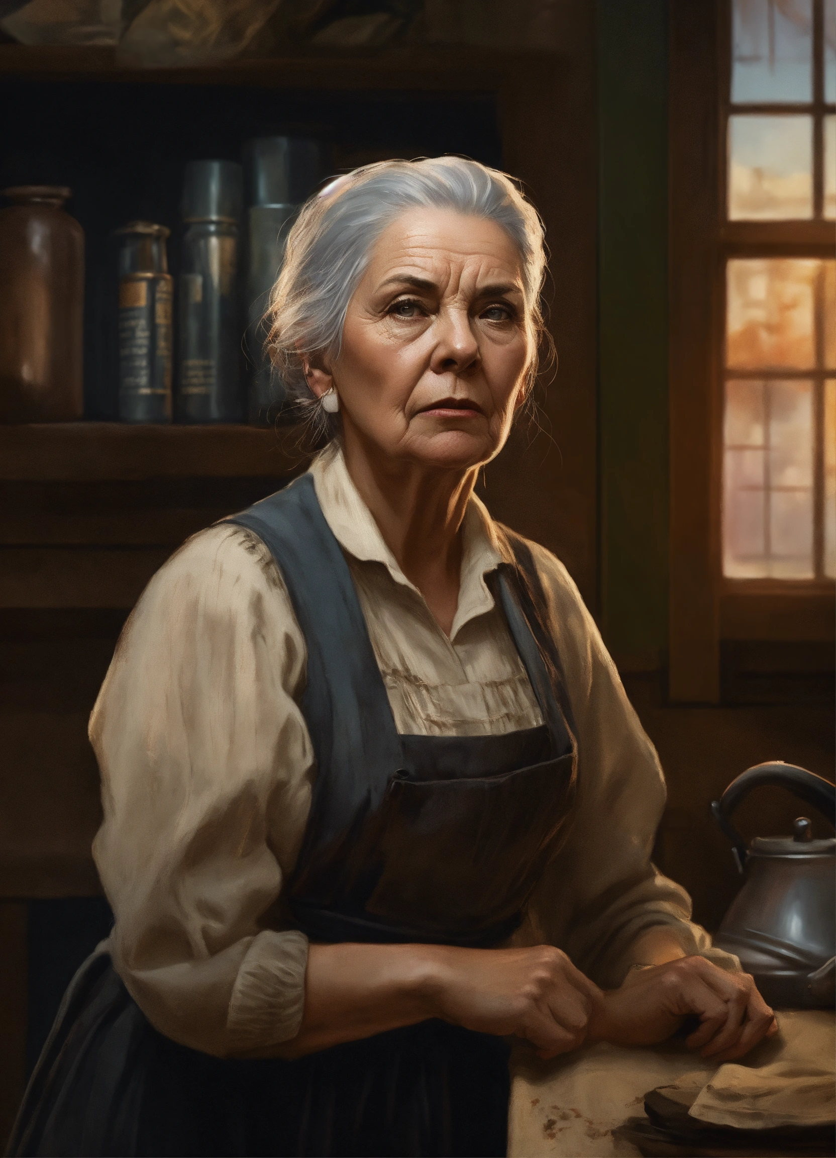 Close up, highly detailed, defiant rude old female housekeeper, new england, miskatonic, dark ambient, sorrow, sadness, concept art, design, digital painting, highly detailed, sharp focus, smooth, art by greg rutkowsky, artstation, pinterest.