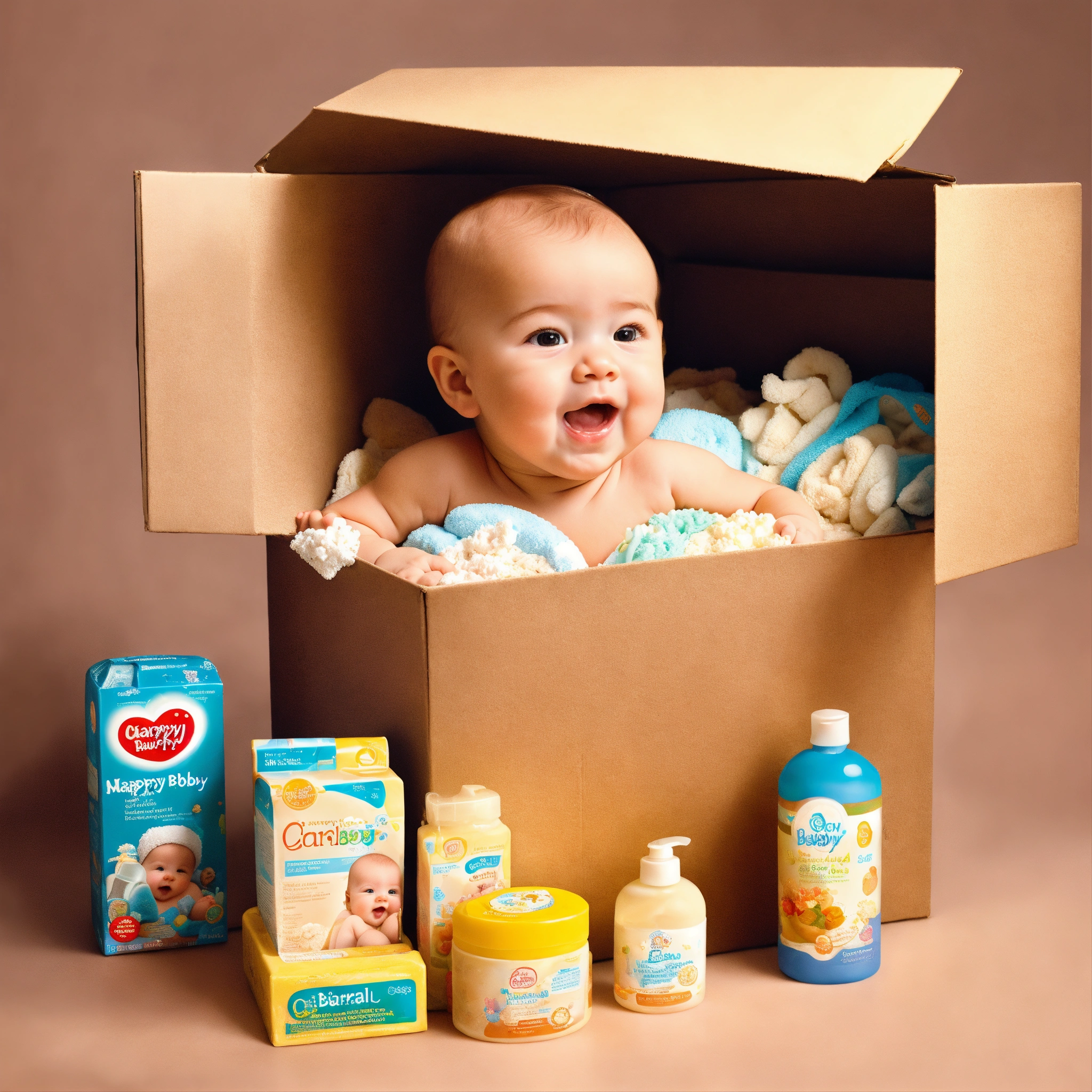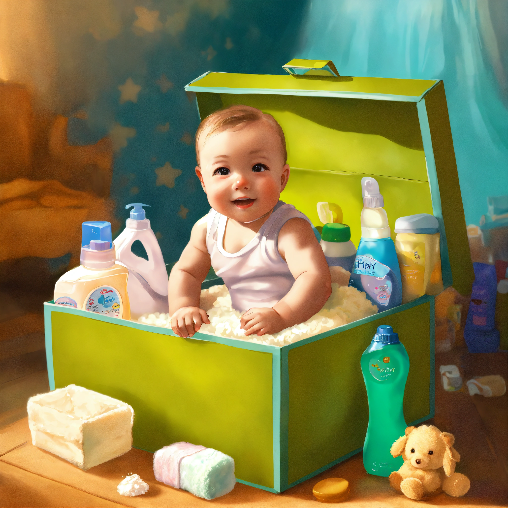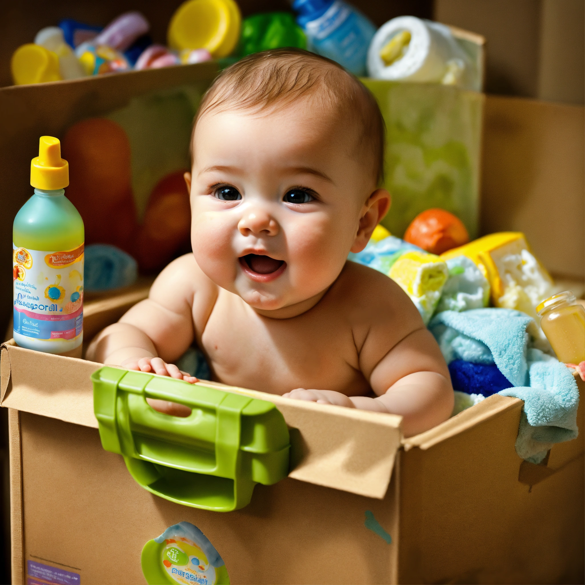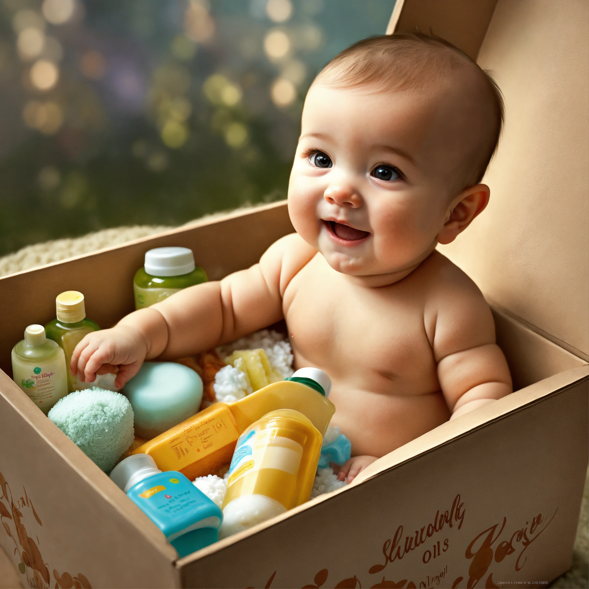 Happy baby, curious expression, looking in a box filled with baby essentials - diapers, massage oil, body lotion, soap, powder, and shampoo. soft natural lighting, intimate portrait composition, high attention to detail. realistic digital art, vibrant colors, perfect for nursery decor or parenting magazine covers