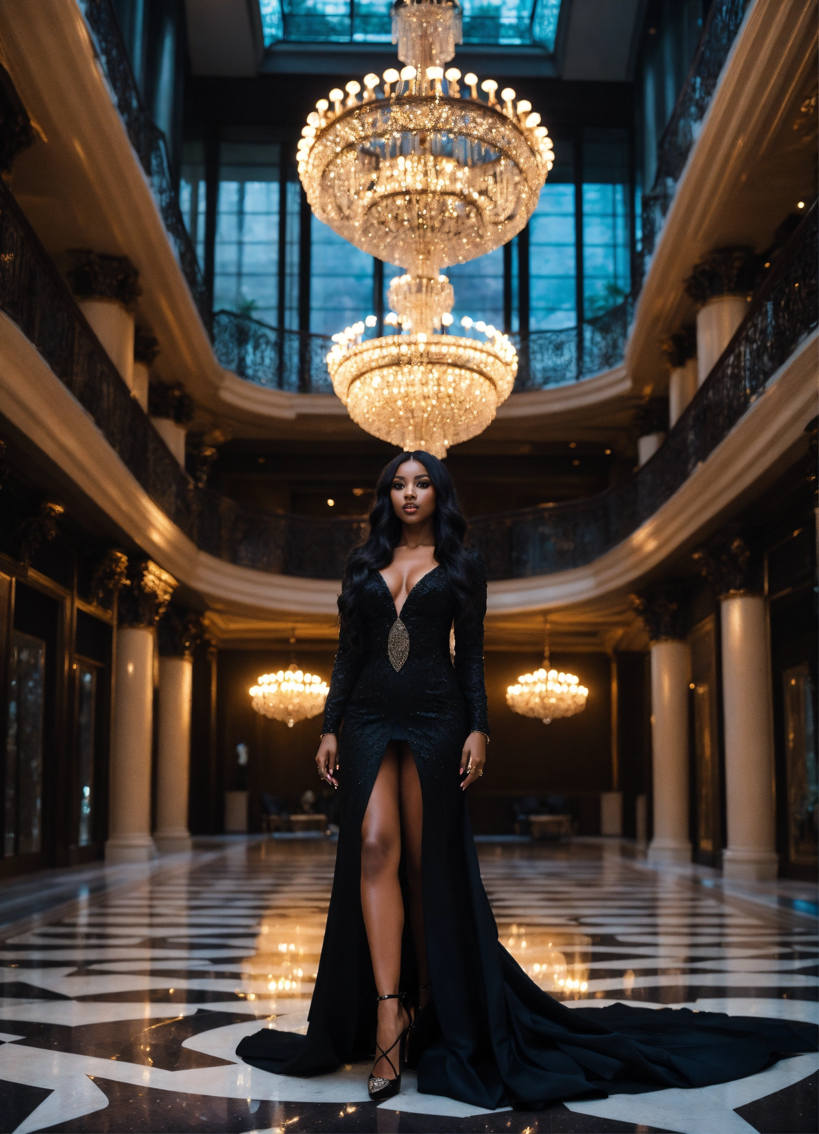 Alien female, 30 years old with purple eyes, dark skin, and long dark hair. wide hips. dressed in black haute couture dress and heels. standing in a luxurious atrium during daylight. there is a large chandelier. outgoing persona.