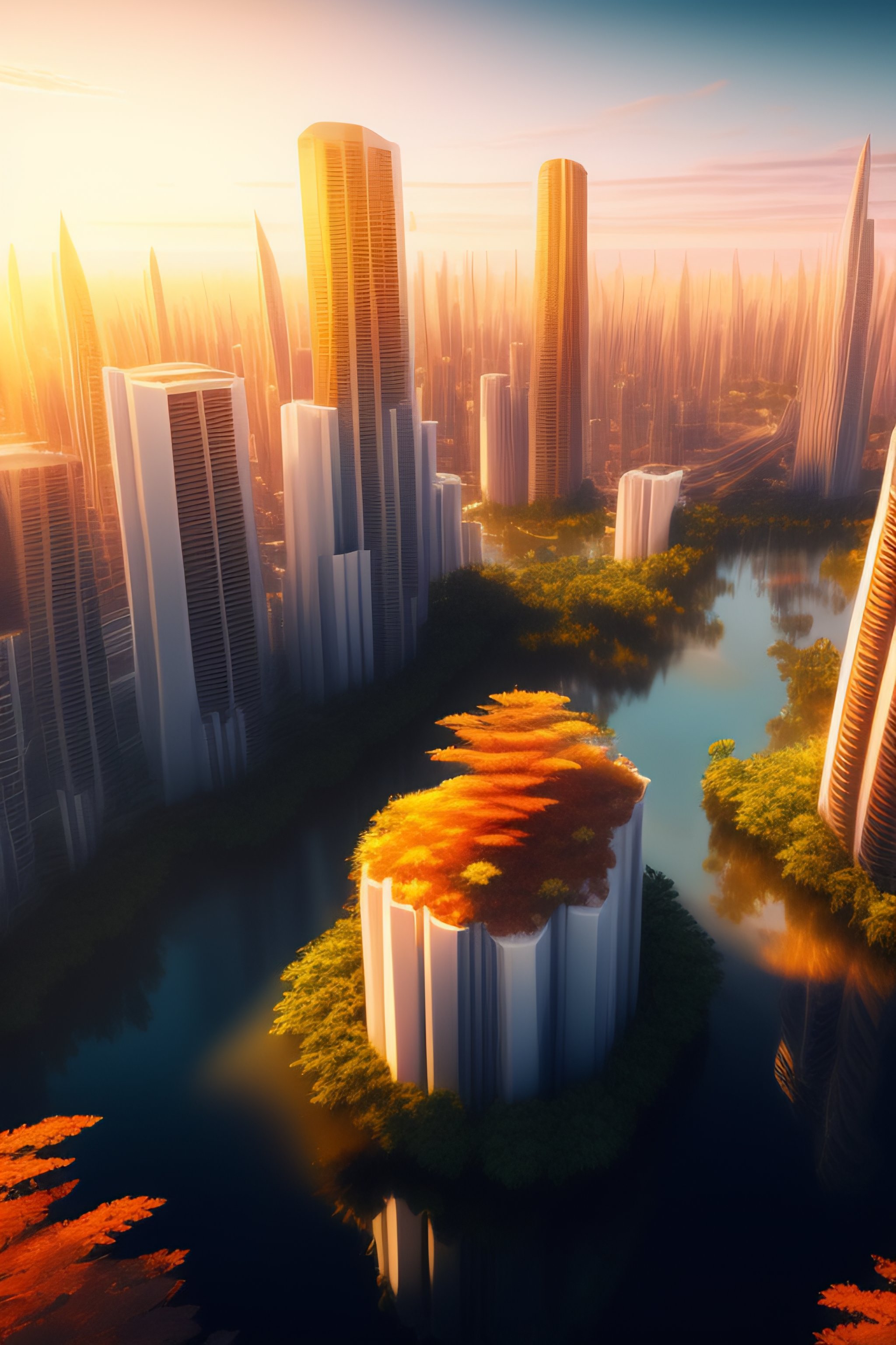 Aerial view of a city made of white sand and skyscrapers at sunset, overgrown foliage taking over it, golden hour, concept art, artstation, deviantart, behance, highly detailed, behance hd