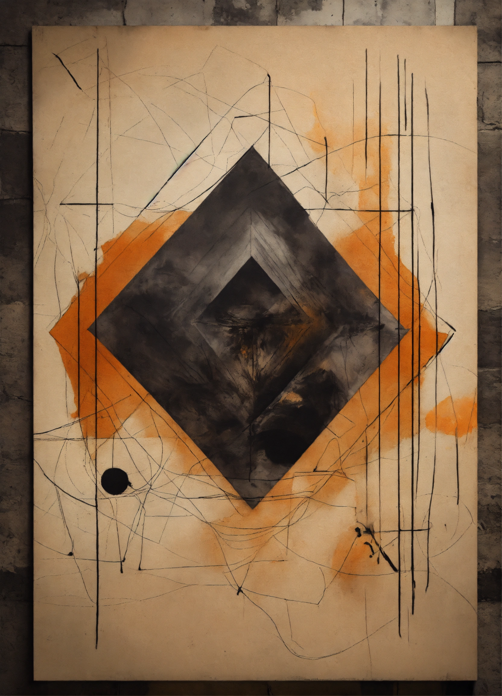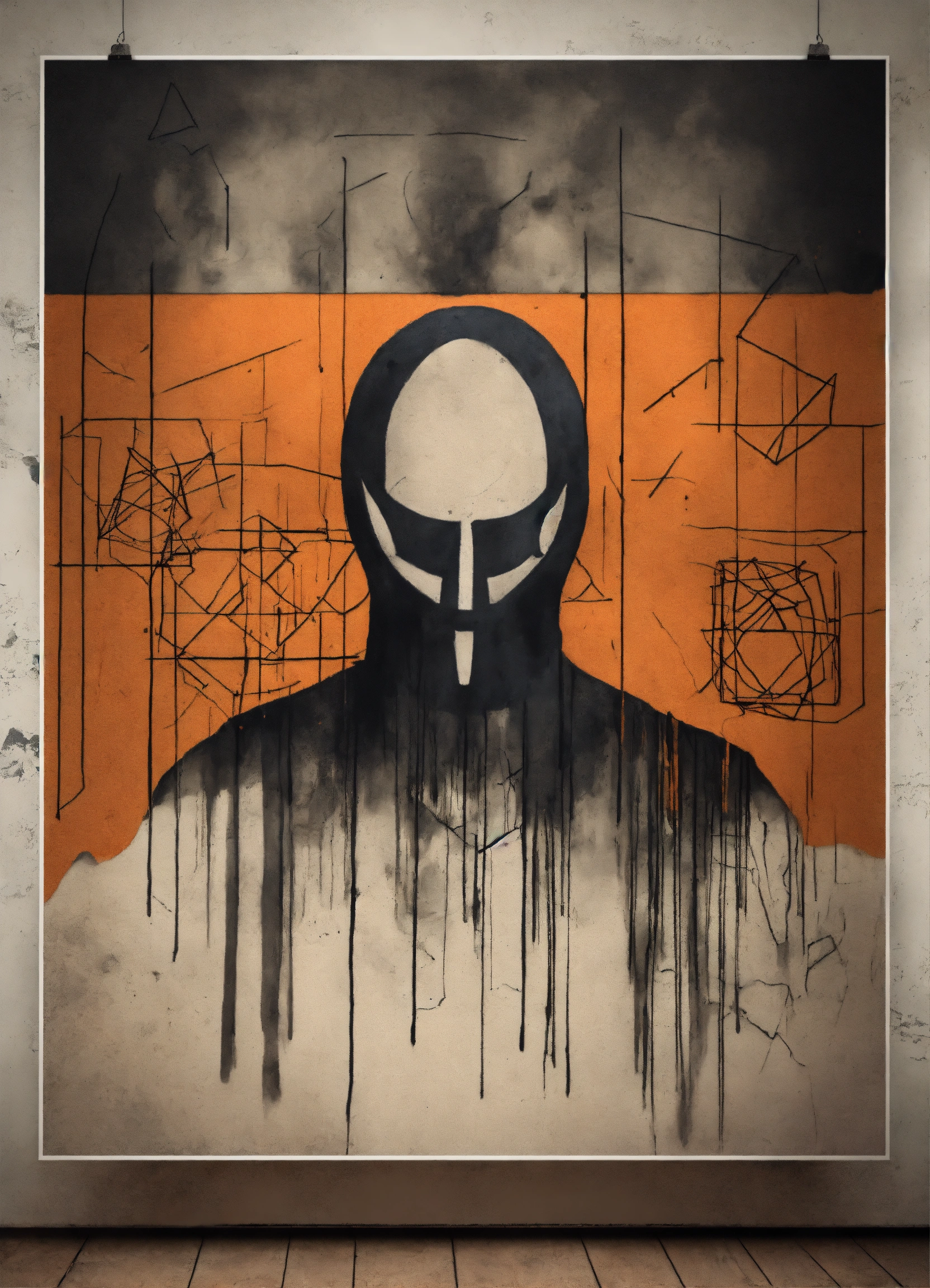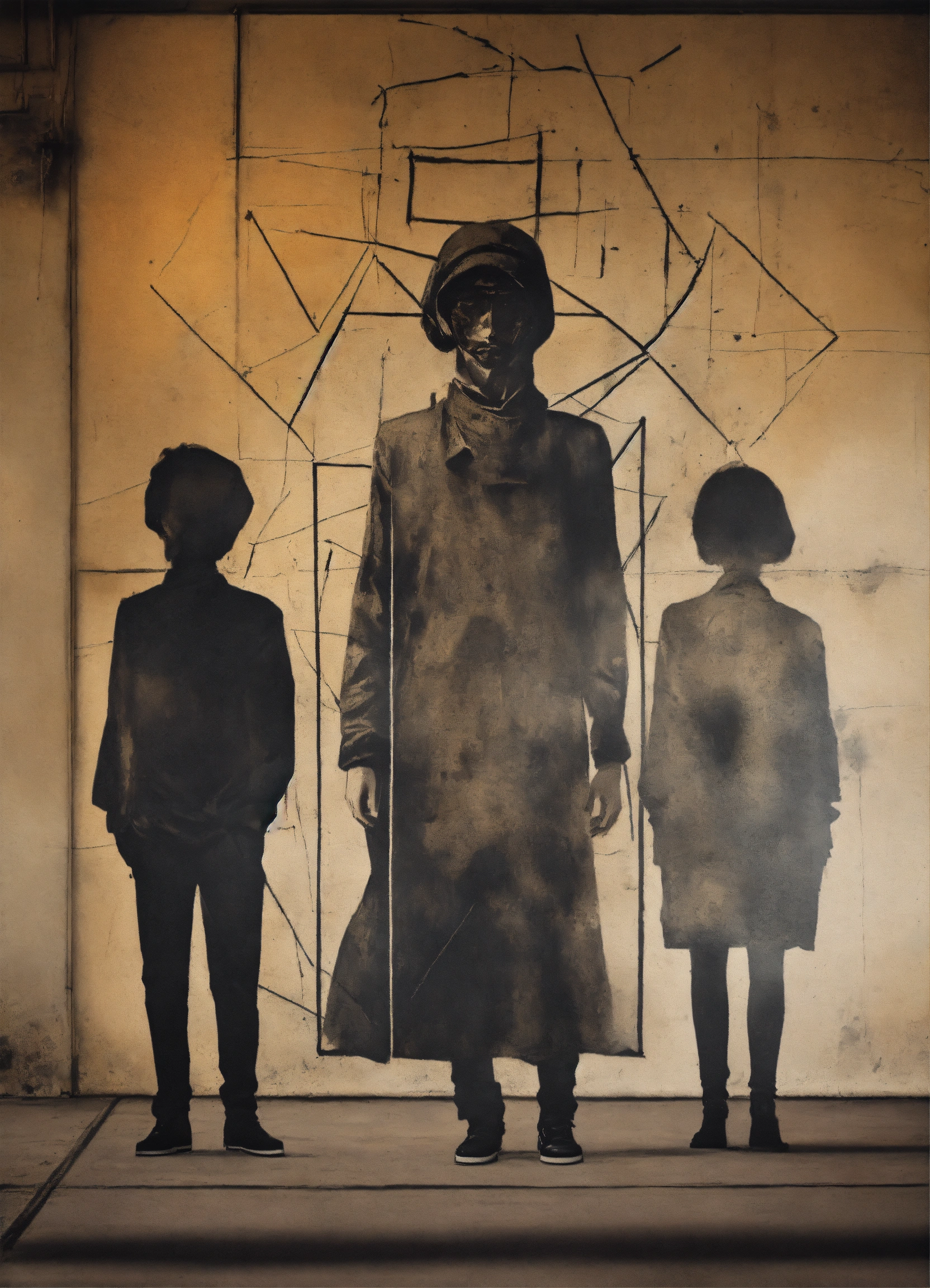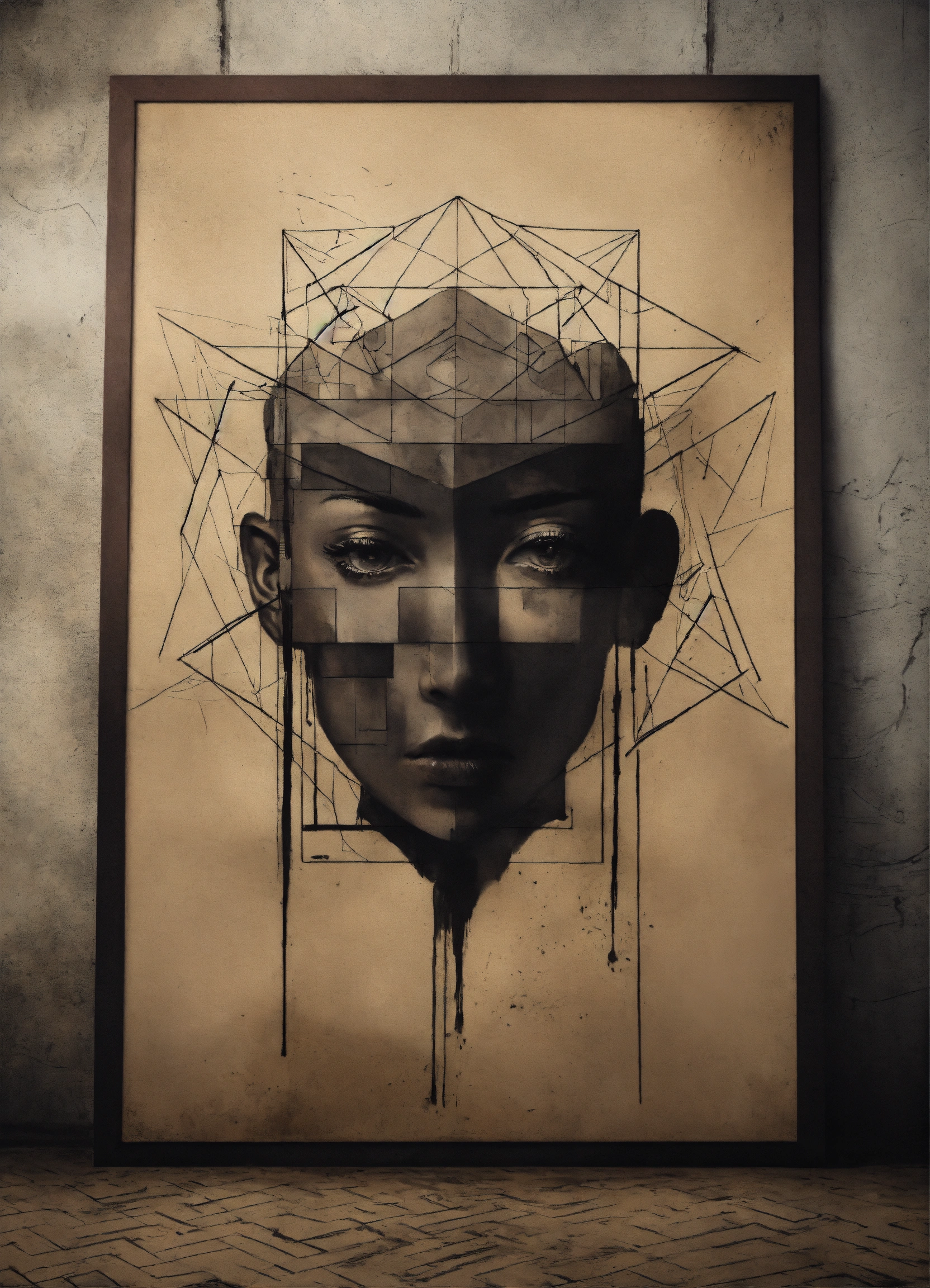 Create a poster with the outline of a representation of fear, painted with a few charcoal smudges. in the background there are three geometric figures overlaps, all on a grunge wall.