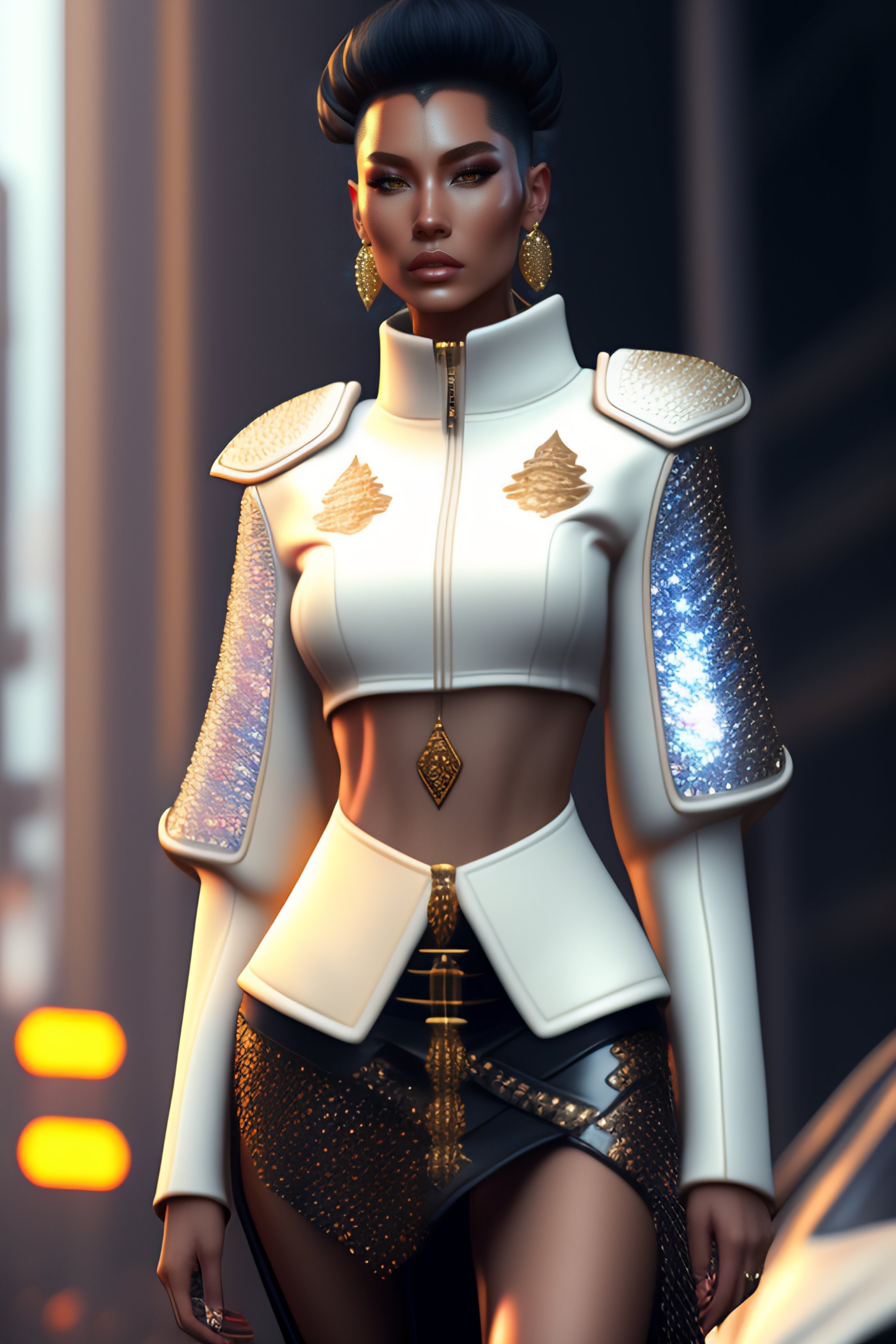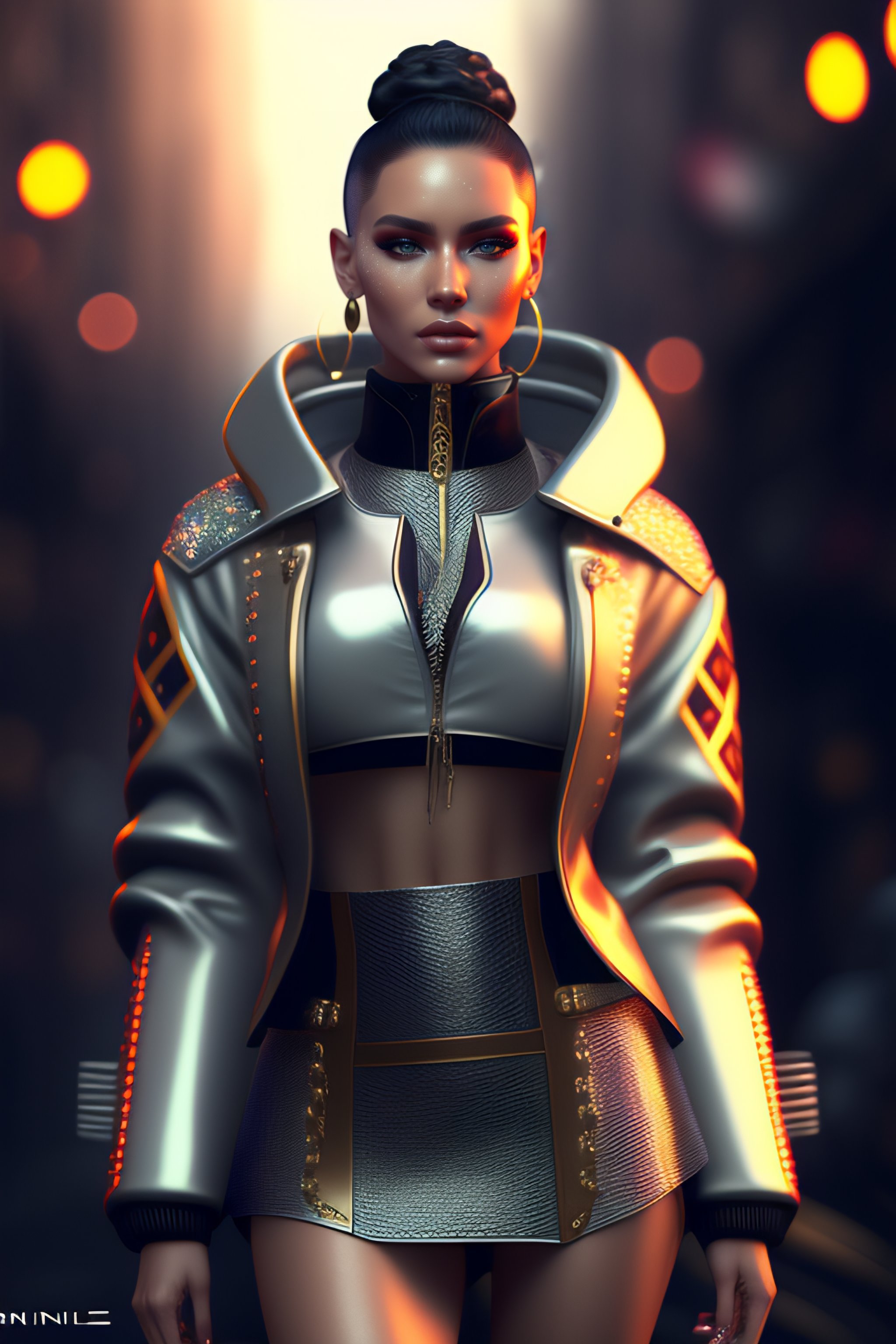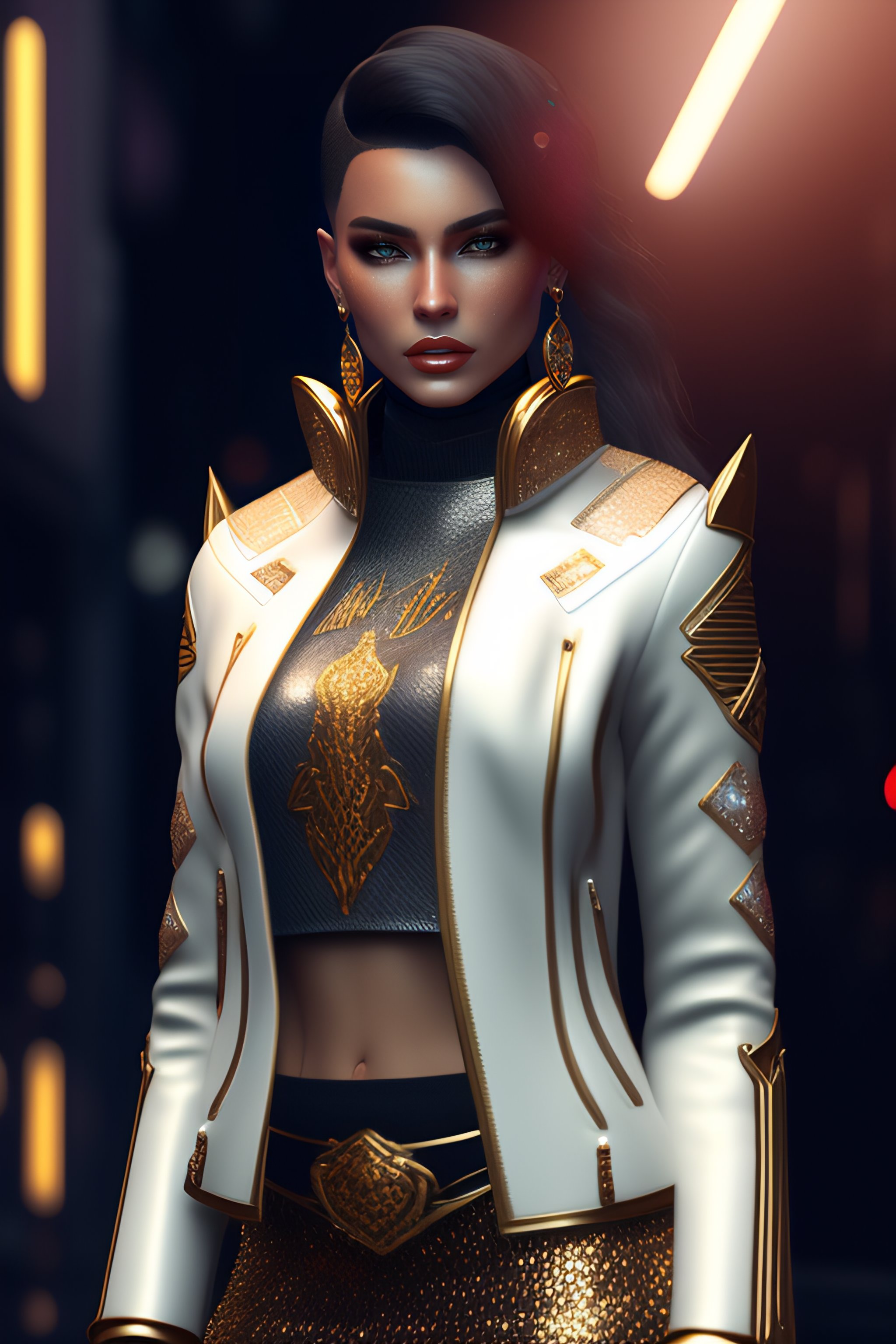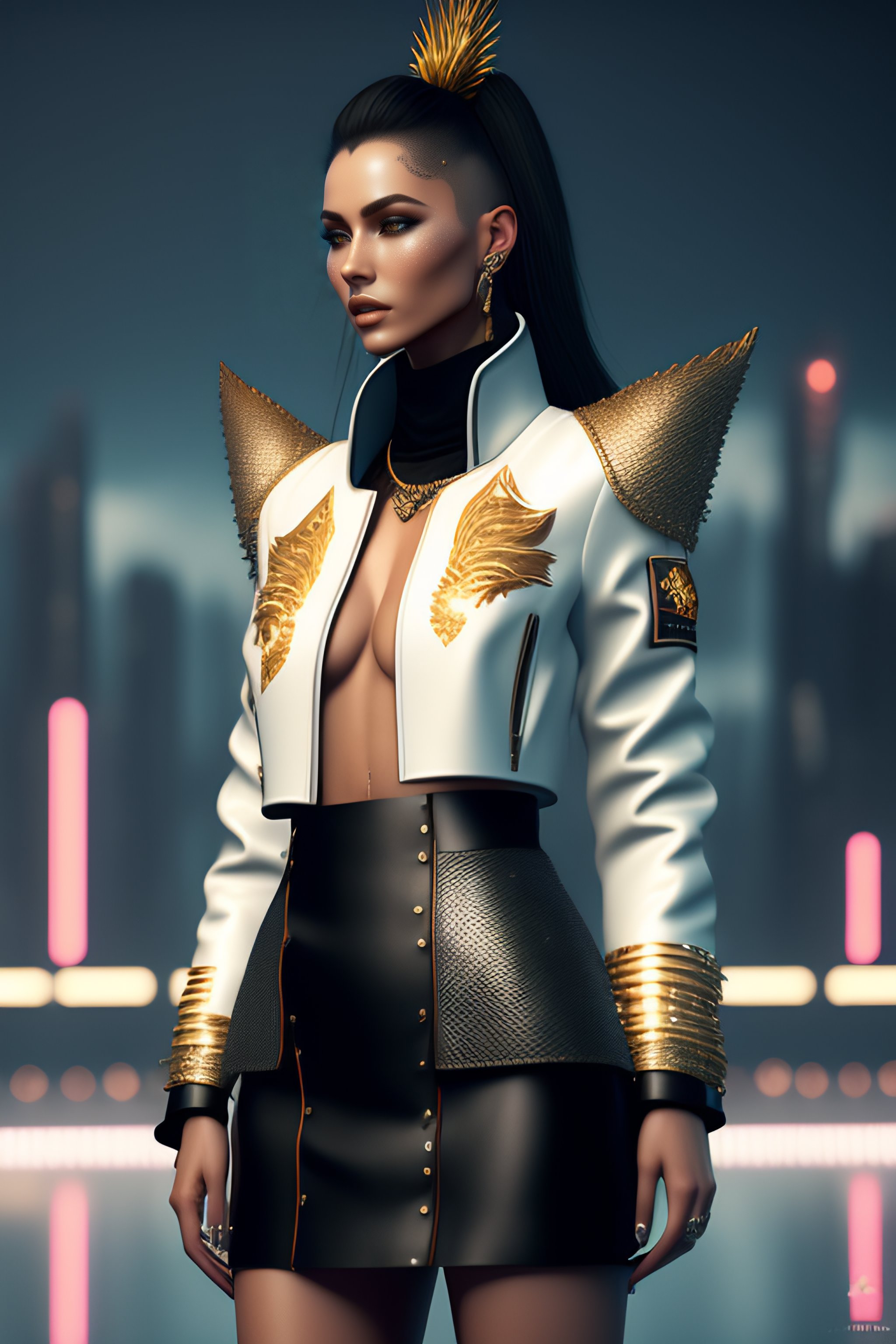 Monimal fashion style clothes with short hair rusian girl, white samurai leather jacket with glitters, jewels, long leather skirt, carbonfiber, battle status, hyper detailed, digital art, cyberpunk style, cybercinematic lighting, studio quality, smooth render, unreal engine 5 rendered, octane rendered, art style by klimt and nixeu and ian sprigger and wlop and krenz cushark, wicker