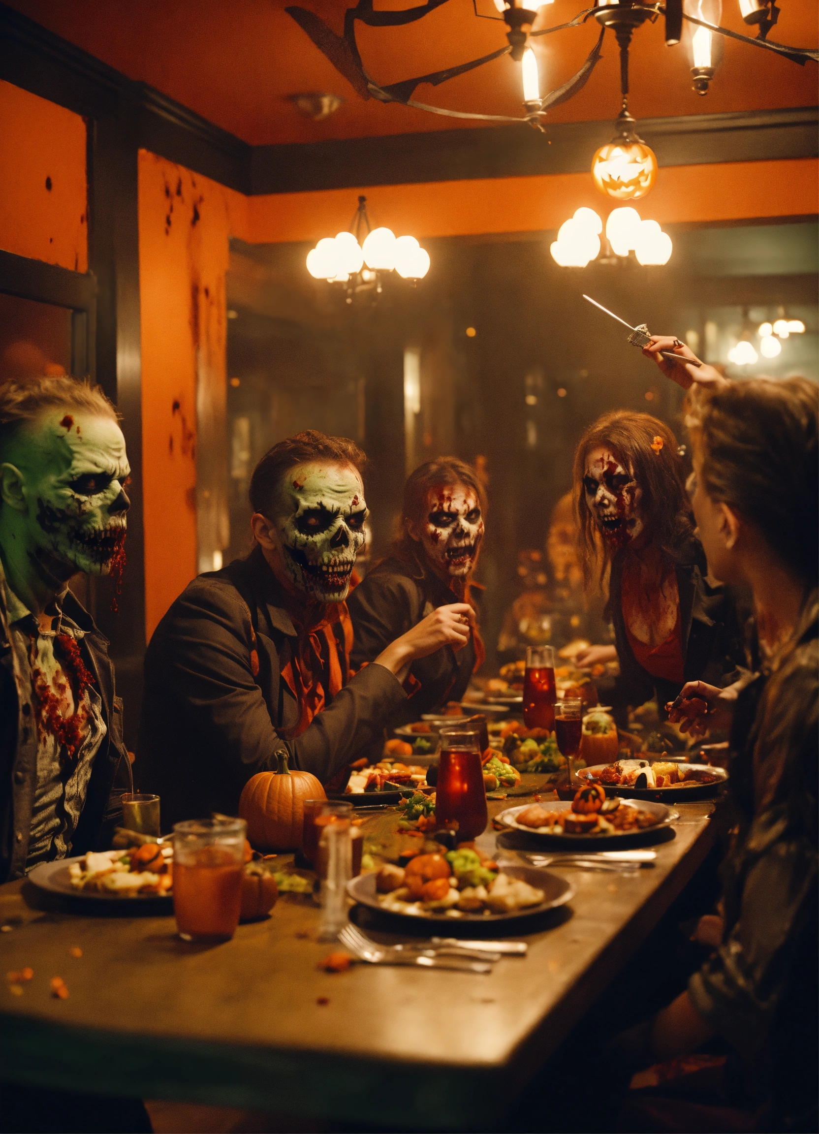 A group of diners in a halloween decorated restaurant dressed in halloween costumes are attacked by zombies, photorealistic 4k