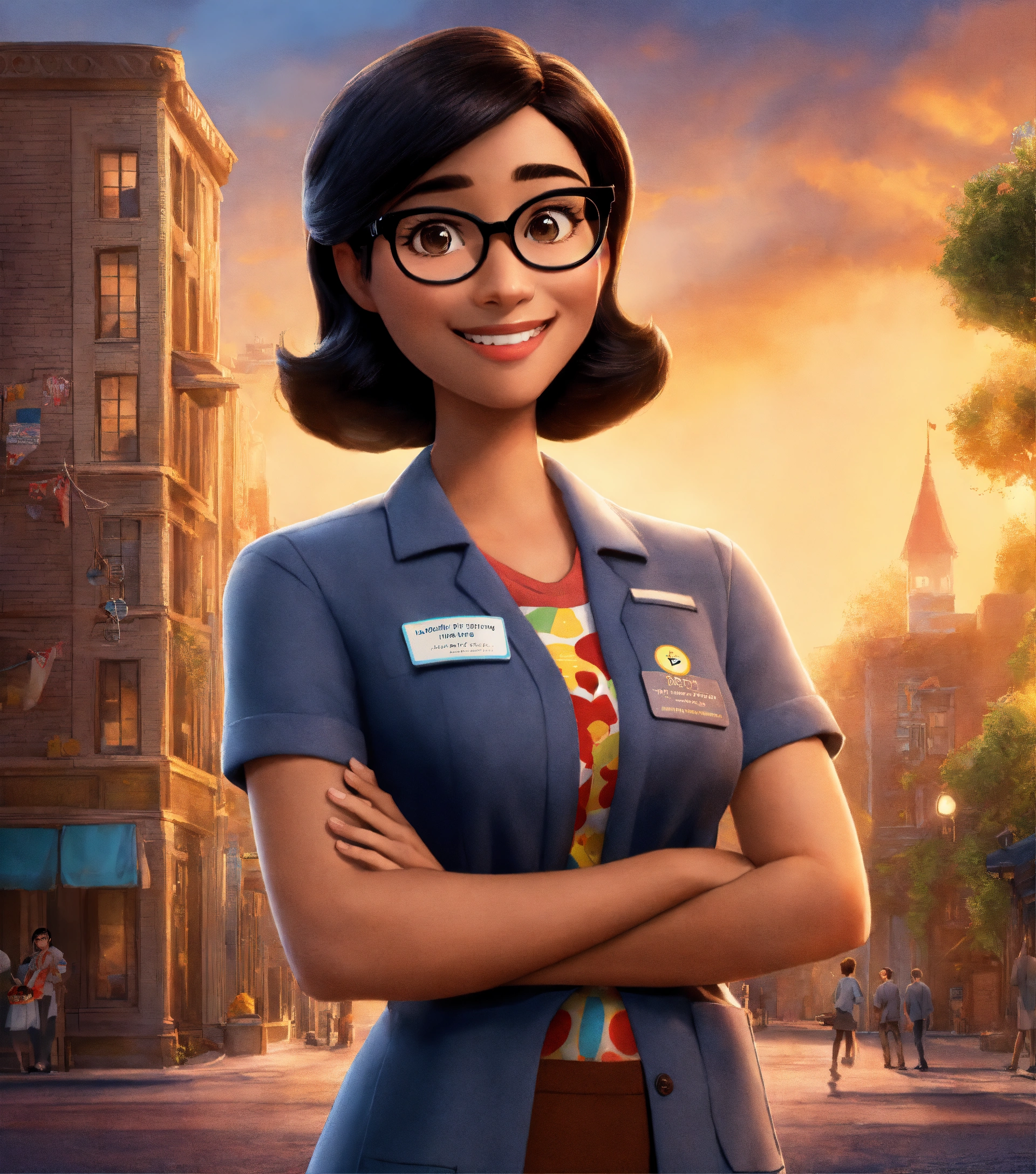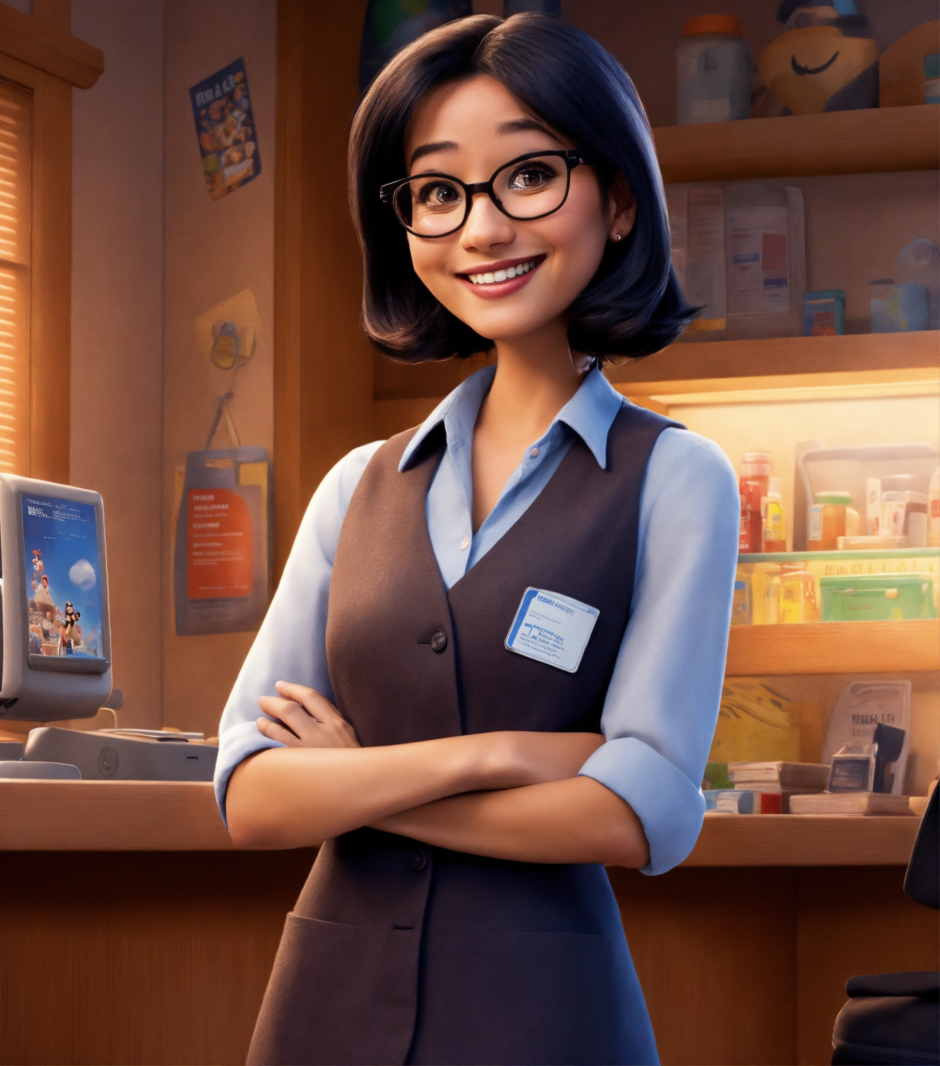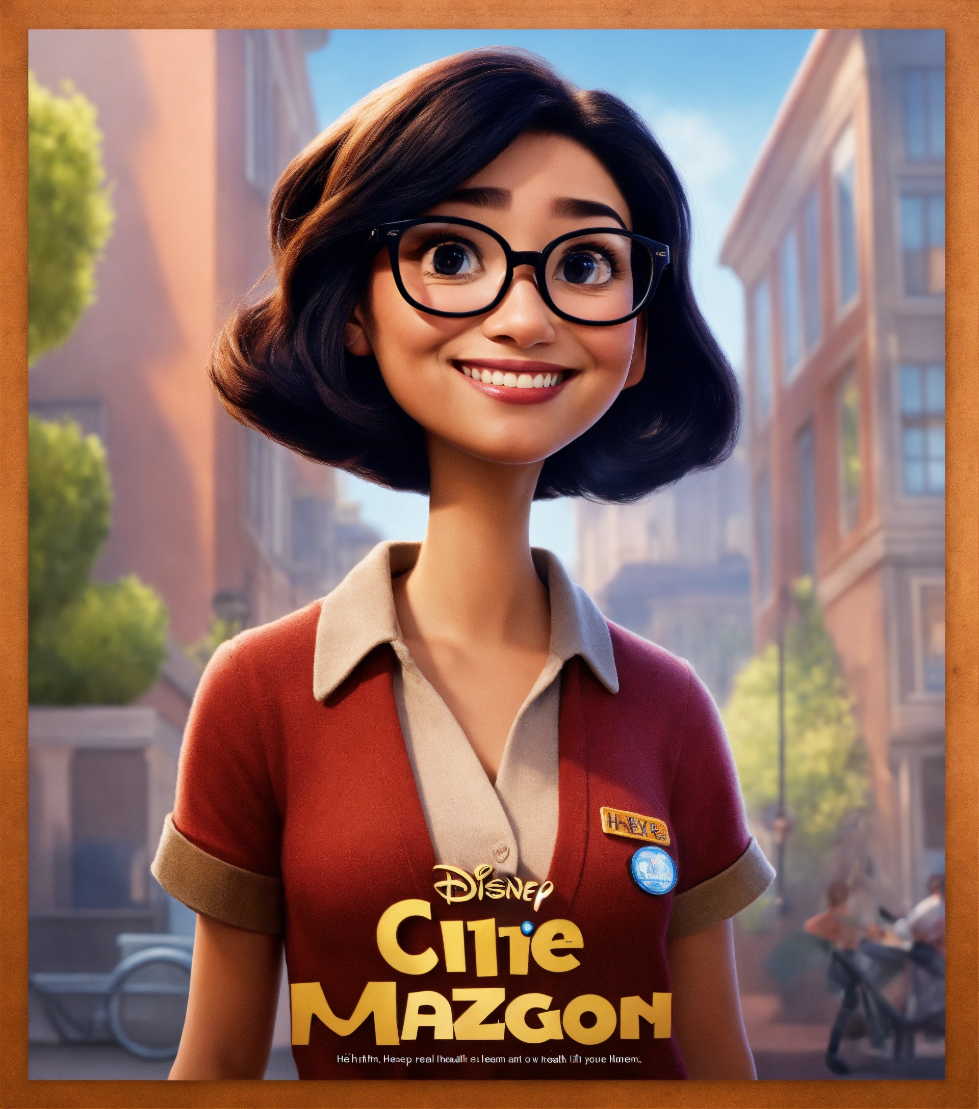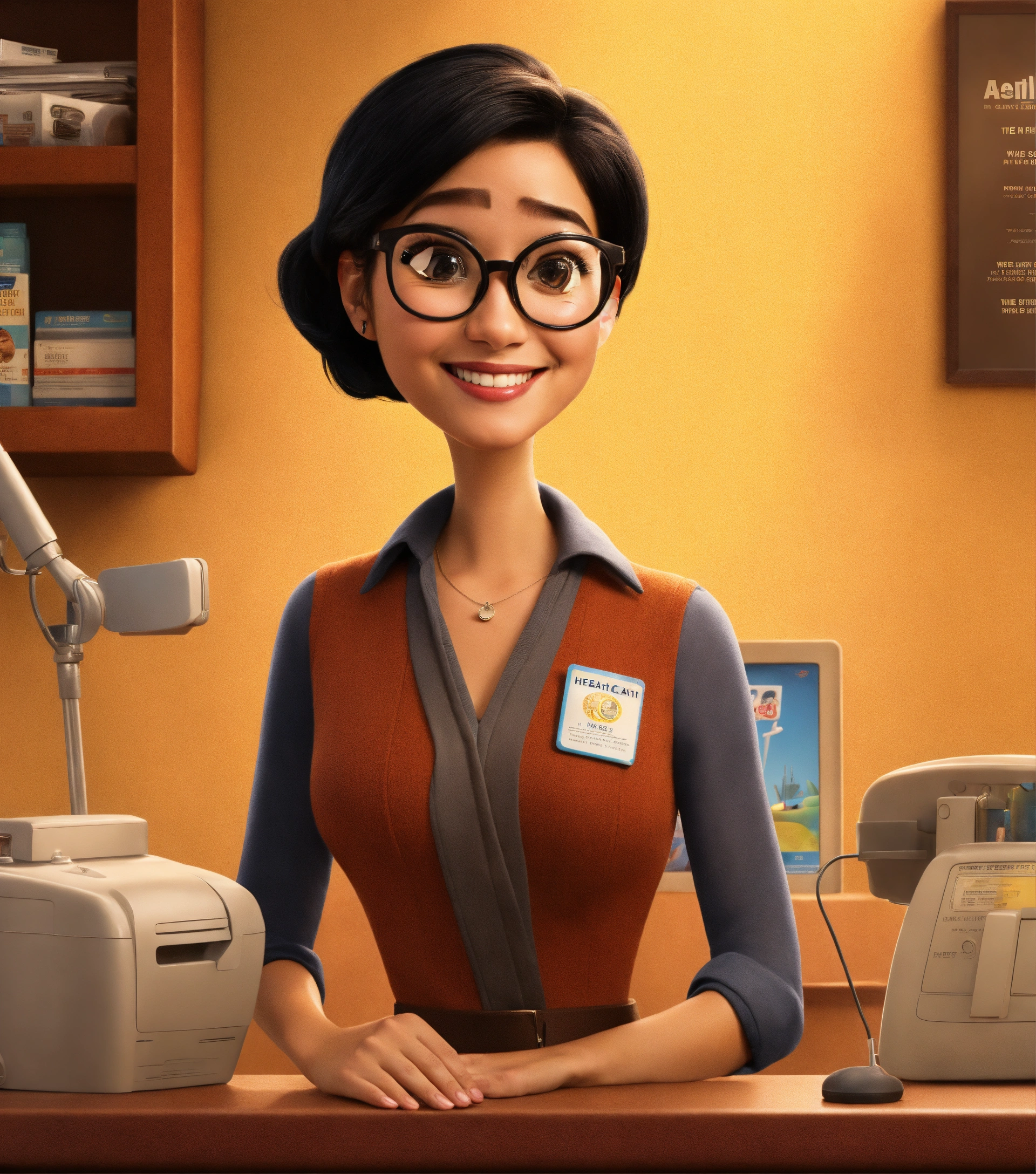 Movie poster, pixar style, disney style, health center manager, woman slim and small, medium straight black hair, brown eyes, glasses, black clothe, beautiful smile, standing up