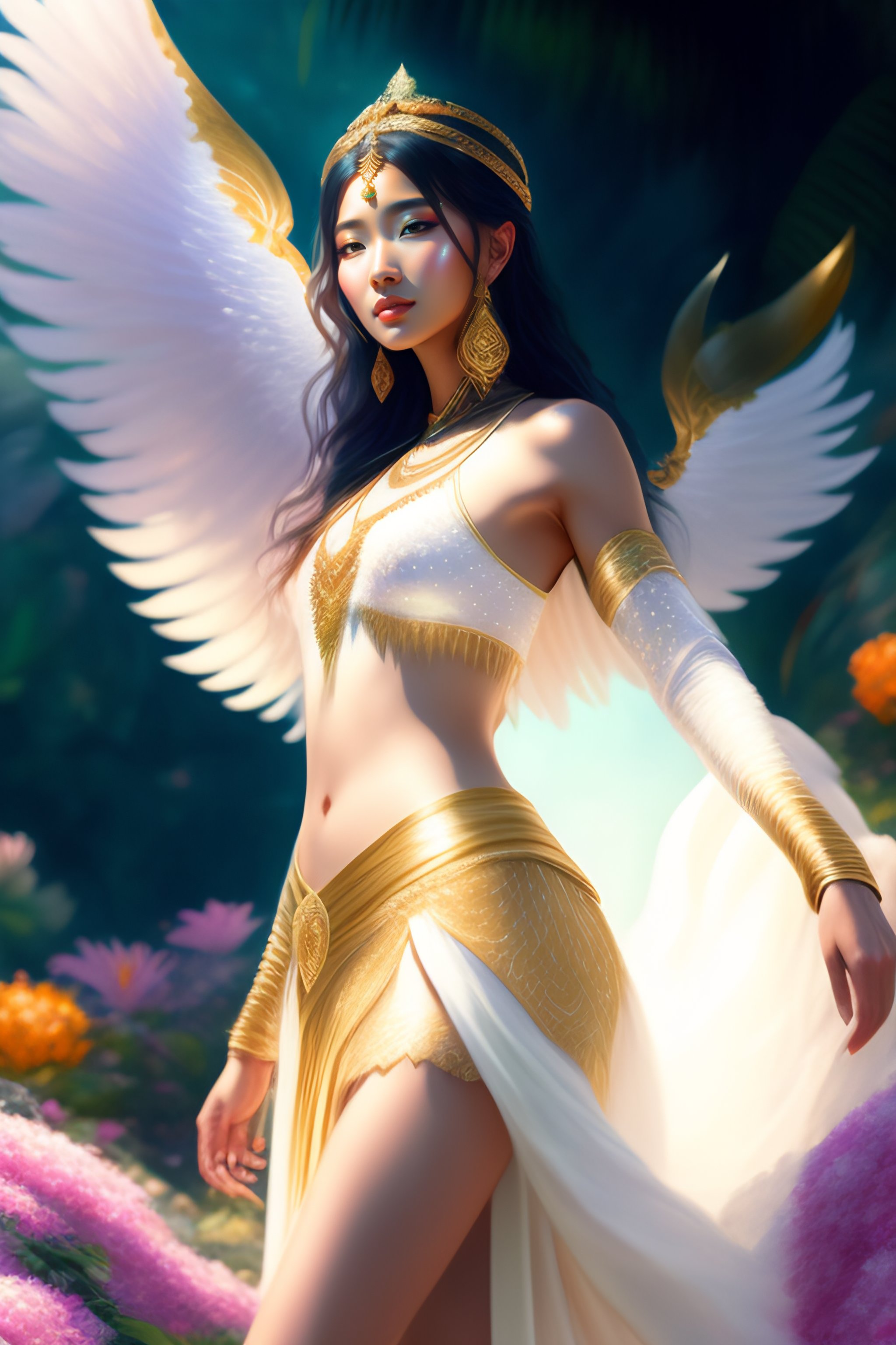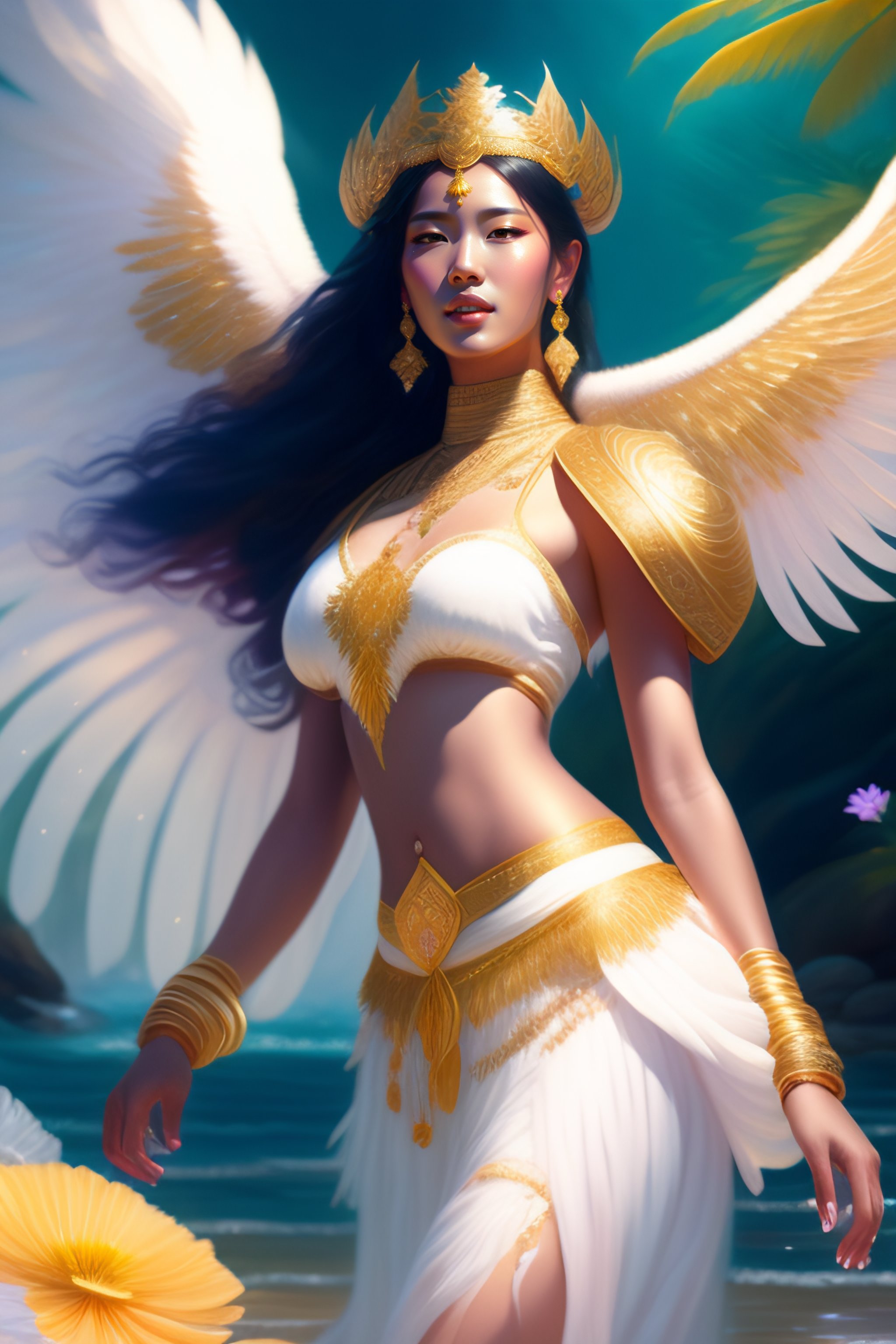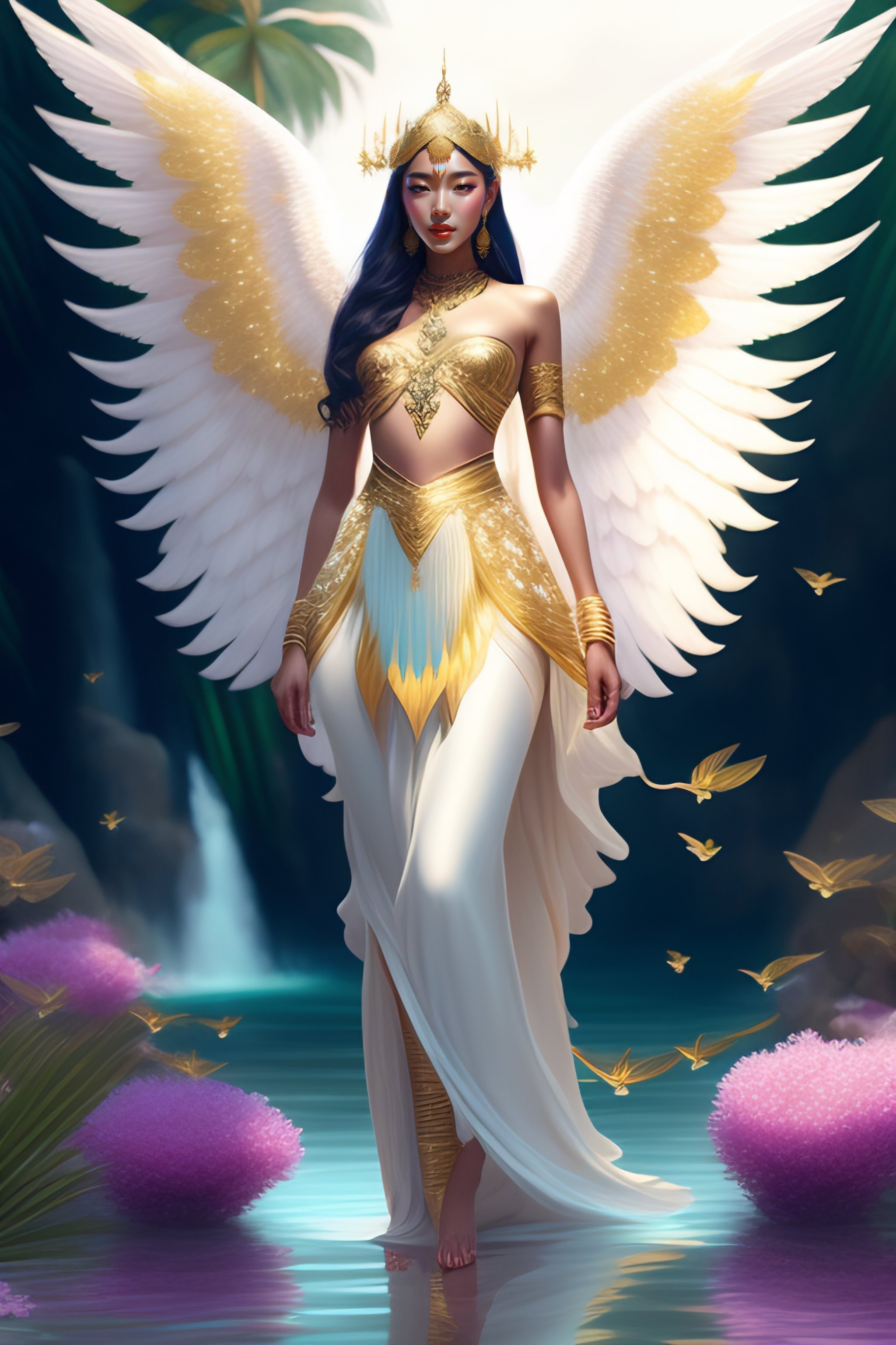 Yoo yoonjin as beautiful arabian princess with angel wings wearing white clothes and gold jewels dancing in water on tropical beach with greeneries and colorful flowers, full-body view, greg rutkowski, ultra detailed, volumetric lighting