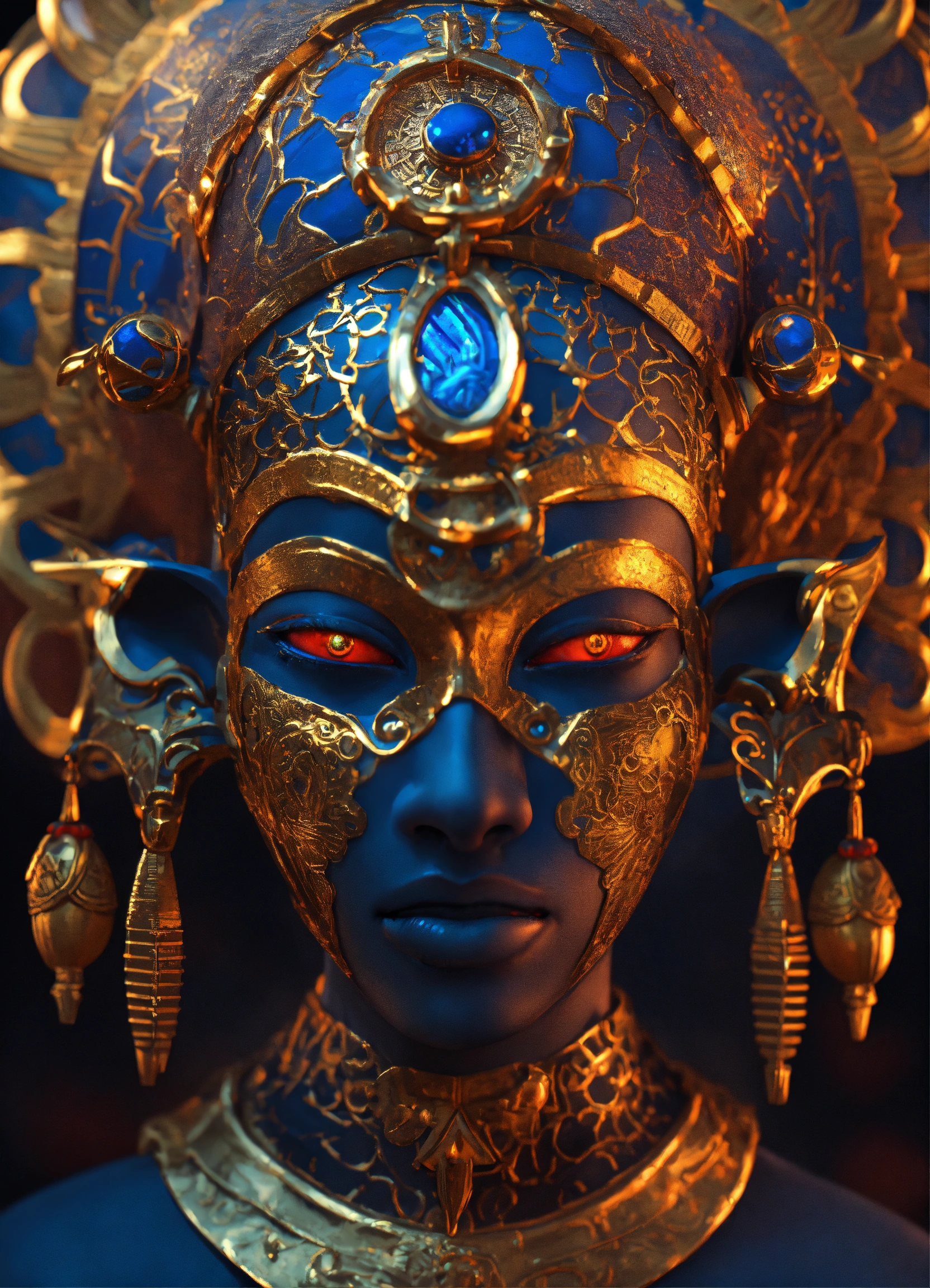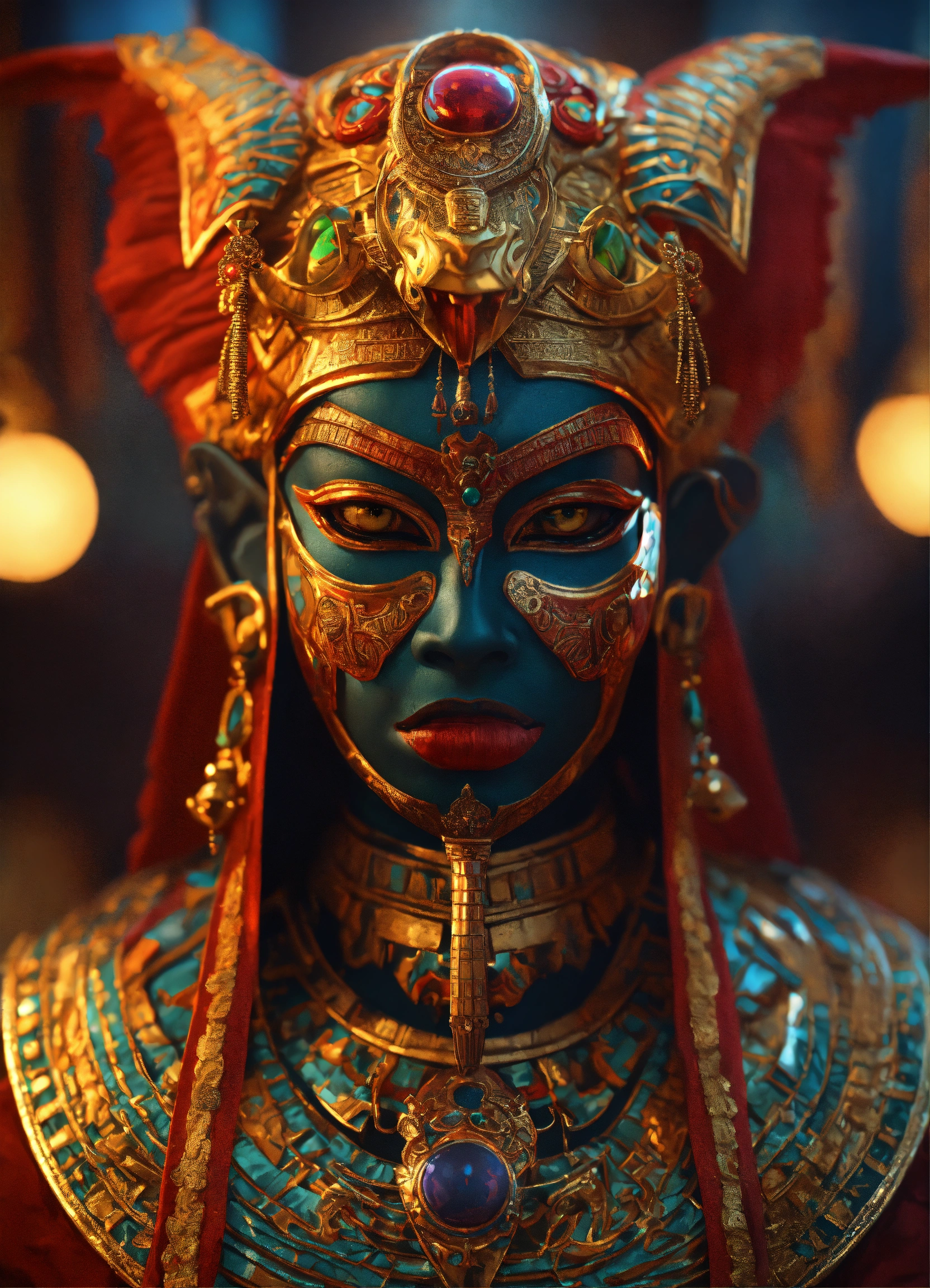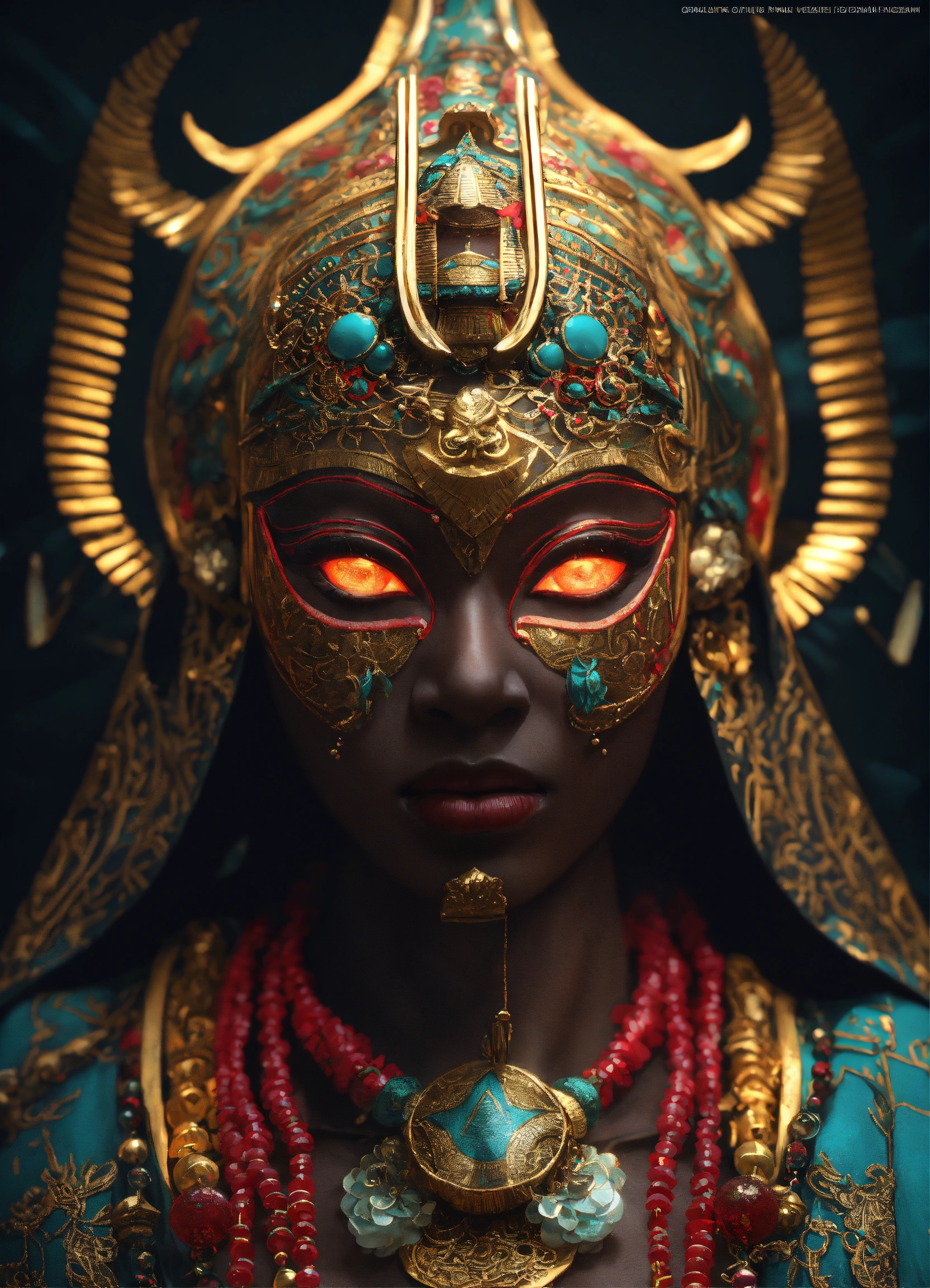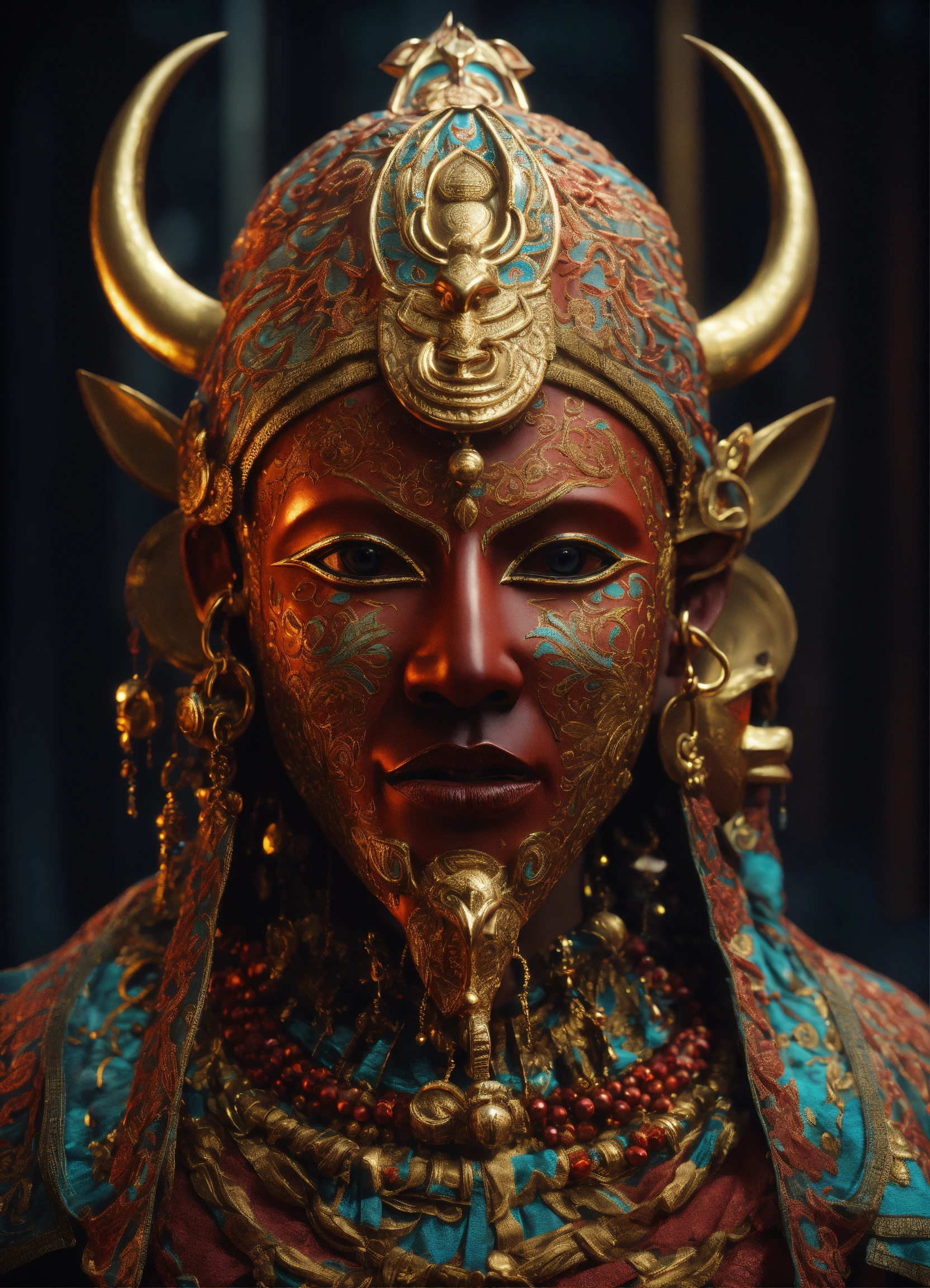 Ethiopian oni evil mask intricate, veil, porcelain, scenario fantasy, ornaments detailed, cold colors, metal, egyptian detail, highly intricate details, realistic light, trending on cgsociety, glowing eyes, facing camera, neon details, ultra-realistic details, portrait full body, japanese atmosphere, global illumination, shadows, octane render, 8k, ultra-sharp