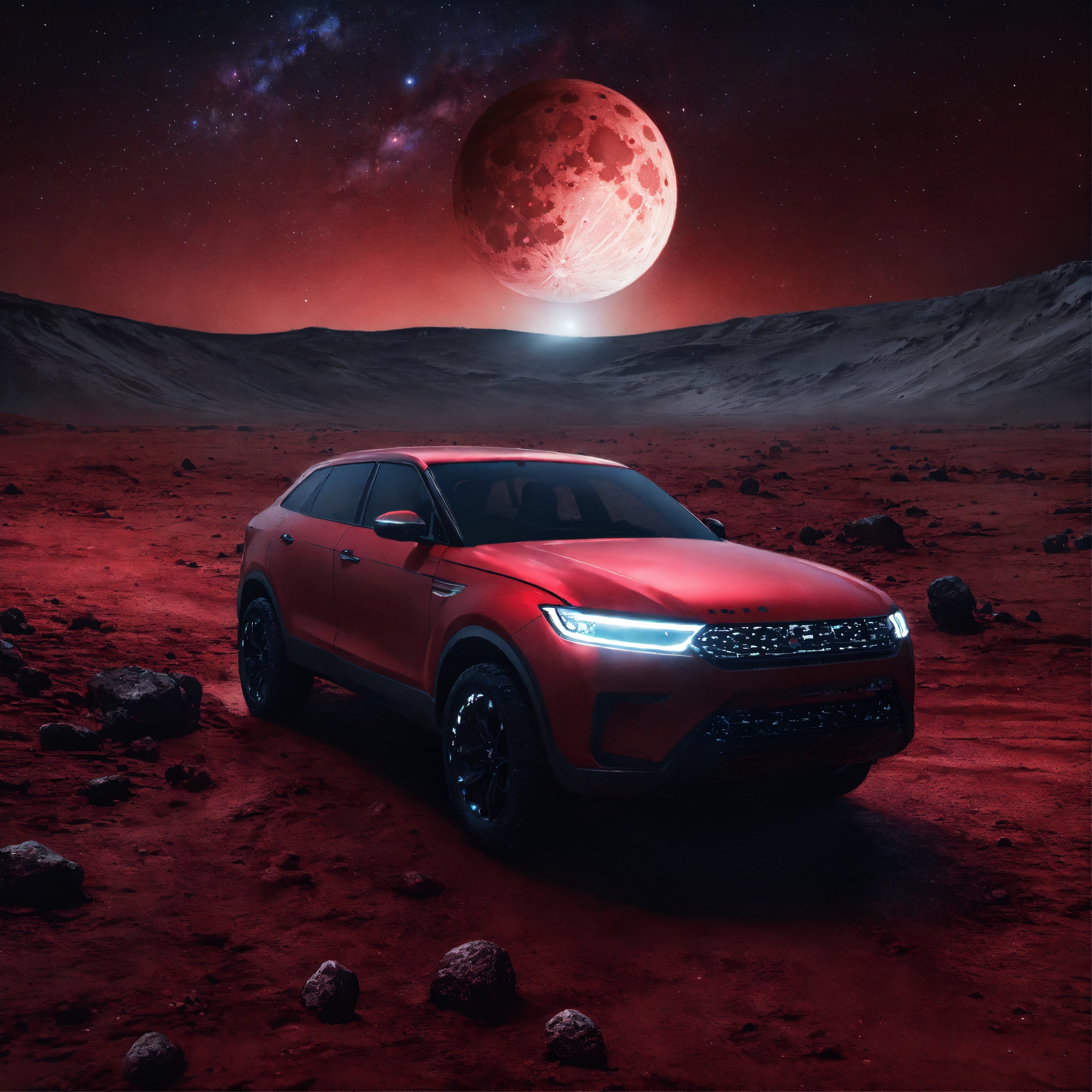A dark red auto traveling on the surface of the moon, moon craters, night sky, milky way, hard lighting, matte painting, concept art, 4k