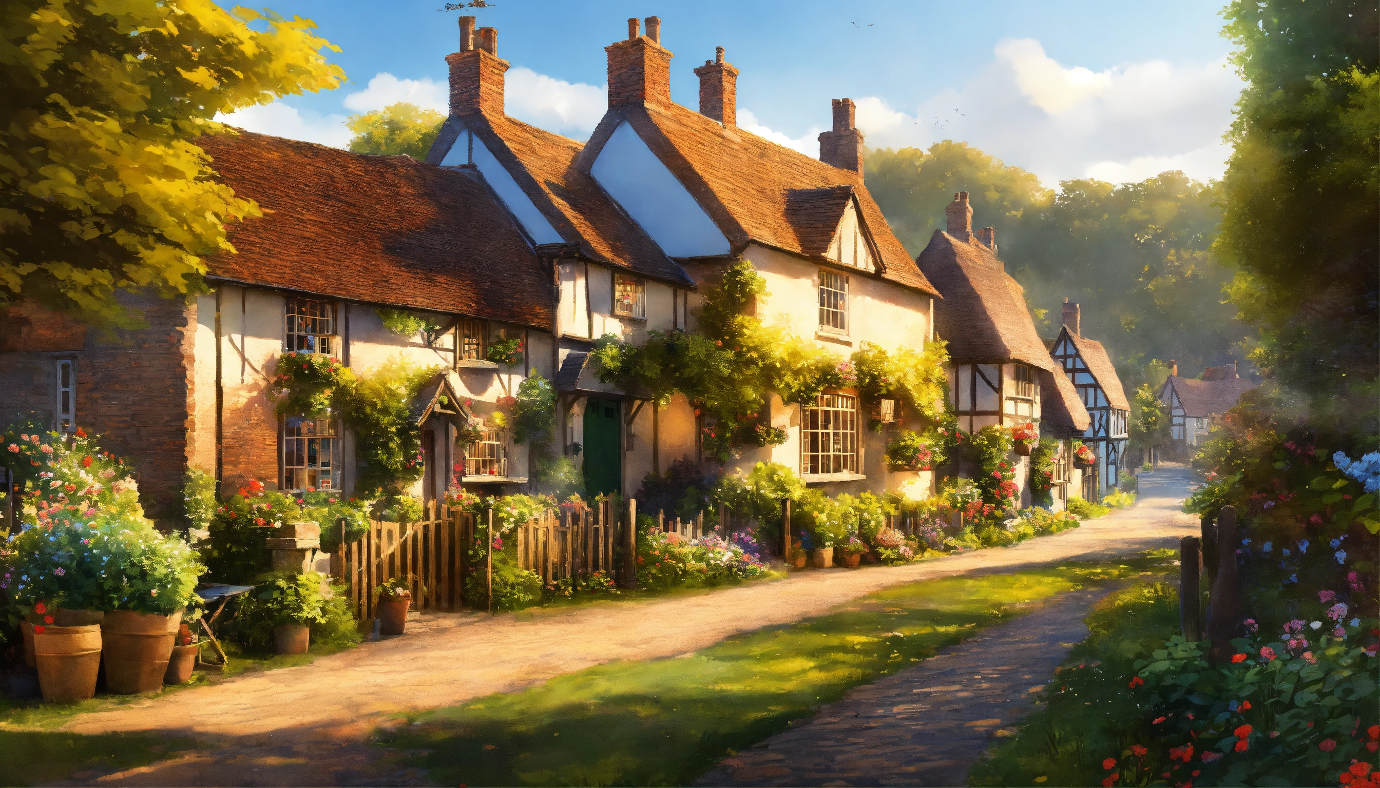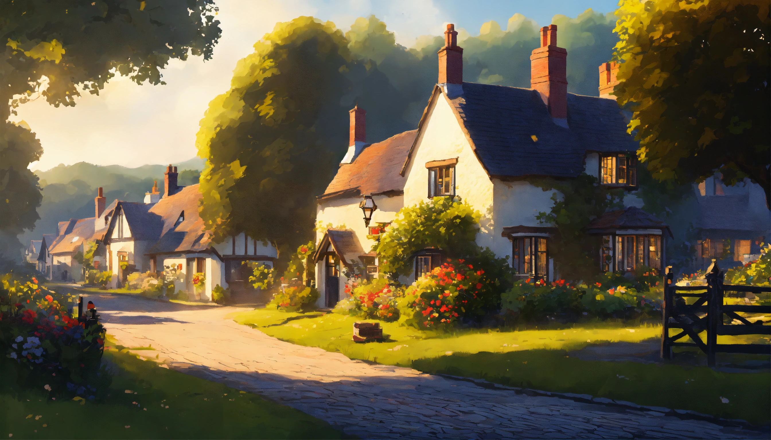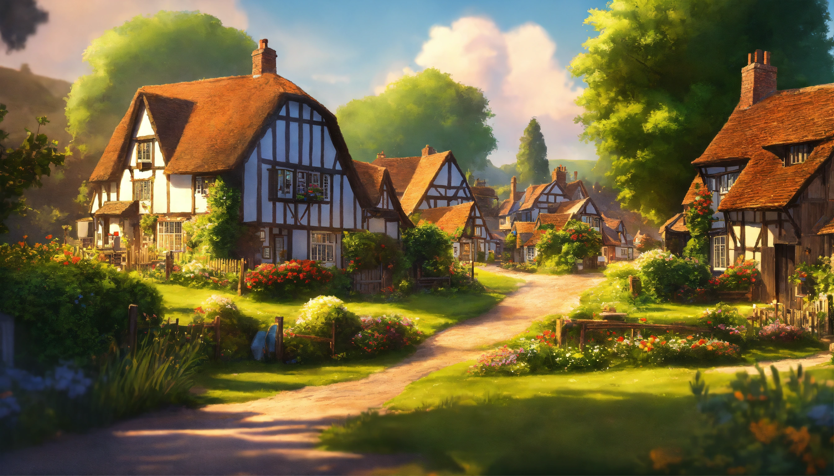 Landscape desktop wallpaper of a beautiful english country village in the style of illustrator donald zolan, 8k, highly detailed, photo realistic, cinematic, brightly lit