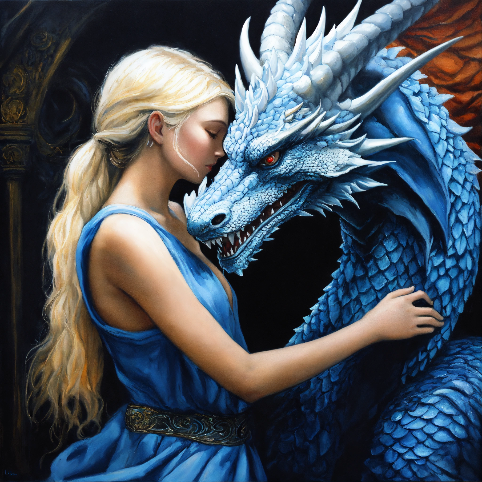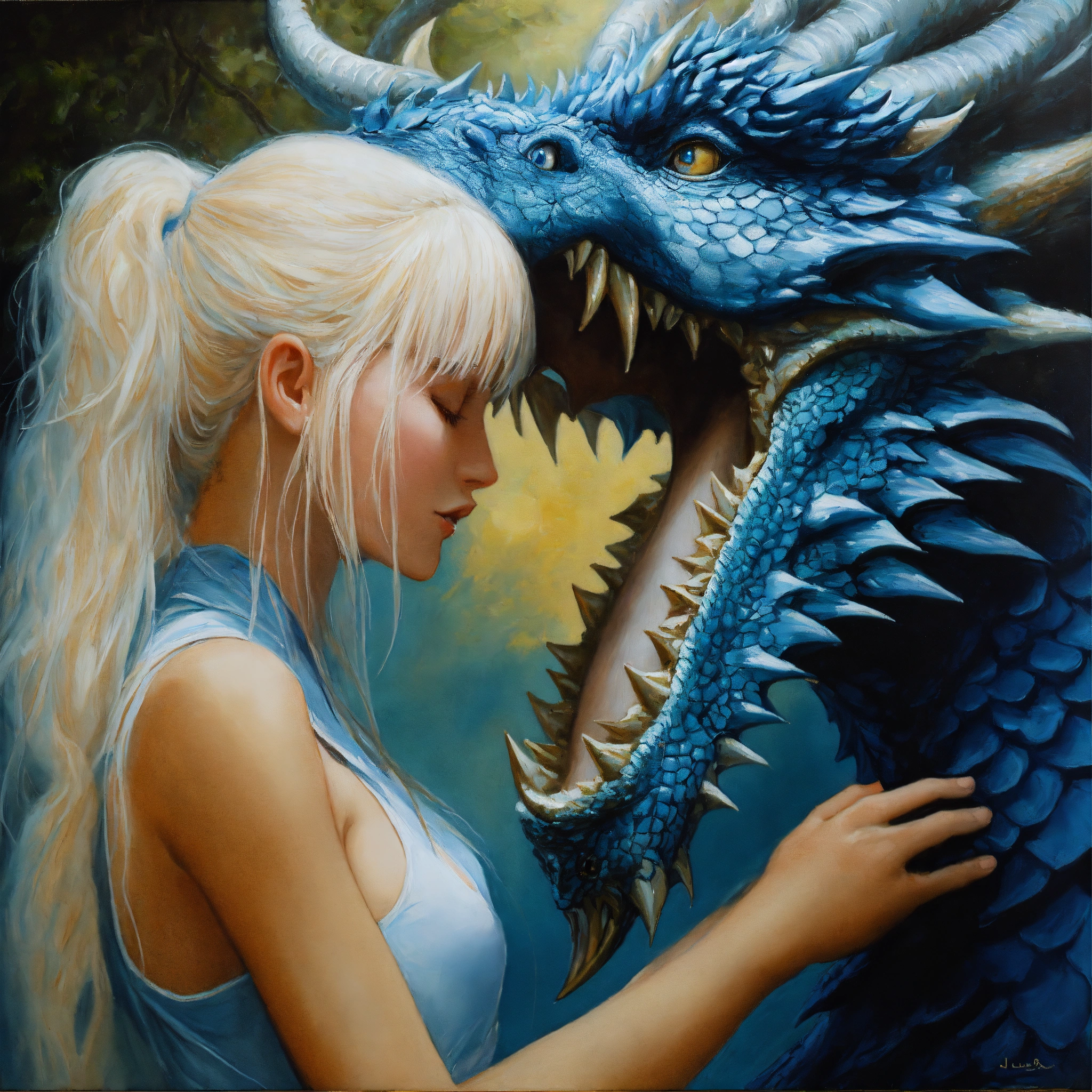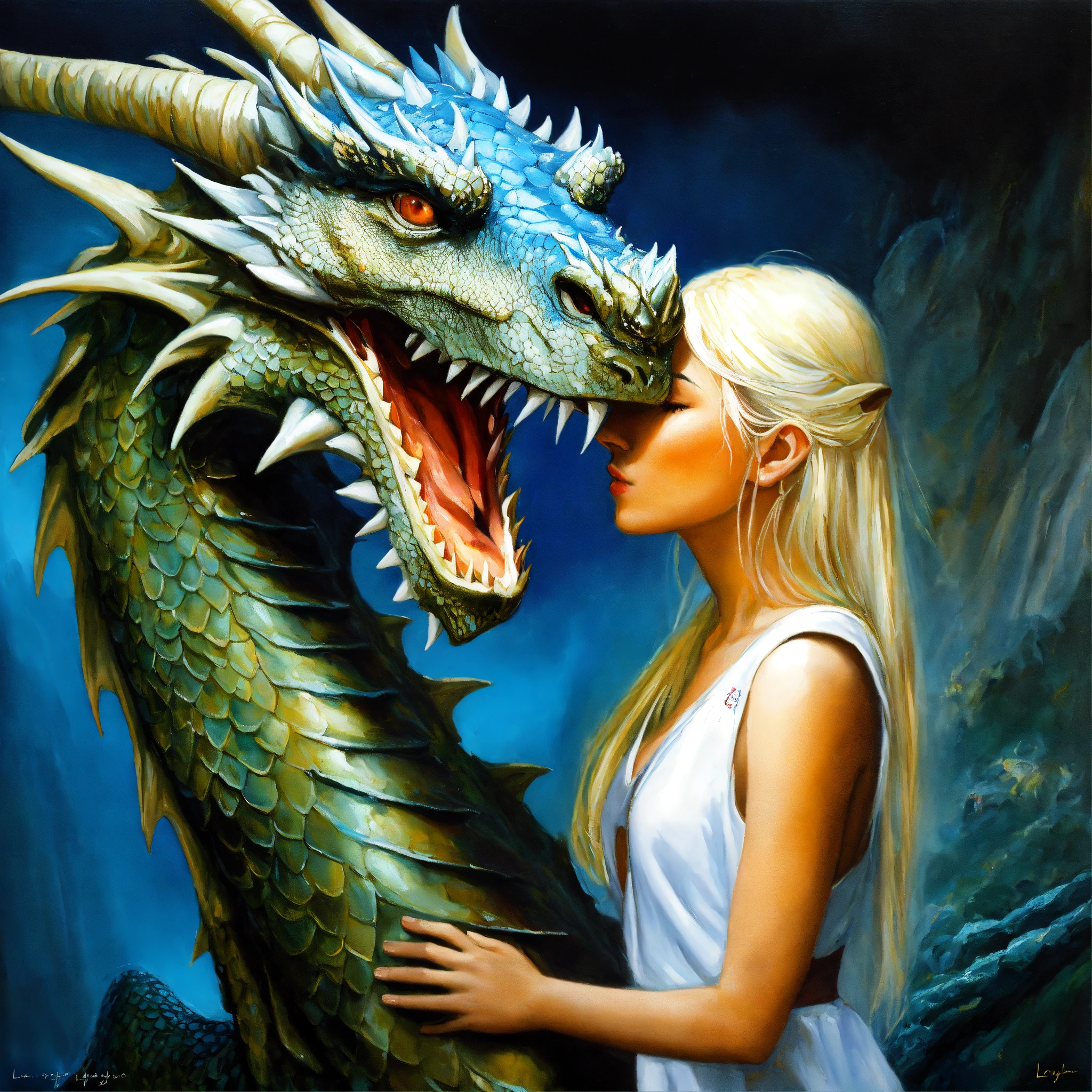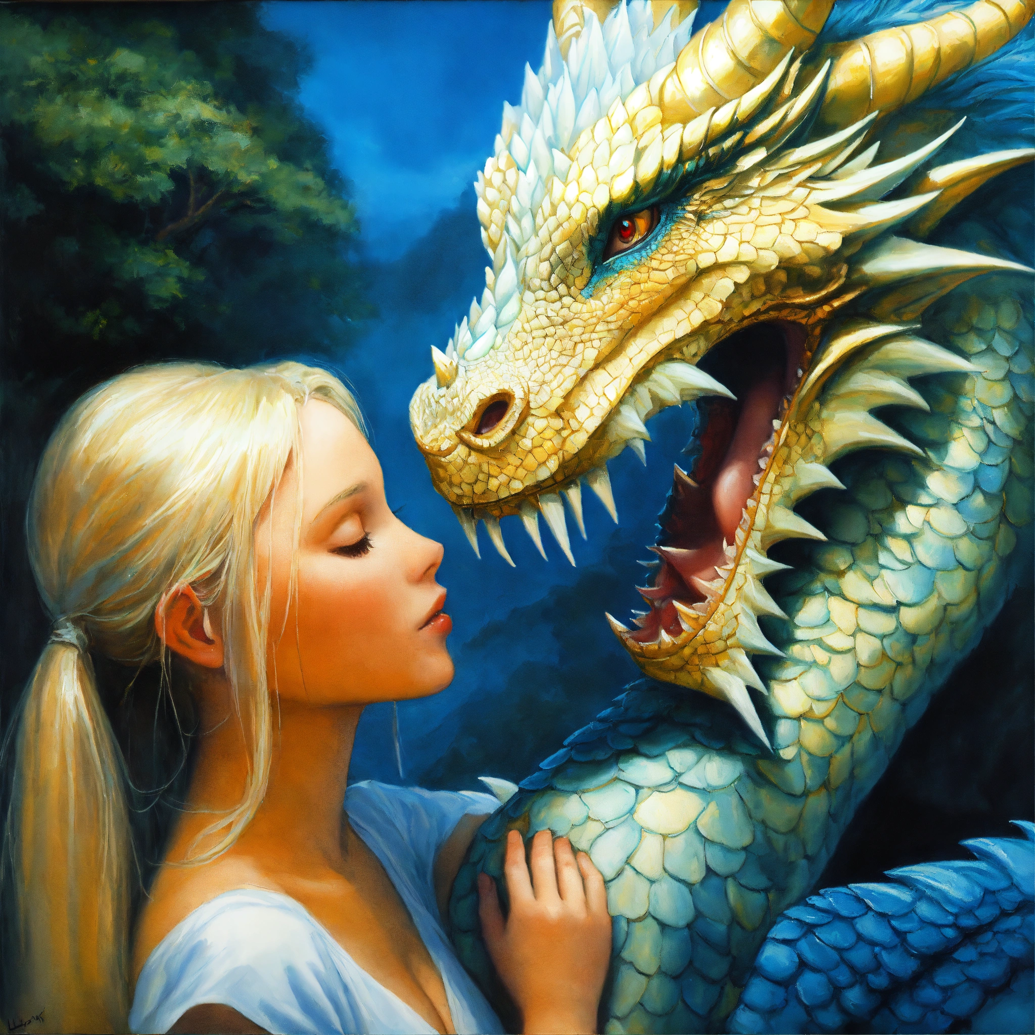 Oil painting of a huge magnificent two meter big blue dragon's head with a 15 year old white blonde elf girl lovingly hugging and kissing the dragon's head, the dragon's head is as big as the entire girl, ultra detailled, ultra realistic, in the style of luis royo