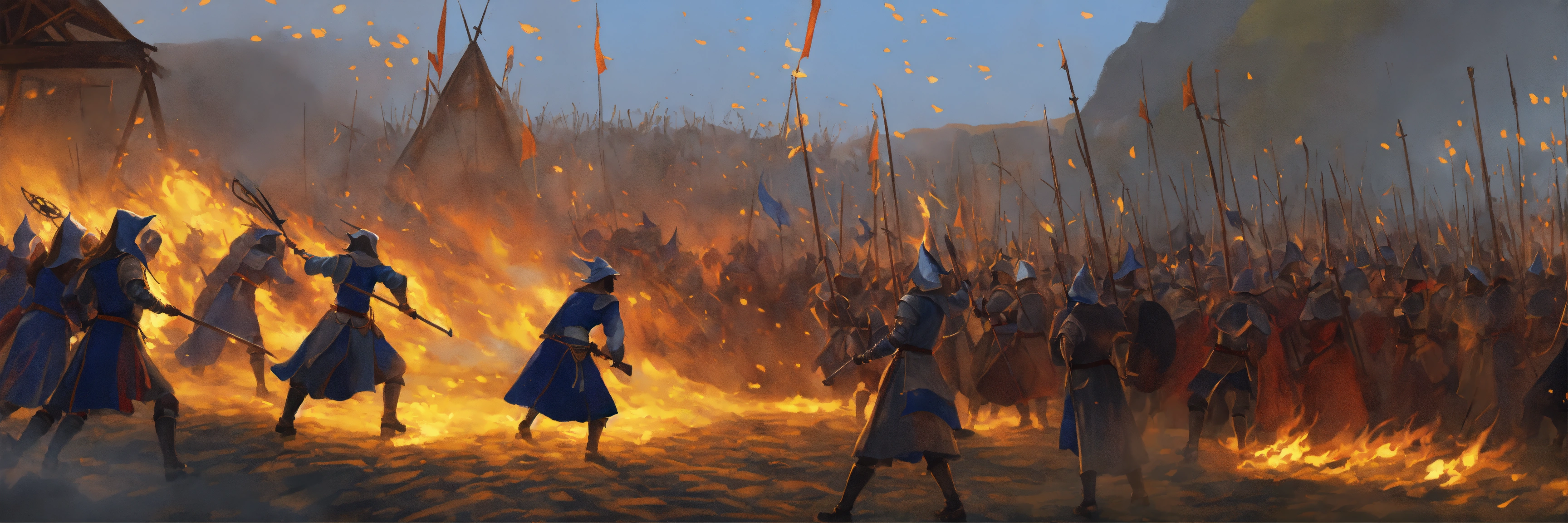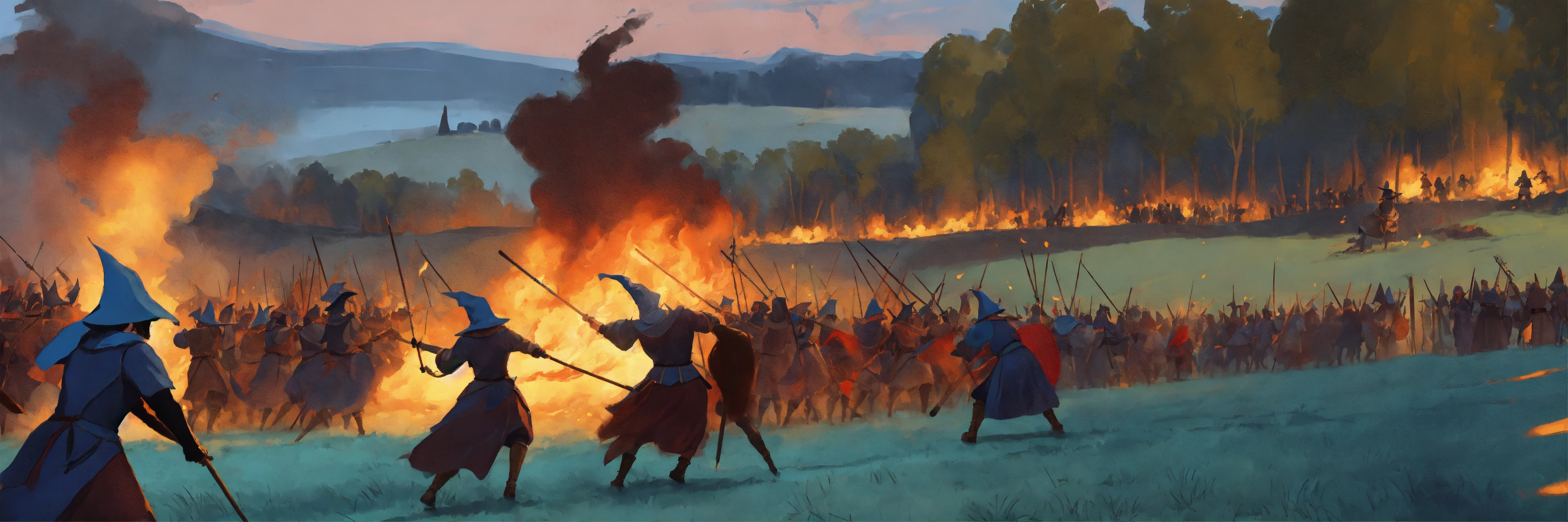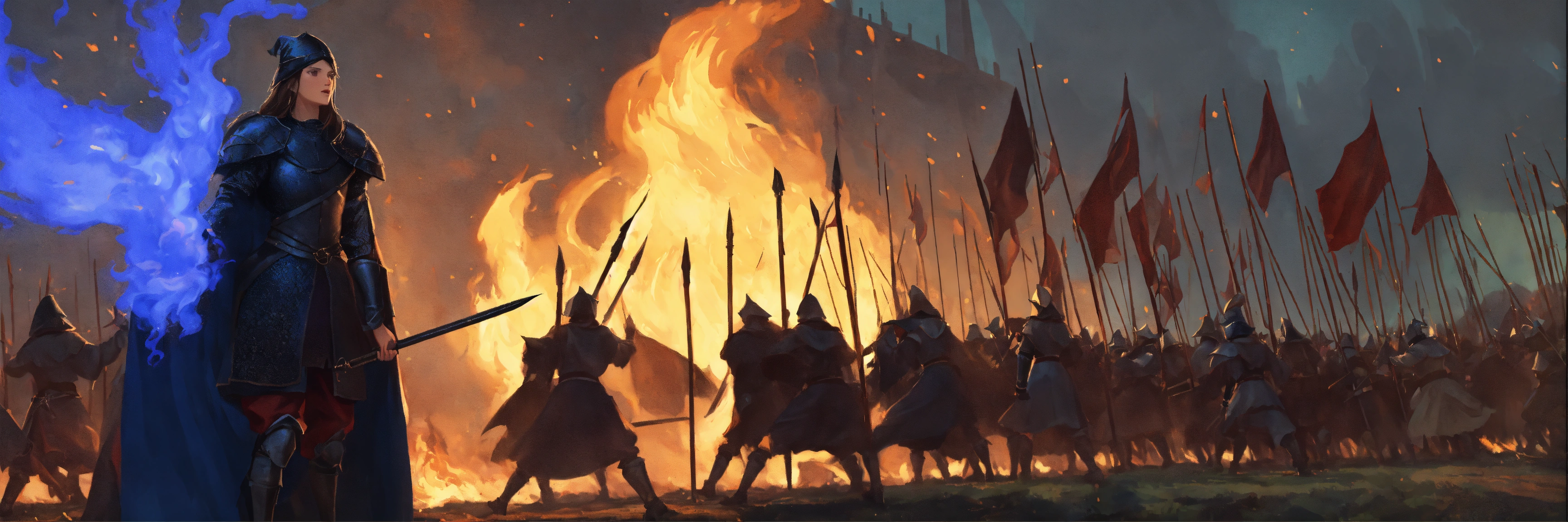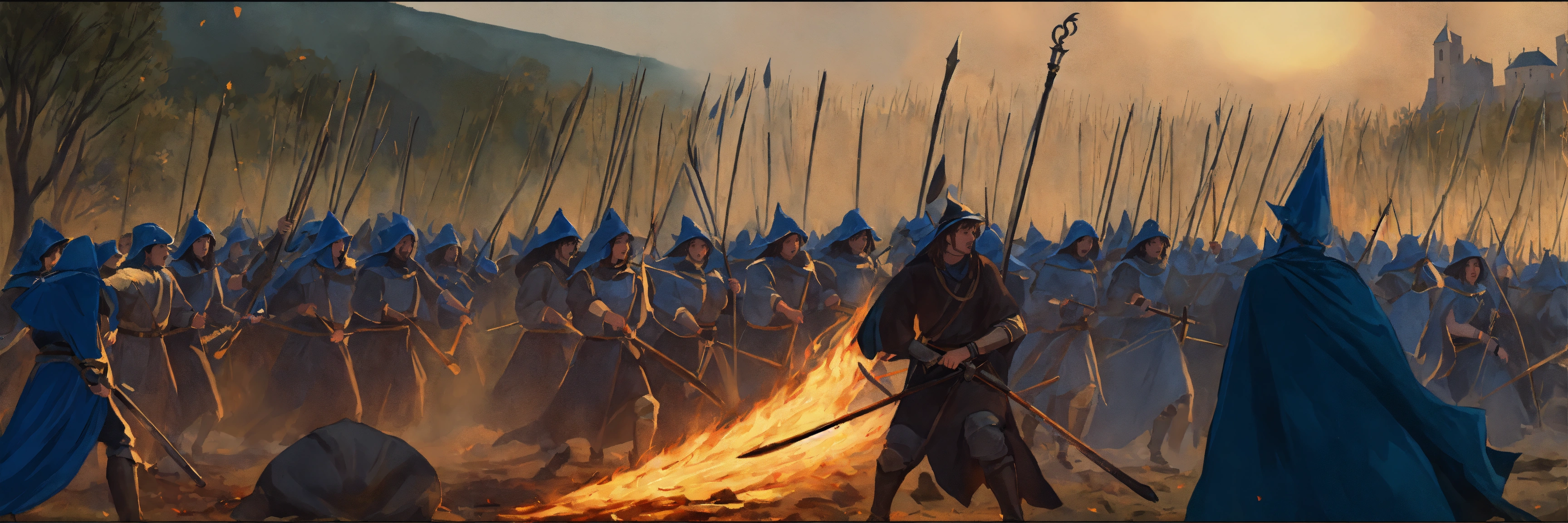 Illustration of a medieval battleground. women warring in the background throwing blue flames, dressed as witches