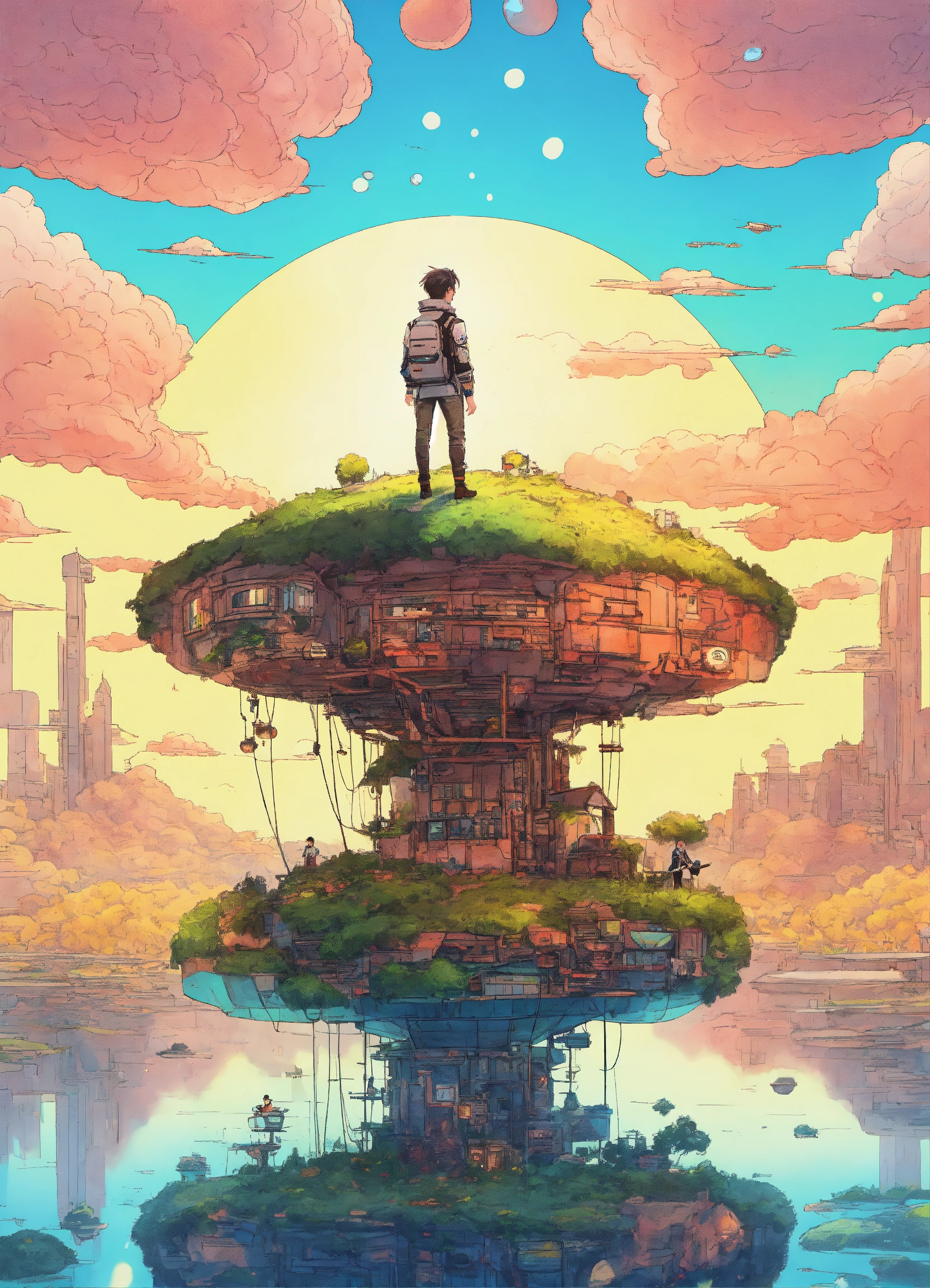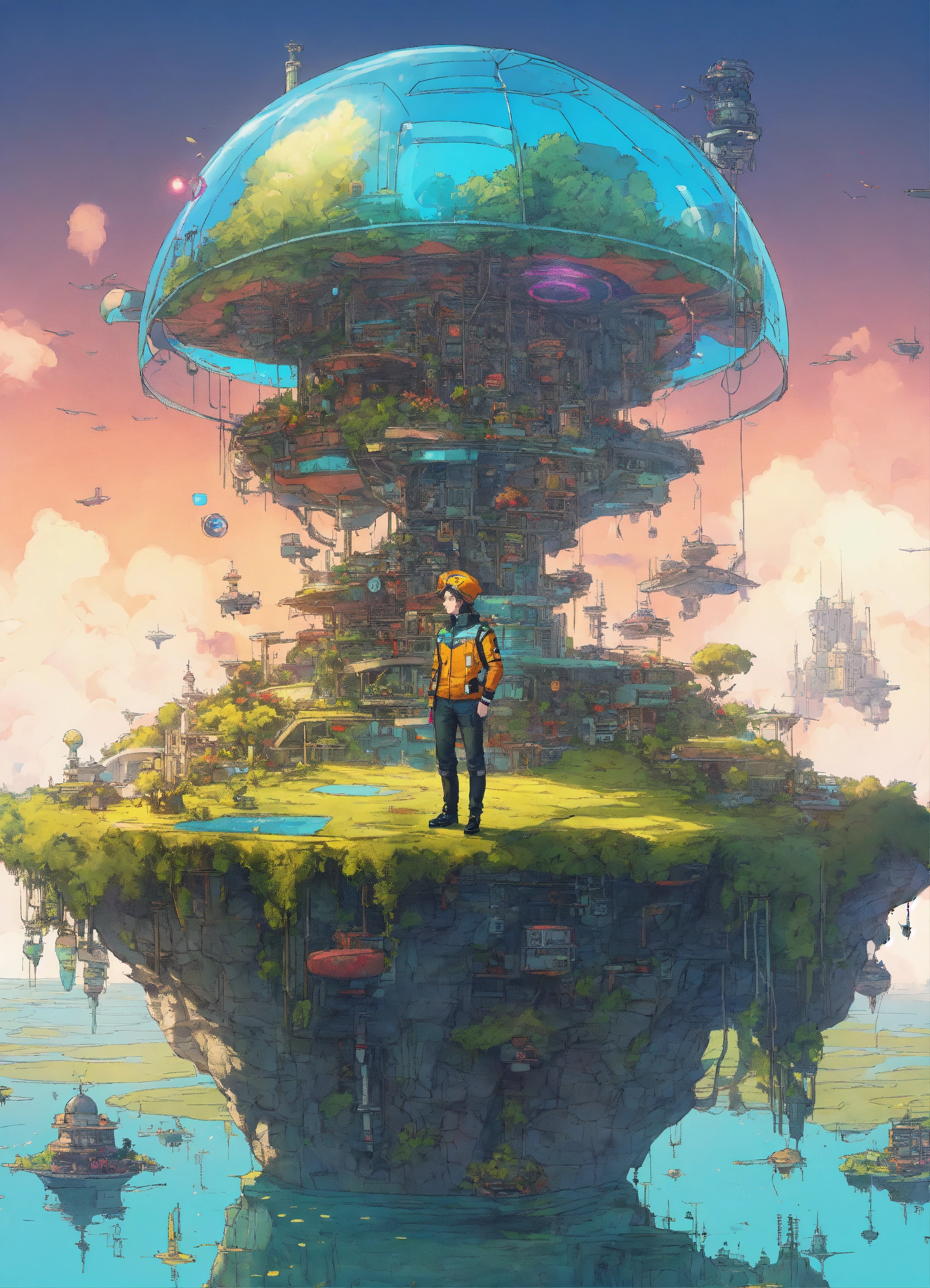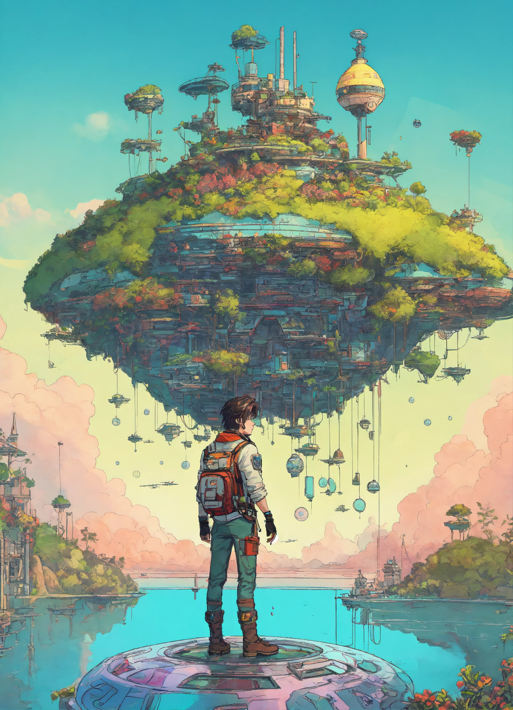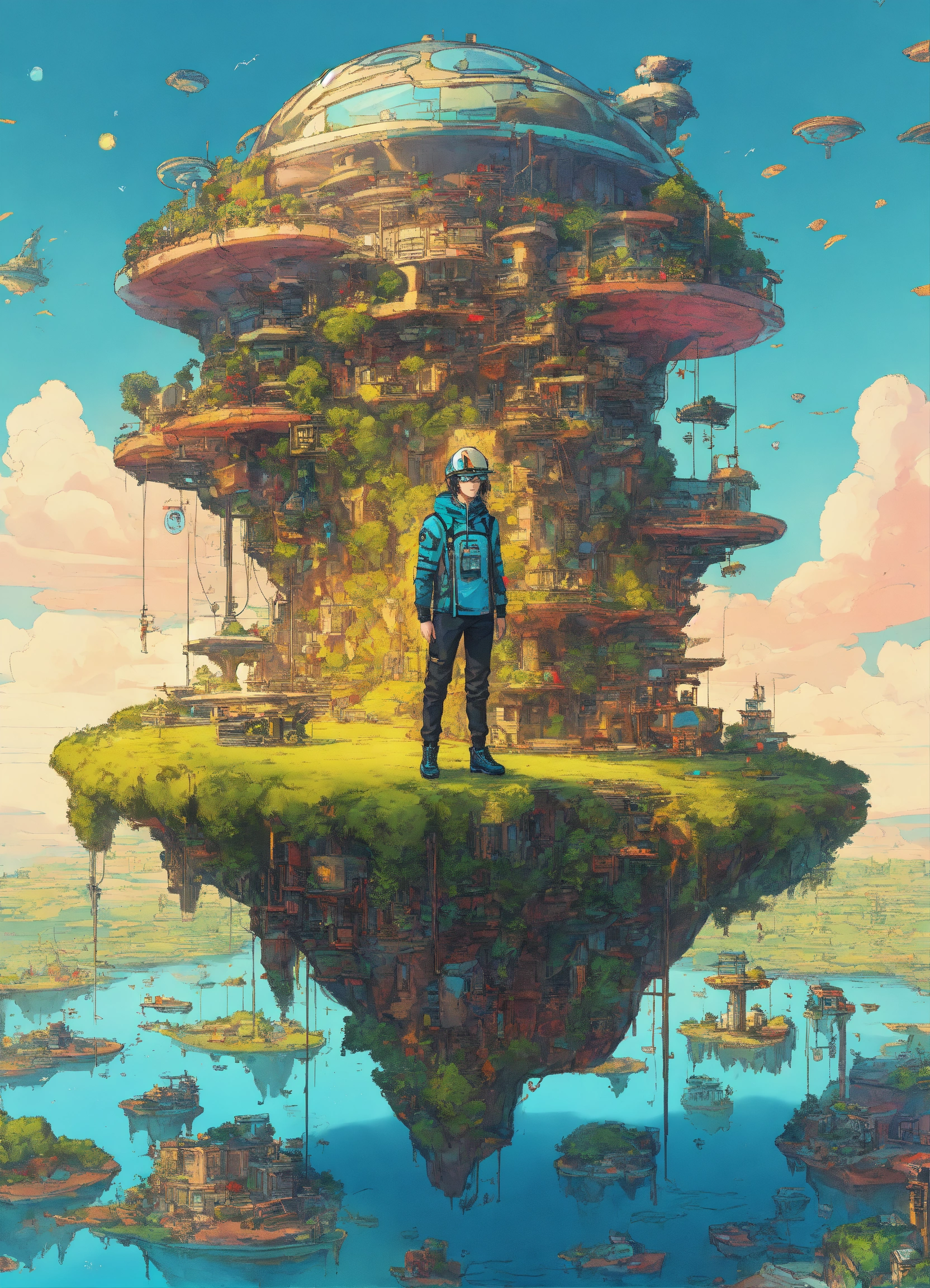 Futurepunk young man in futuristic outfit standing on a floating island, sunny day, colorful lighting, front camera portrait, ultra-high definition (uhd), very detailed, by mattias adolfsson