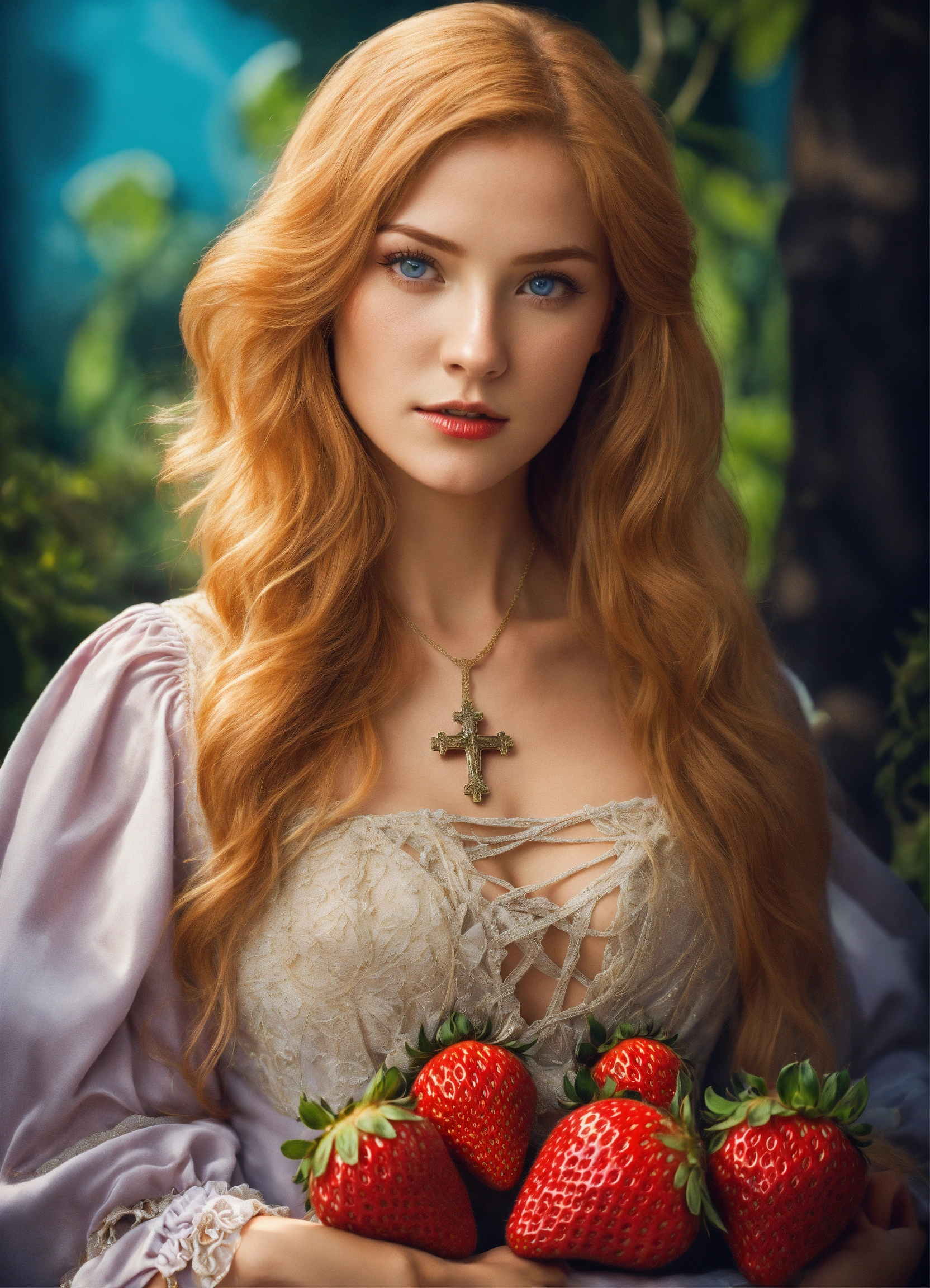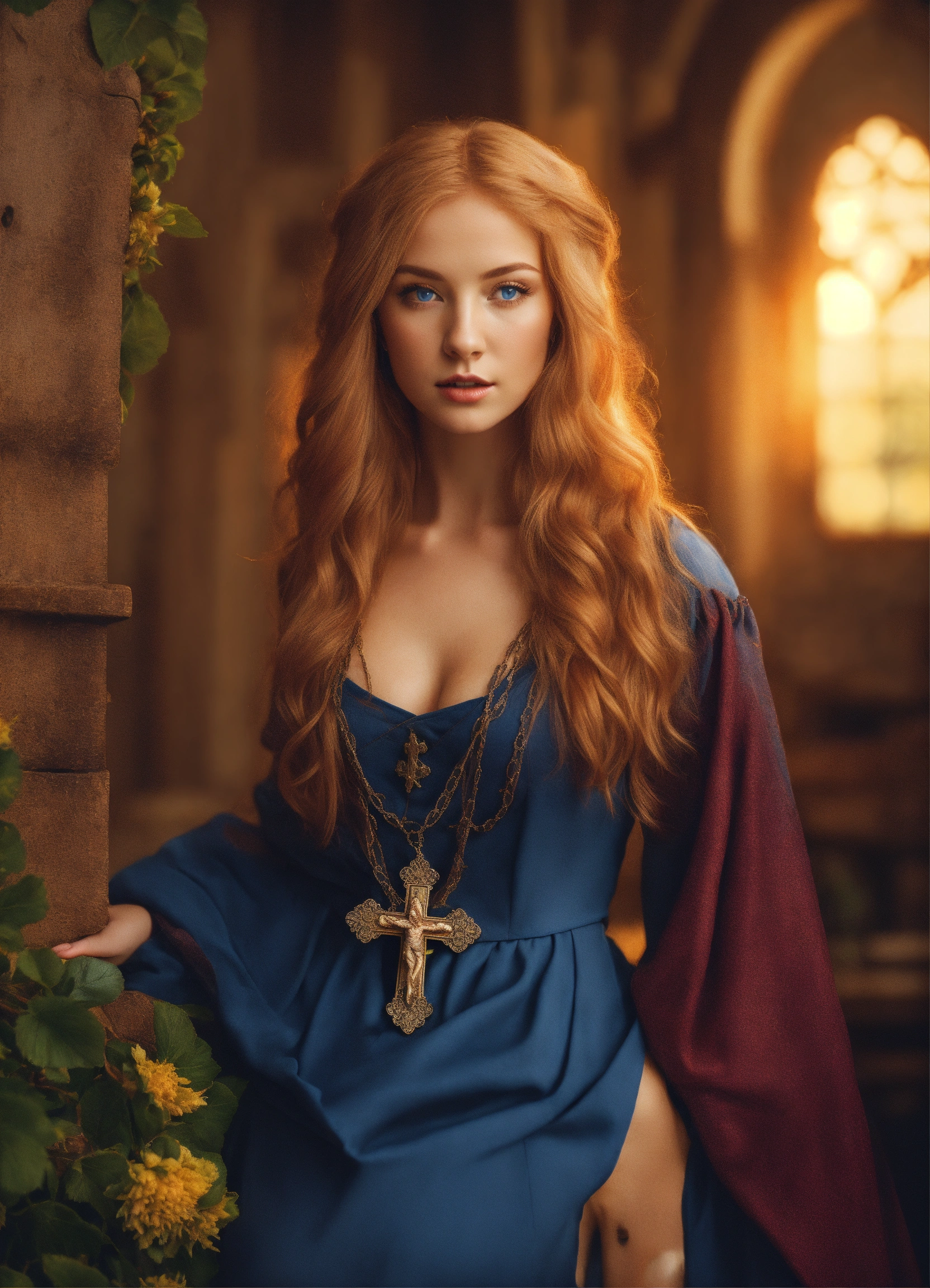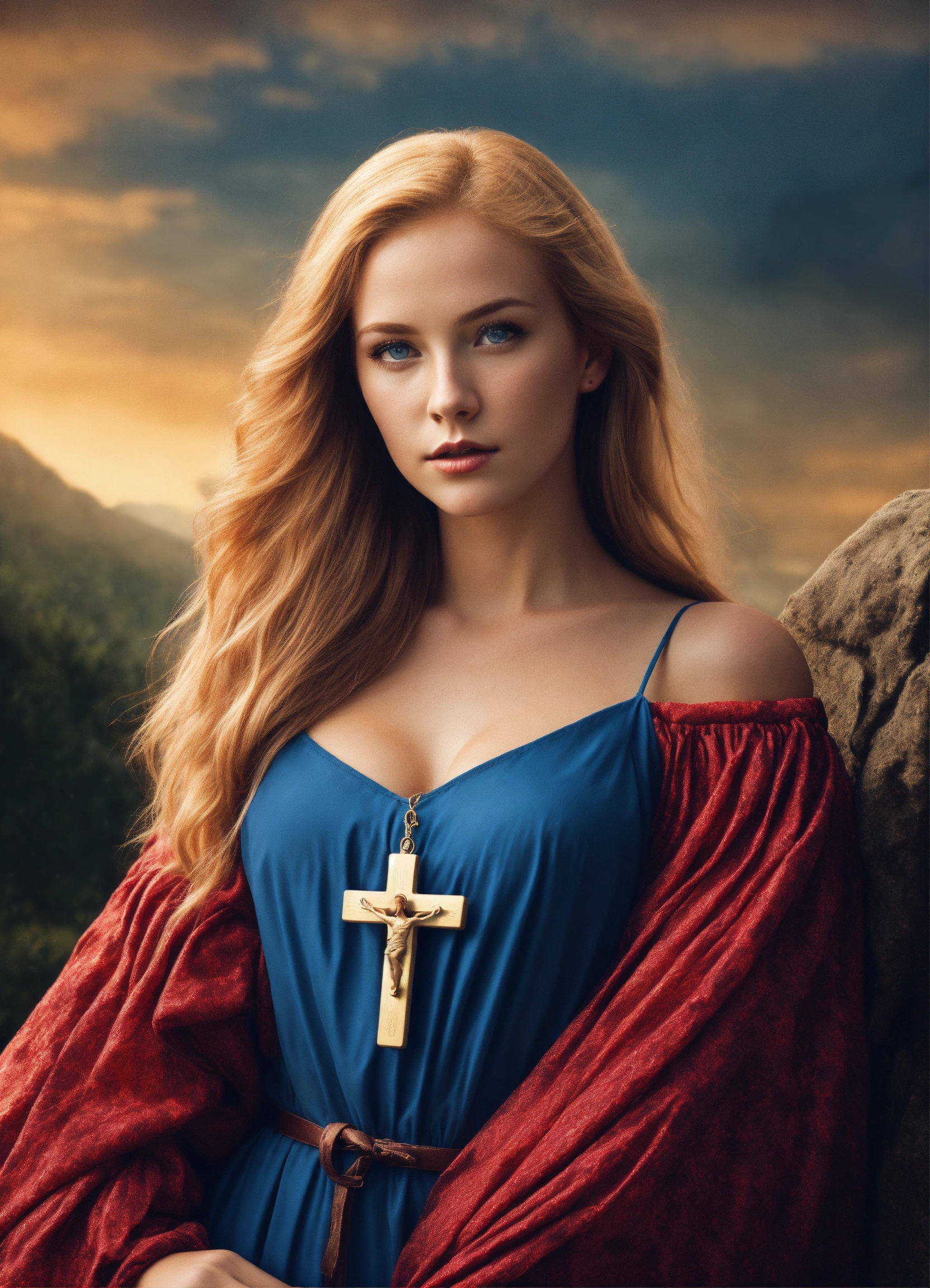 Create a captivating book cover design that has a woman and should be dressed conservatively in a puff sleeve clothing.no cleavages. with strawberry blonde hair, blue eyes and she should be wearing a crucifix, she is a christian make the photo real human