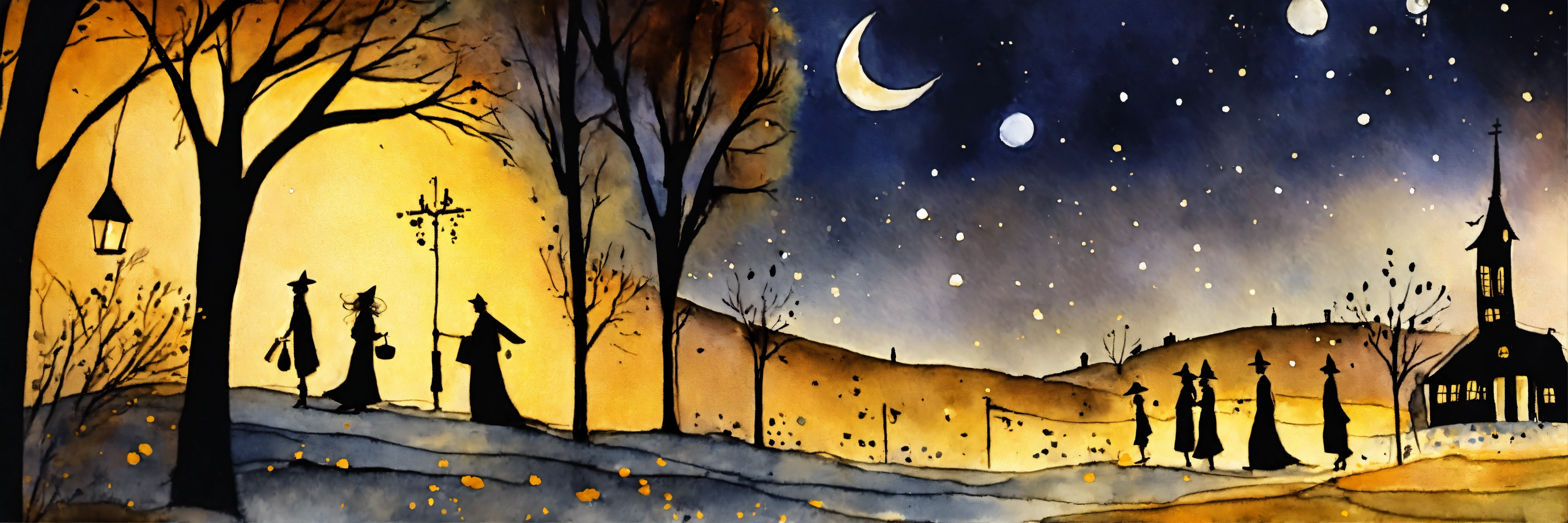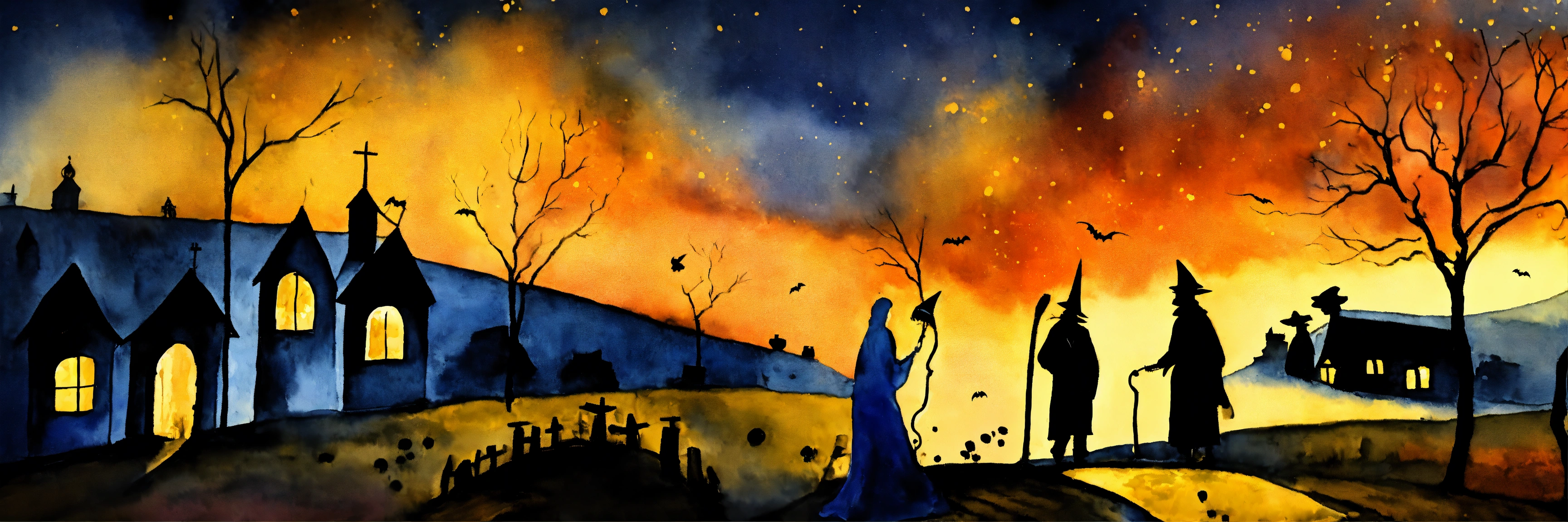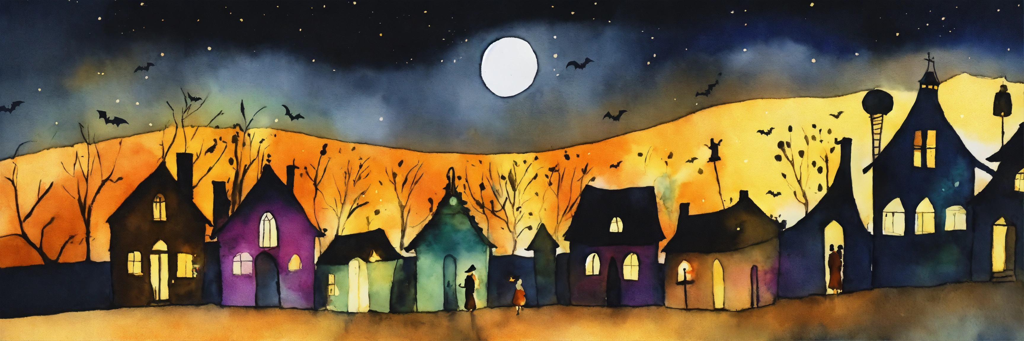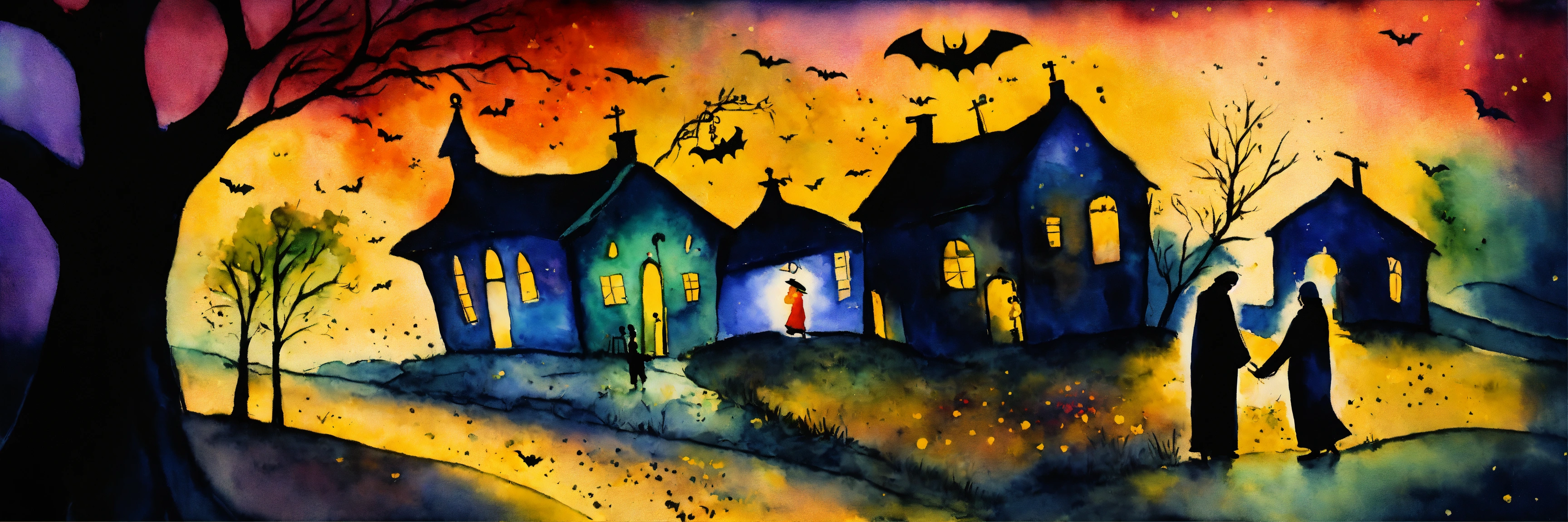 The strangers walks through the village at night on halloween, dark night, candles, brightly lit, in the style of "long lost tume. by marc chagall and tim burton. watercolour. ink splash art. minimalist. emotional. dynamic. golden speckles."