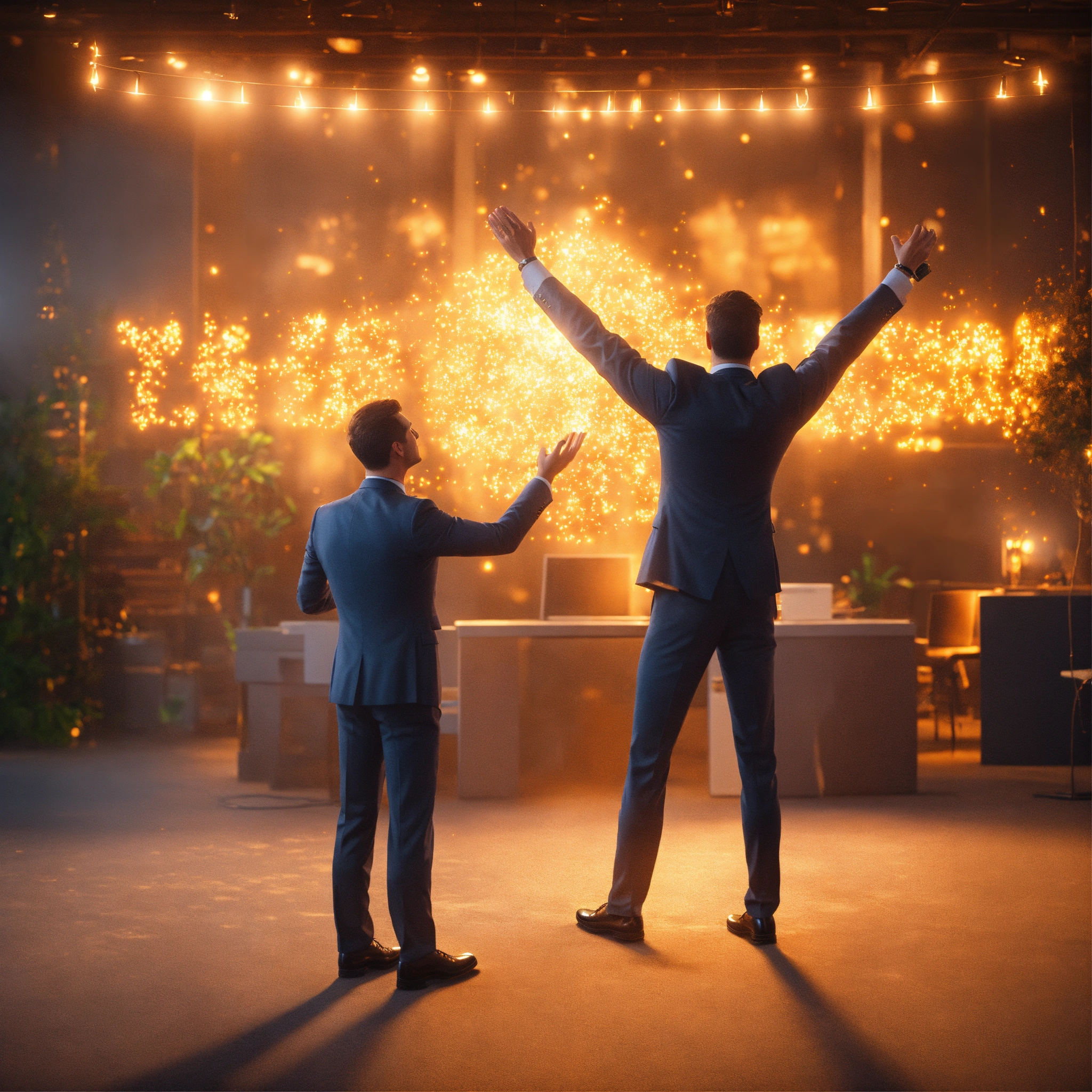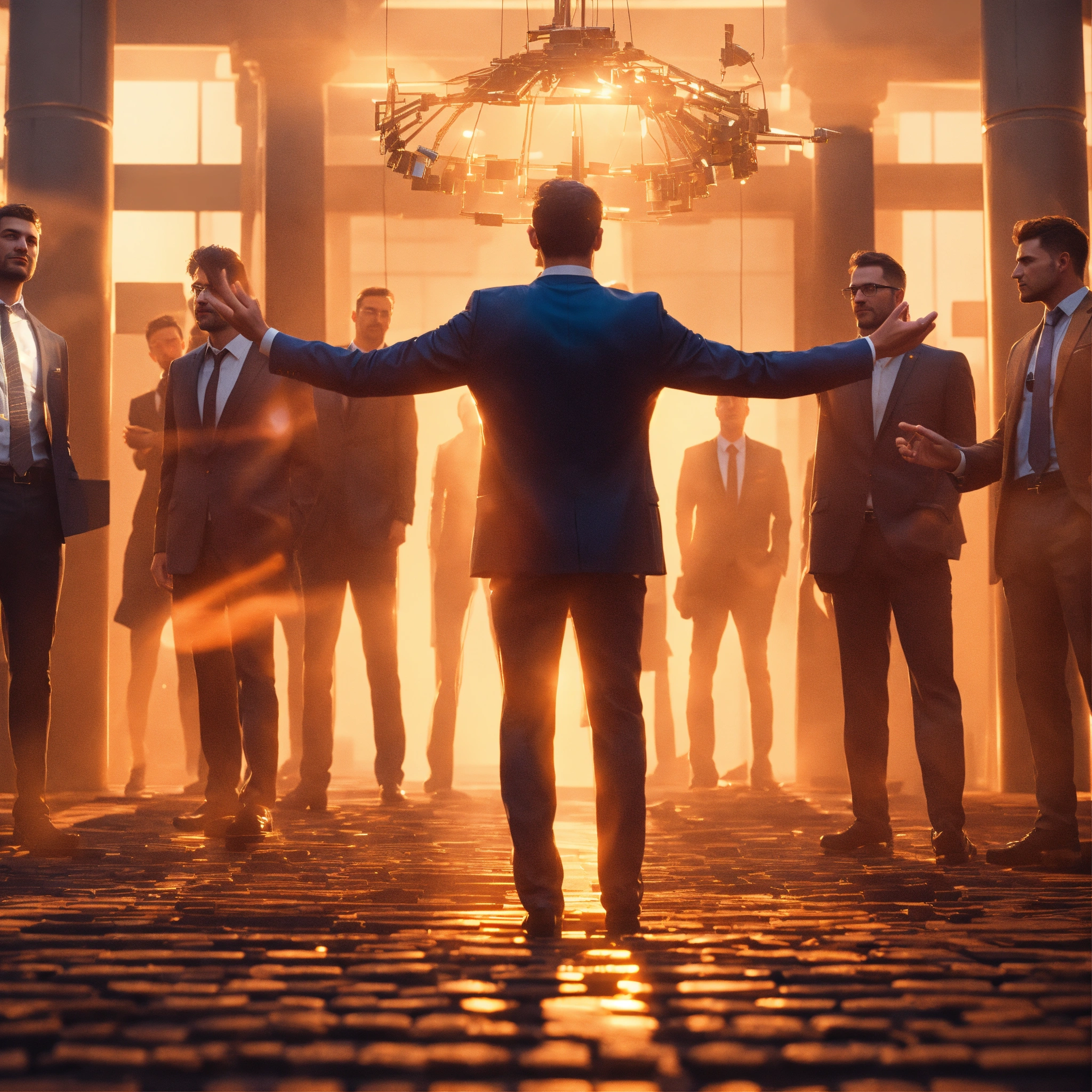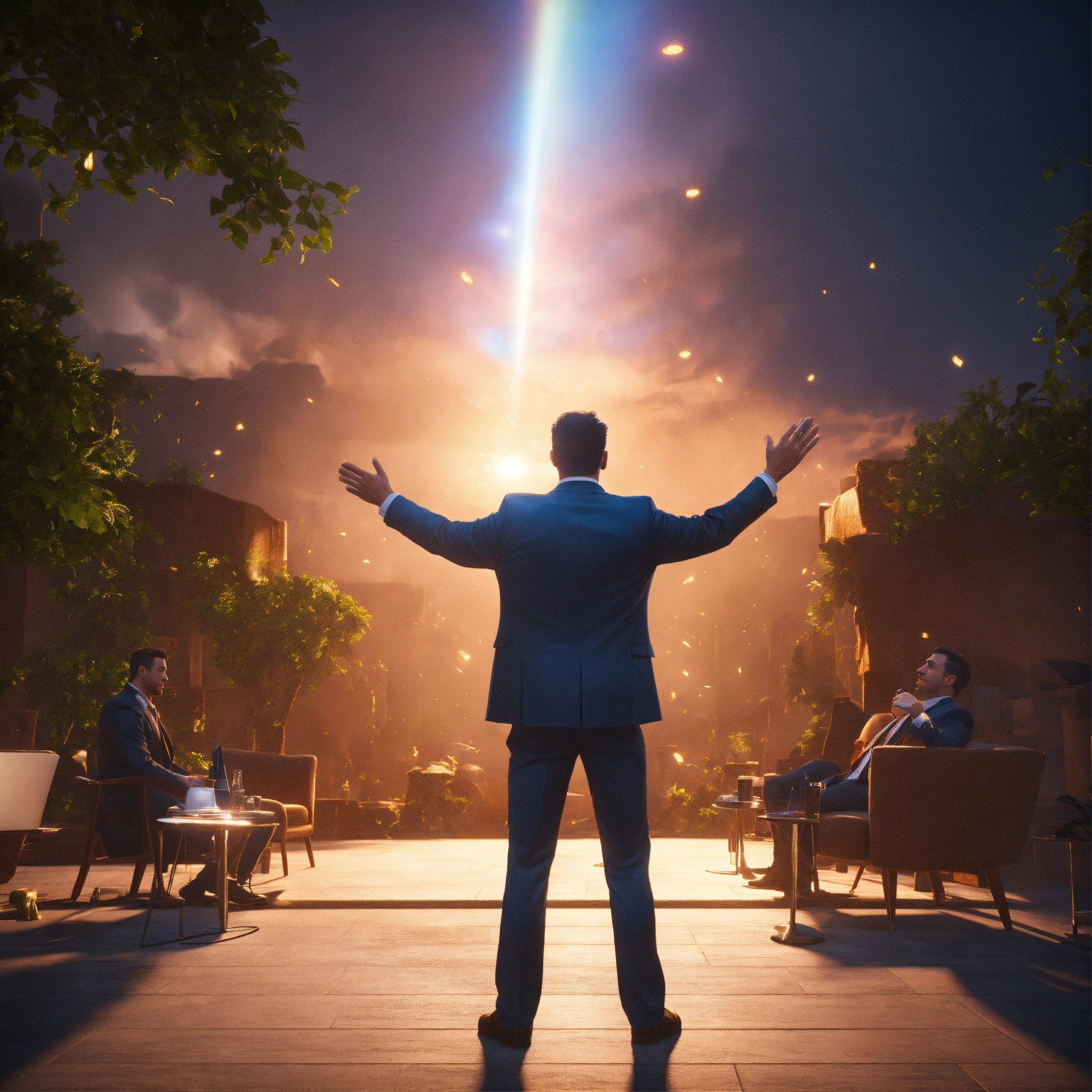 The end of the evolution in sales in the company, the victorious finale, the light behind the man, the sales manager opened his arms to him, unreal engine