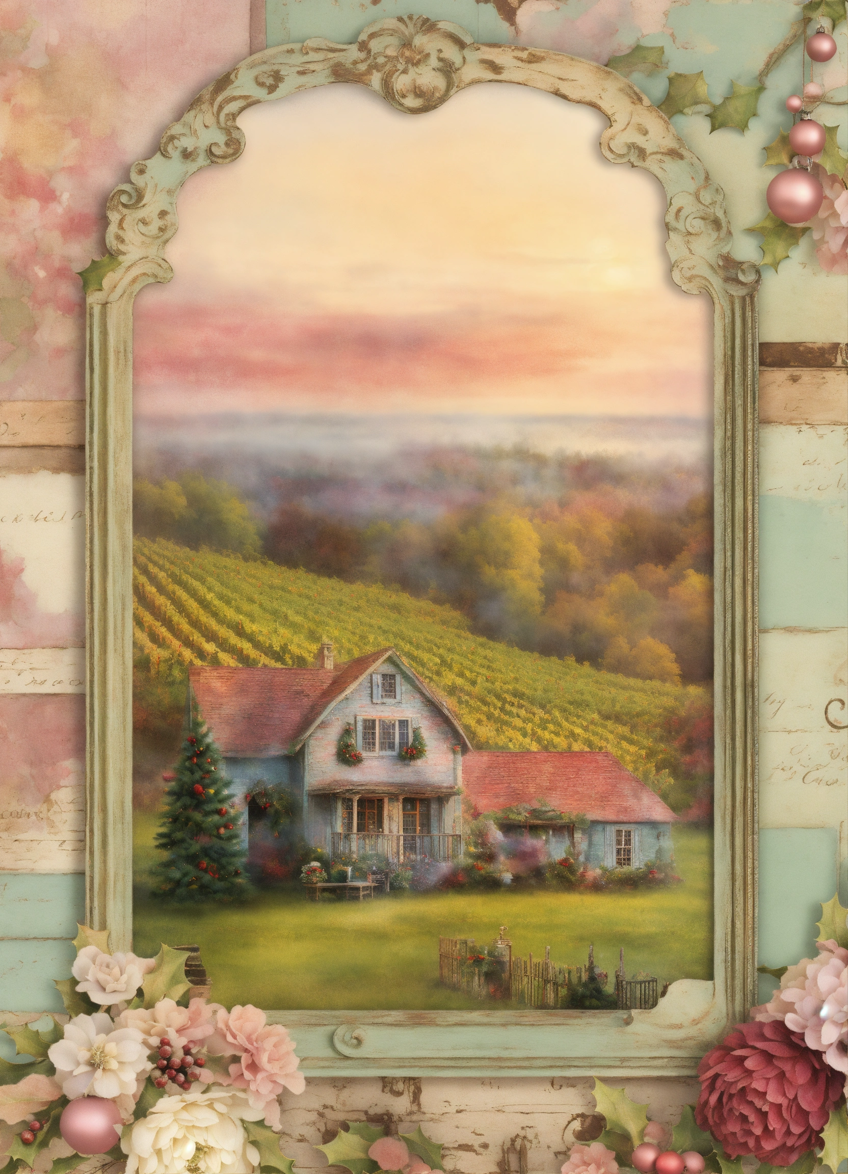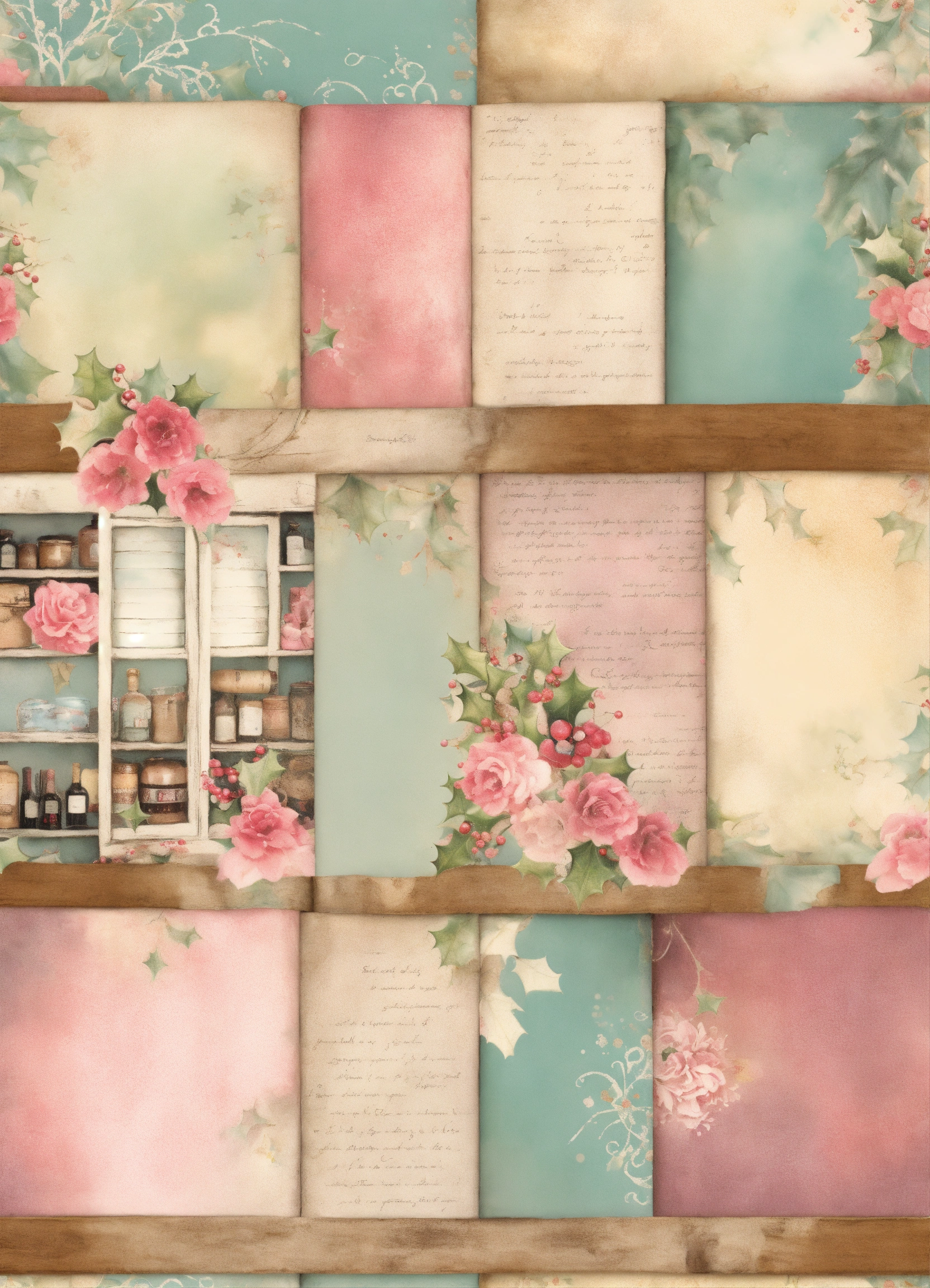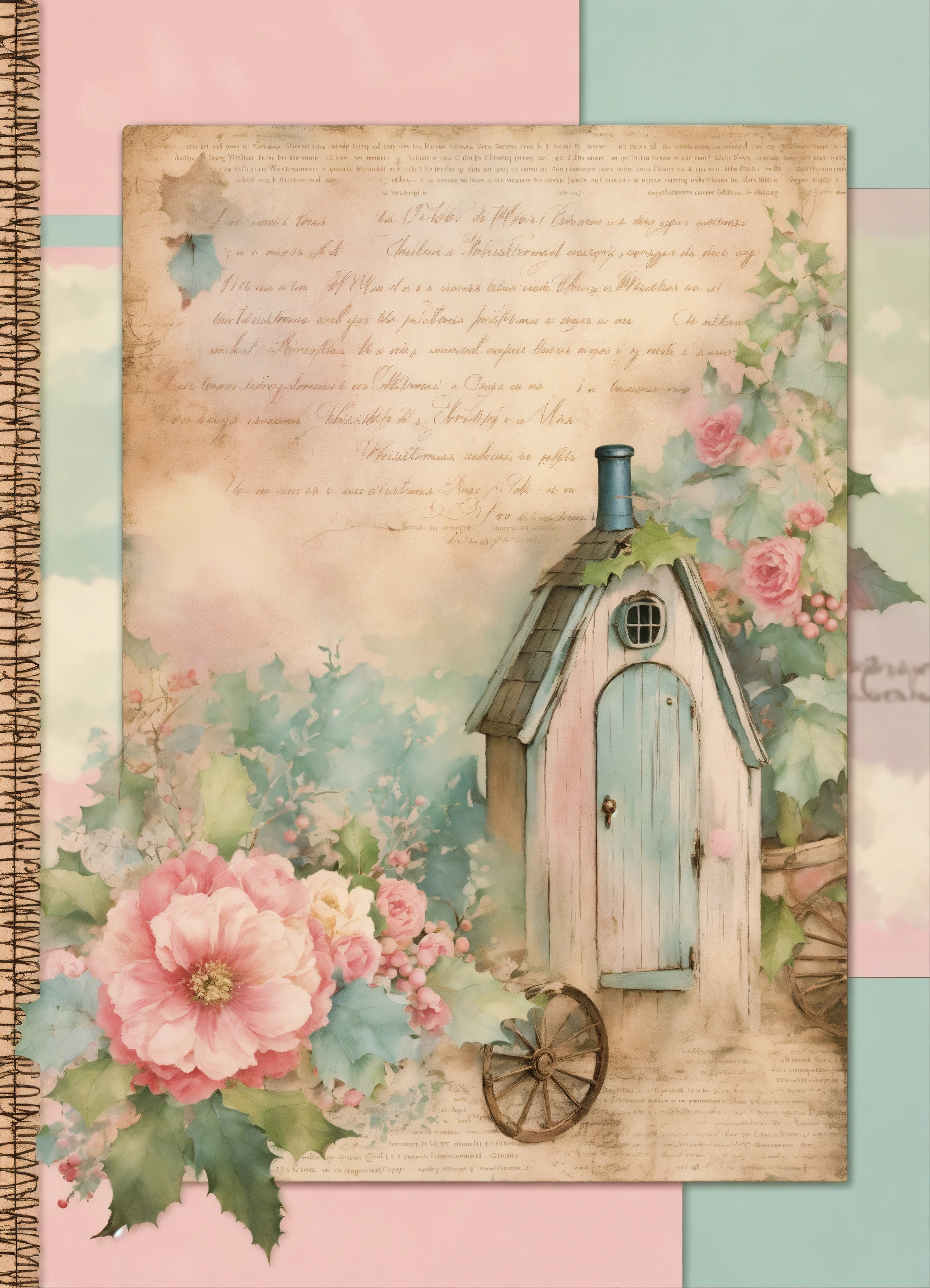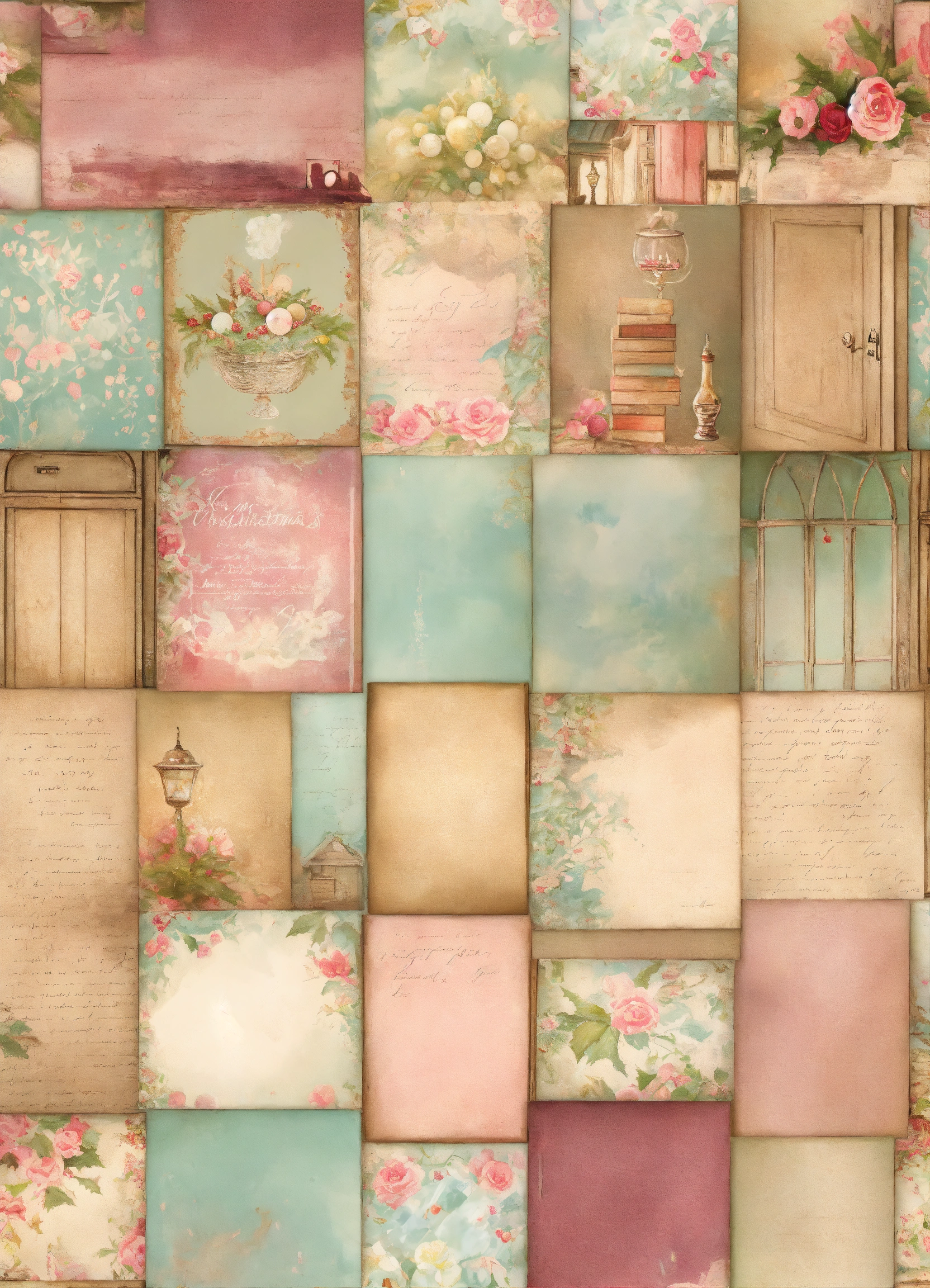 Shabby chic dreamy mist pastel colors junk journaling whimsical christmas country cottage wine cellar seamless background full page