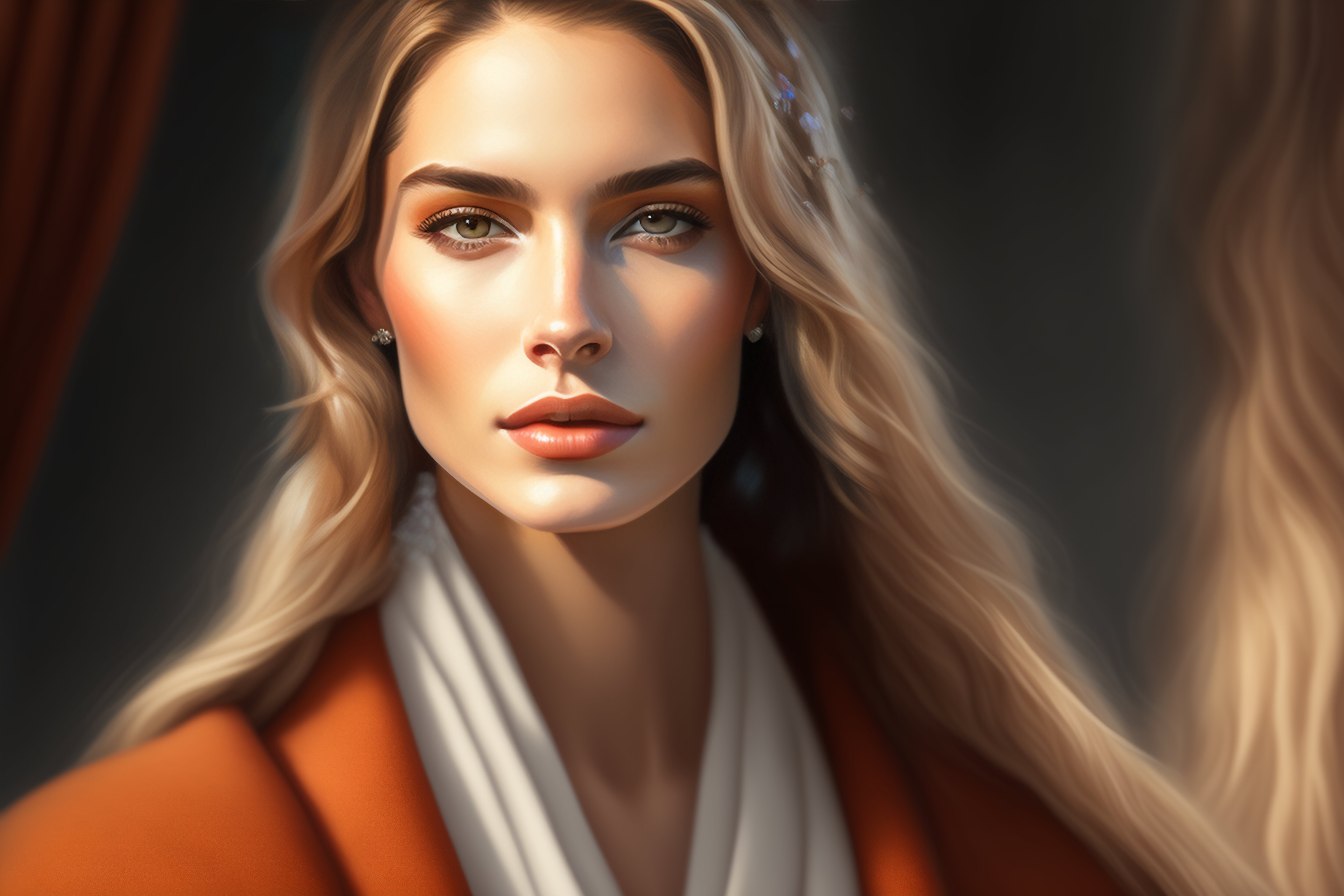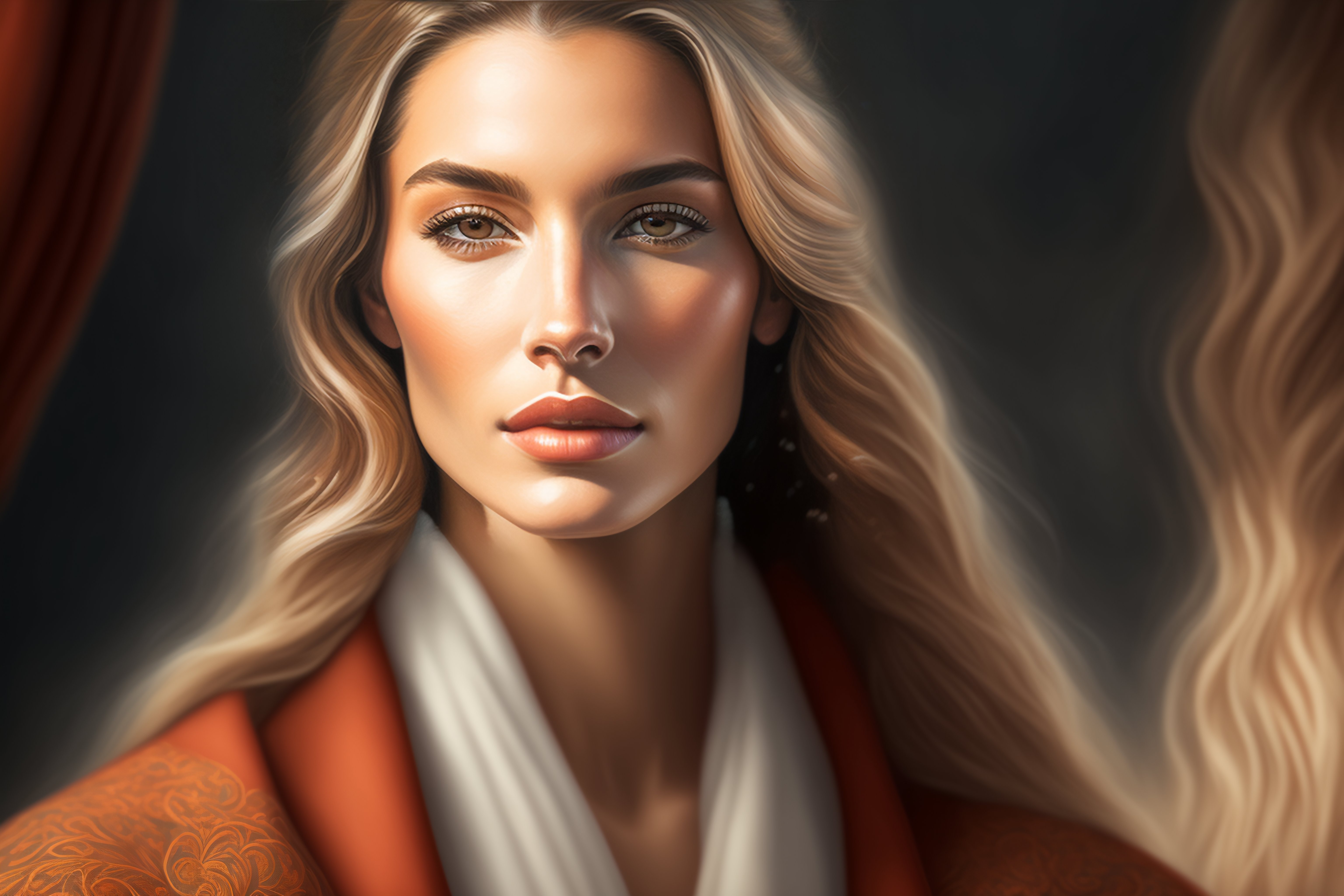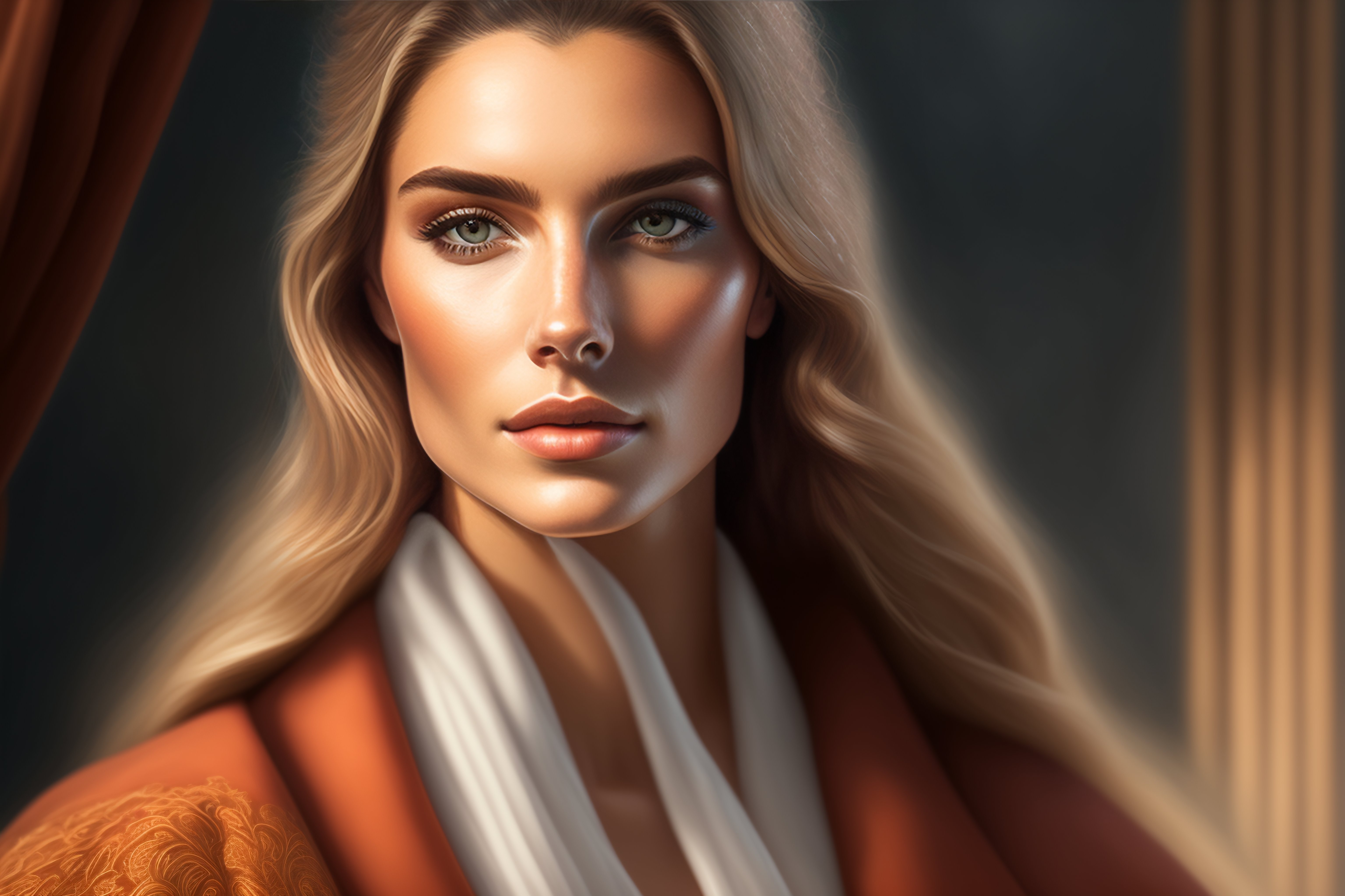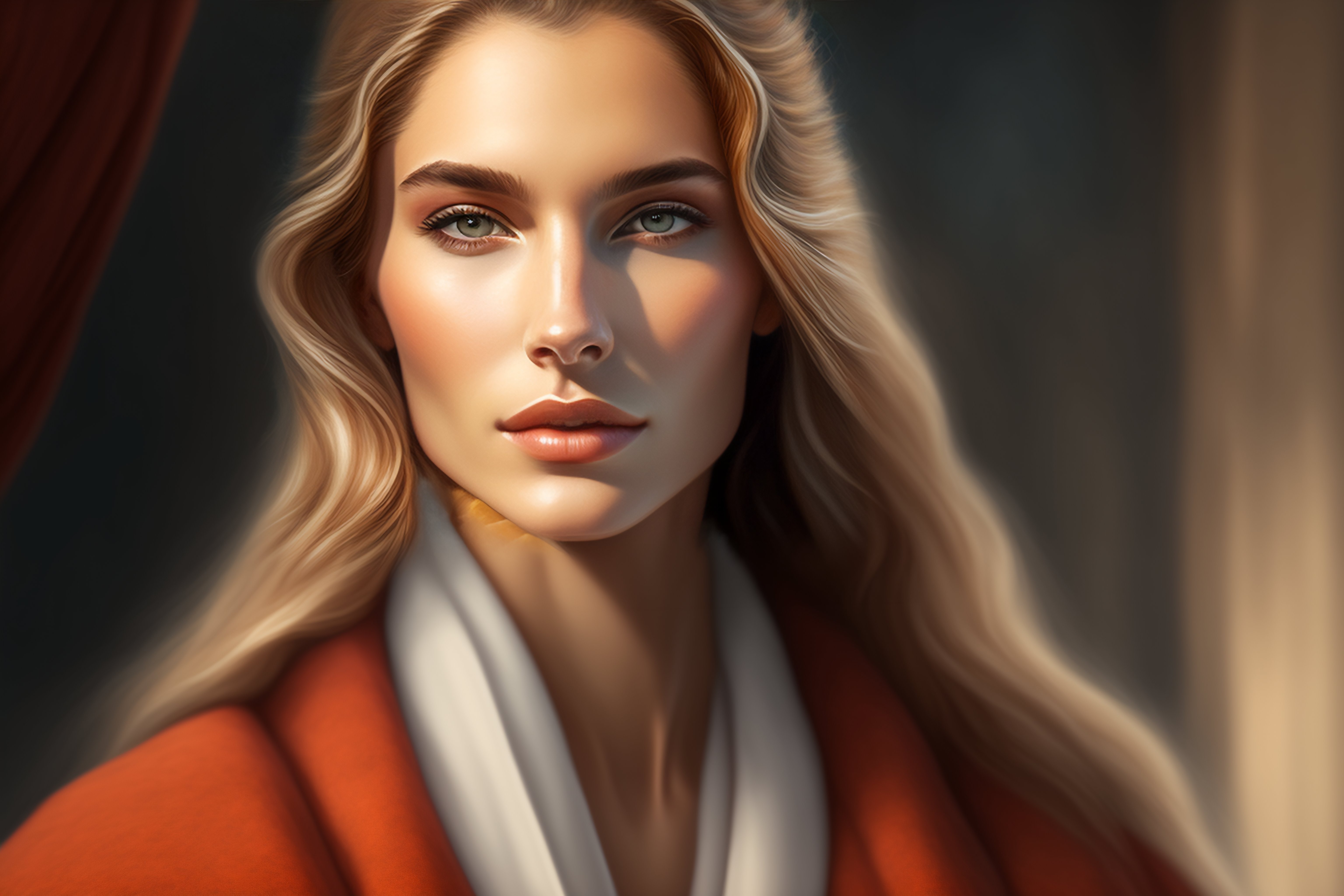 Portrait of a woman wearing a robe, non-centered shot, unique pose, intricate, elegant, highly detailed, digital painting, realist, smooth, sharp focus
