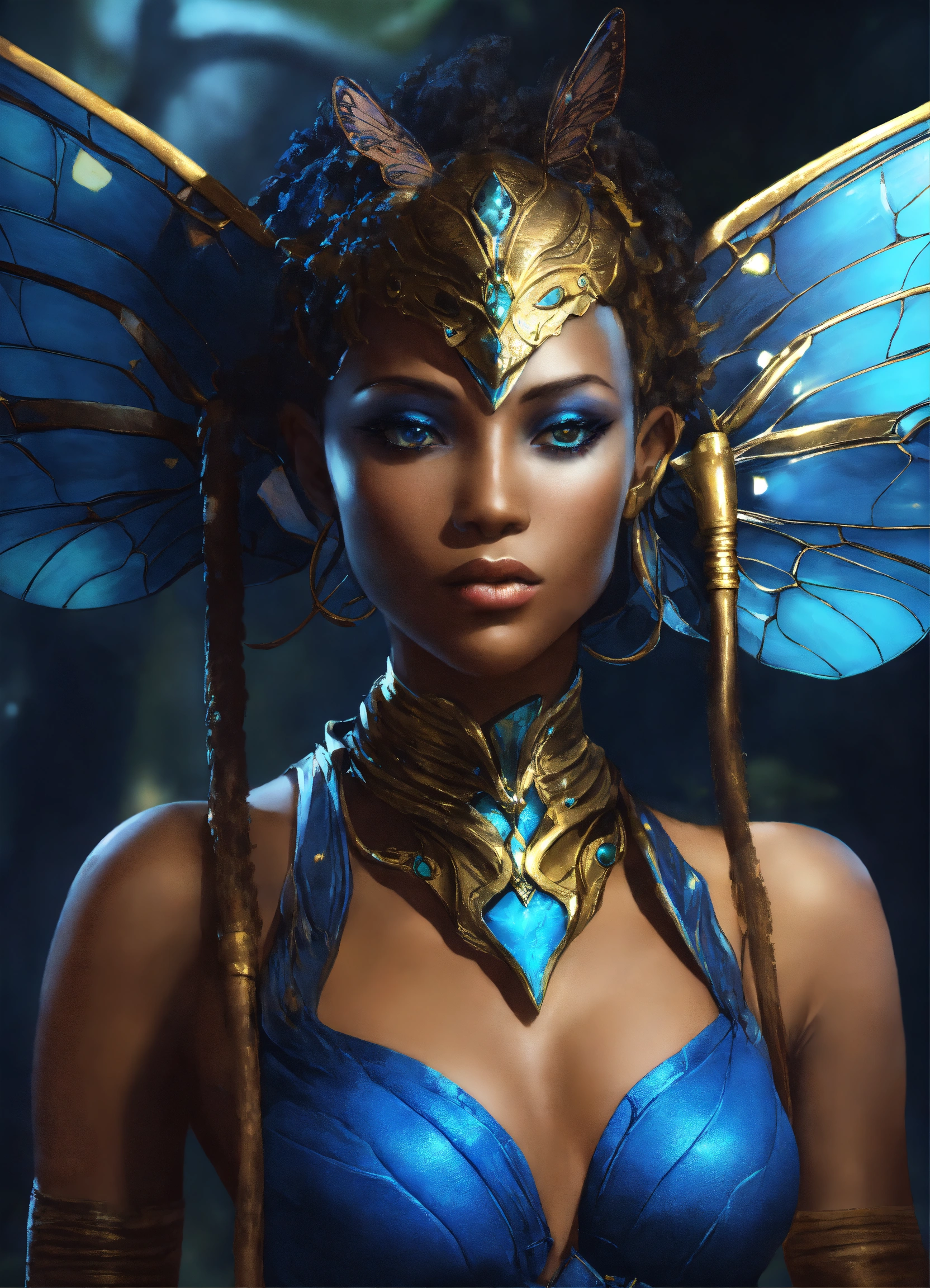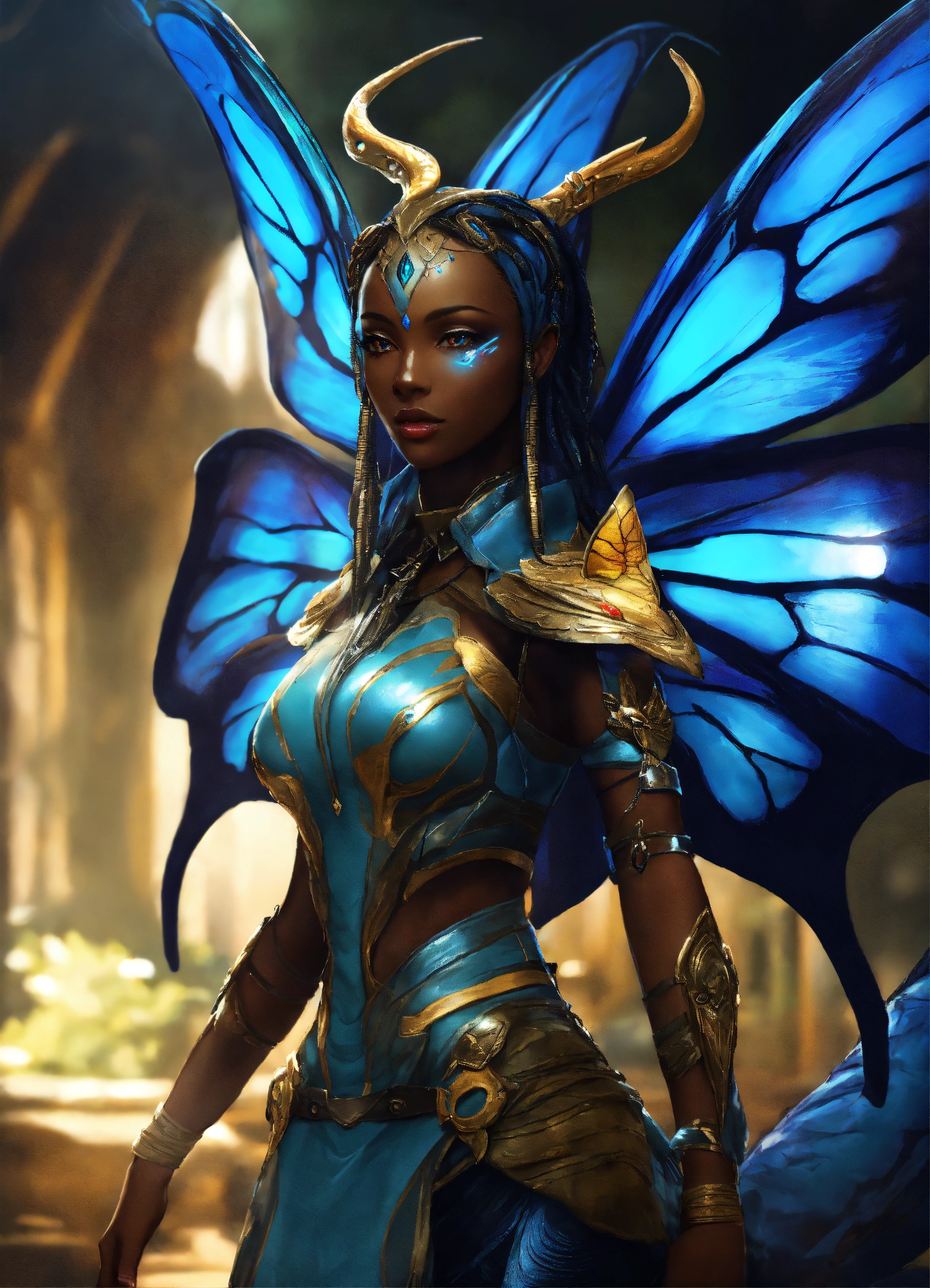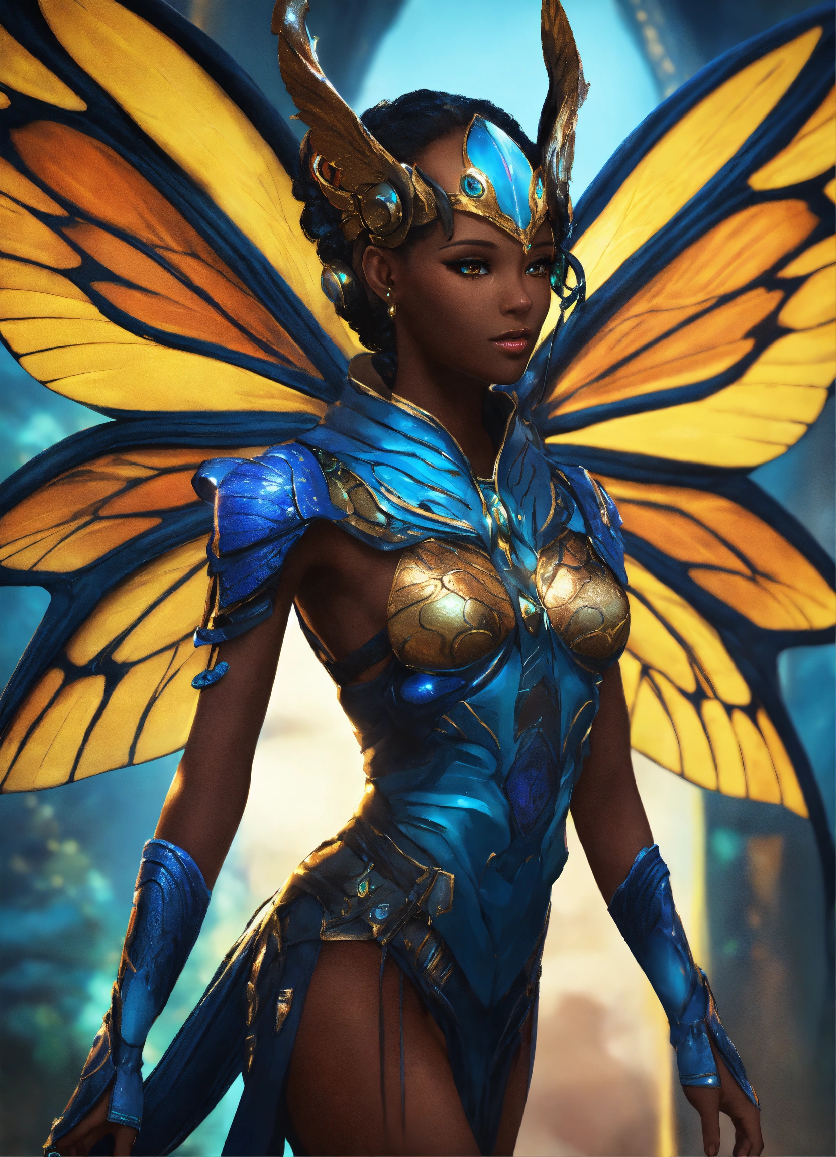 Alien ethiopian female with large beautiful butterfly wings, powerful jaws, beautiful and terrible, flexible body, long snake tail, luminous eyes, blue body, inspired by stellaris game and warframe, dark souls style