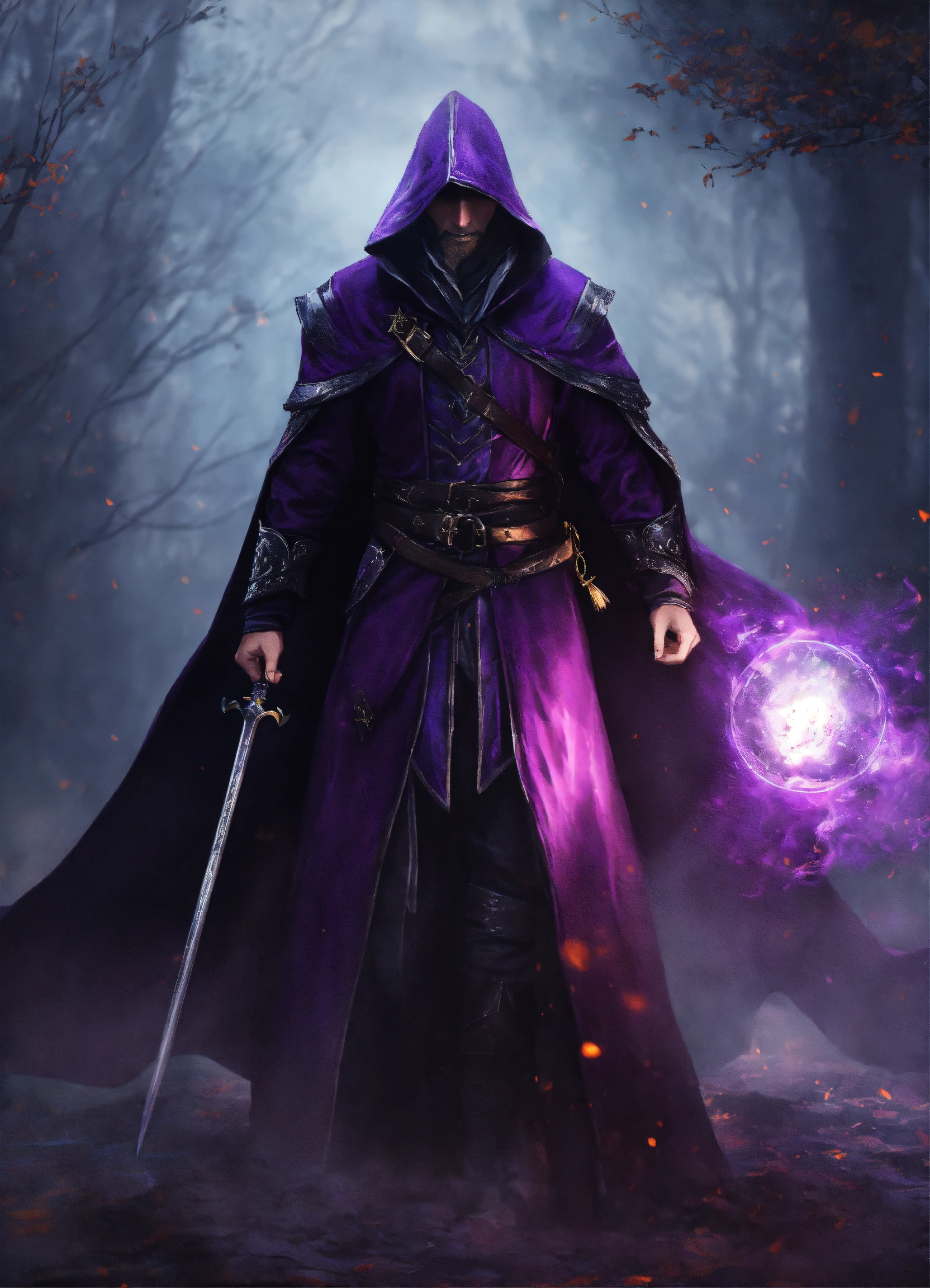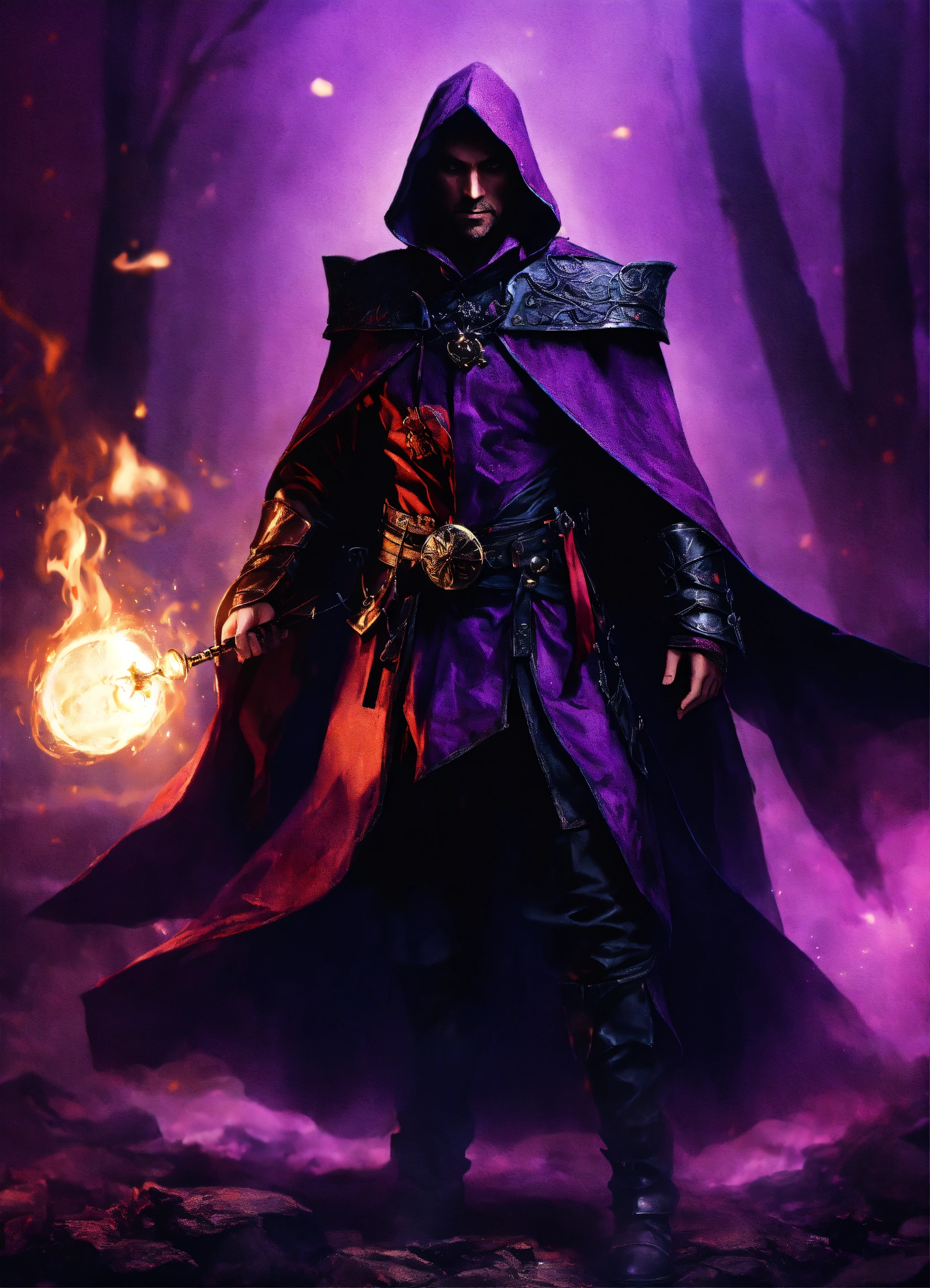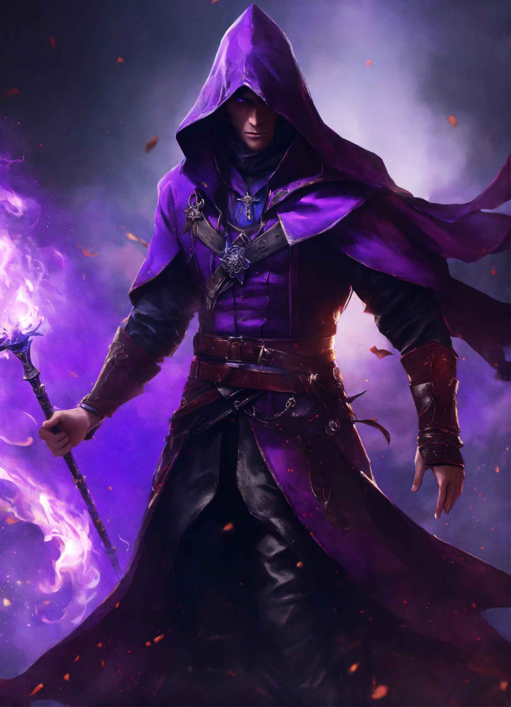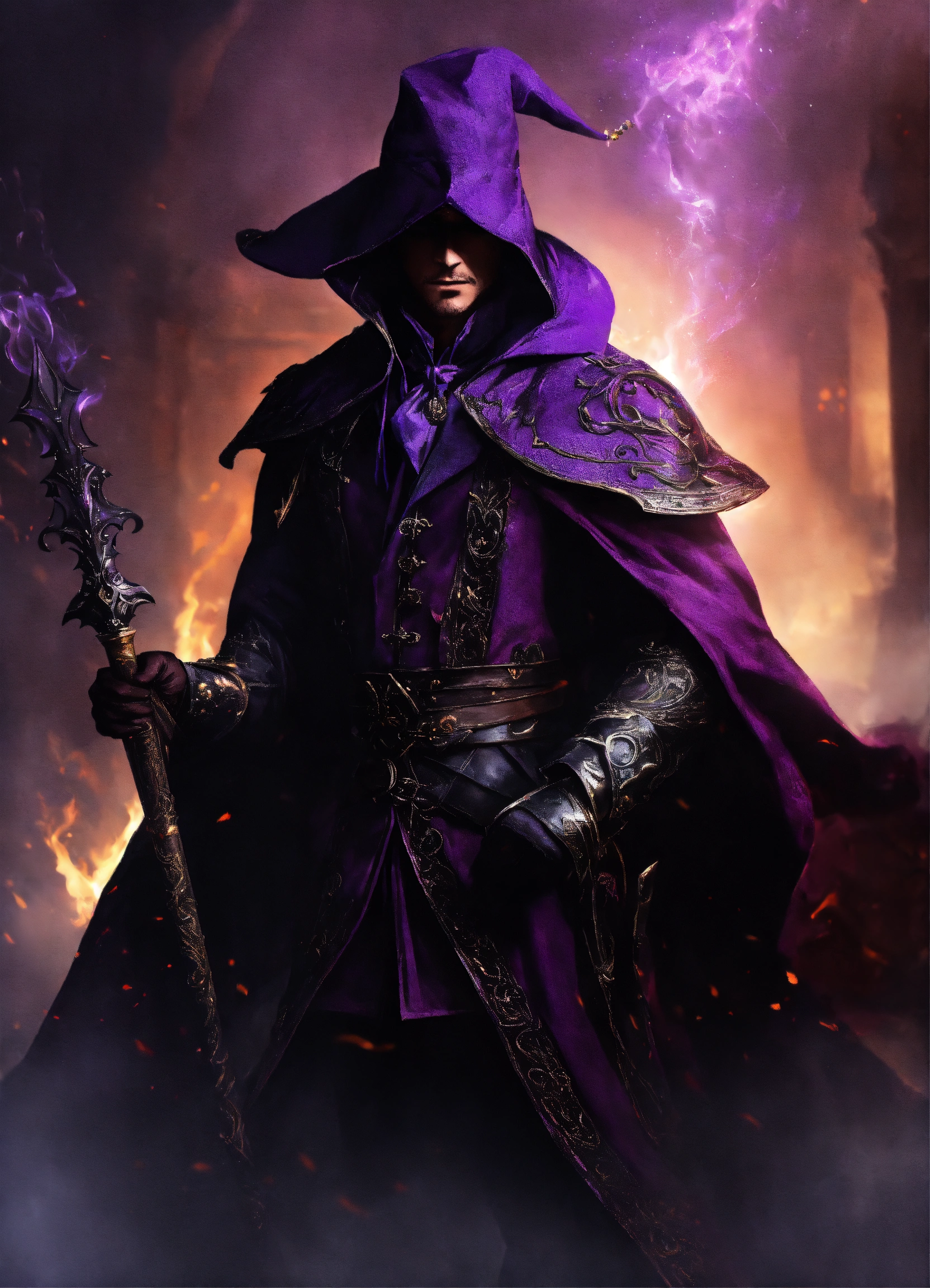 A dark shrouded magician in purple and black, battlefield, medieval, magician, magic, mage, warrior, evil