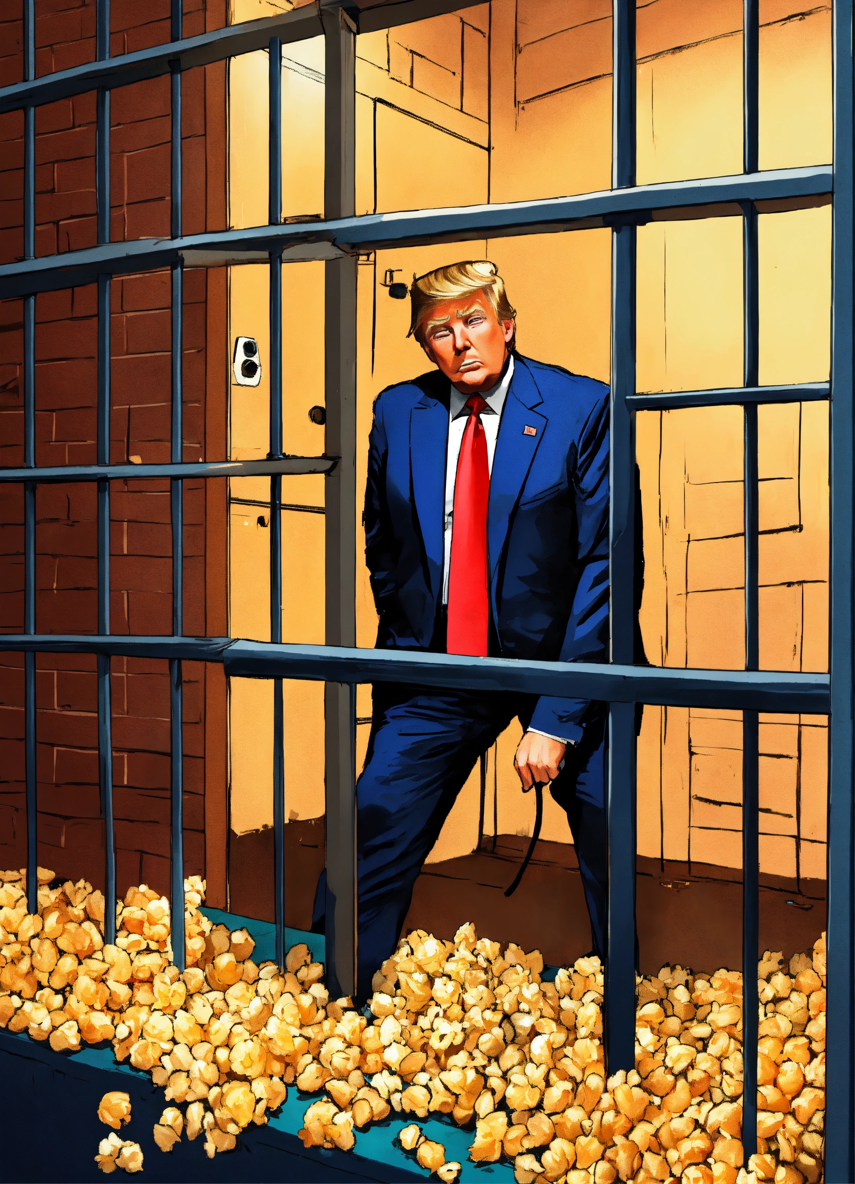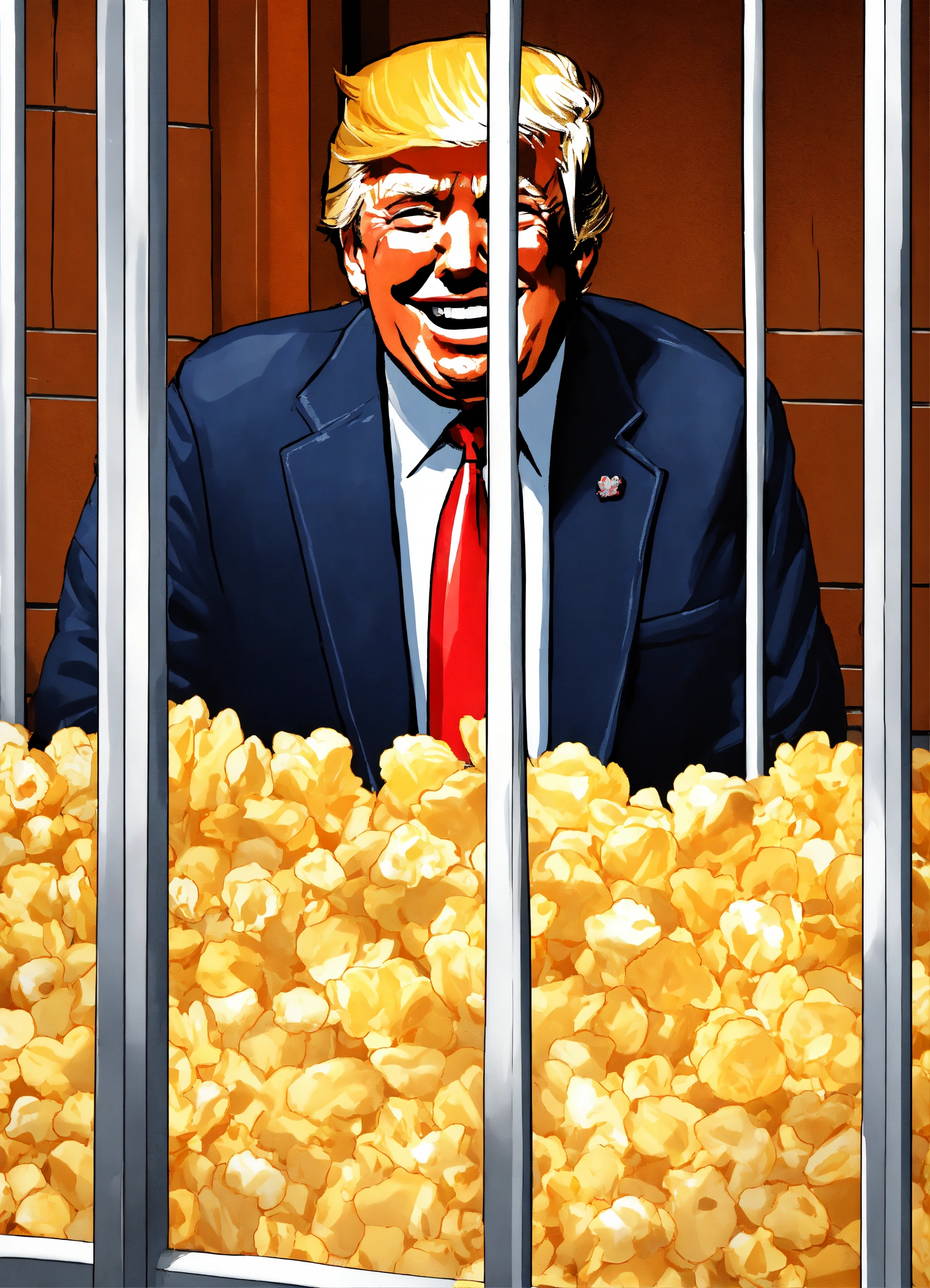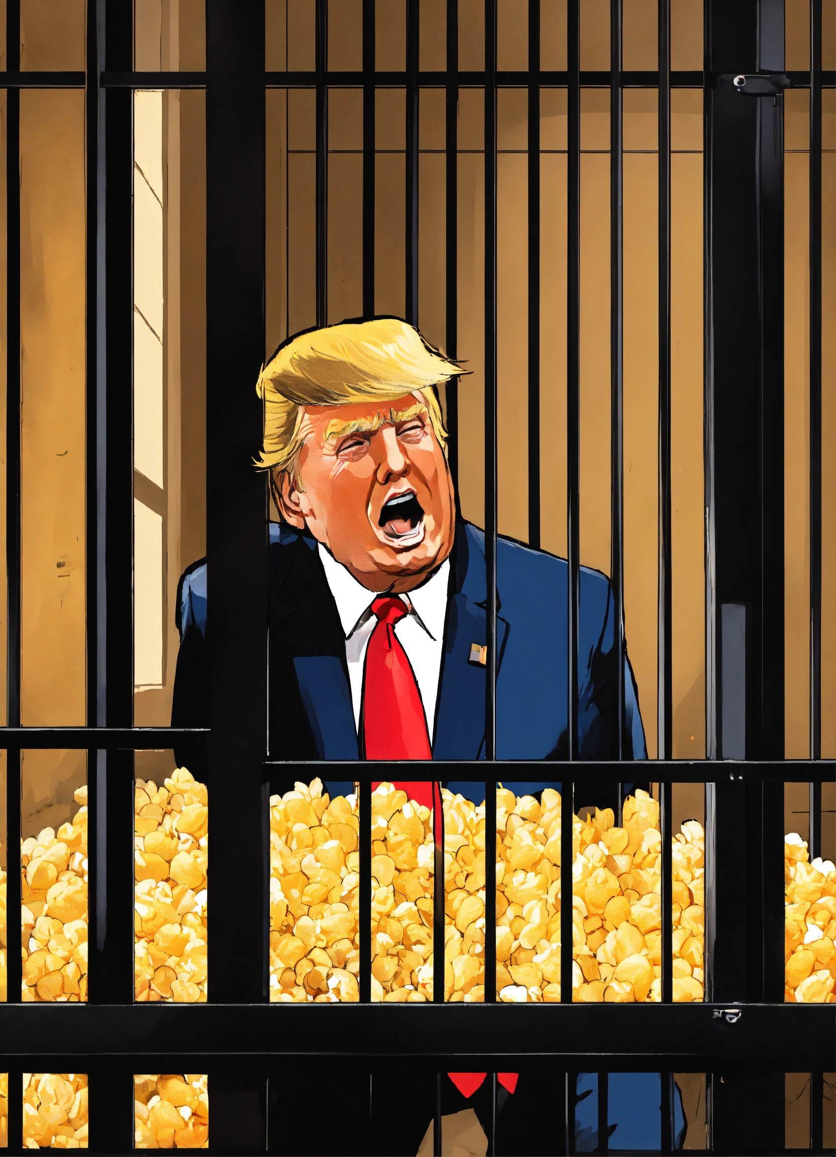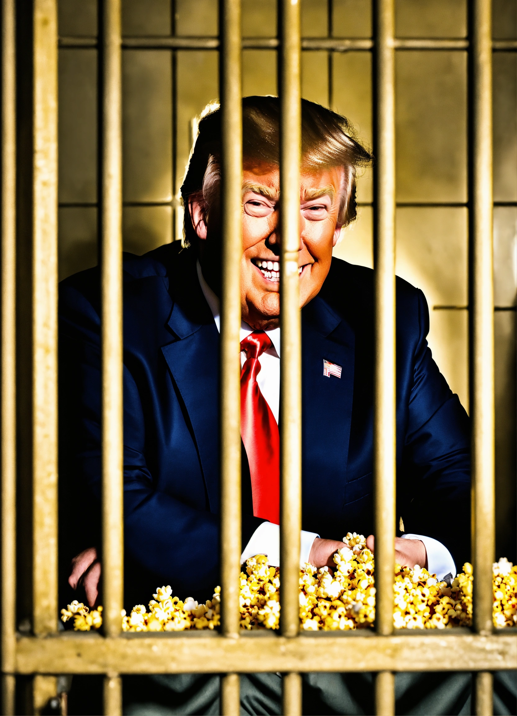 Sad donald trump in jail cell "full of popcorn" while guard laugh at him from outside the prison cell